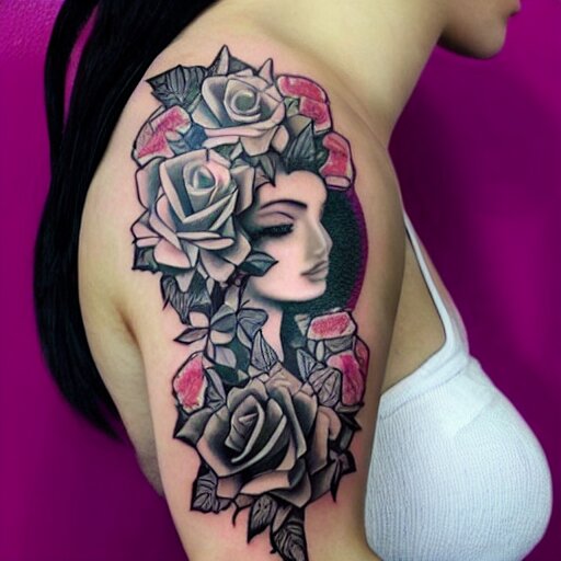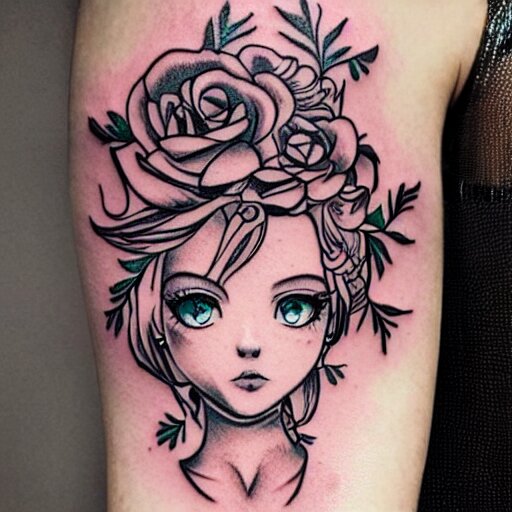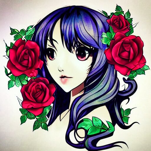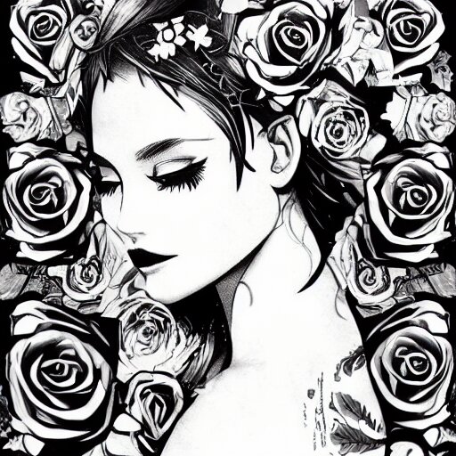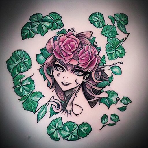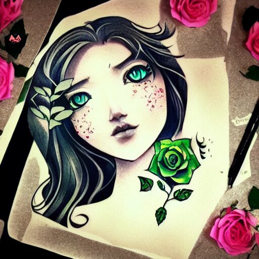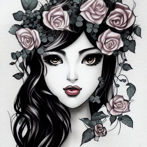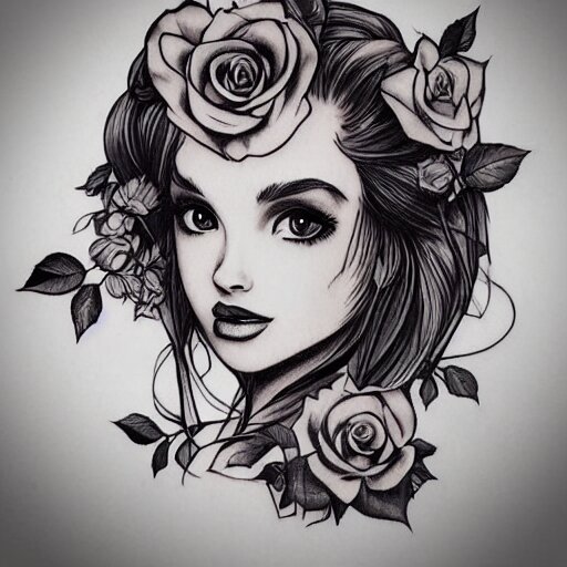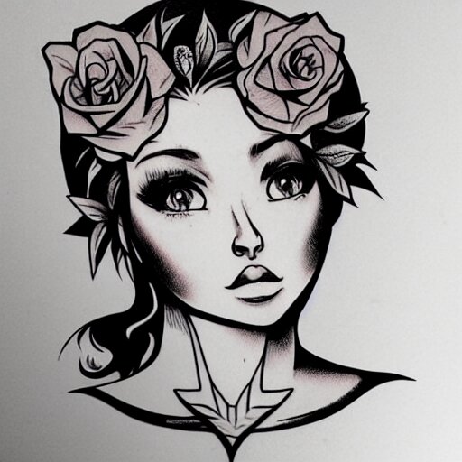 Tattoo design, stencil, beautiful neptune girls face, roses and ivy surrounding by artgerm, artgerm, cat girl, anime