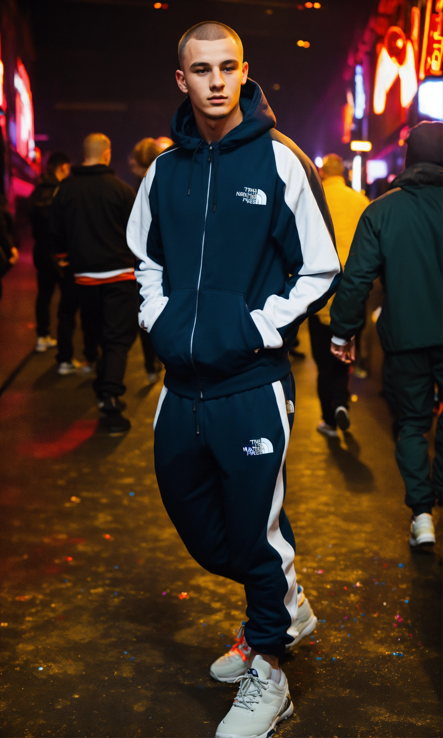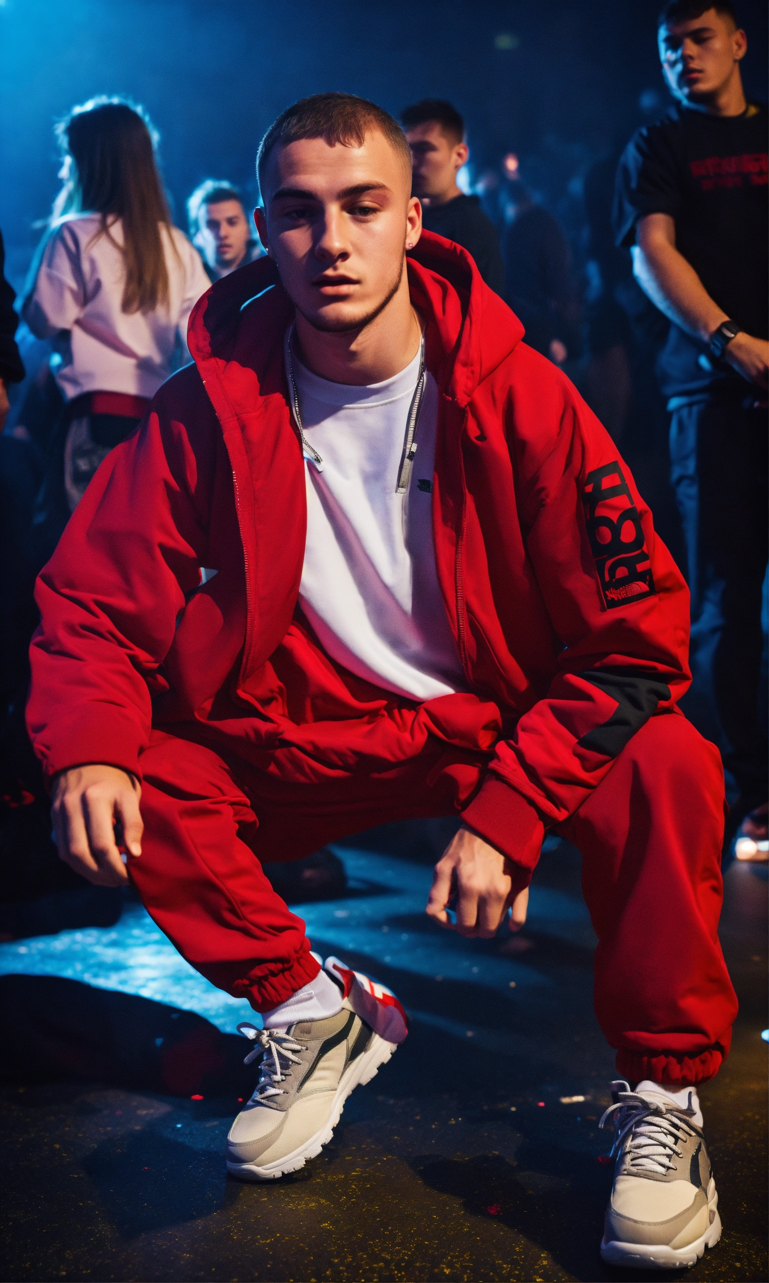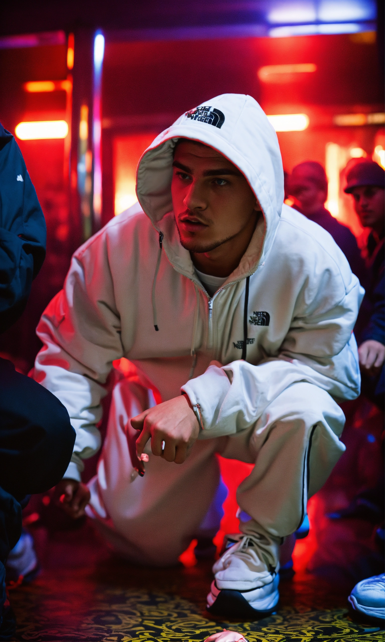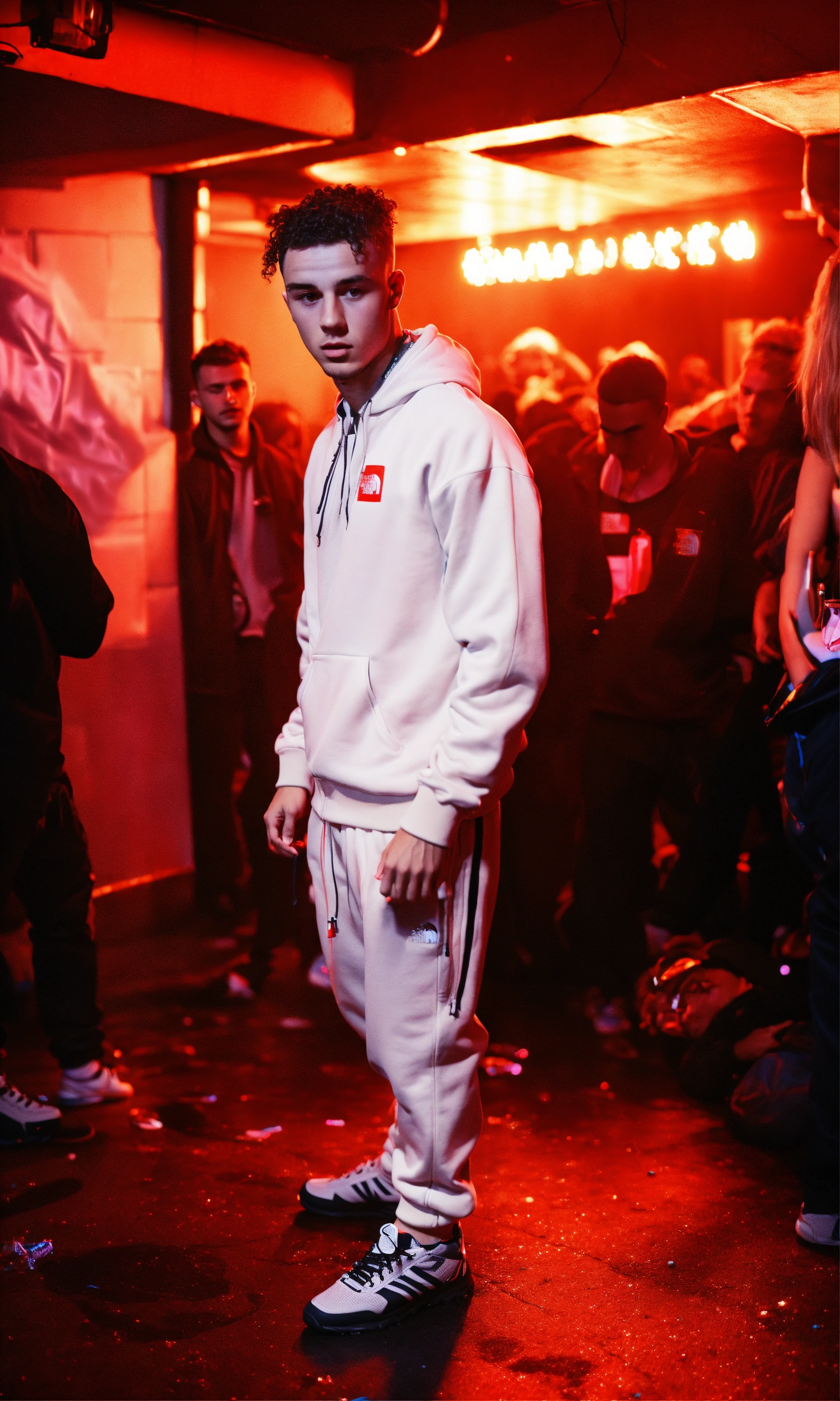 White british roadman chav, aged 21, he is wearing a north face tracksuit, he is crawling on a busy nightclub floor