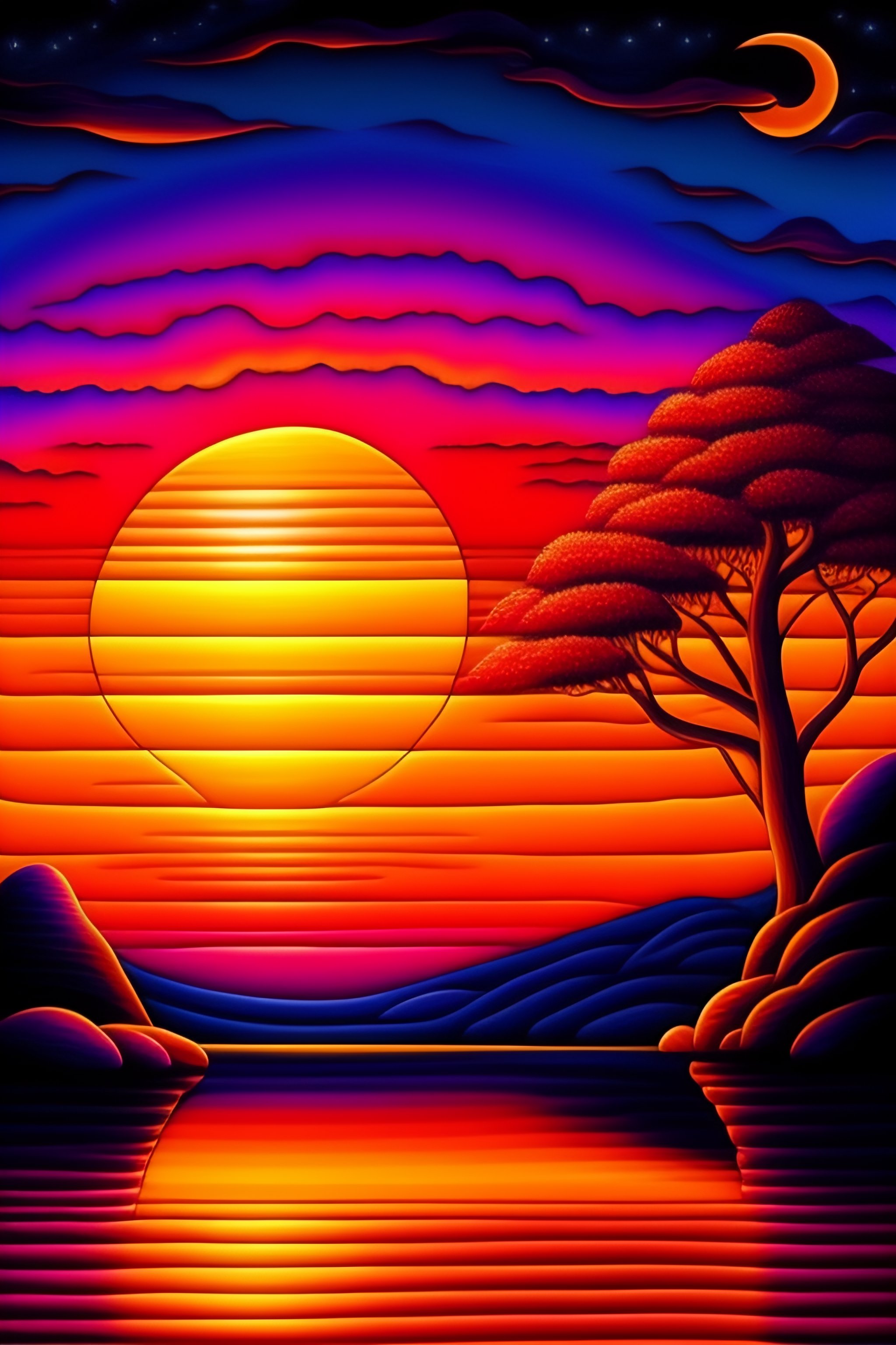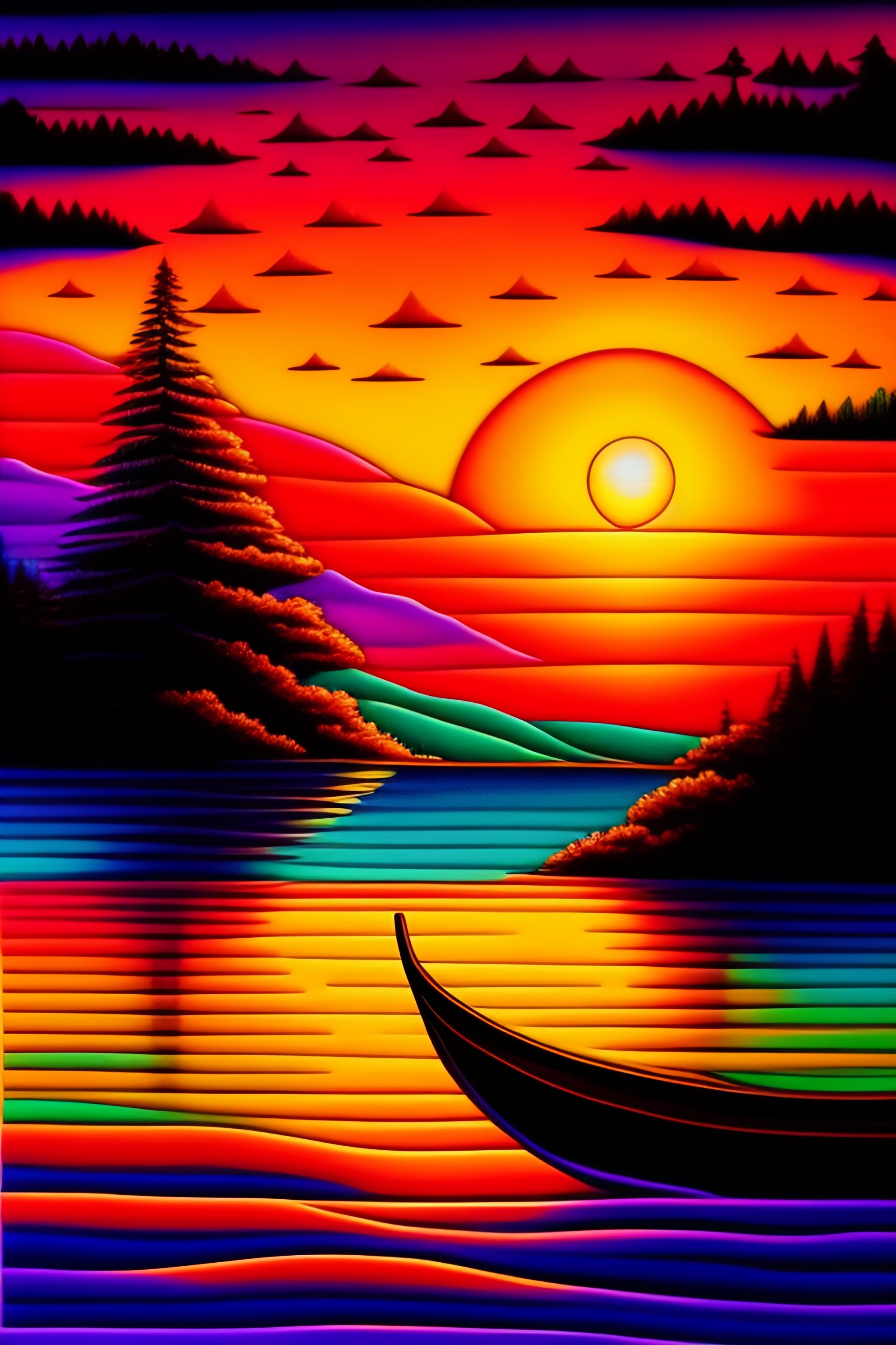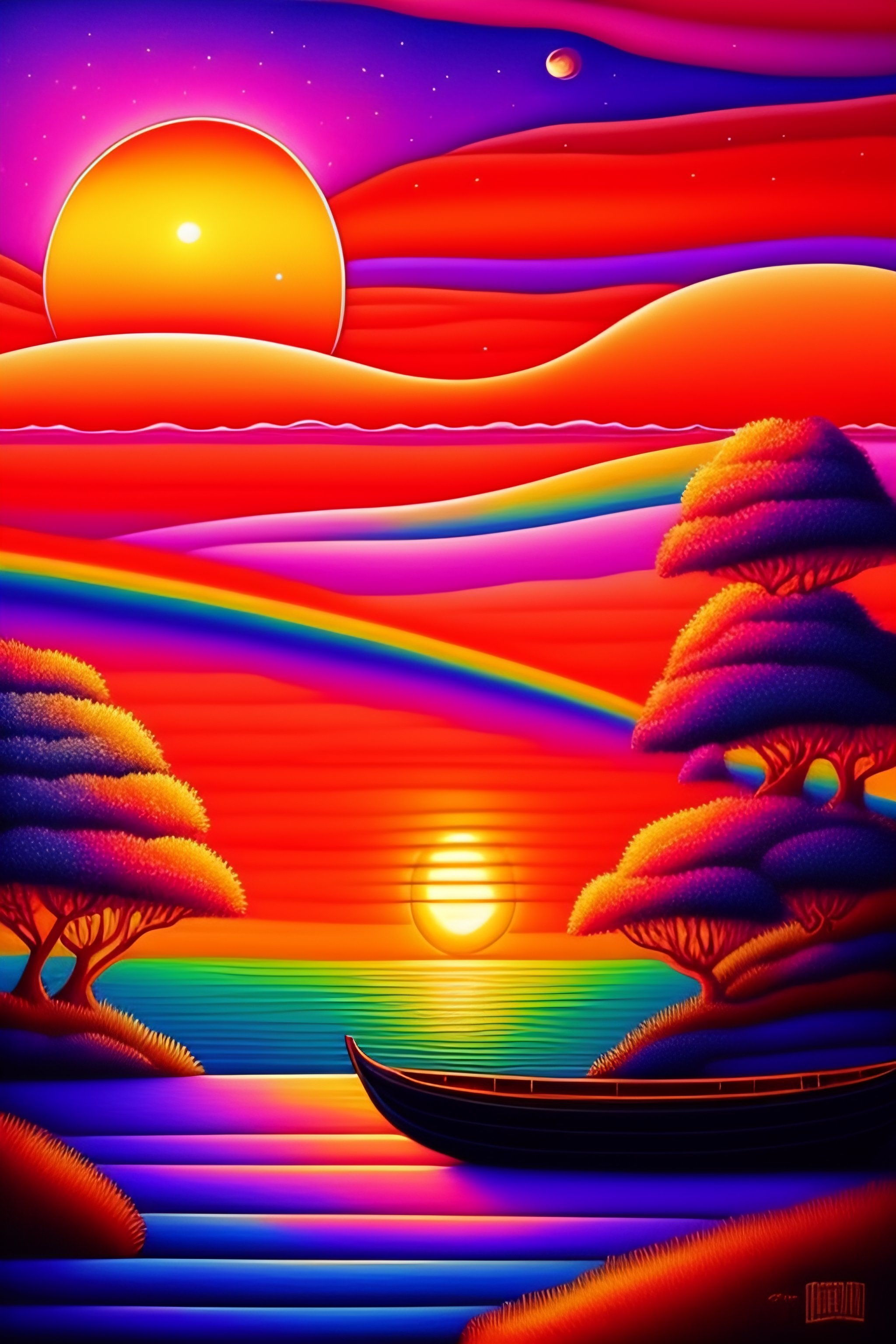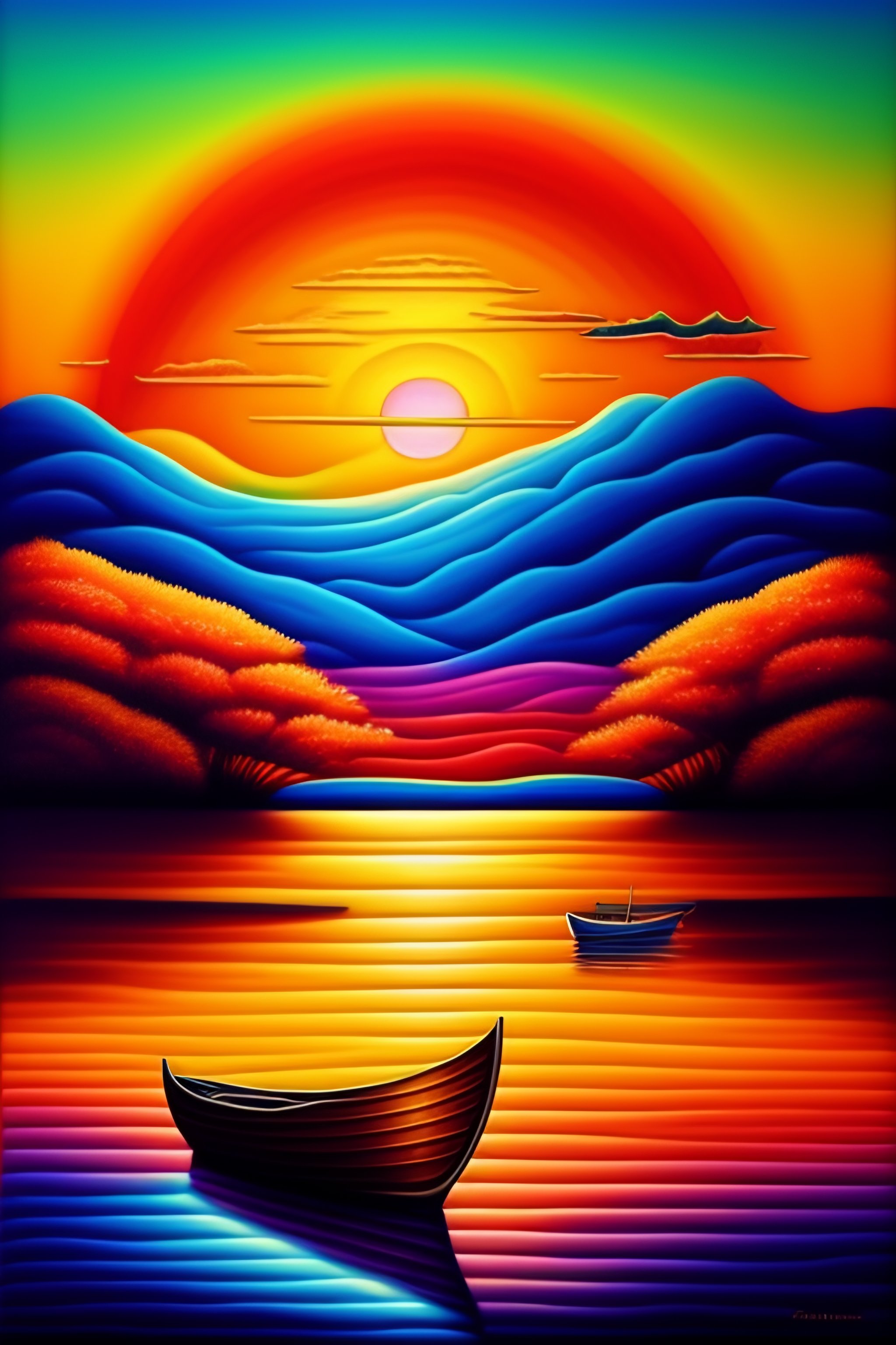 Picture yourself in a boat on a river with tangerine trees and marmalade skies colorful sunset, very detailed, fantasy art