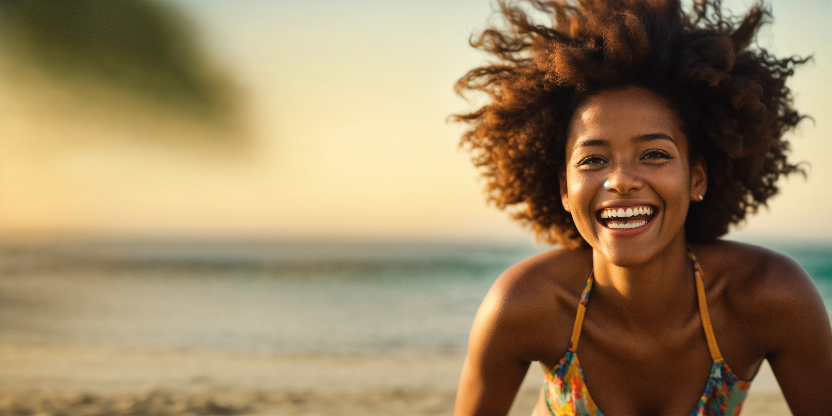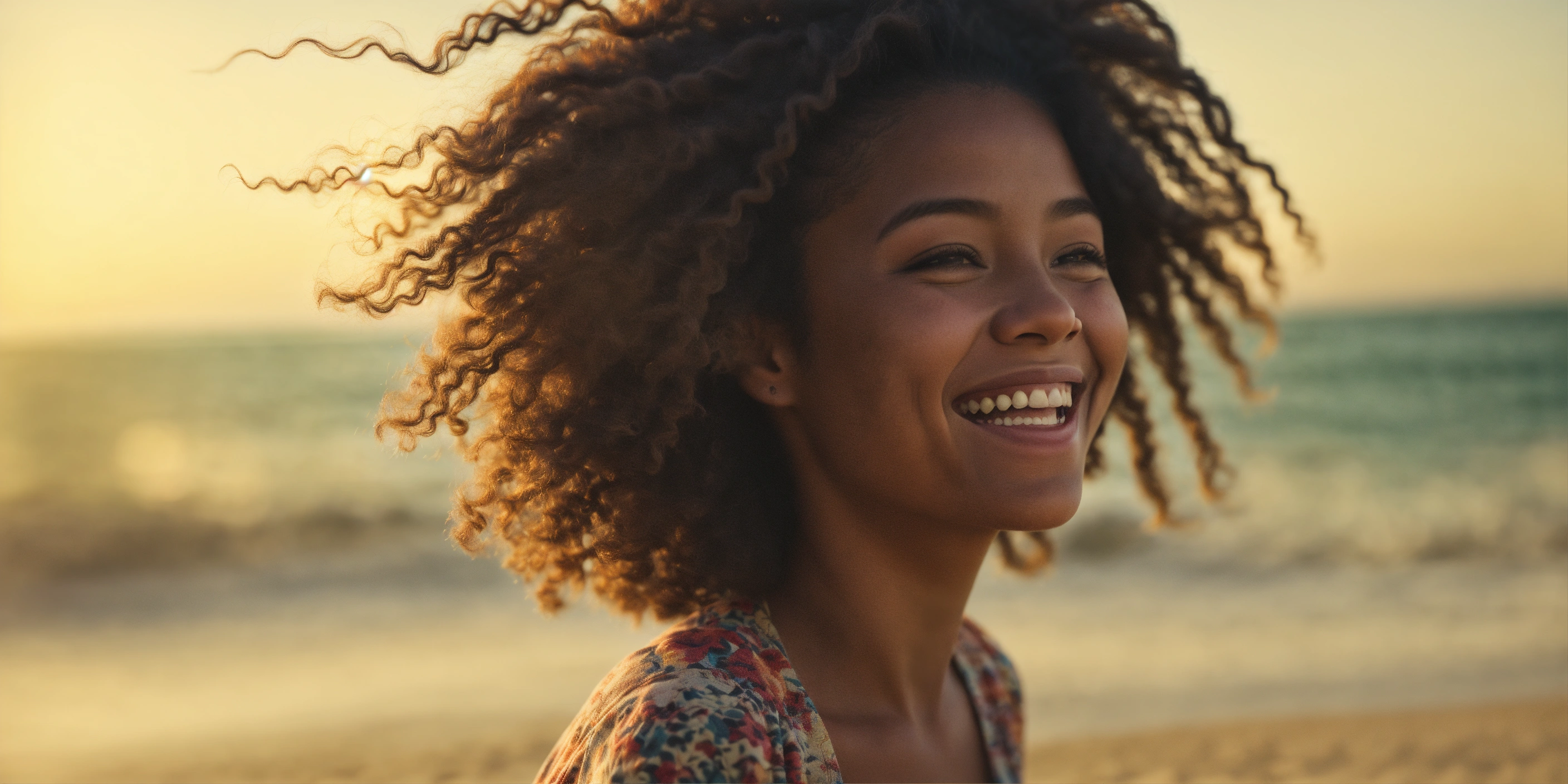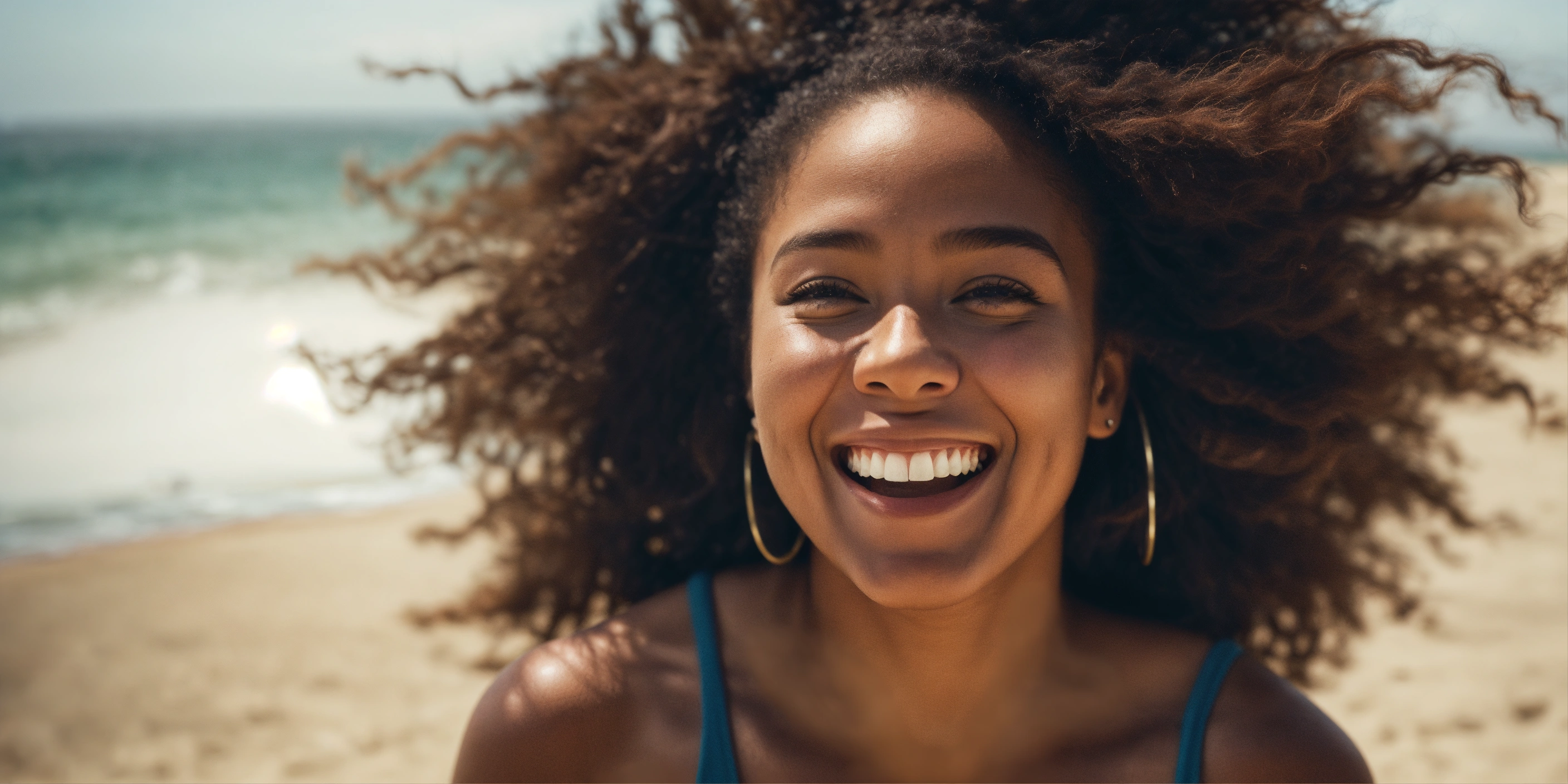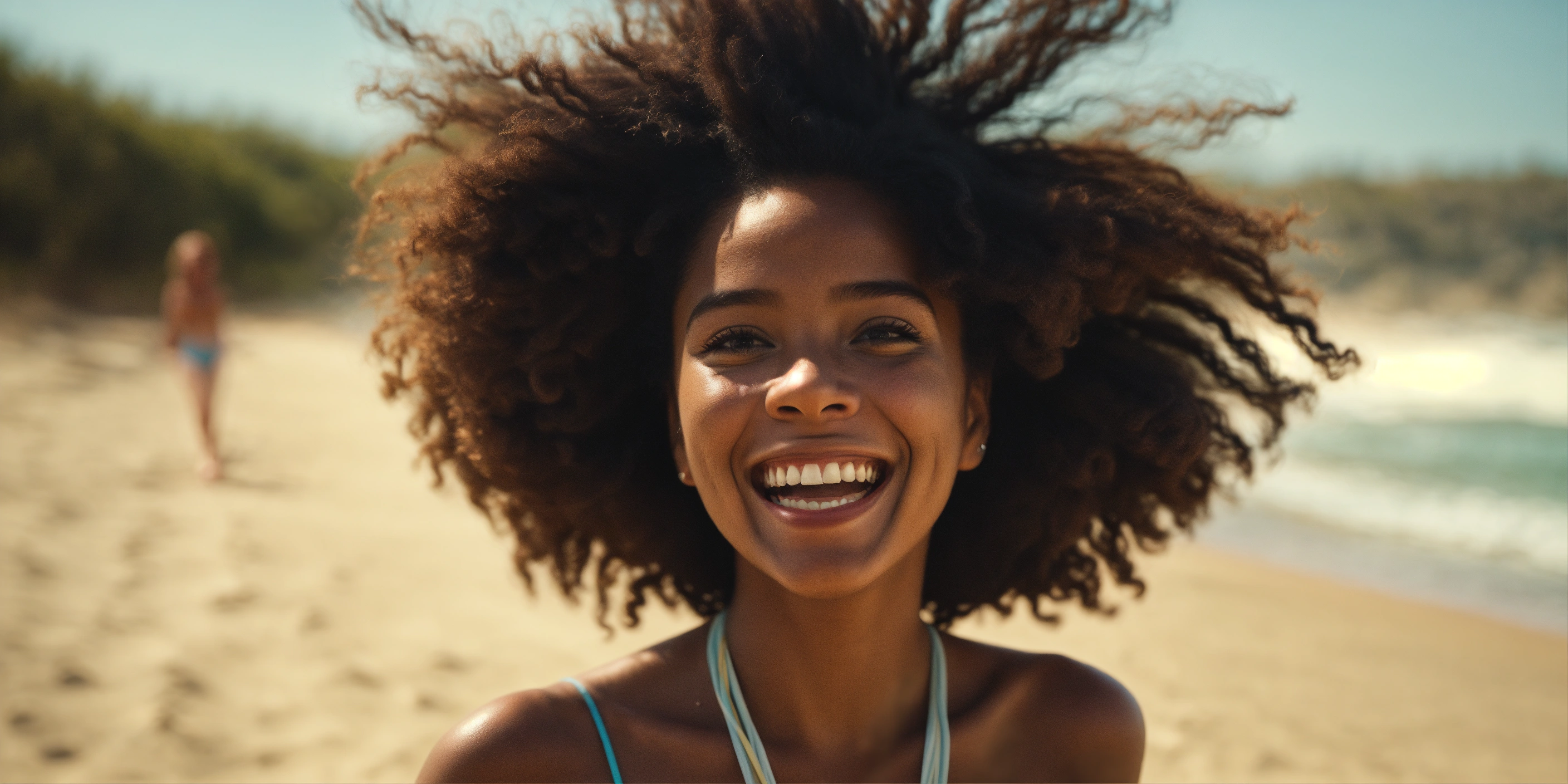 A young afro-american girl with her hair in the wind, laughing out loud at the beach, blurred beach, selective focus on the woman, vintage filter, 16k, cinematic shot, cinematic, realistic, film grain, volumetric light, imax, photorealistic, hyperdetailed textures, sharp focus, ambience light, ground view
