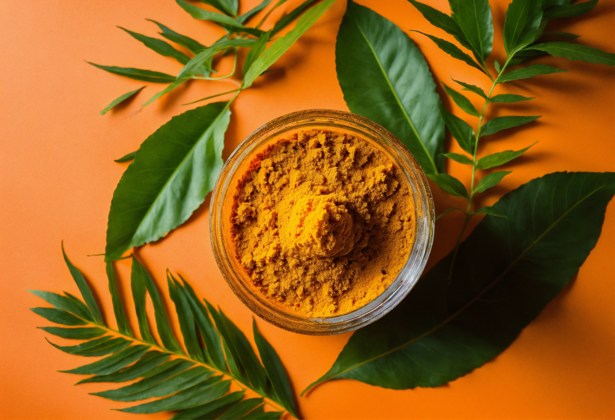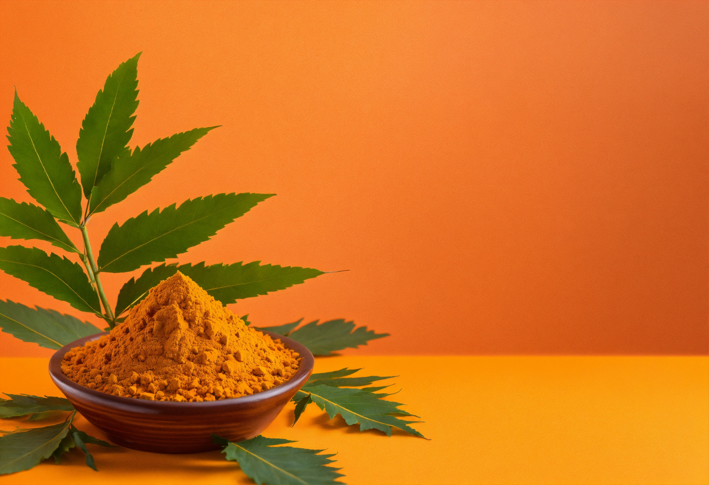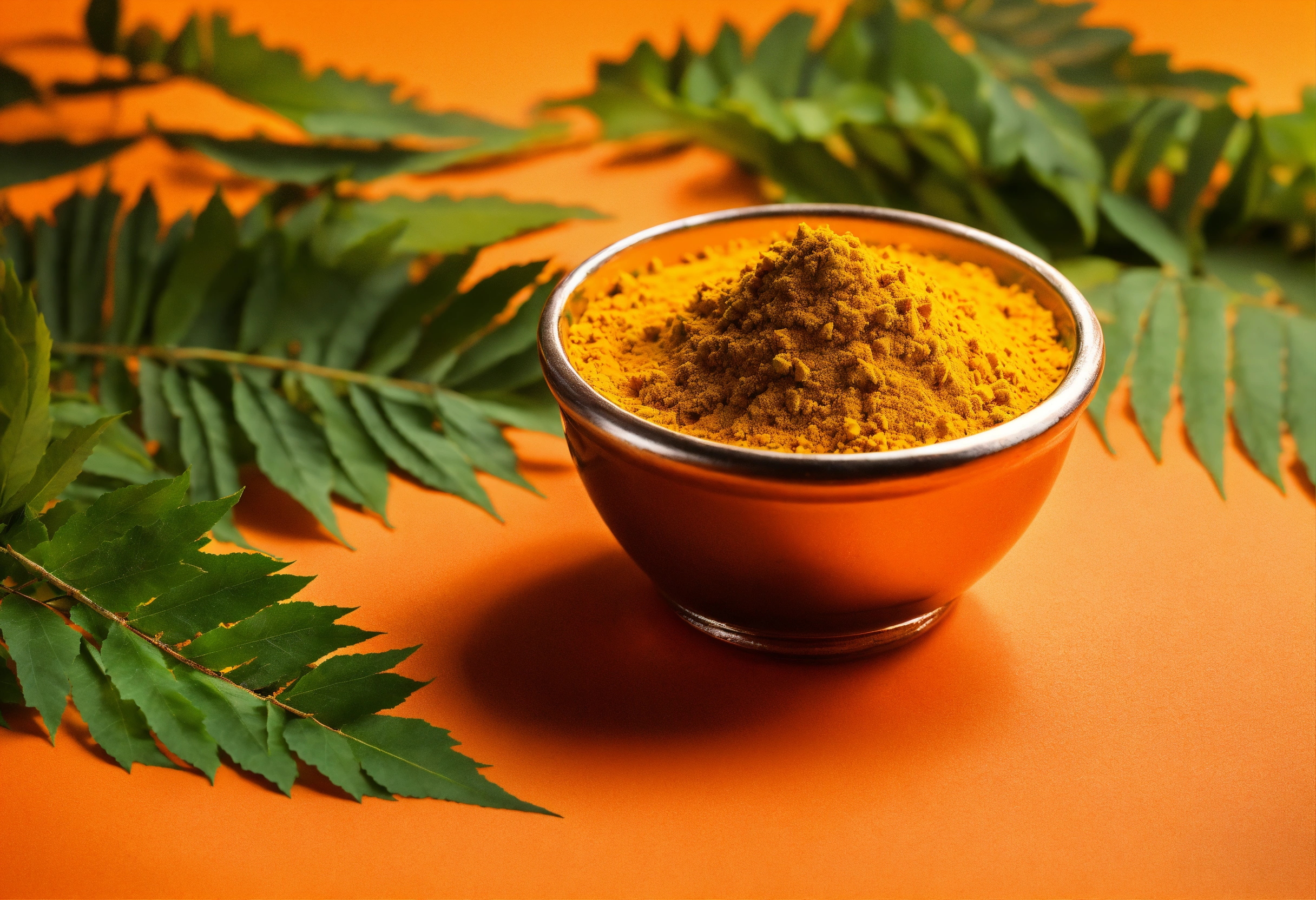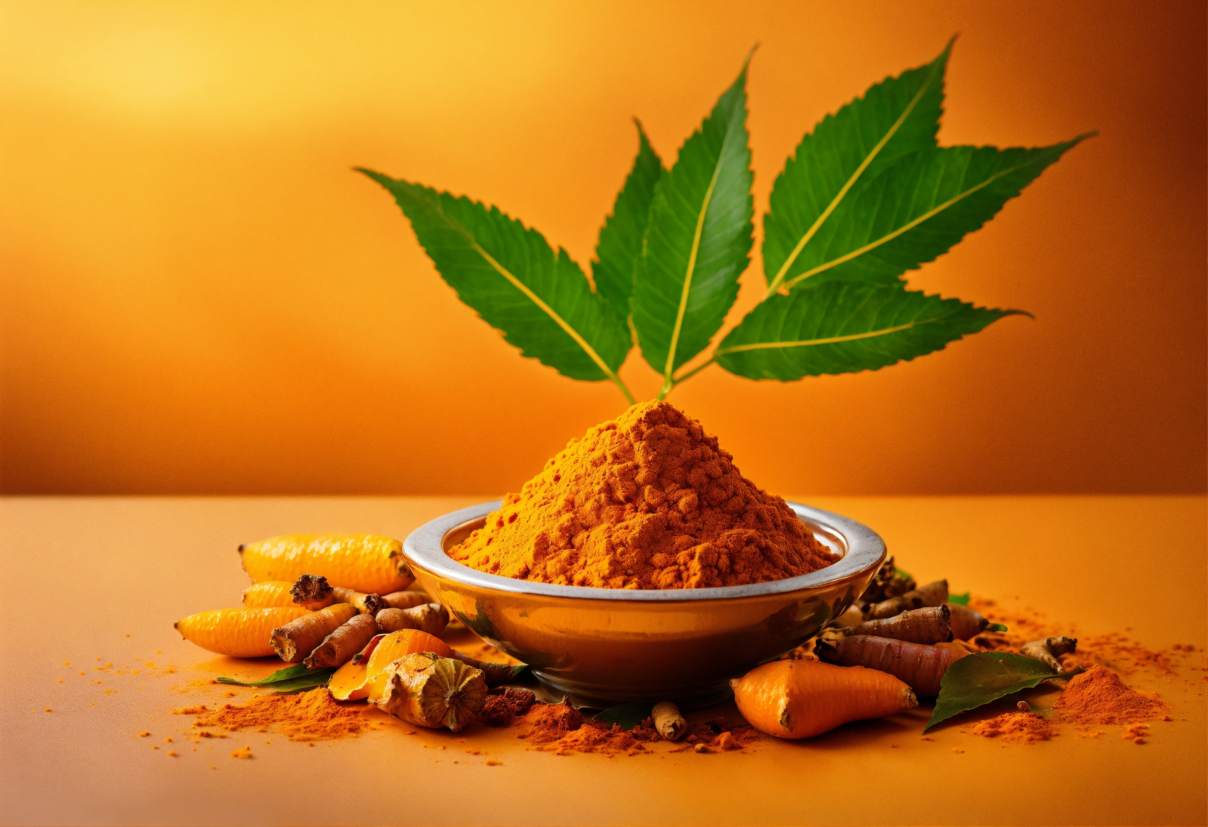 Clear ambient glowing light orange background, neem leaves, turmeric, center piece, advertisement, creative design, vibrant, colorful