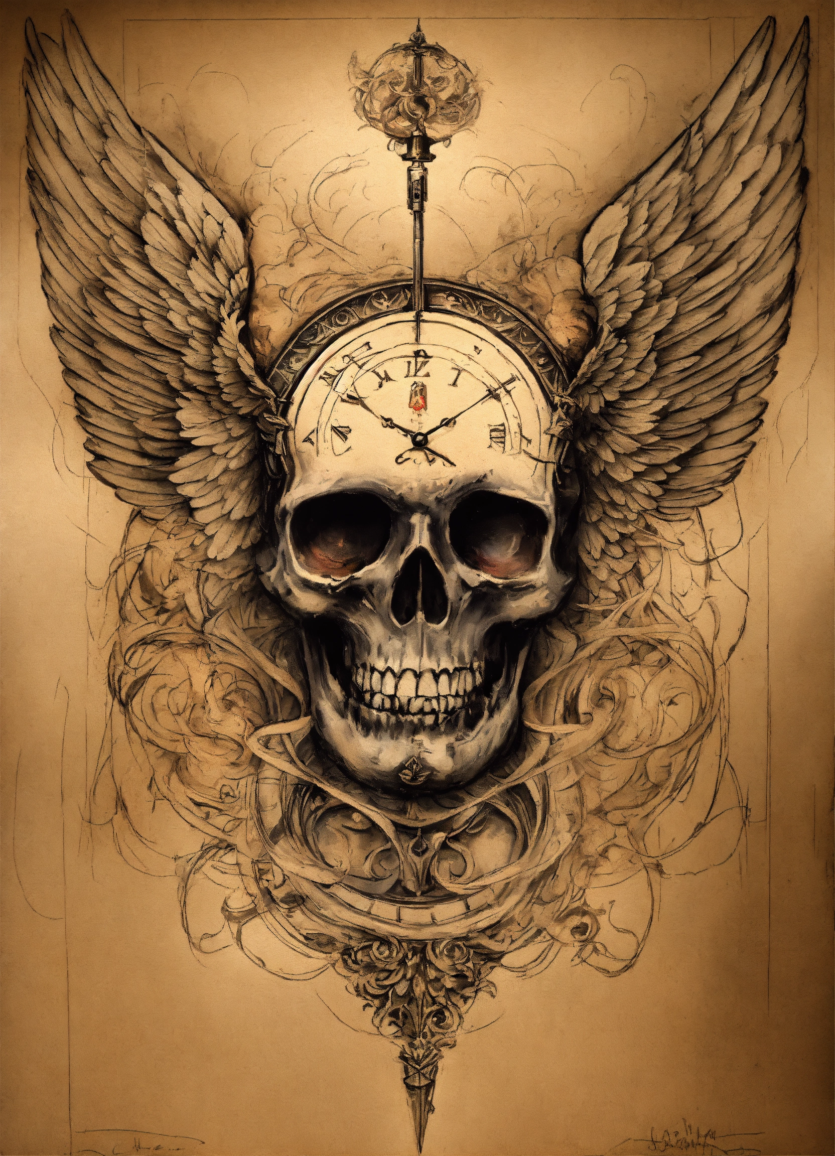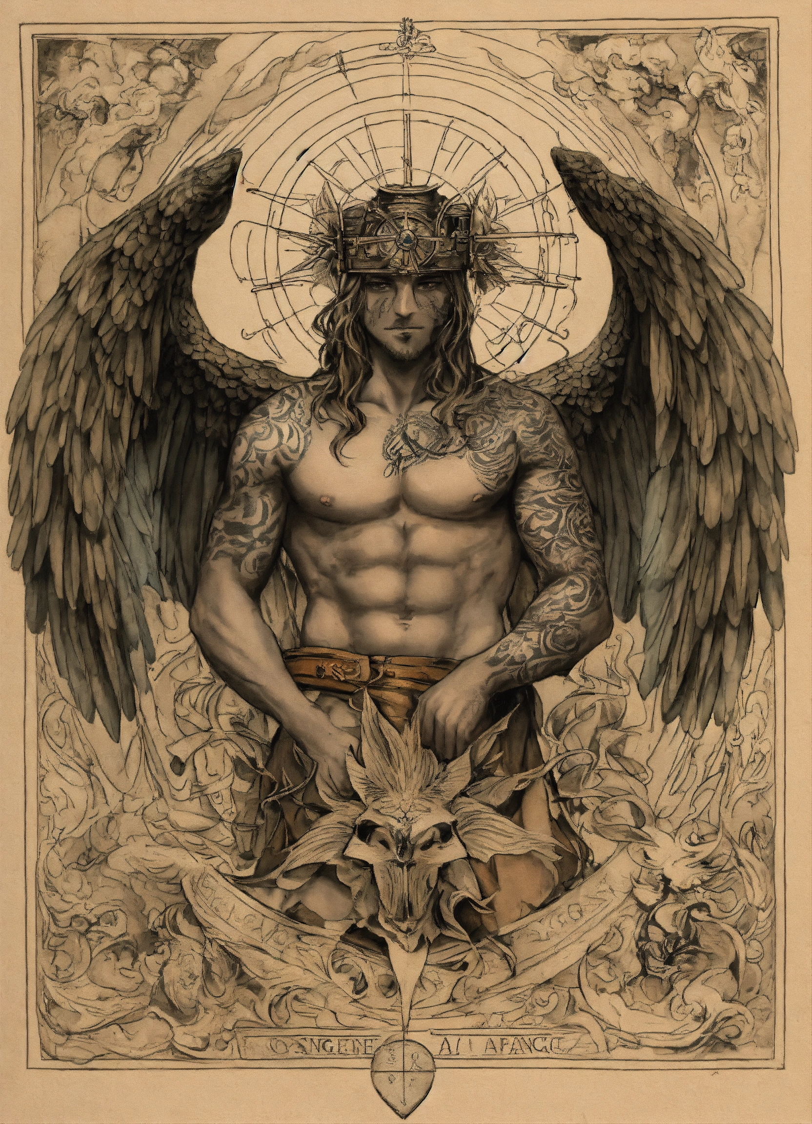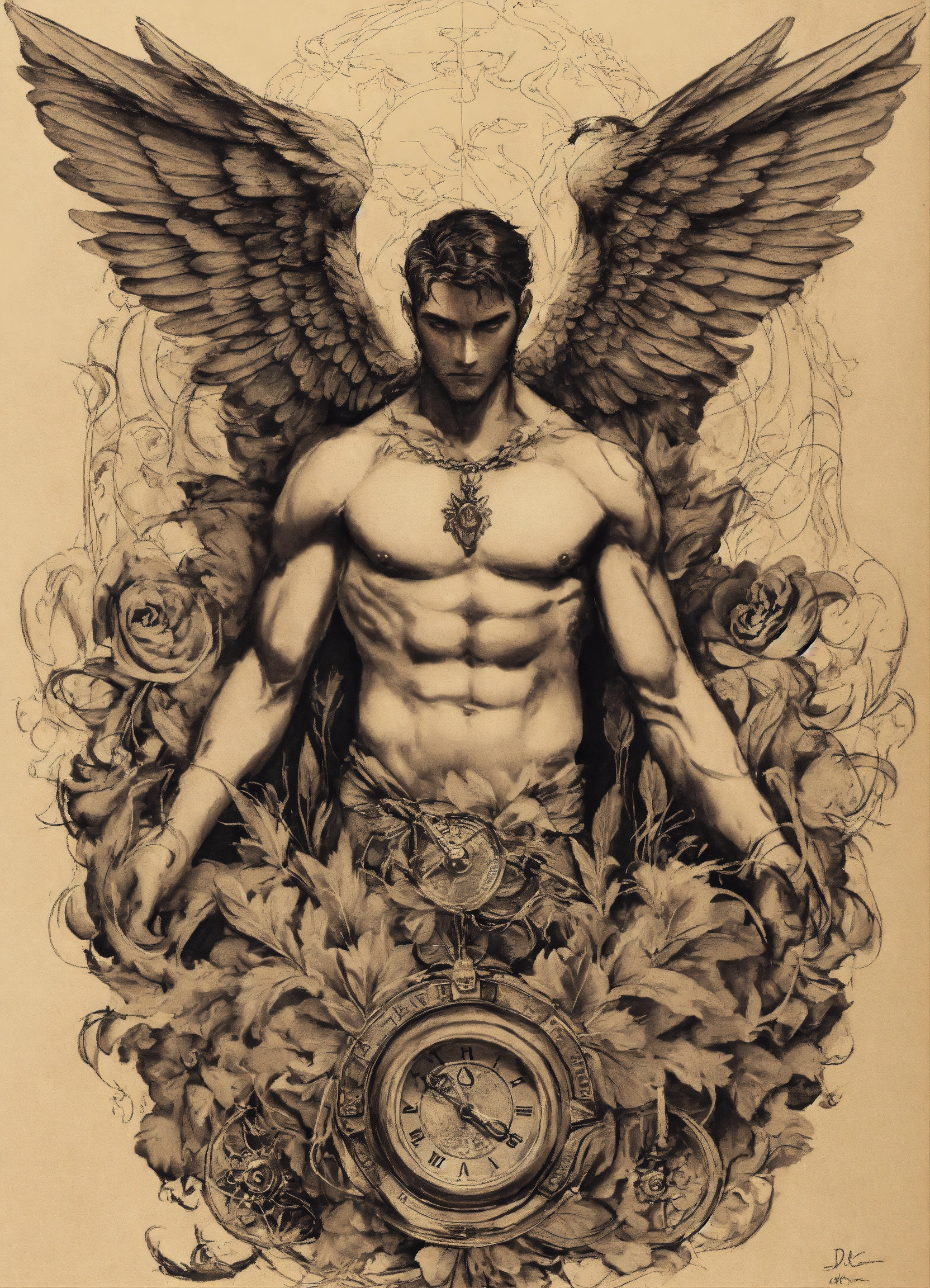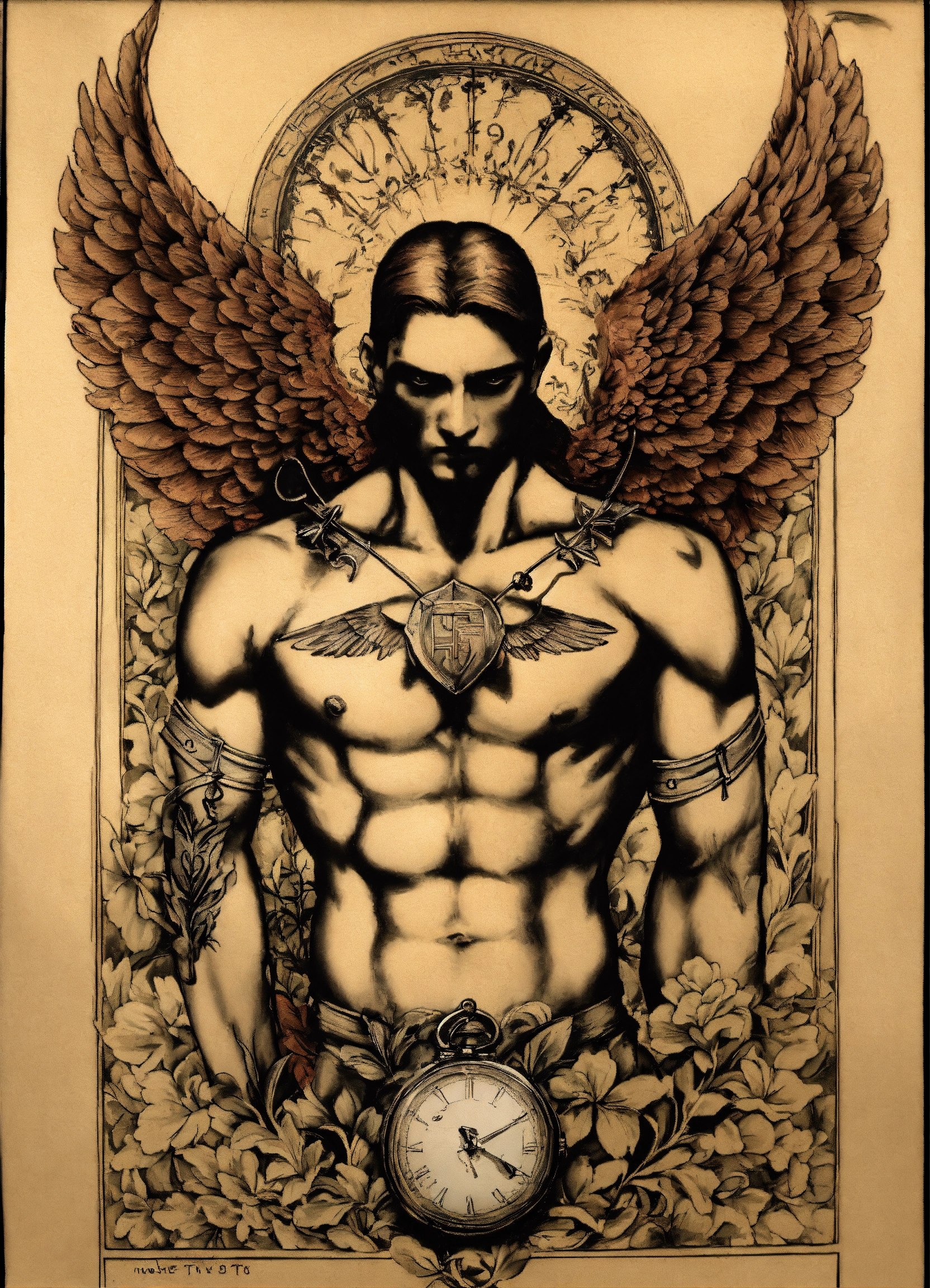 Un dessin de tatouage, un homme moitié ange, moitié démon que l'on voit de la tète au torse. sur son torse une moitié montre, moitié boussole, se désagrégeant. il a des ailes et il tient entre ses main un glock19 avec de la fumée qui sort du canon. la peau de l'homme sur la partie ange doit avoir quelques cicatrices.