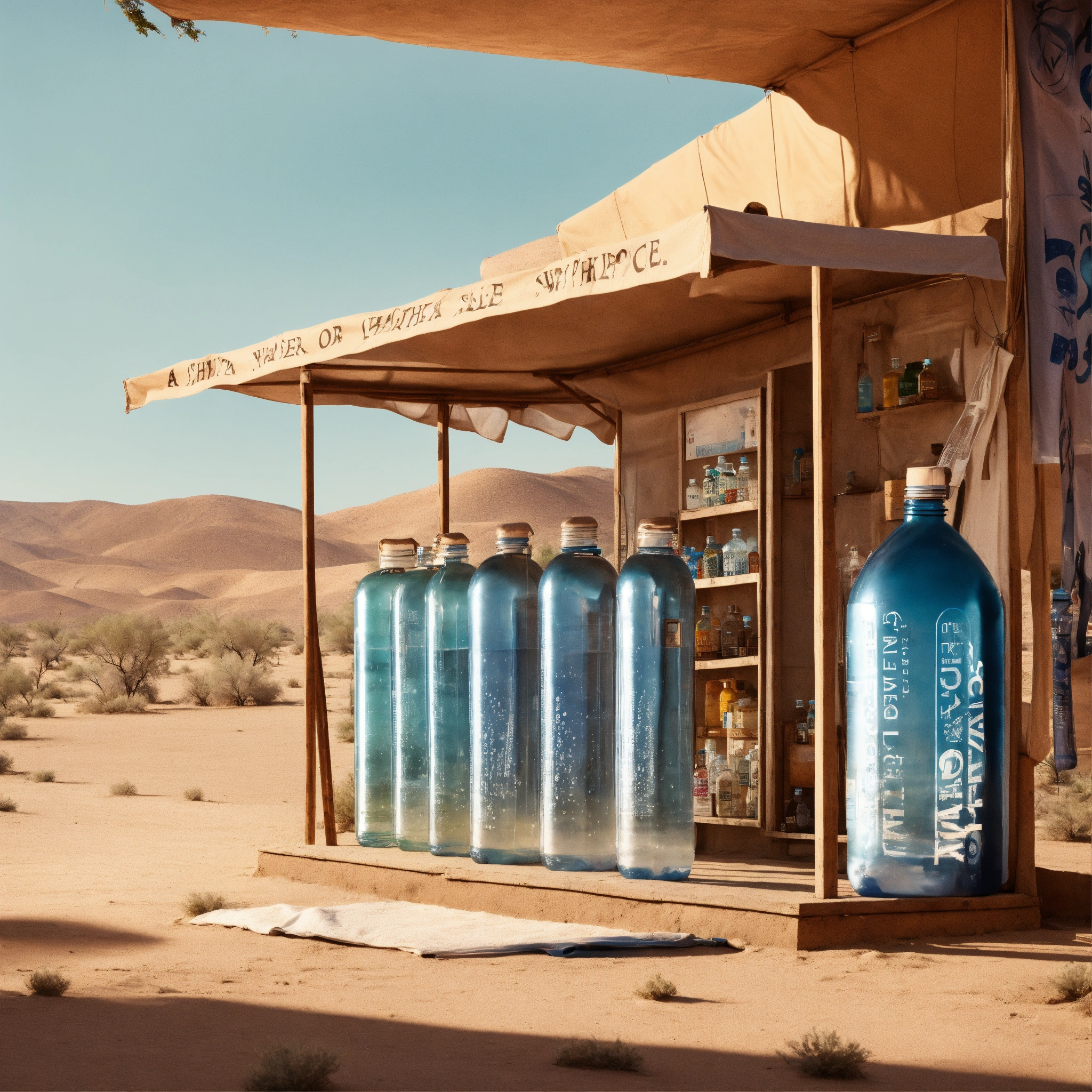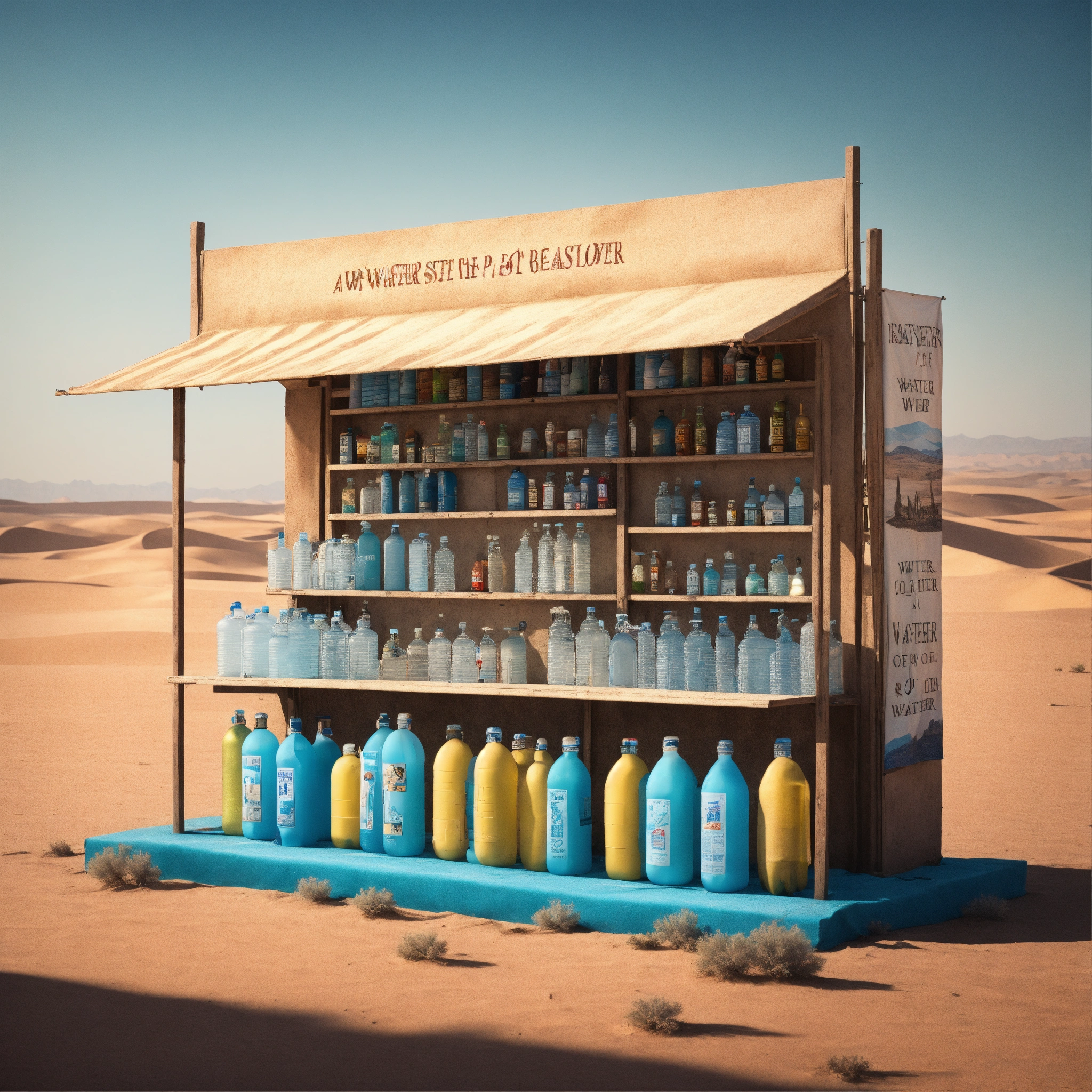 A water shop in the middle of the desert, near the shop, water bottles, next to a banner with water bottles on it. surrealist style