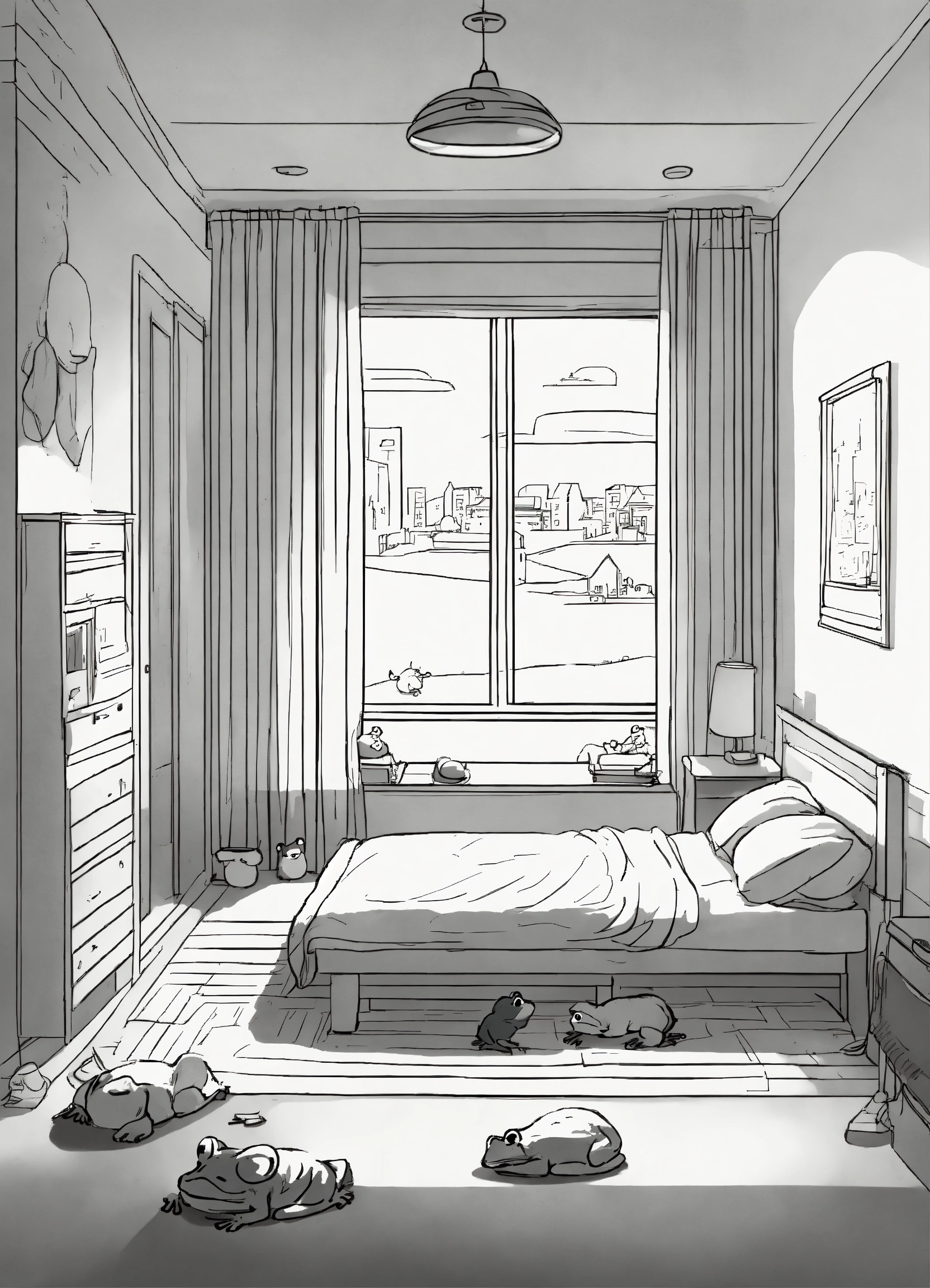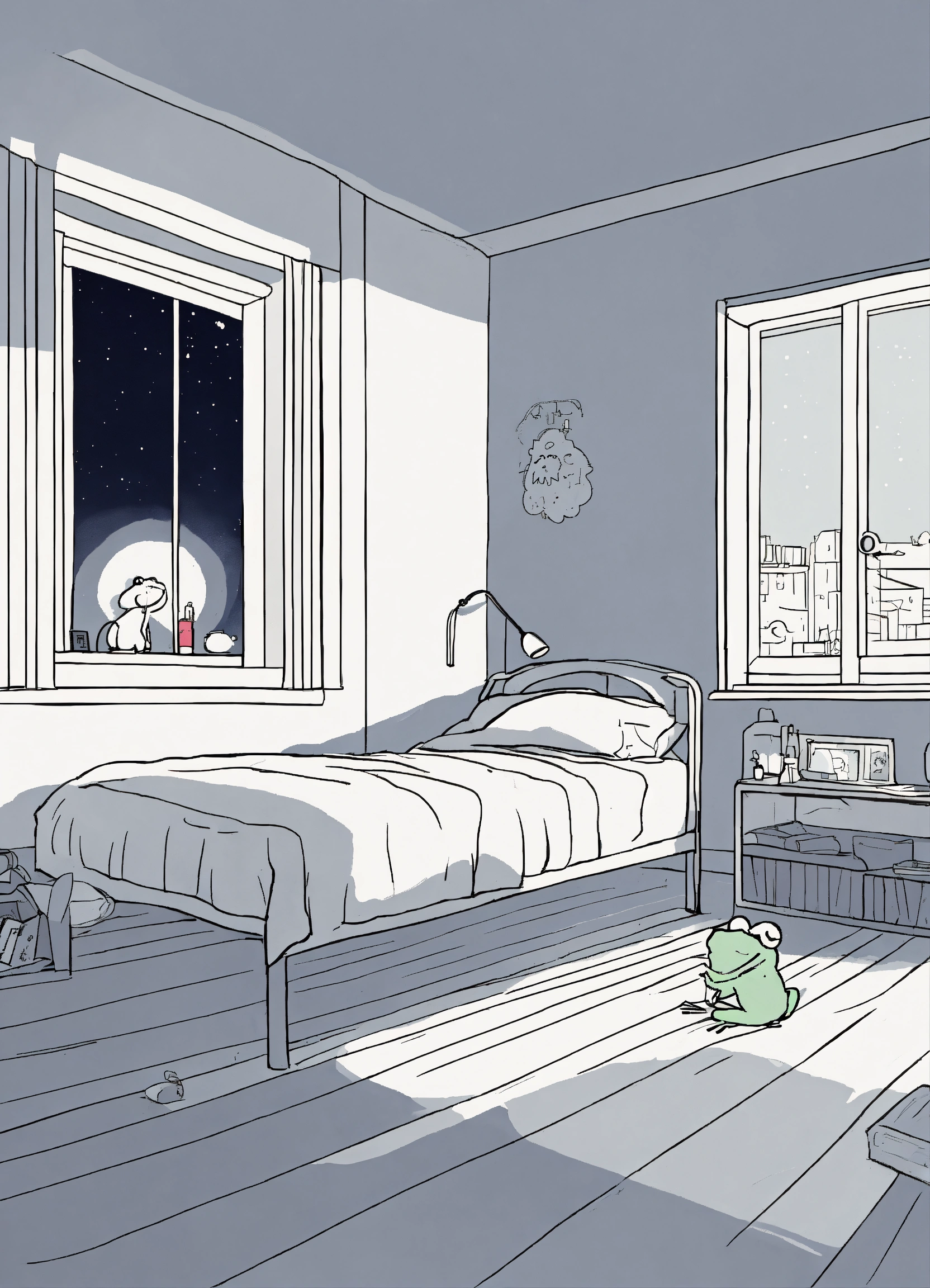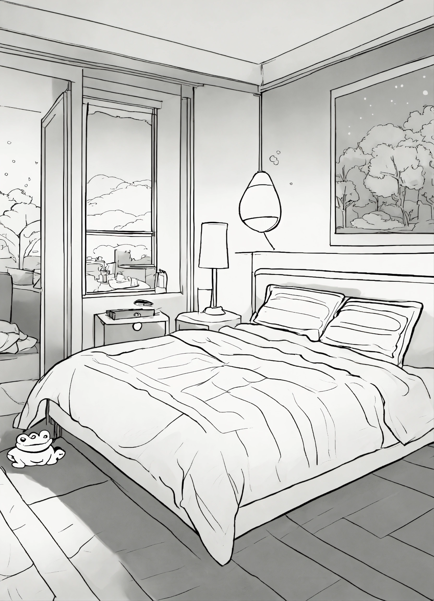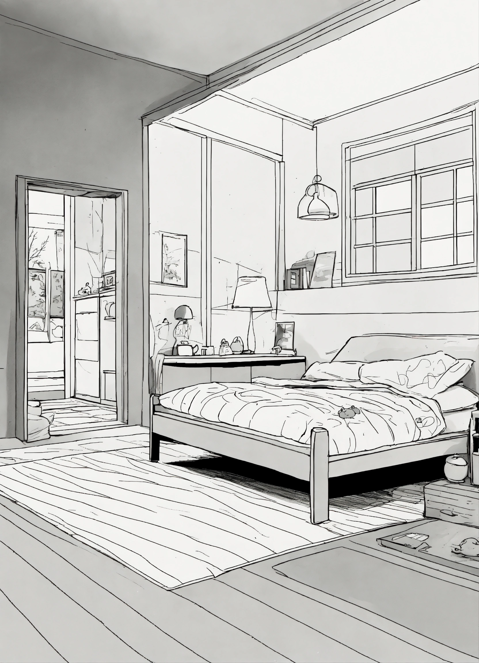 A childrensbook like drawing of a minimalistic bedroom at night without color