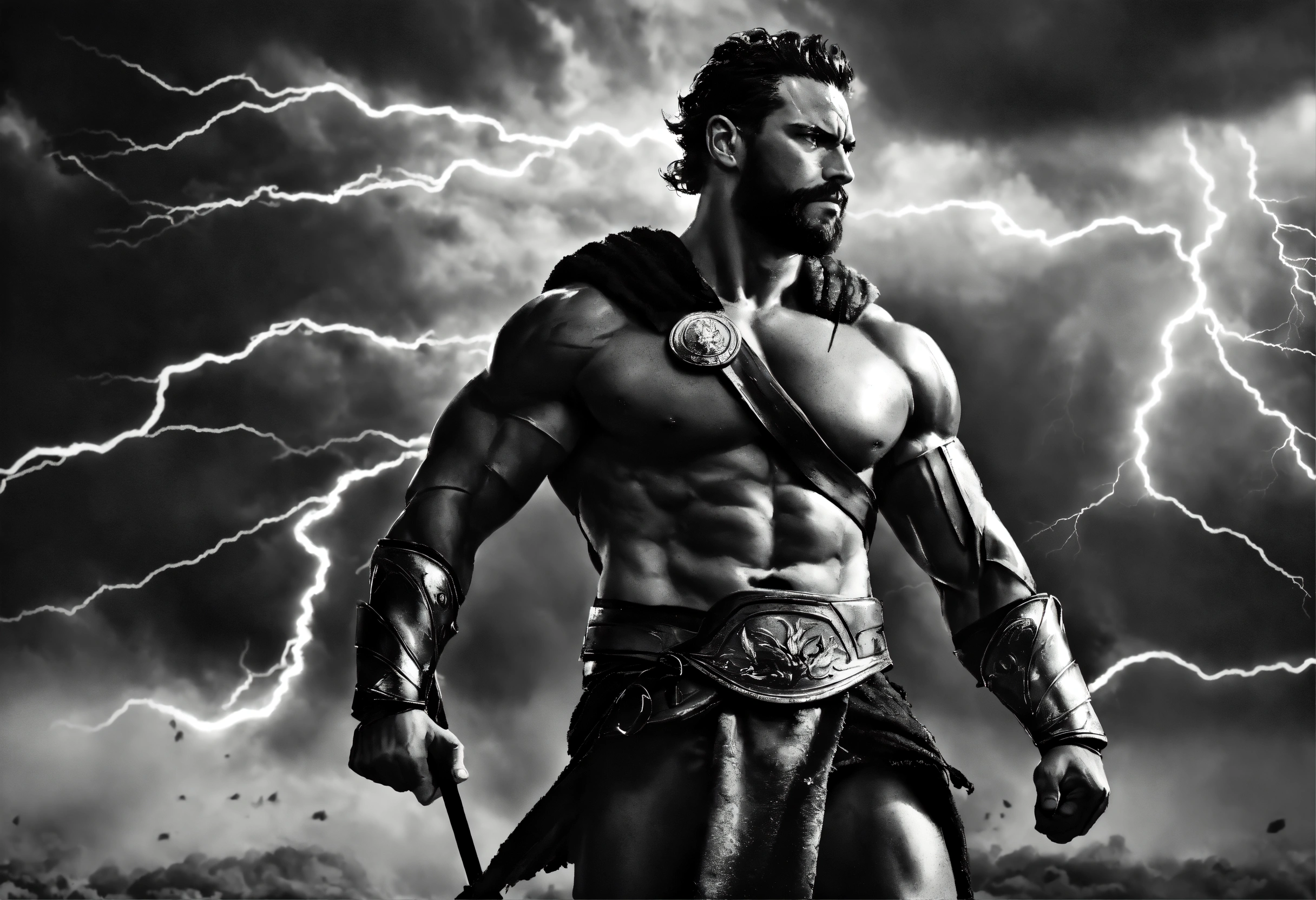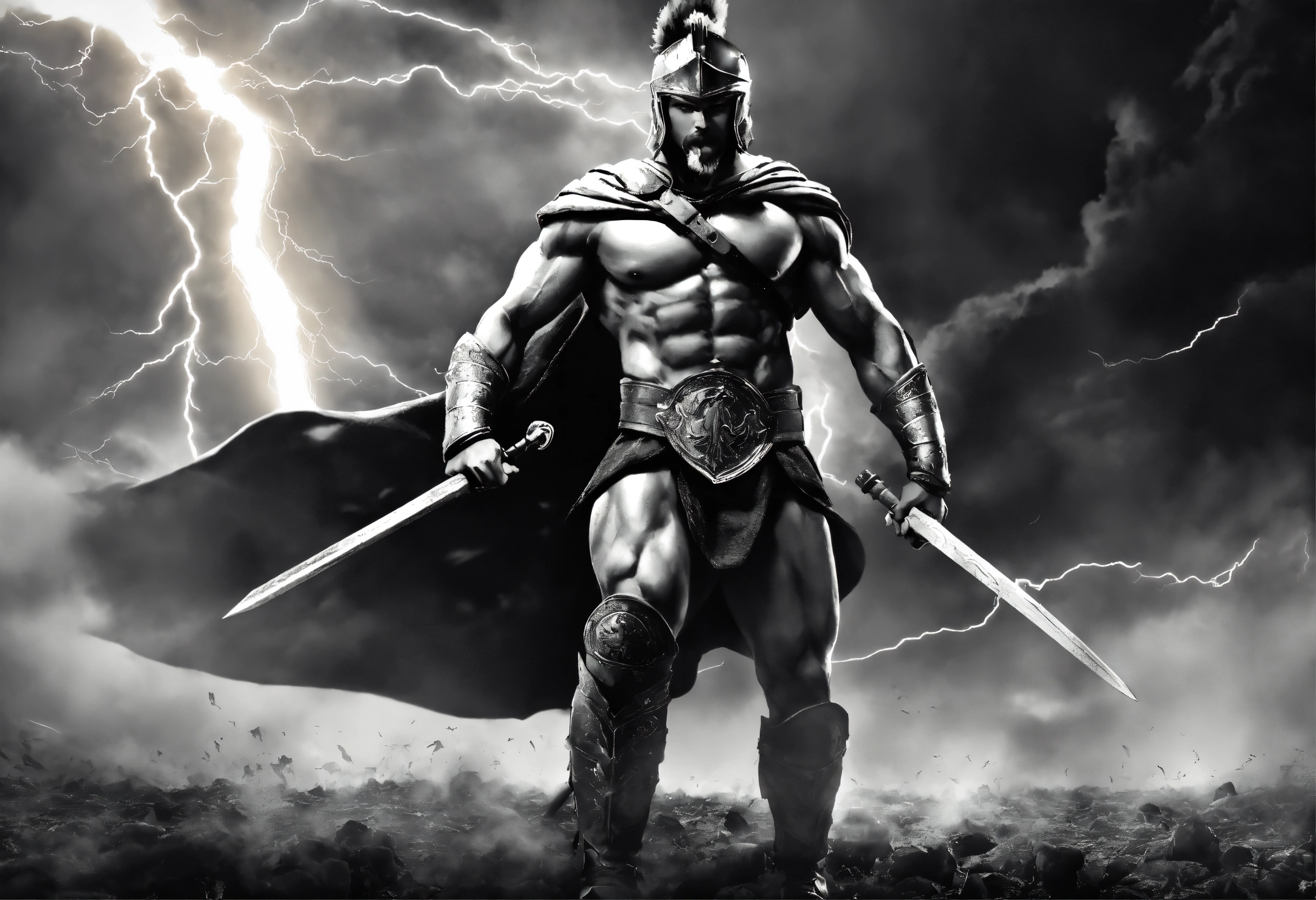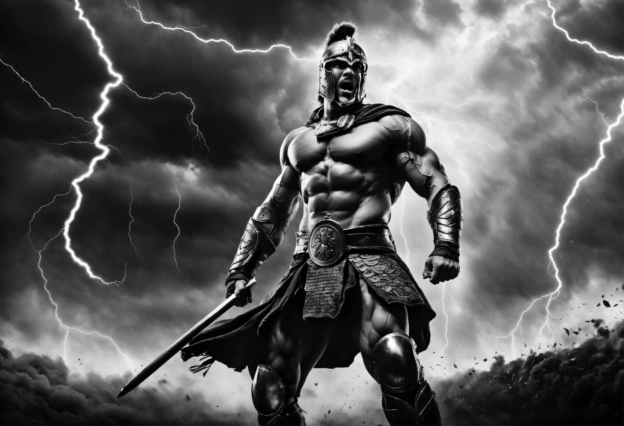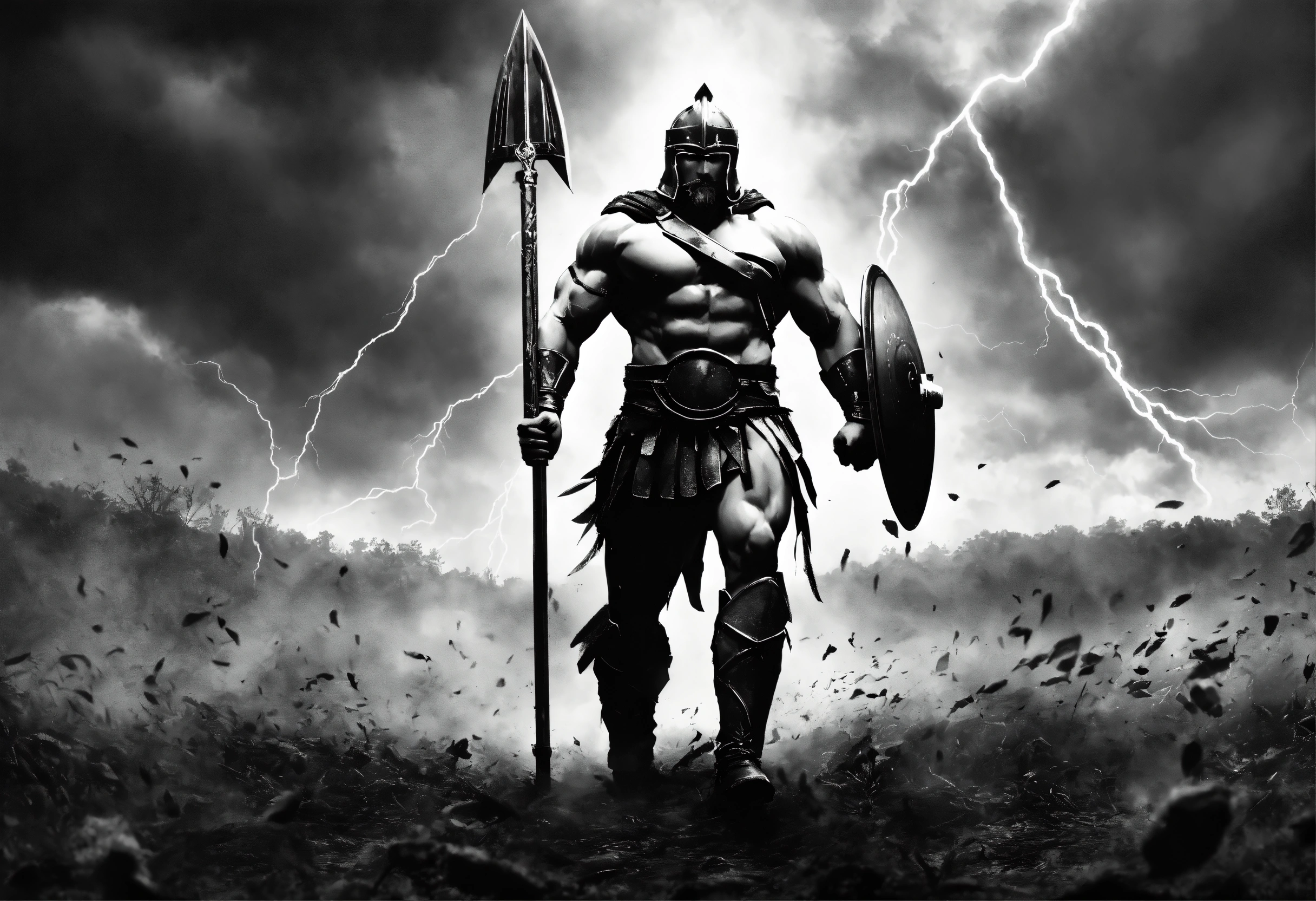 A black and white illustration of masculine man marching forward in battle, action shot, standing on battlefield, with big muscles, looking forward, warriors, with lightning and clouds swirling around him, spartan warrior, facing camera, face shot