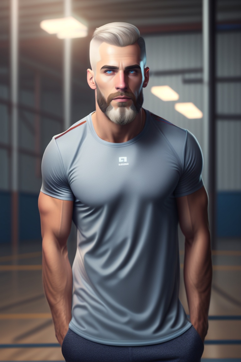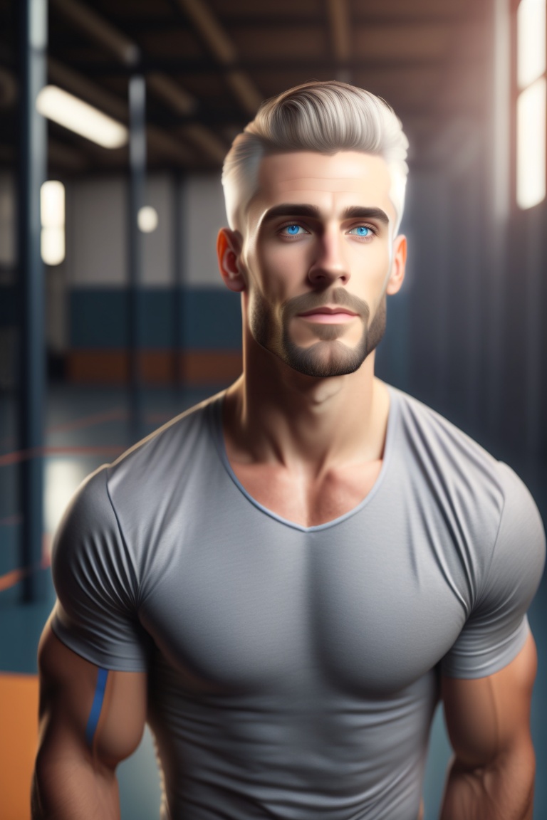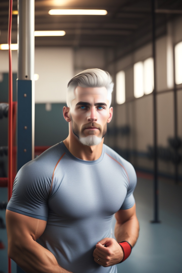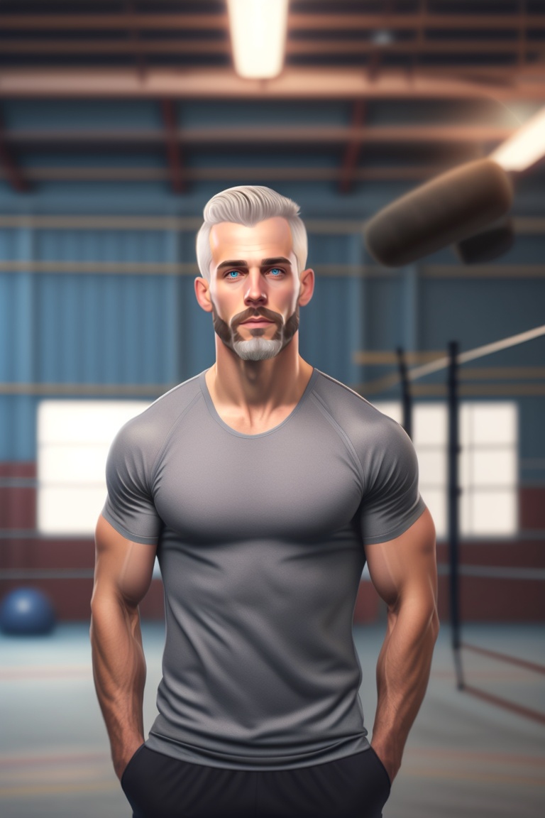 Handsome slim blue eyed man with short grey hair and beard, in t-shirt, sport style, in old school boxing gym interior, photoshoot by alessio albi, film grain, realistic