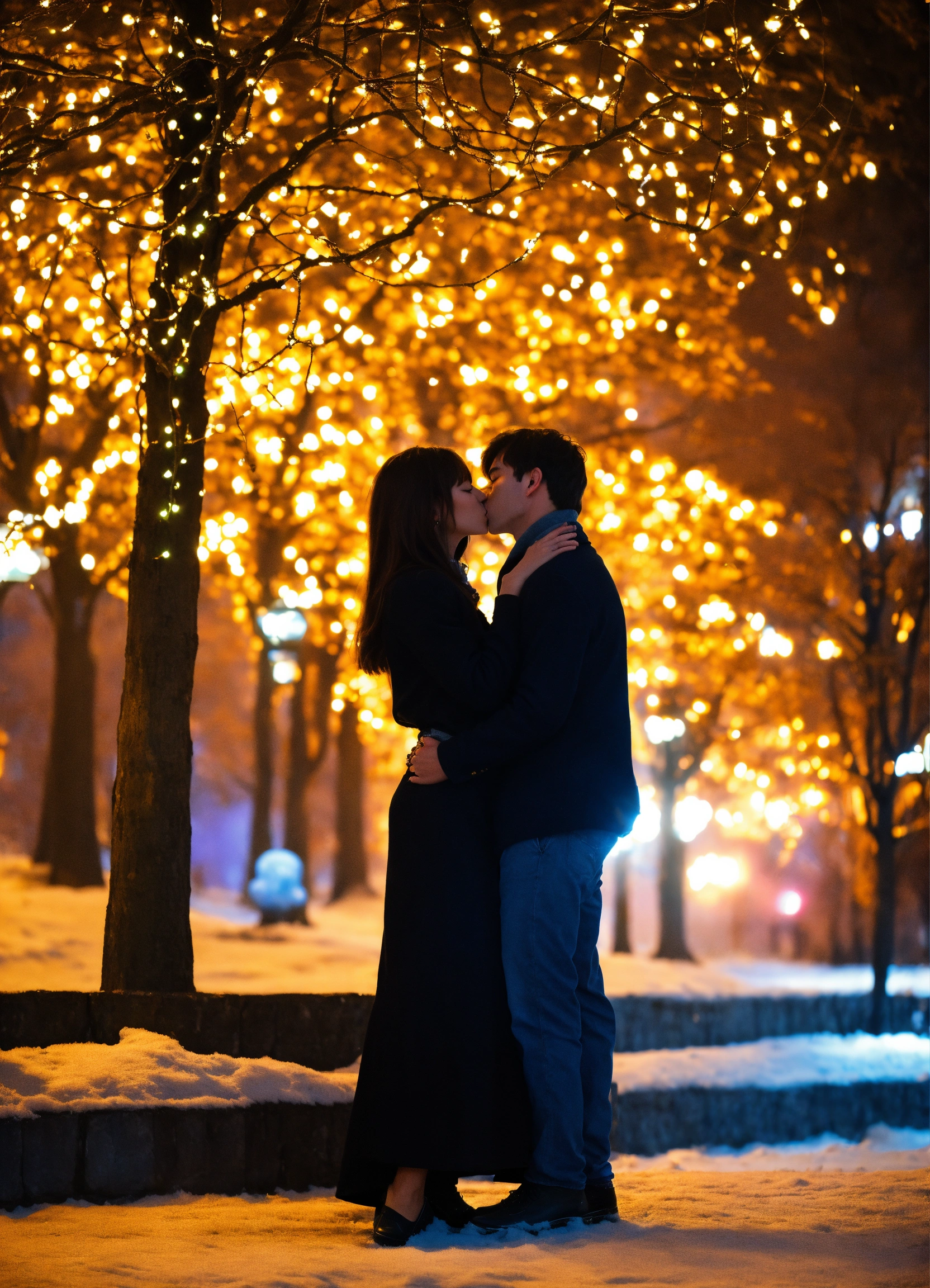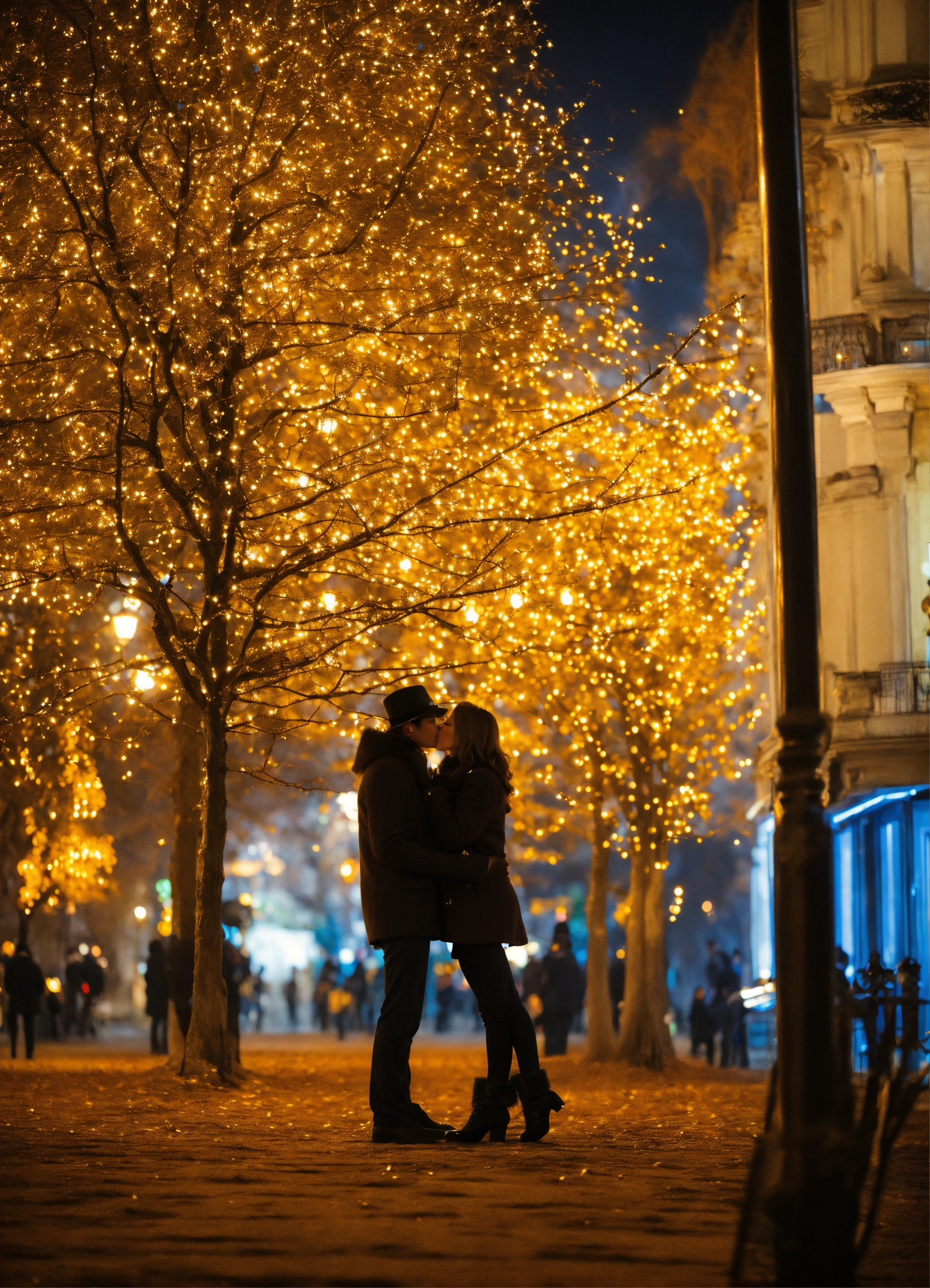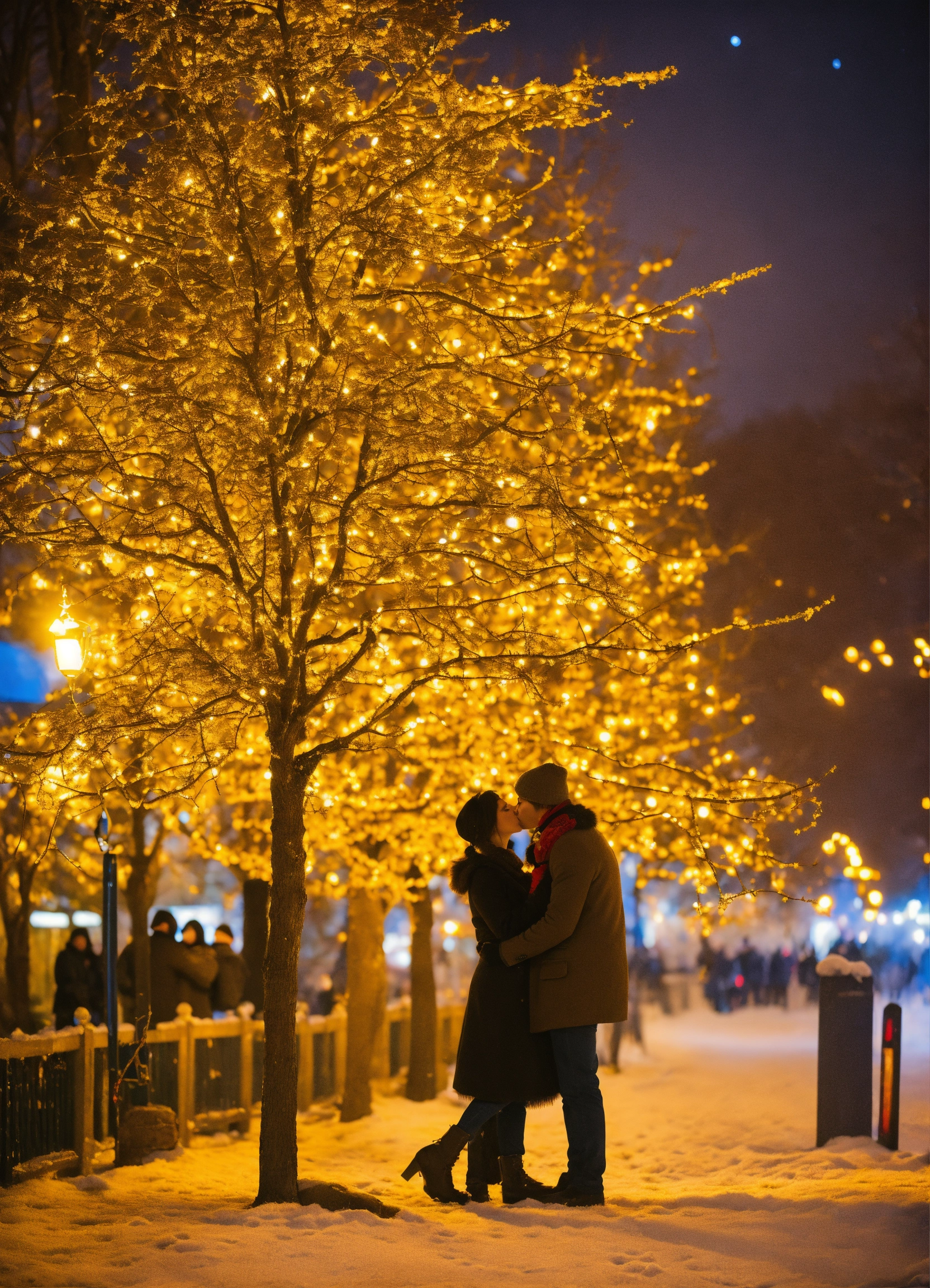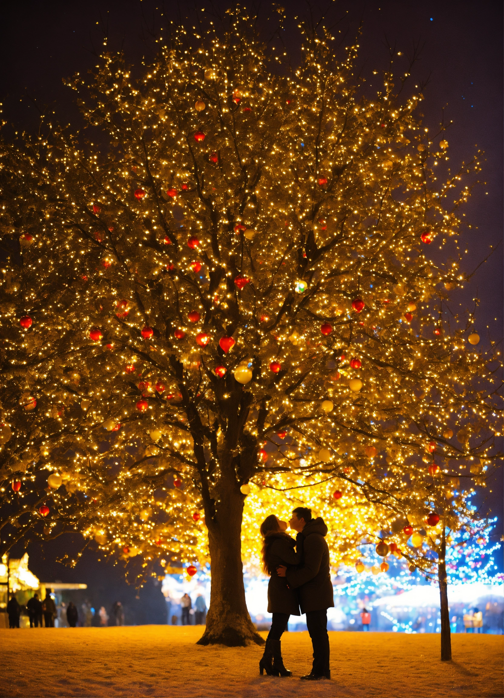Kiss of lovers at the chime of the new year tree