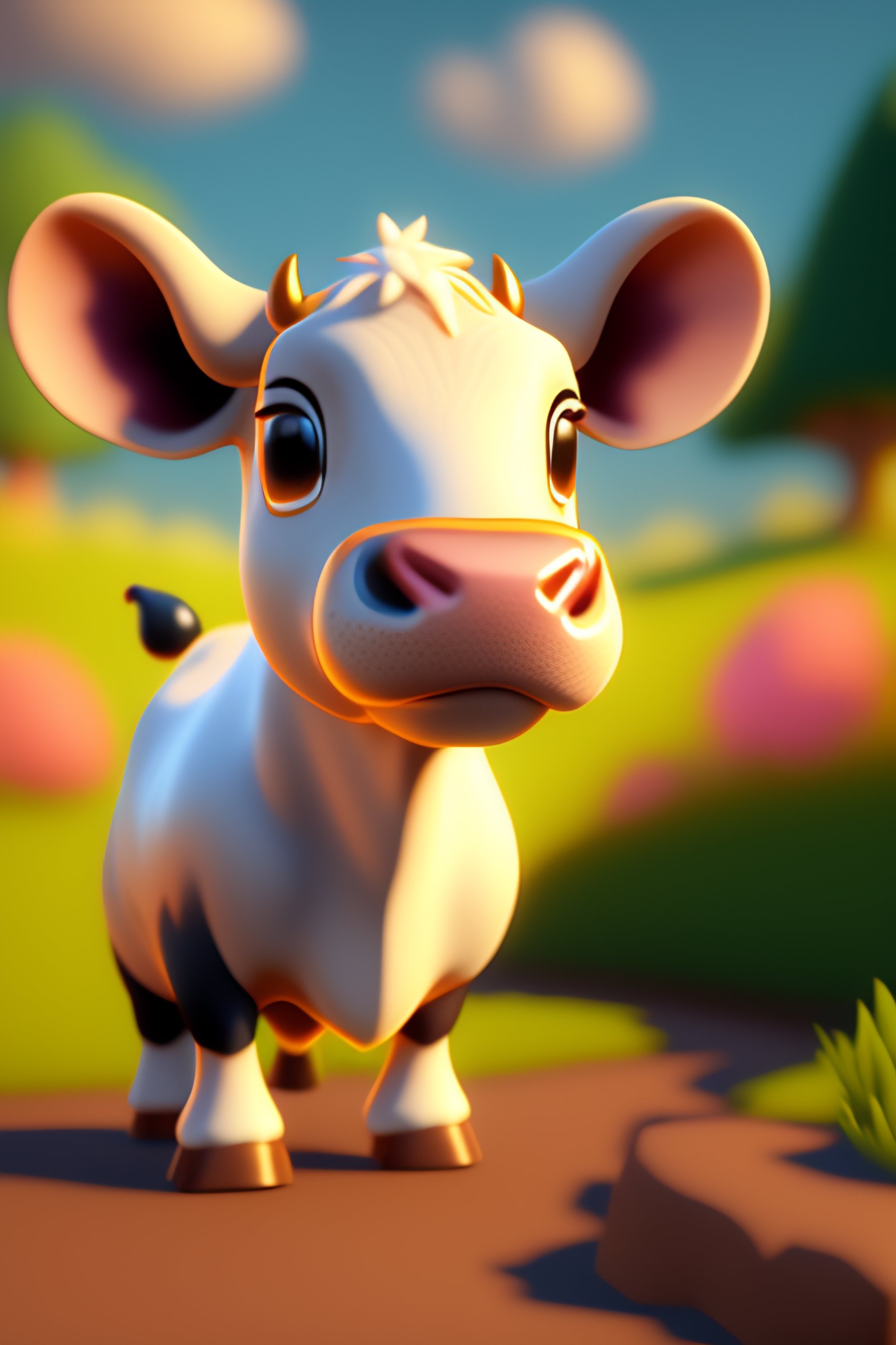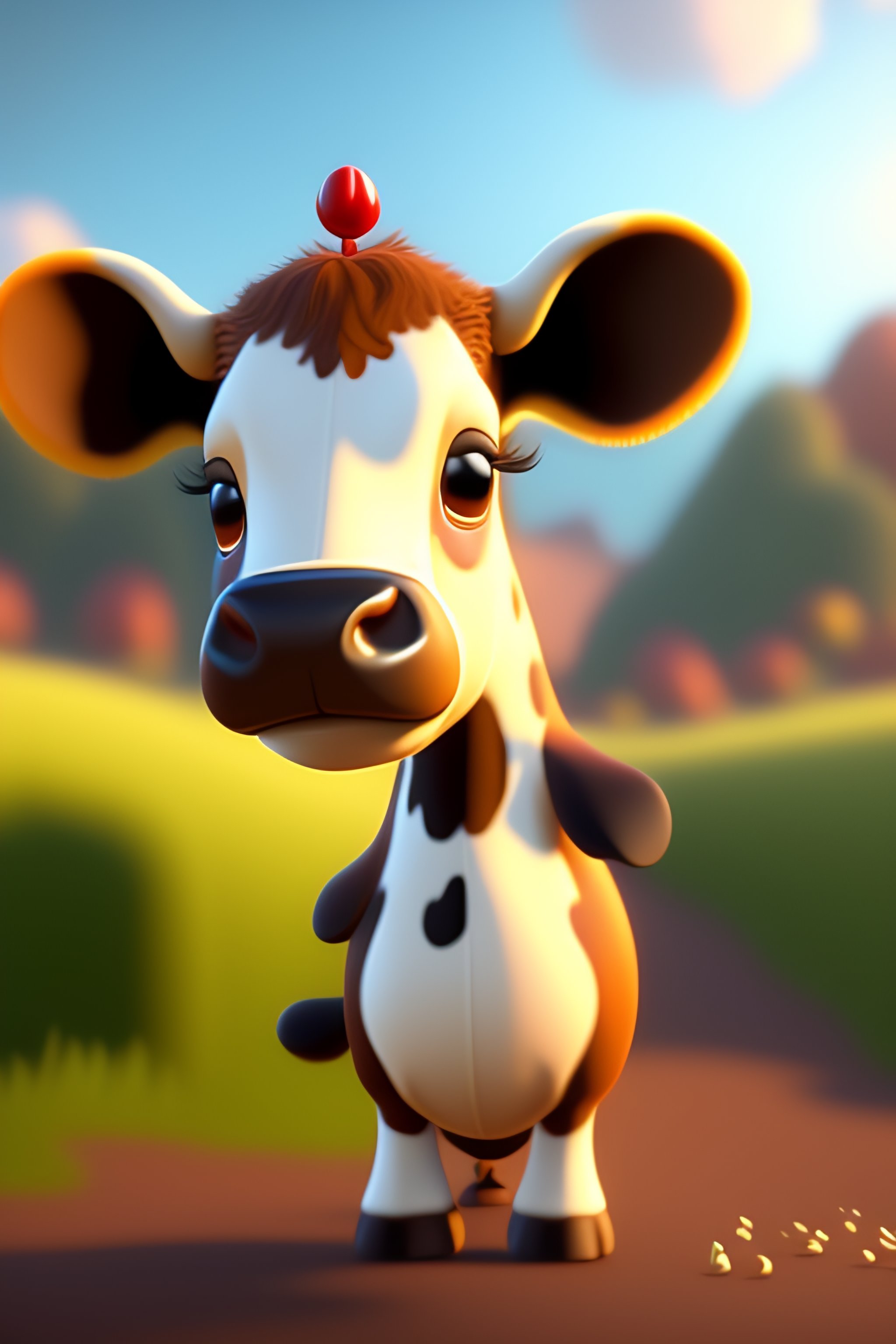 Happy cute cow cartoon character in old disney style in 2d, milk, farm background, hdr, ray tracing, global illumination, unreal engine 5, with strawhat