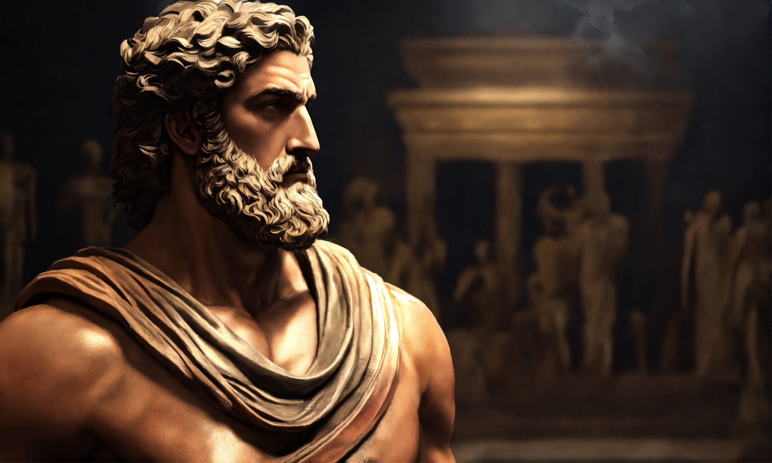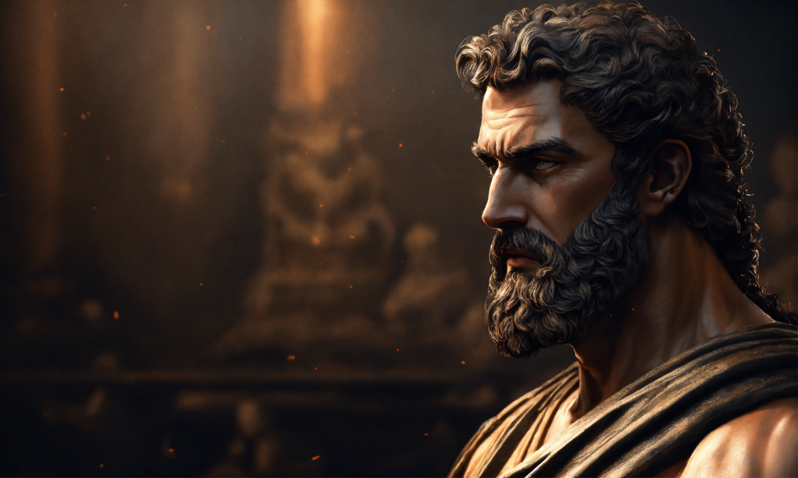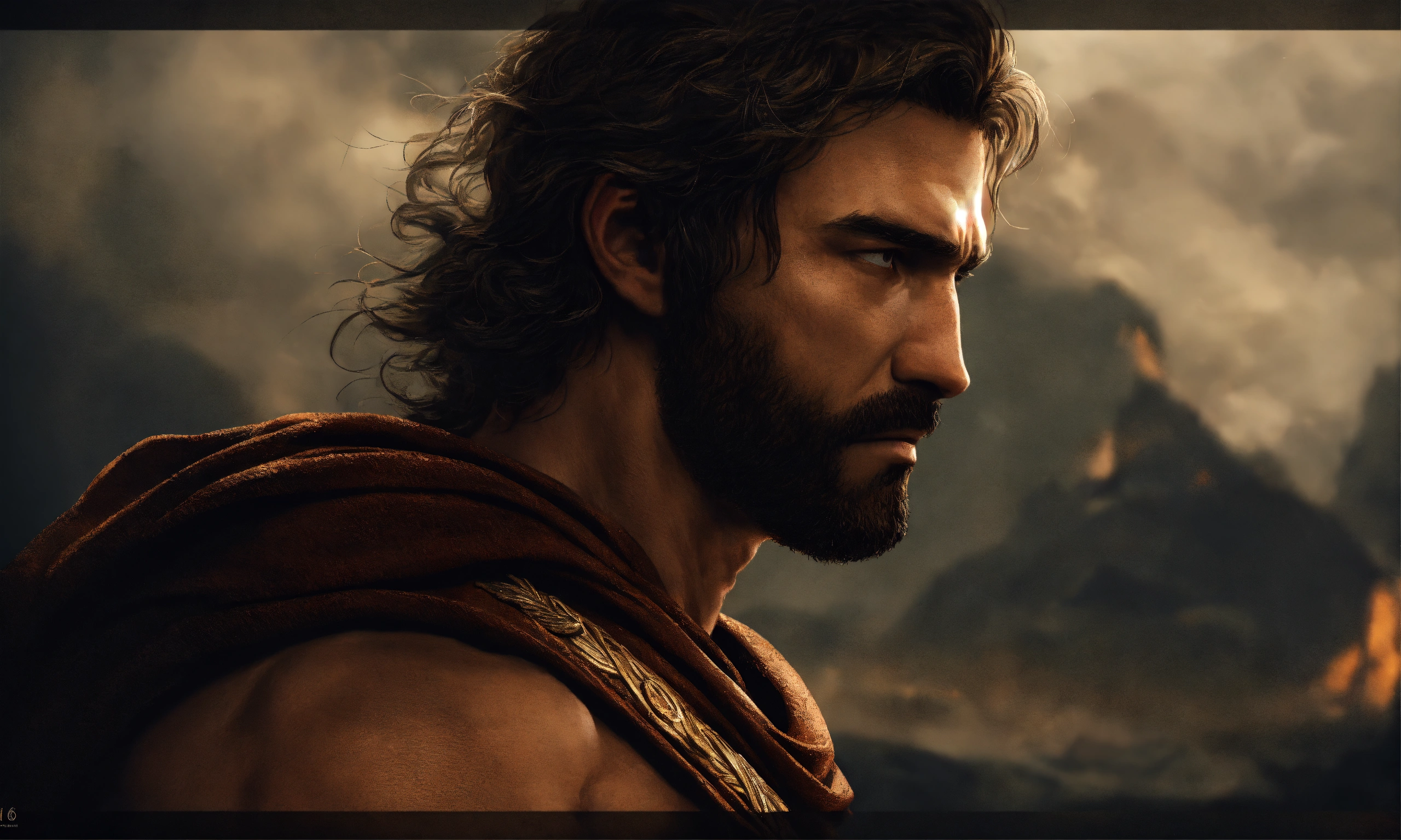 Stoic man, muscular, dark, ancient greek background, dark smoky background, realistic, well done, detailed, 169, 8k