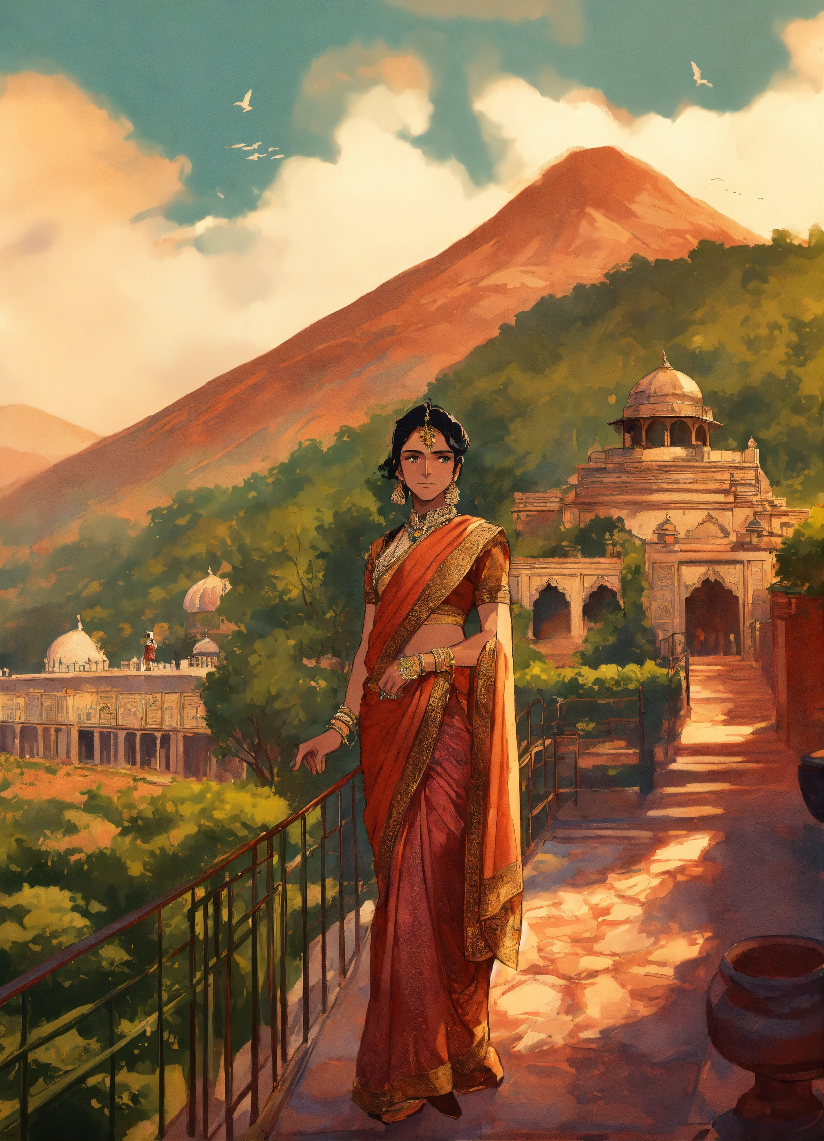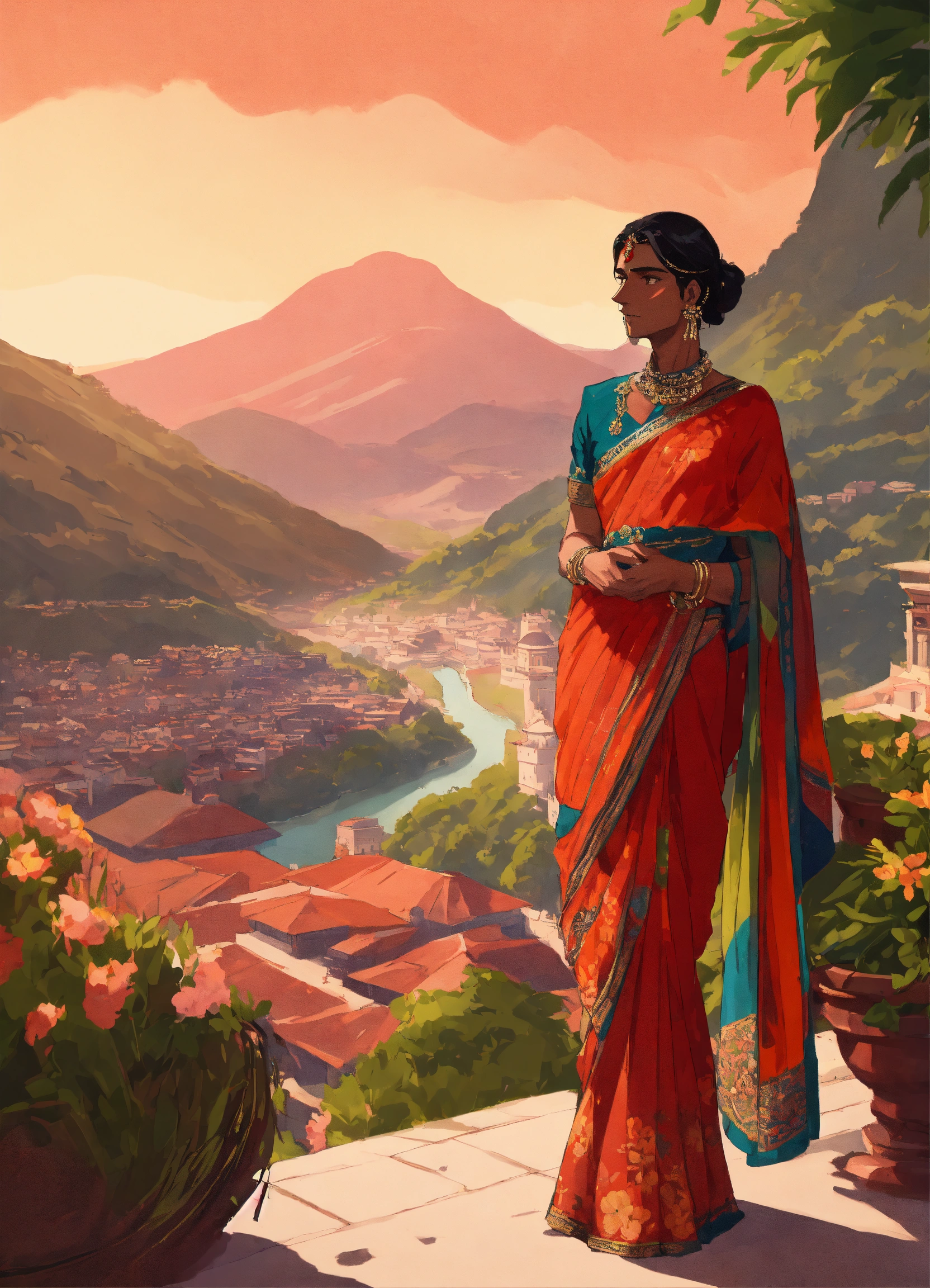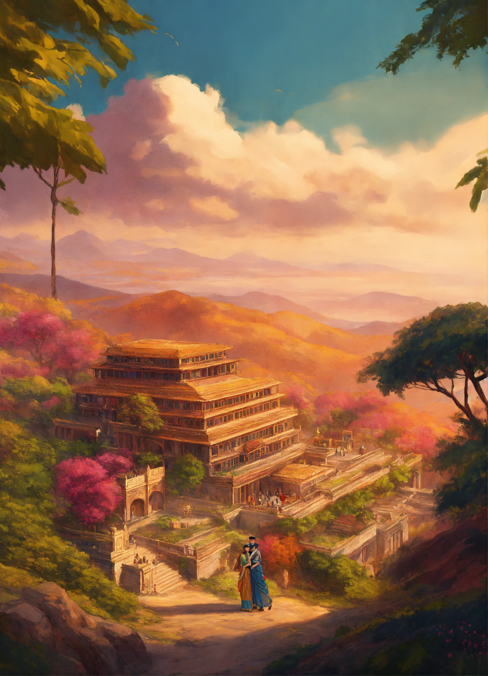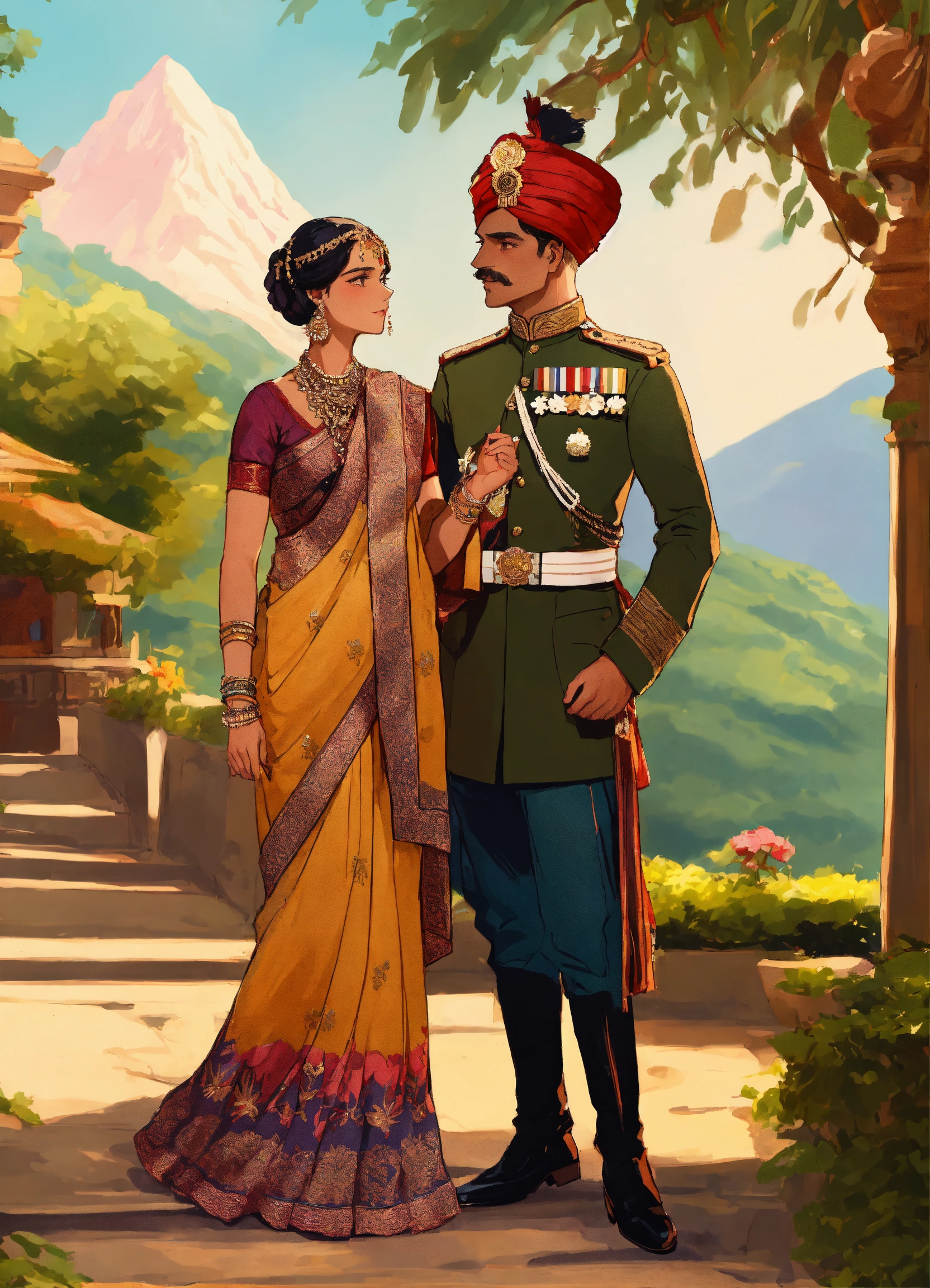 Illustration of a hill station, 1920, british india, the man is british officer, the indian woman wears a intricate sari, maximalist, 8k photo, anime style, trending on artstation