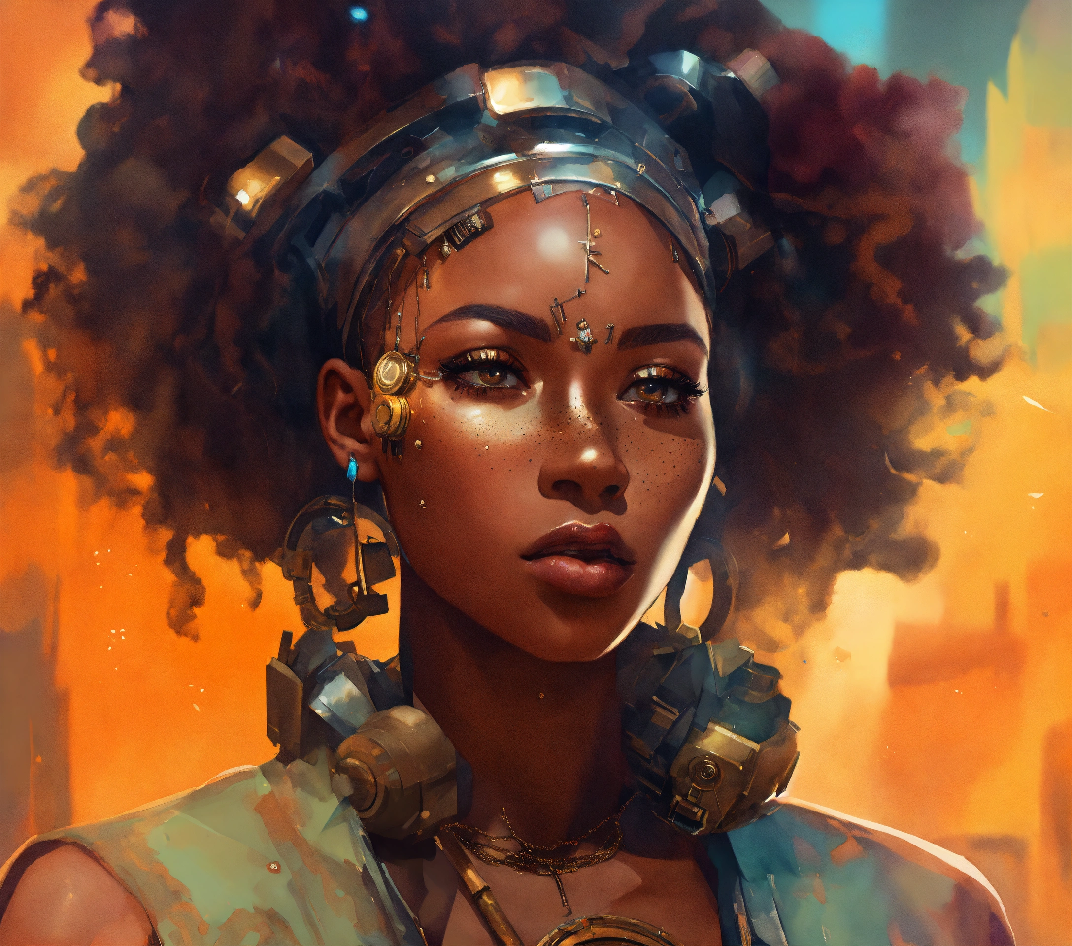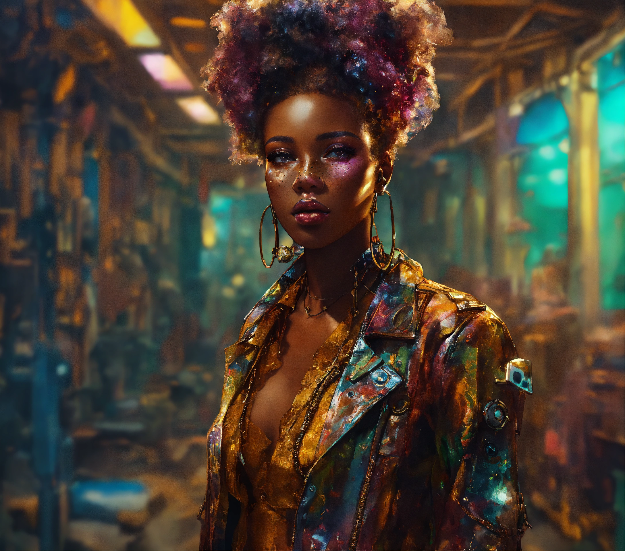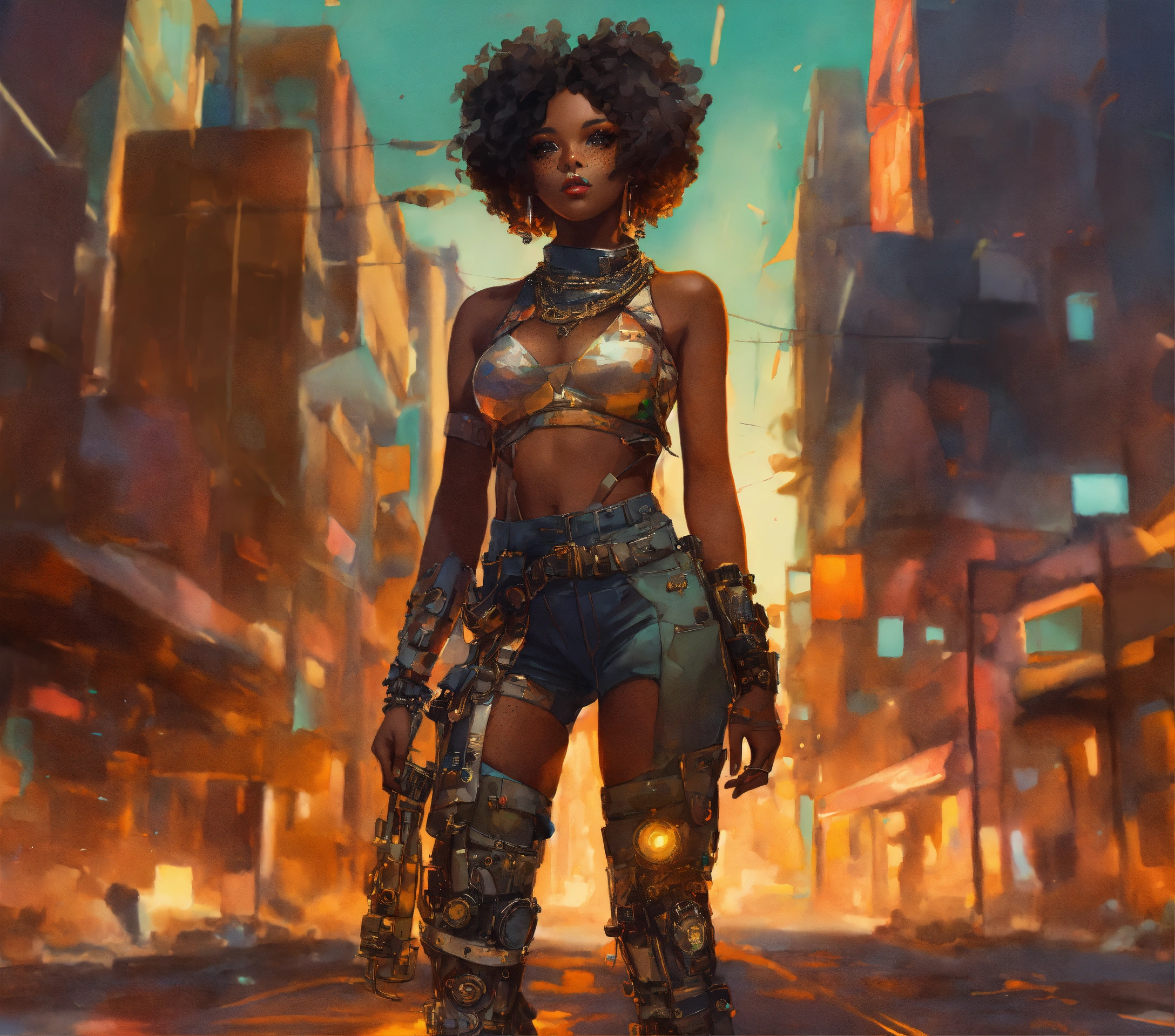Full length portrait, surreal mechanical punk, fully clothed dark nigerian complexion african american plus full figure woman, rich surreal glasslike skin with a smattering of freckles, beautiful woman, extreme makeup aesthetic, hyper realistic, warm cam, sharp detail, back twinkle lighting, fractured low poly watercolor background, ghibli cartoon style, rule of thirds