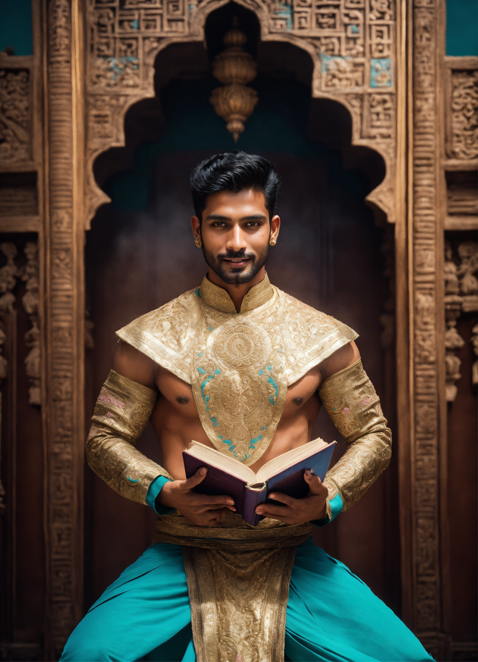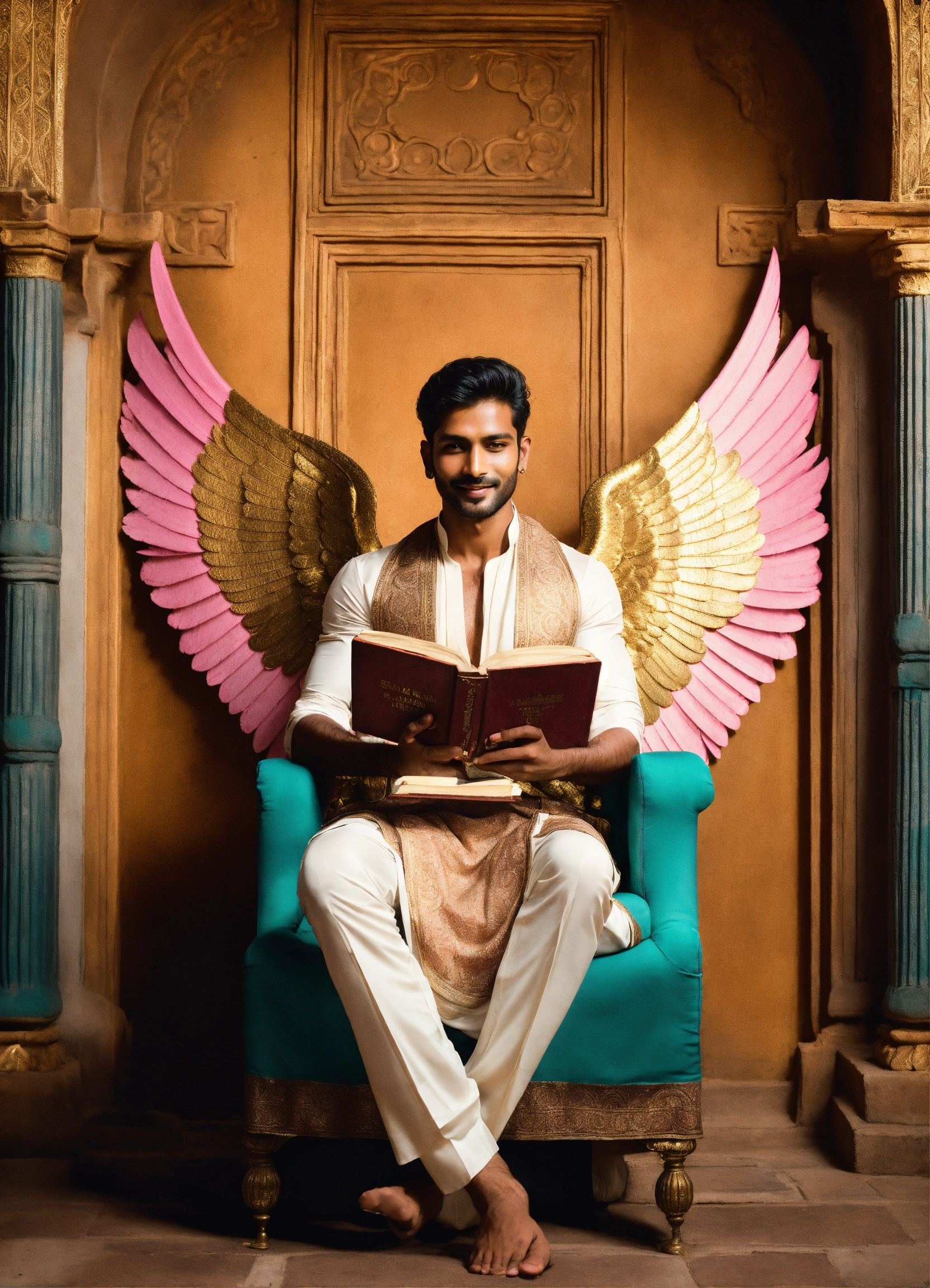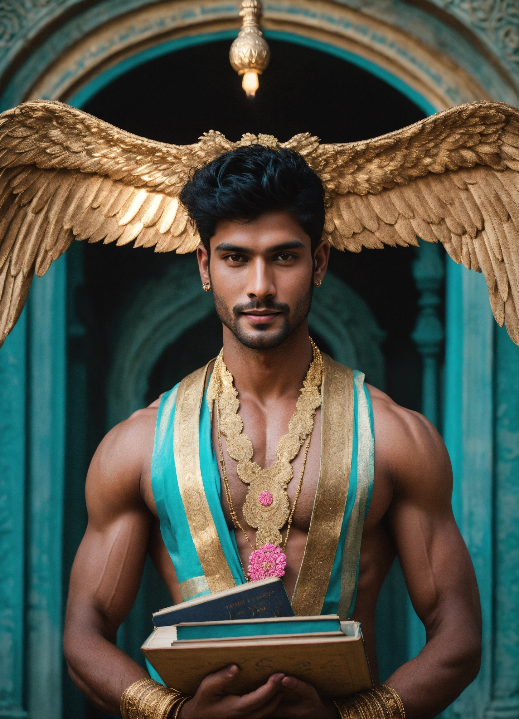 Iconoclastic surrealistic photograph portrait of handsome physically fit masculine gorgeous archangel young indian supermodel male, loving friendly smile, massive white and gold angel wings spreading out from his back holding a pile of books, staring intensely straight ahead directly into camera, short black hair, loving brown eyes centred towards me, wearing futuristic teal and pink intricately designed indian dhoti kurta with high neckline, no chest showing, holding an opened book, symmetrical, iconic, mysterious, foggy, moody, powerful, emotional, fantasy magazine photoshoot, background is ancient sparkling indian architecture. film grain.