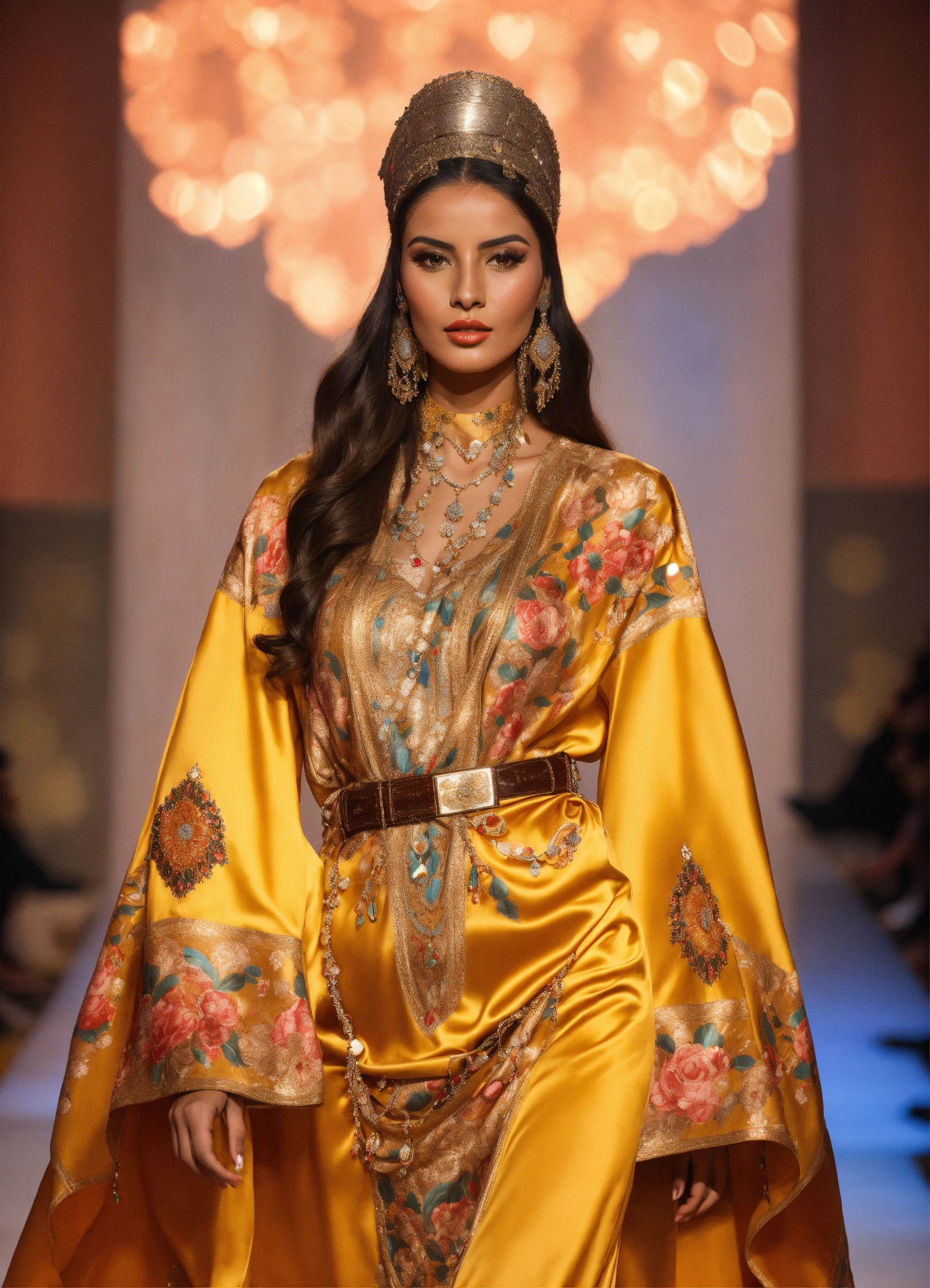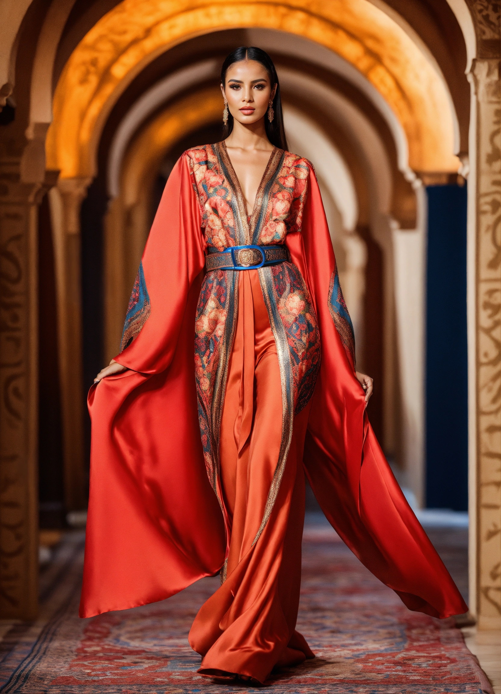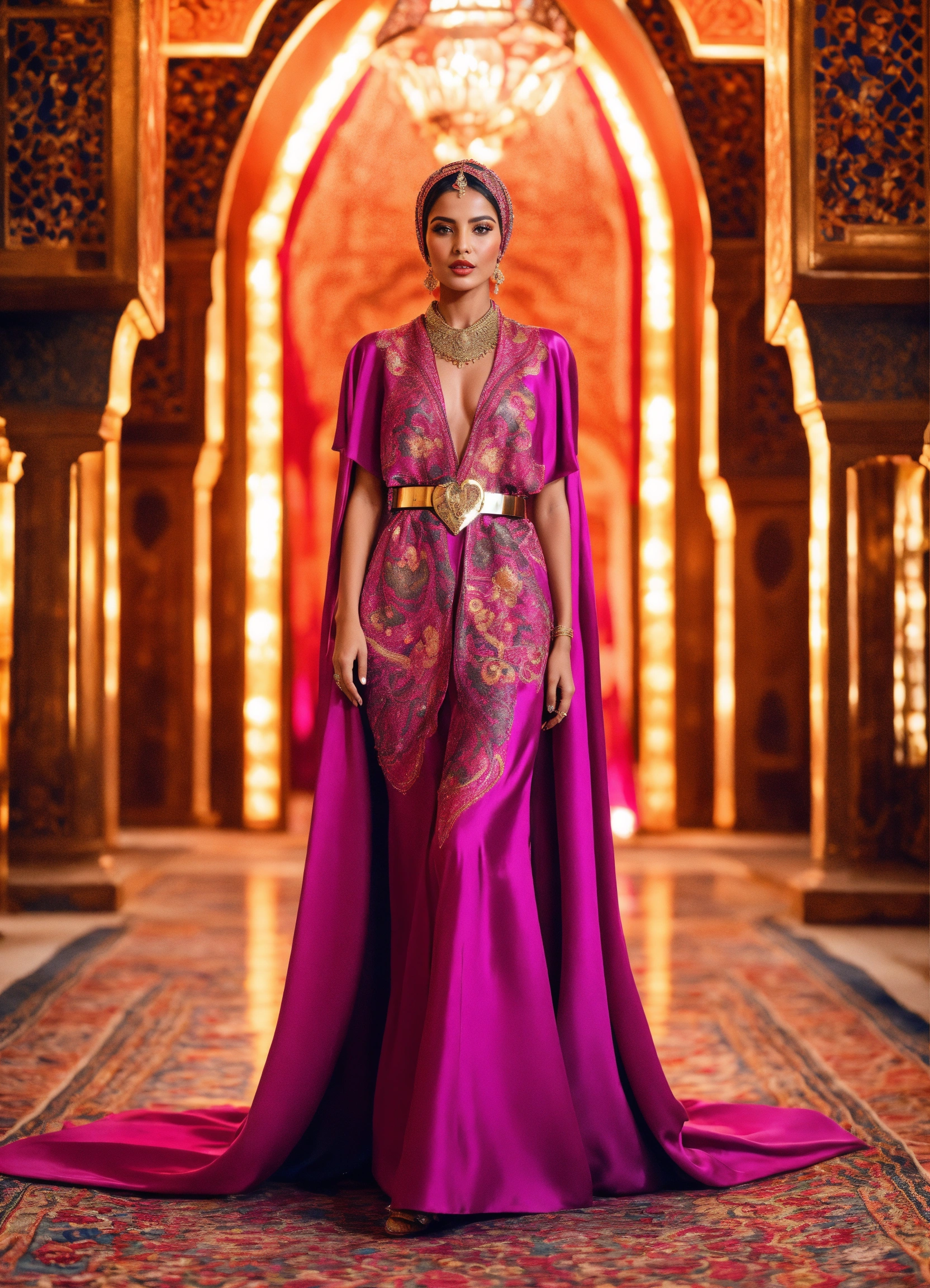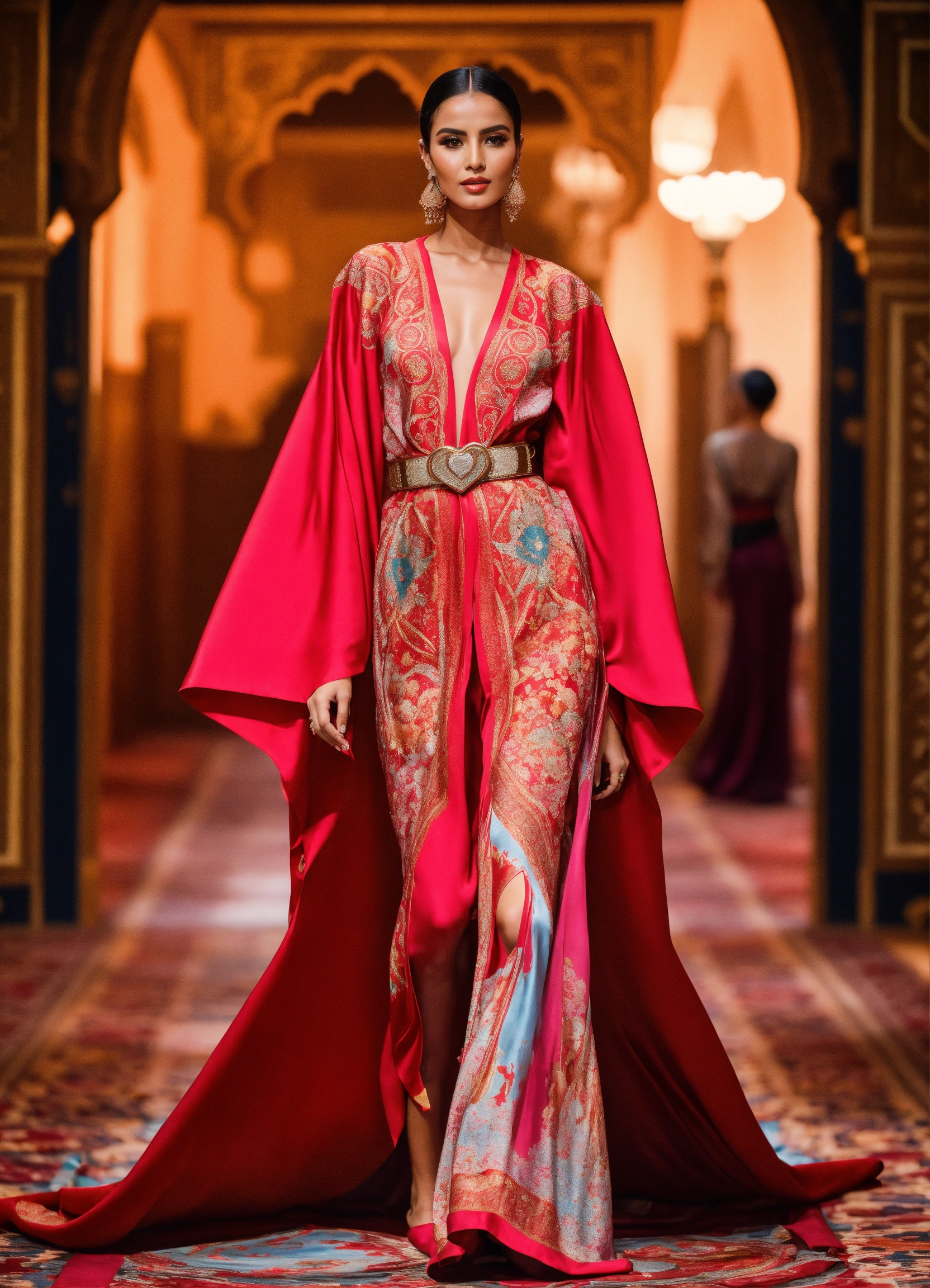 Beautiful morrocan women wearing traditional morrocan with heart-shaped kaftan haute couture, luxury fabric silk, with belt morrocan hyperrealistic futurism in front decor runaway walk fashion show