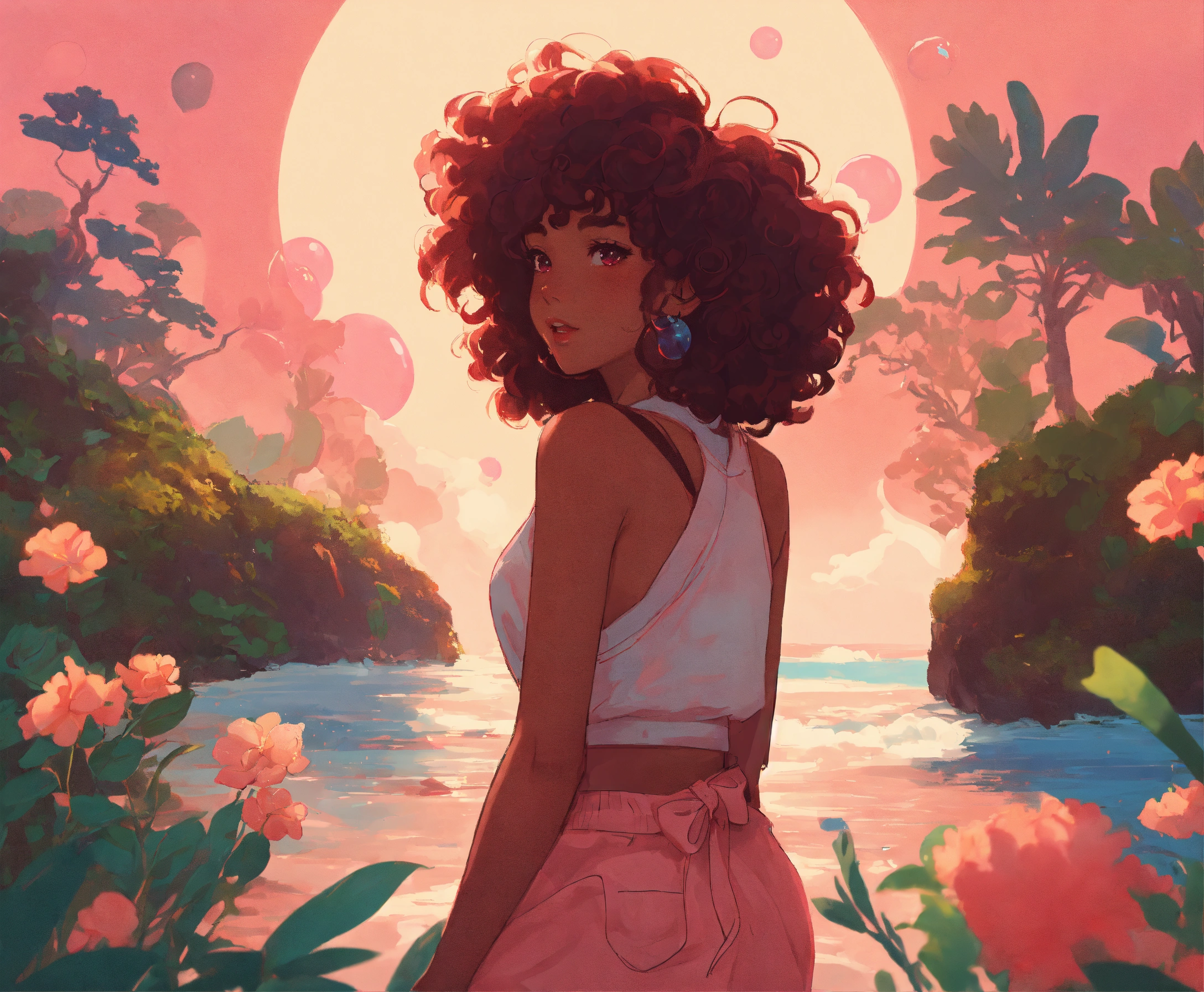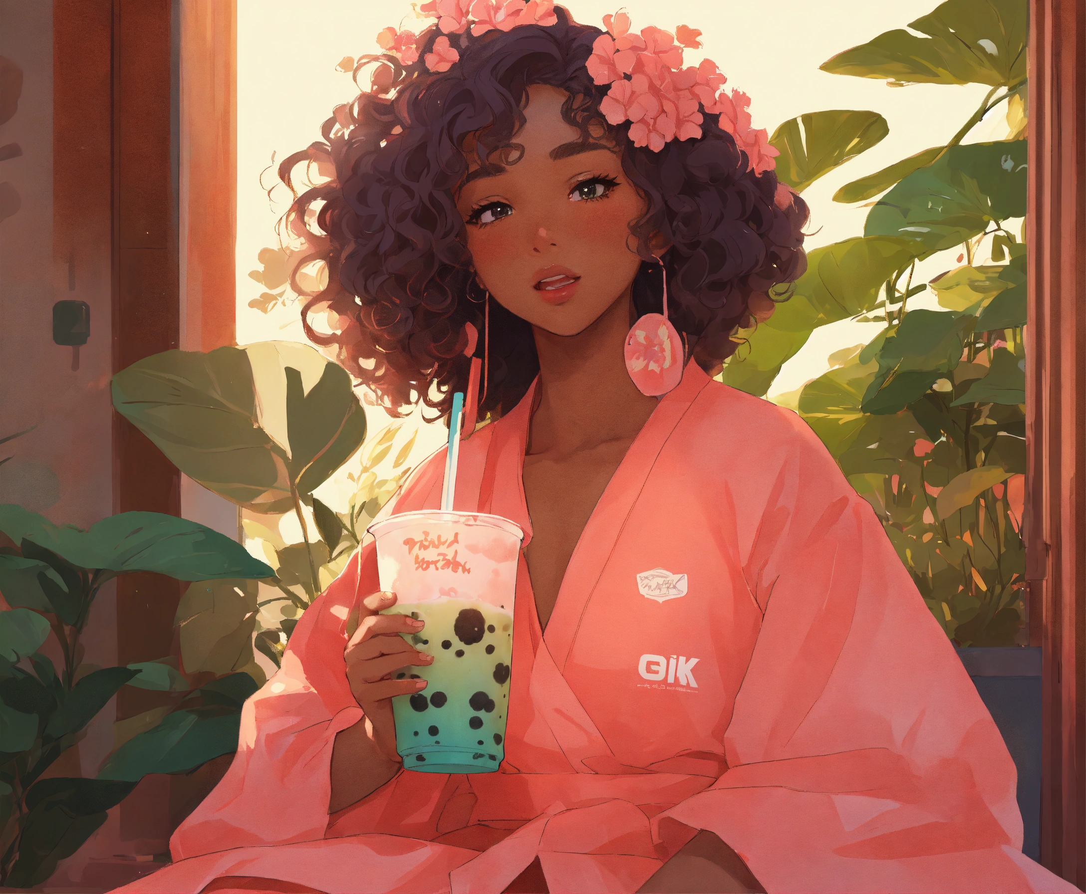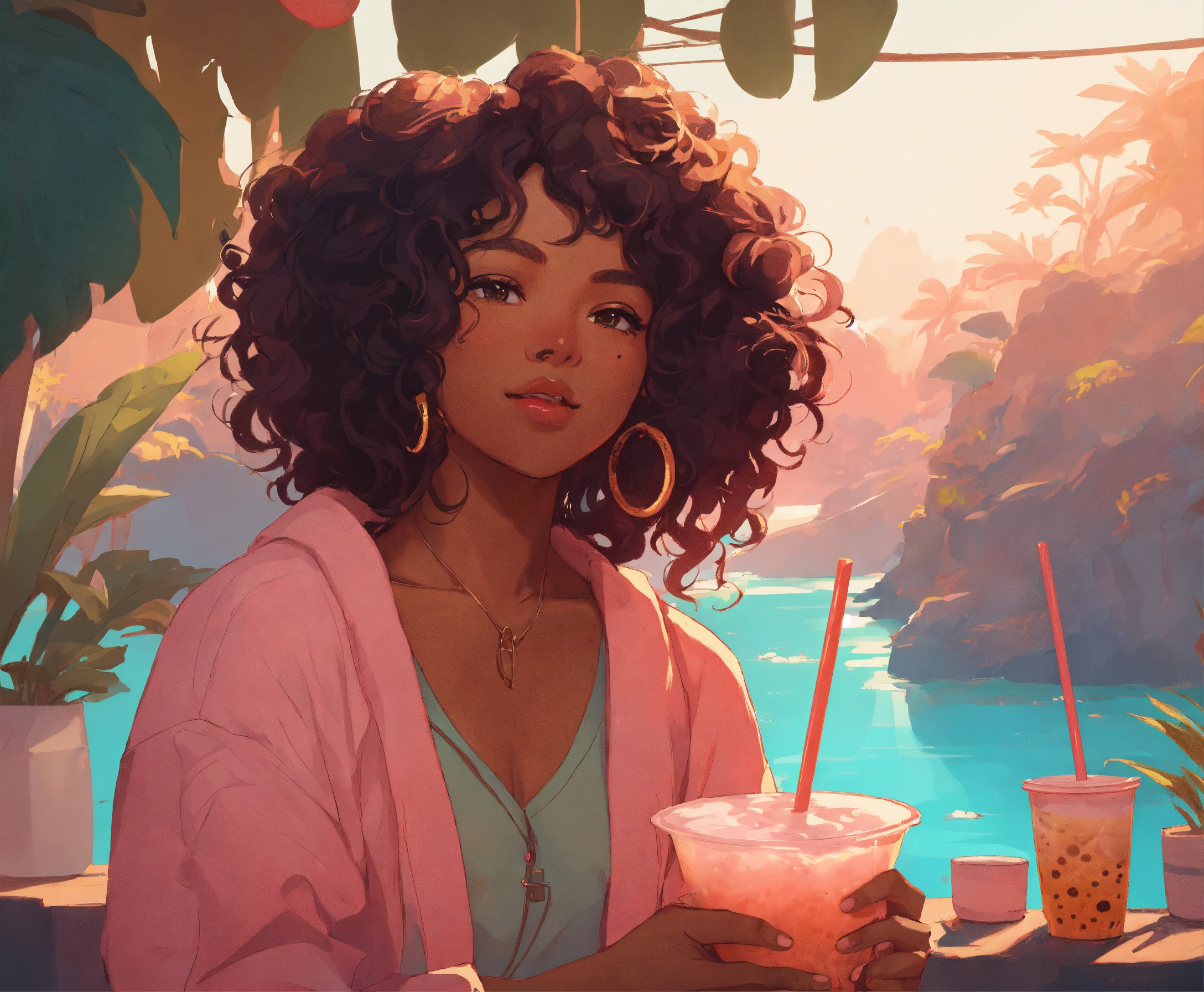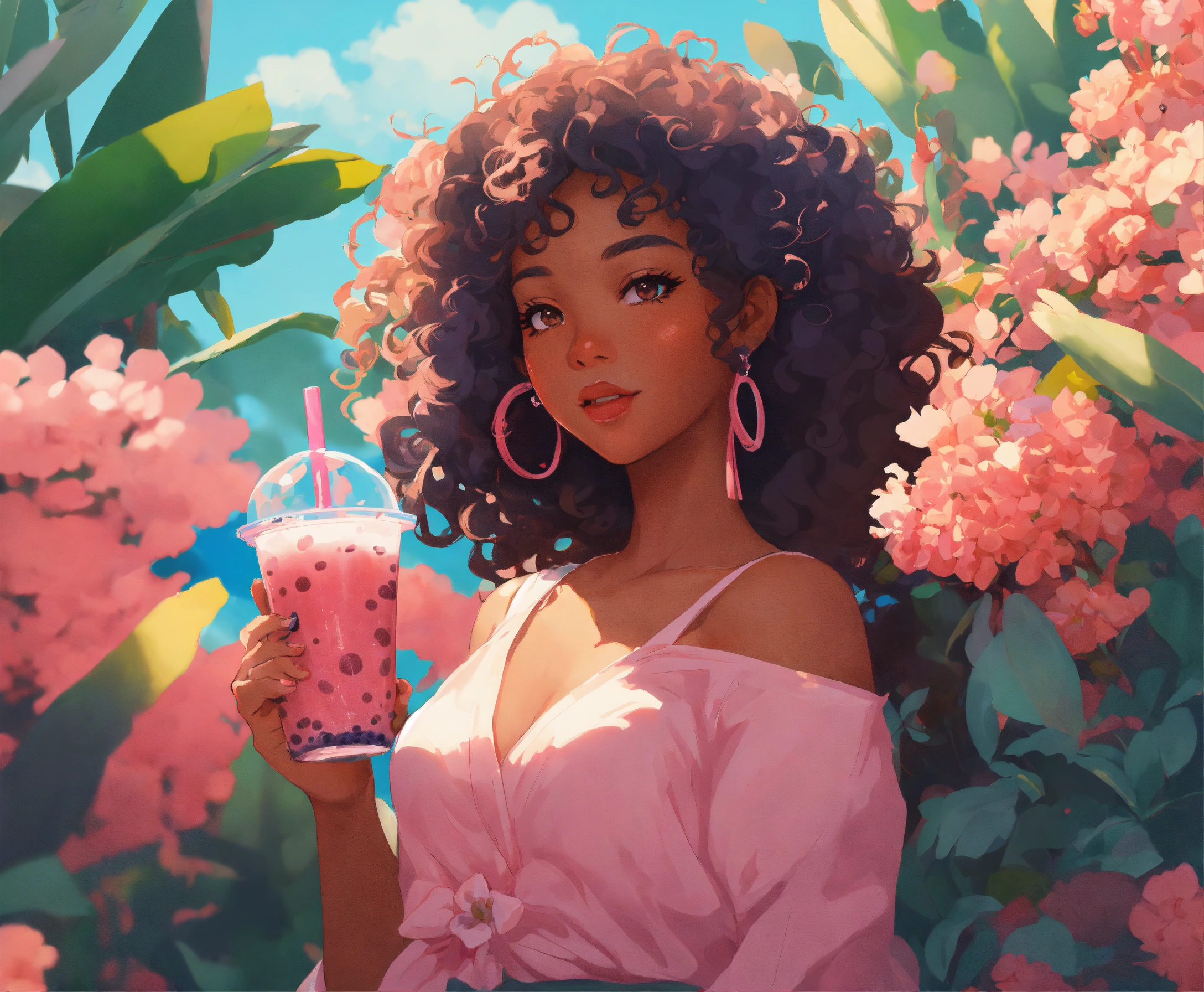 Boba tea, milk tea, island girl, tropical, exotic flowers, boba tea, bubble tea, cute girl, curly hair, cute waifu, afro, rosy cheeks, coral pink, girlie, style of laurie greasley, studio ghibli, akira toriyama, james gilleard, genshin impact, captivating, trending pixiv fanbox, acrylic palette knife, 4k, vibrant colors, devinart, trending on artstation, low details.