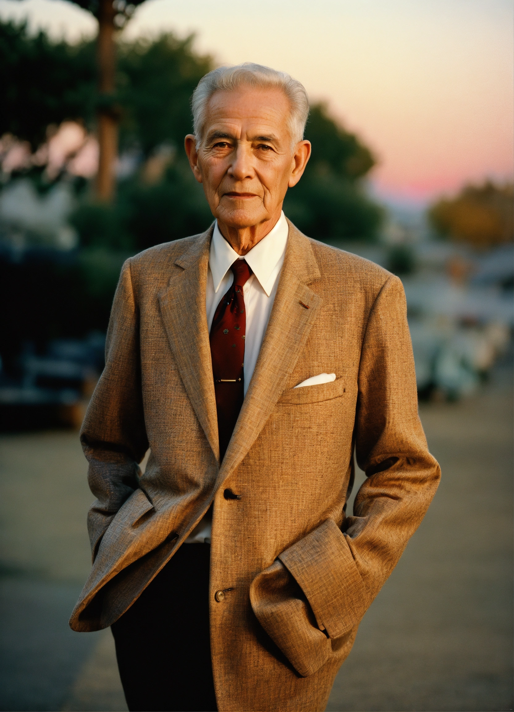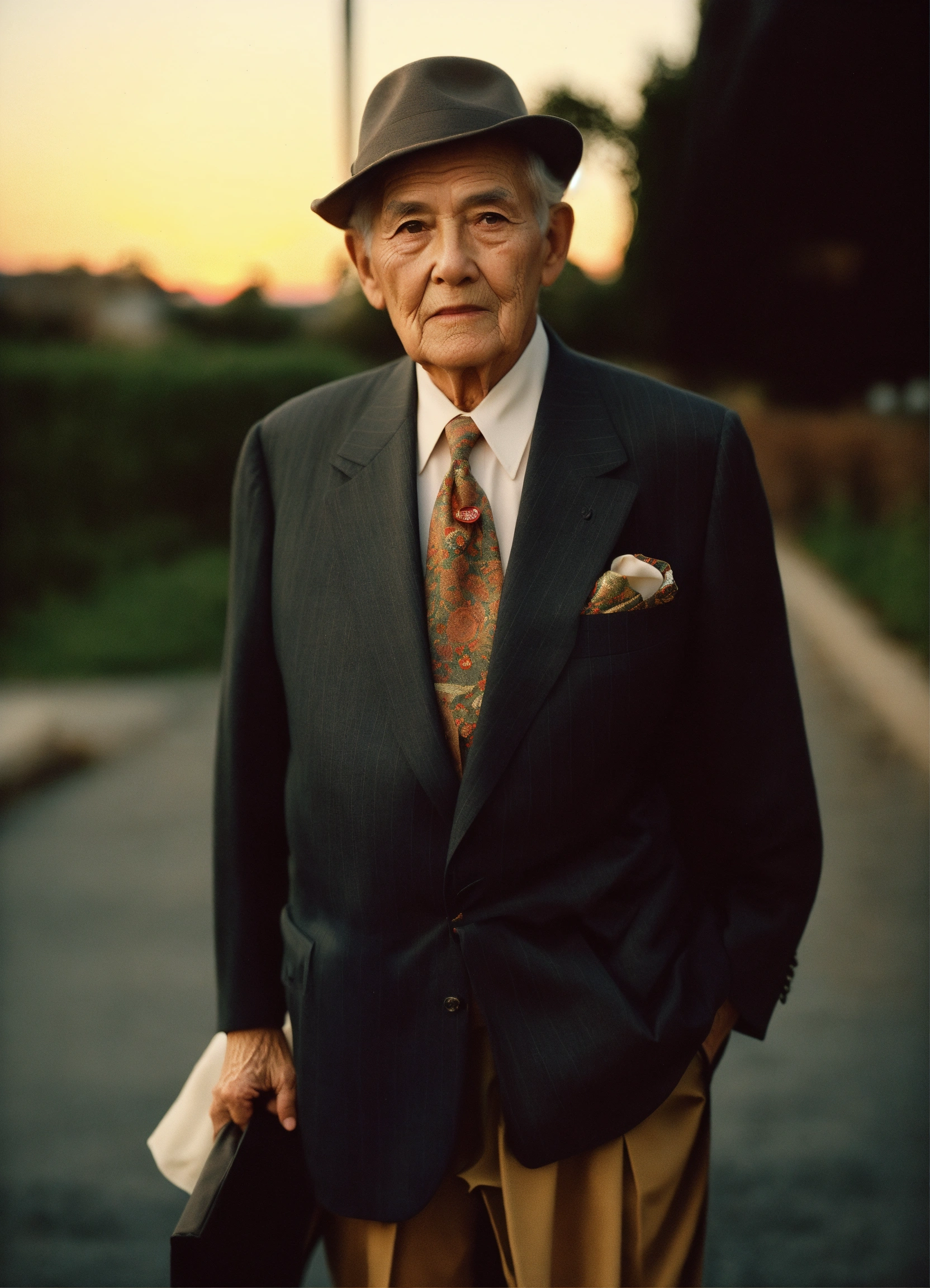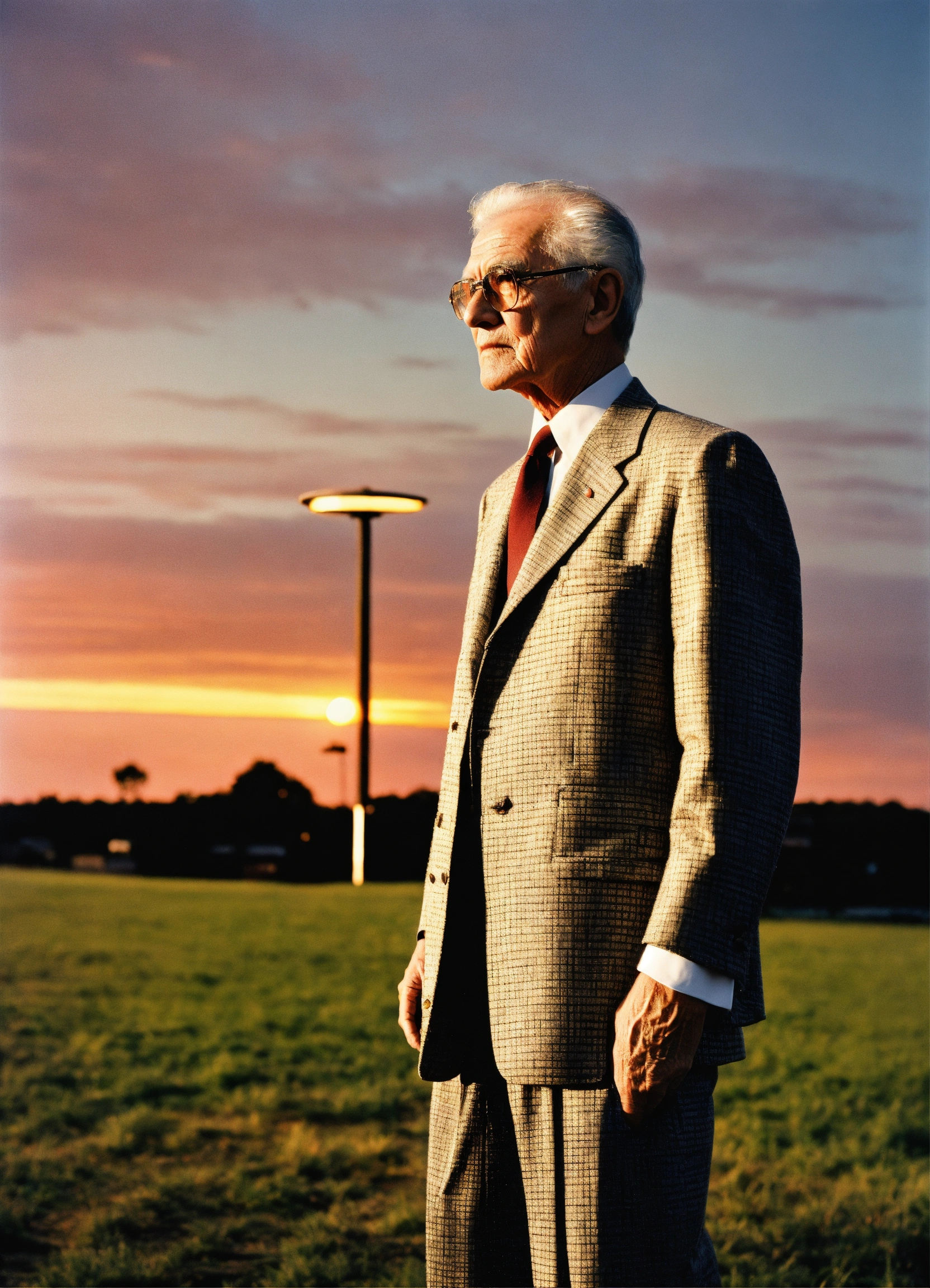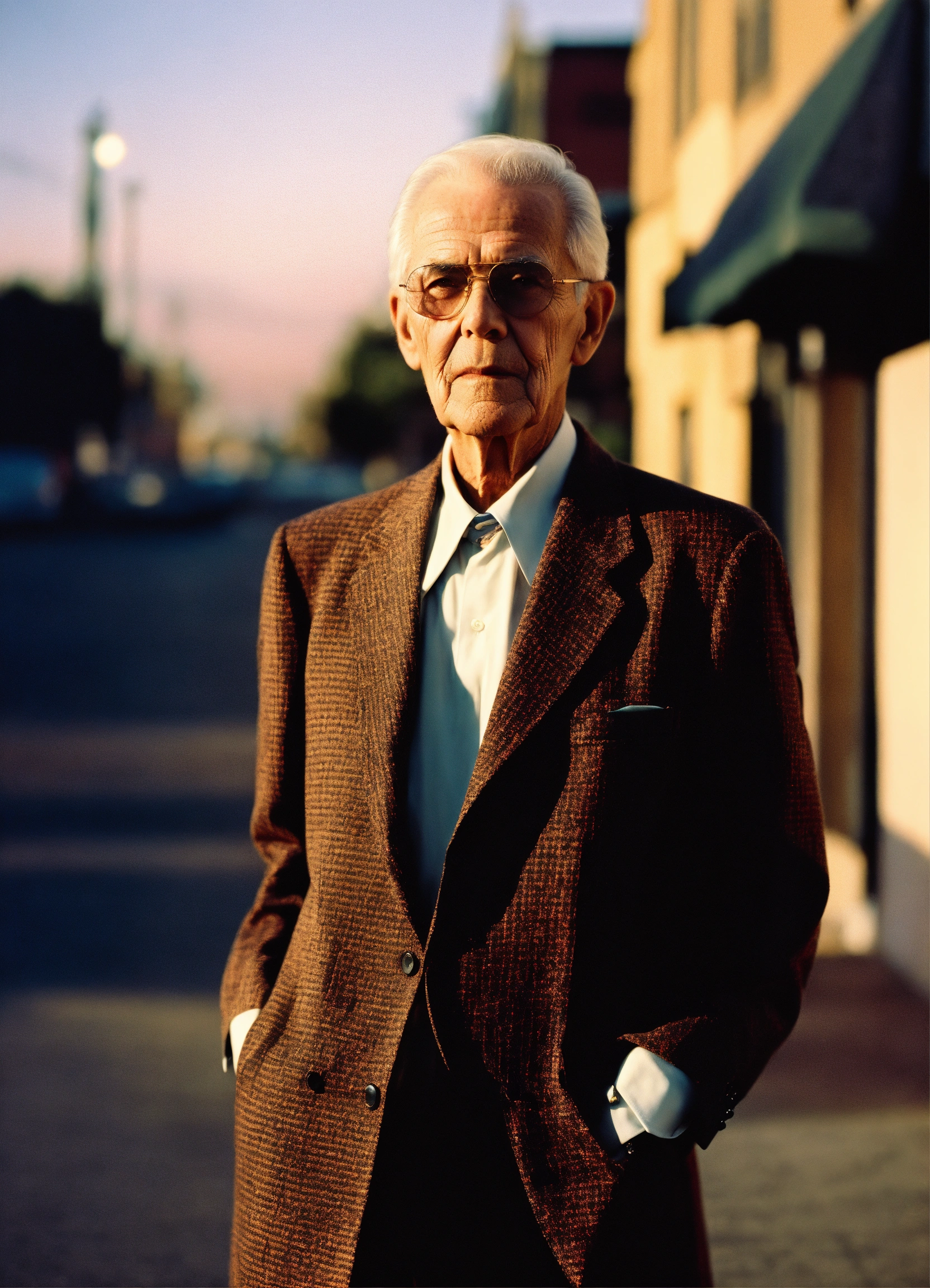 Extremely detailed photographic image, grained image, beautifully composed, color image, 00's fashionable image, fashionable magazine photography, leica summicron 35mm f2.0, kodak 400tx, fashion photography, fashionable model, pensioner senior adult realistic adult in a suit with skirt, facing a sunset.