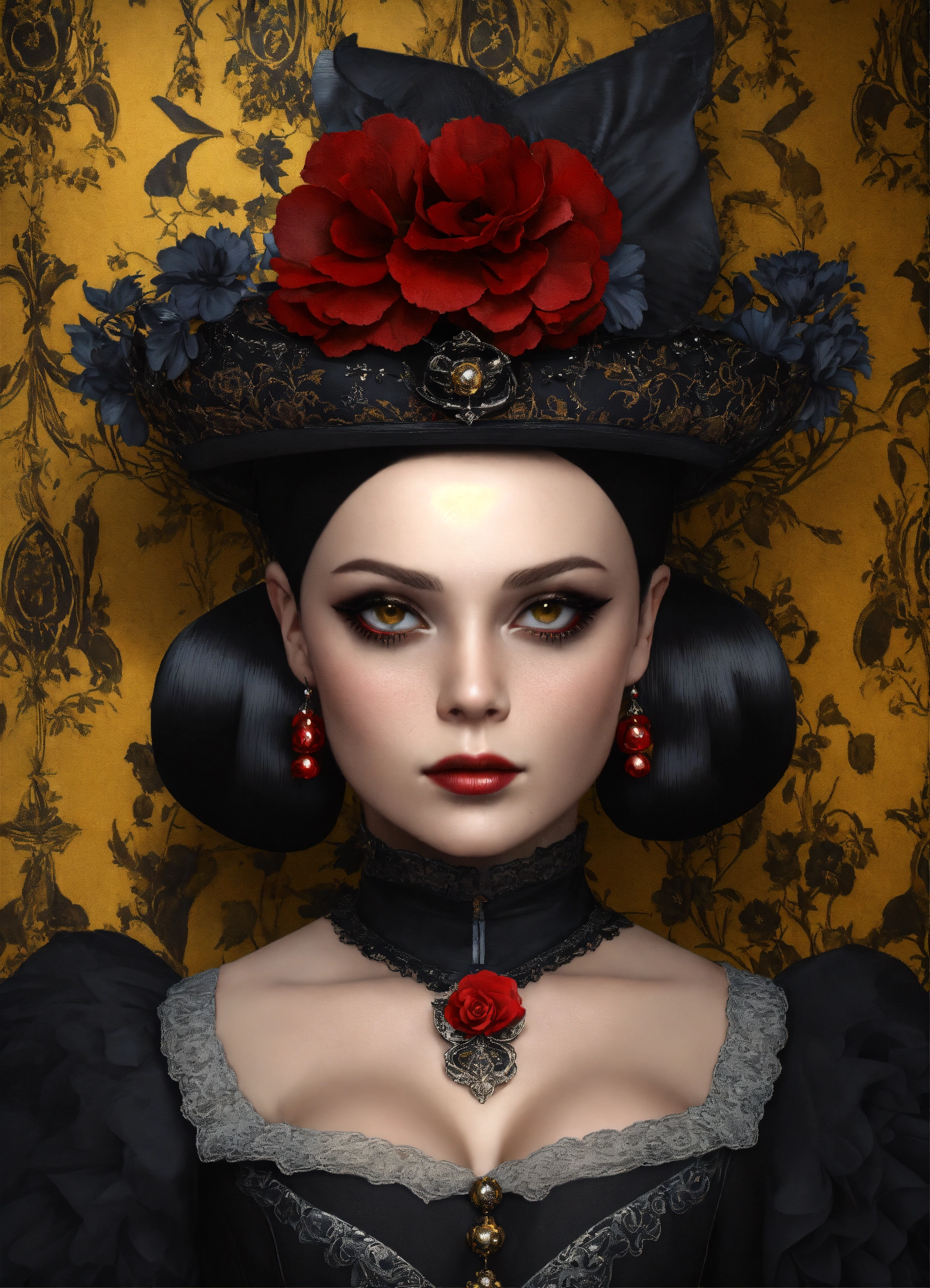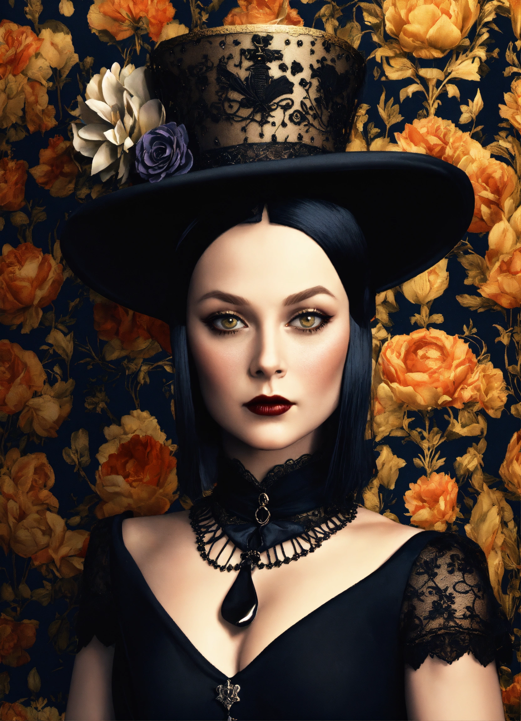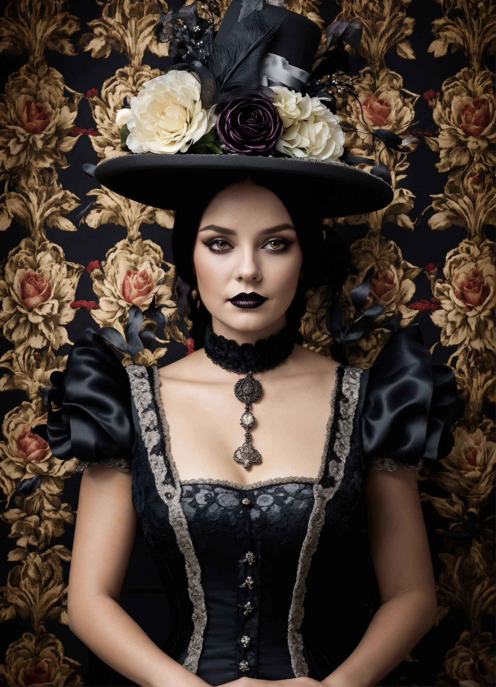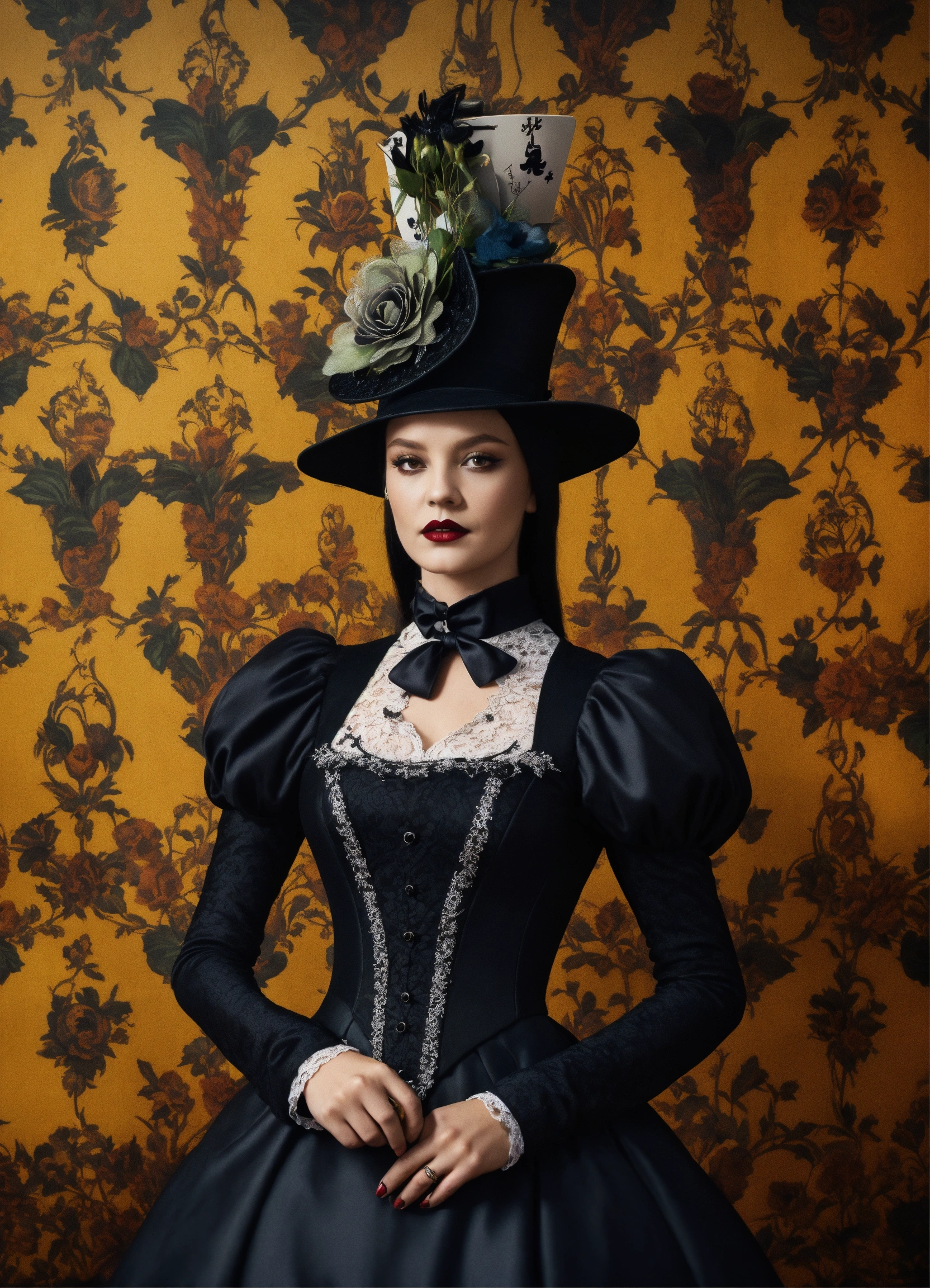 Elaborate gothic wednesday addams queen of spades, 40 years old in an elegant and intricate gothic costume and wearing a victorian fascinator hat, background with flower patterned wallpaper, 3d, 32k, photorealistic and very detailed.