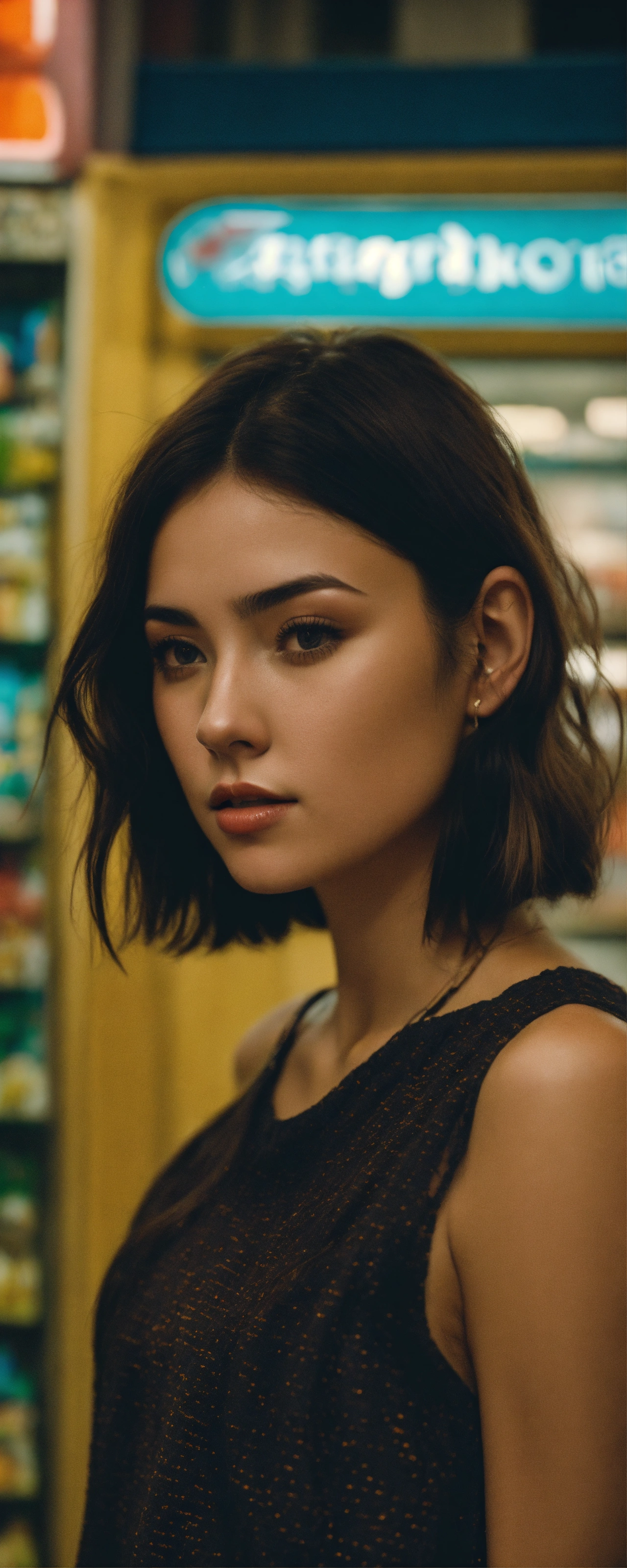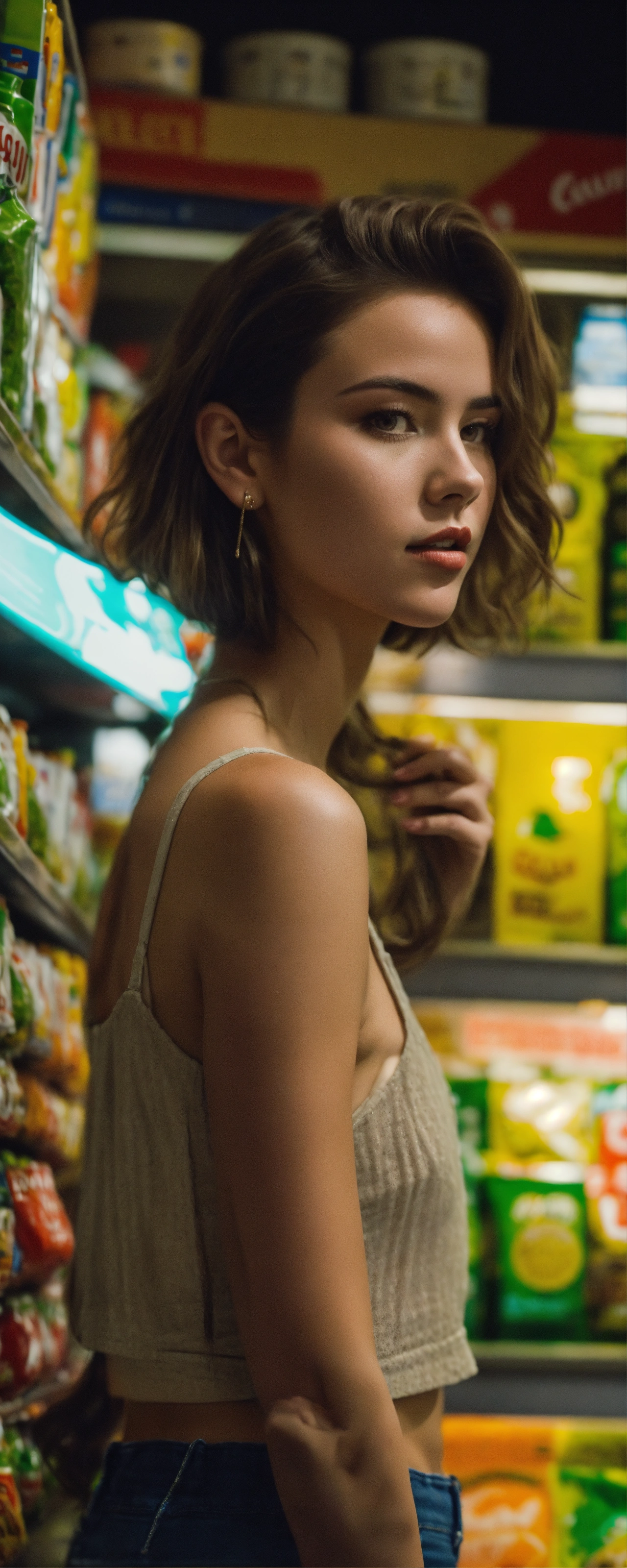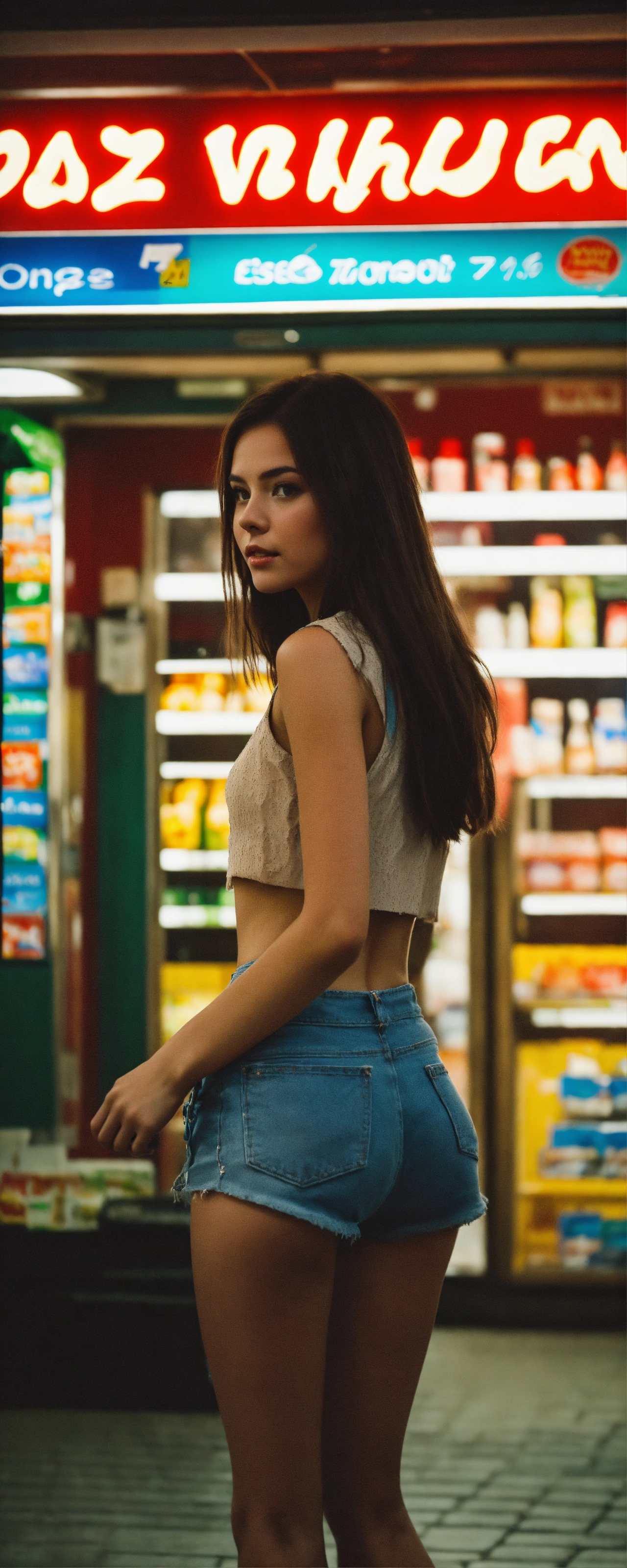 Candid photo of a young brunette woman wearing a crop top and a short is taken at a european convenience store during the night, this high-quality image, exhibiting a grainy texture, jpg artifacts, film grain, gritty, raw aesthetic