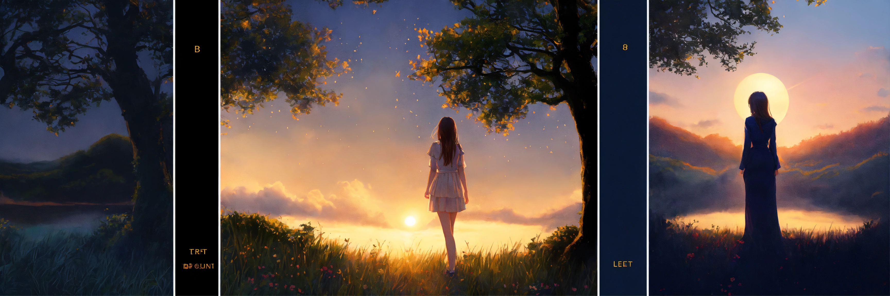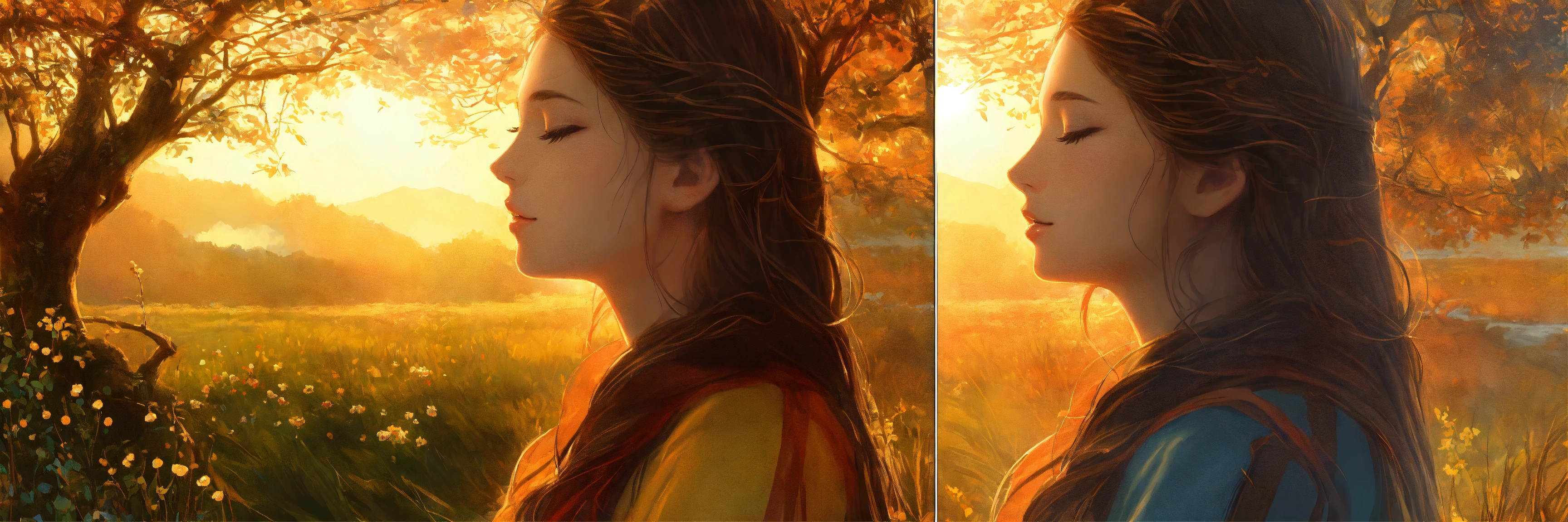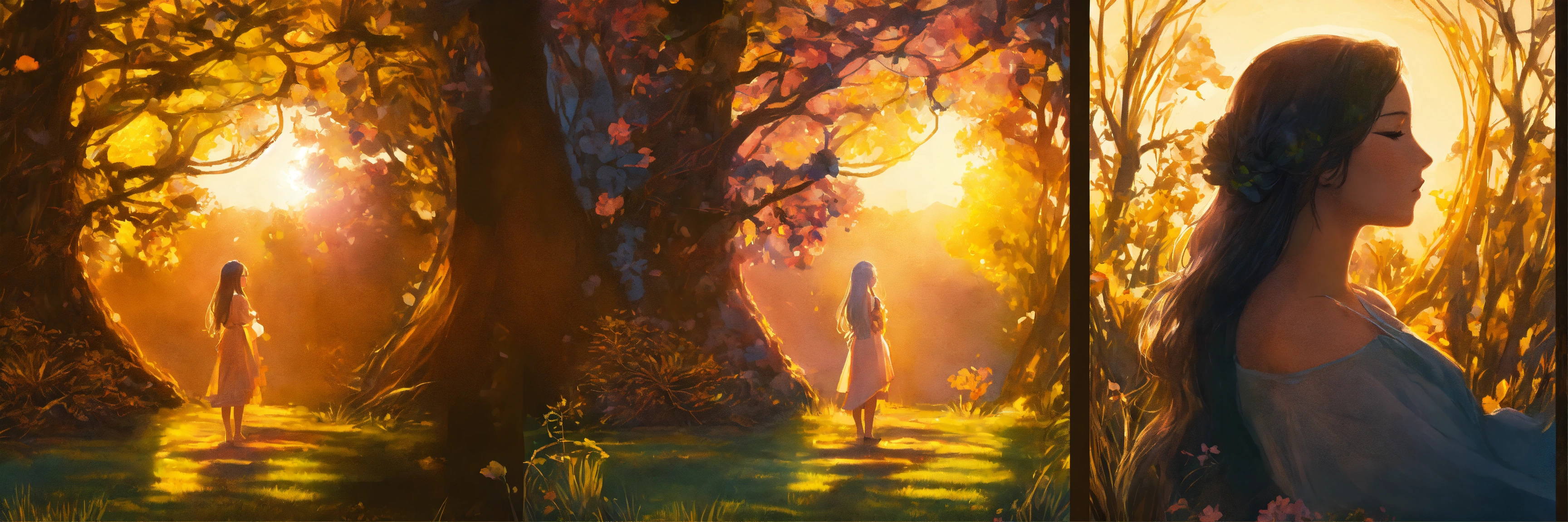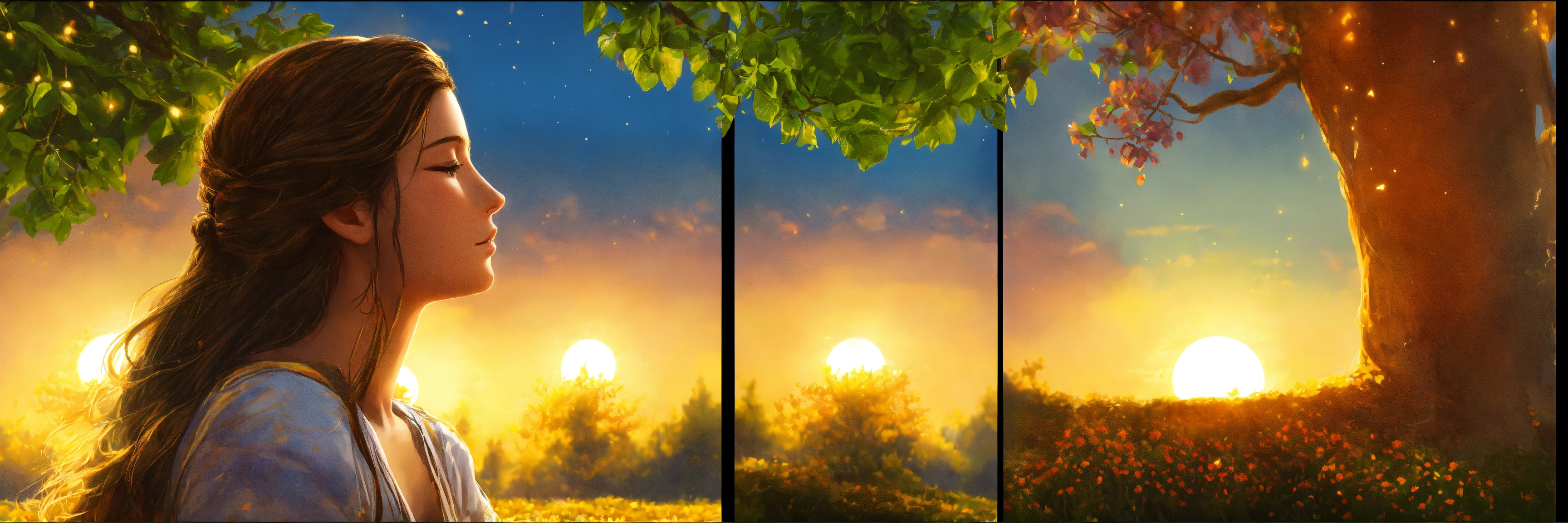 Divide the frame in panels/ portions, left side is day and right side is night, the girl is centered in the frame, a photo realistic image of a lady with long hair that look like branches of a tree with eyes closed sitting in garden centered, to the left is the sun and the lesft side of the image represents day and the right side represent night, the girl seems to be breathing, the night and day division starts from the centered of the girl, high quality hyper realistic image