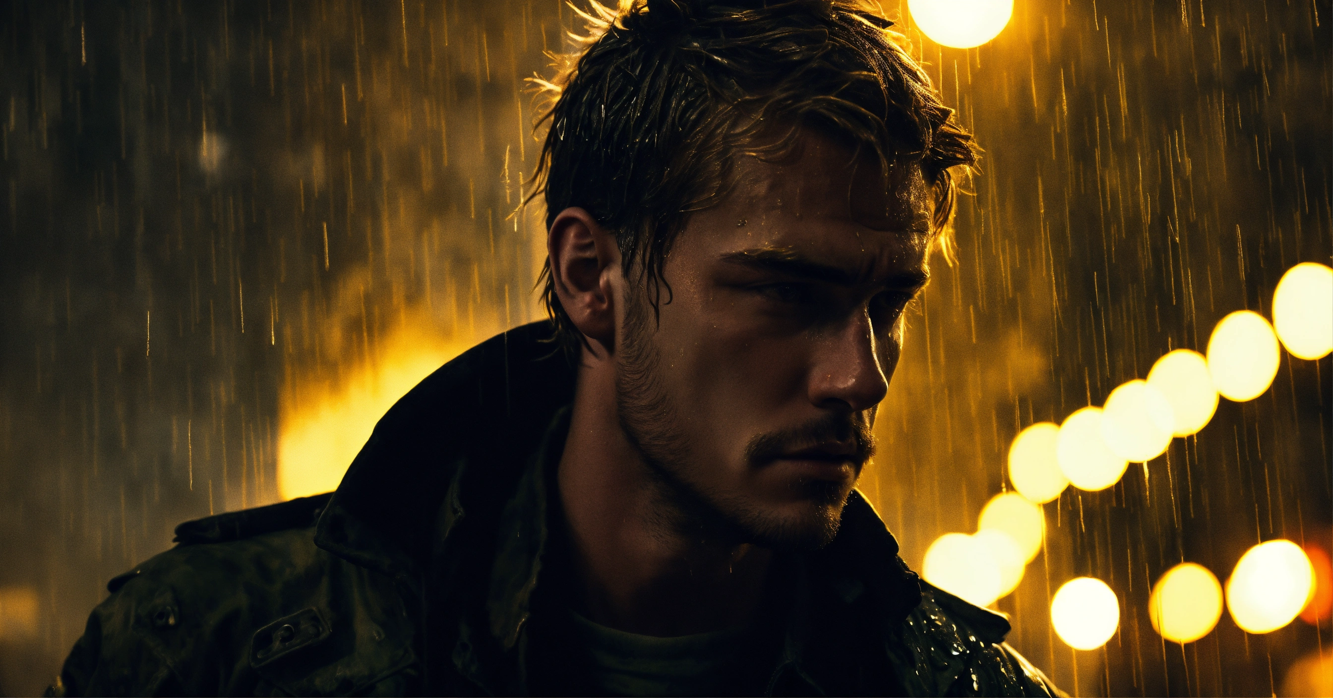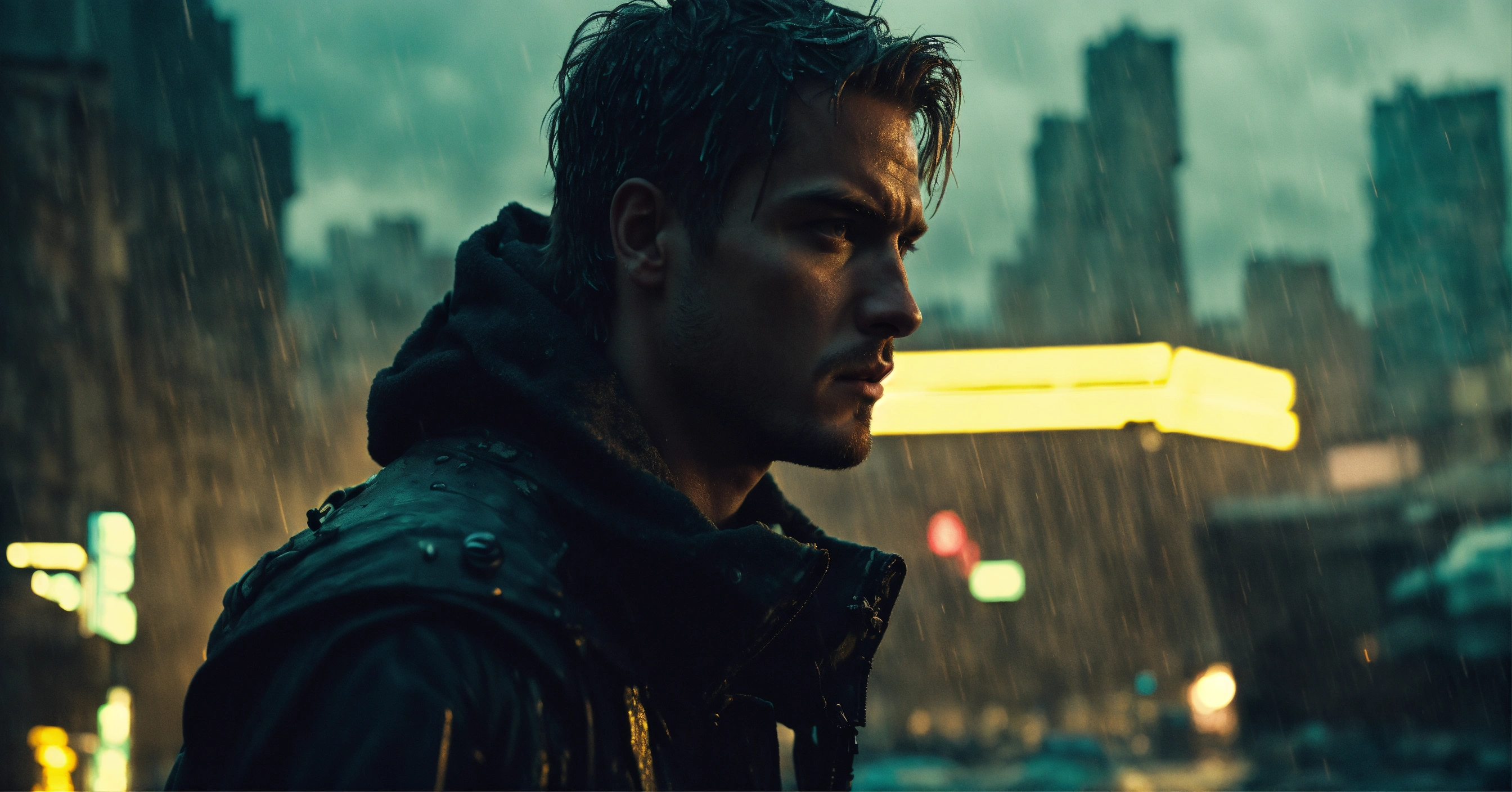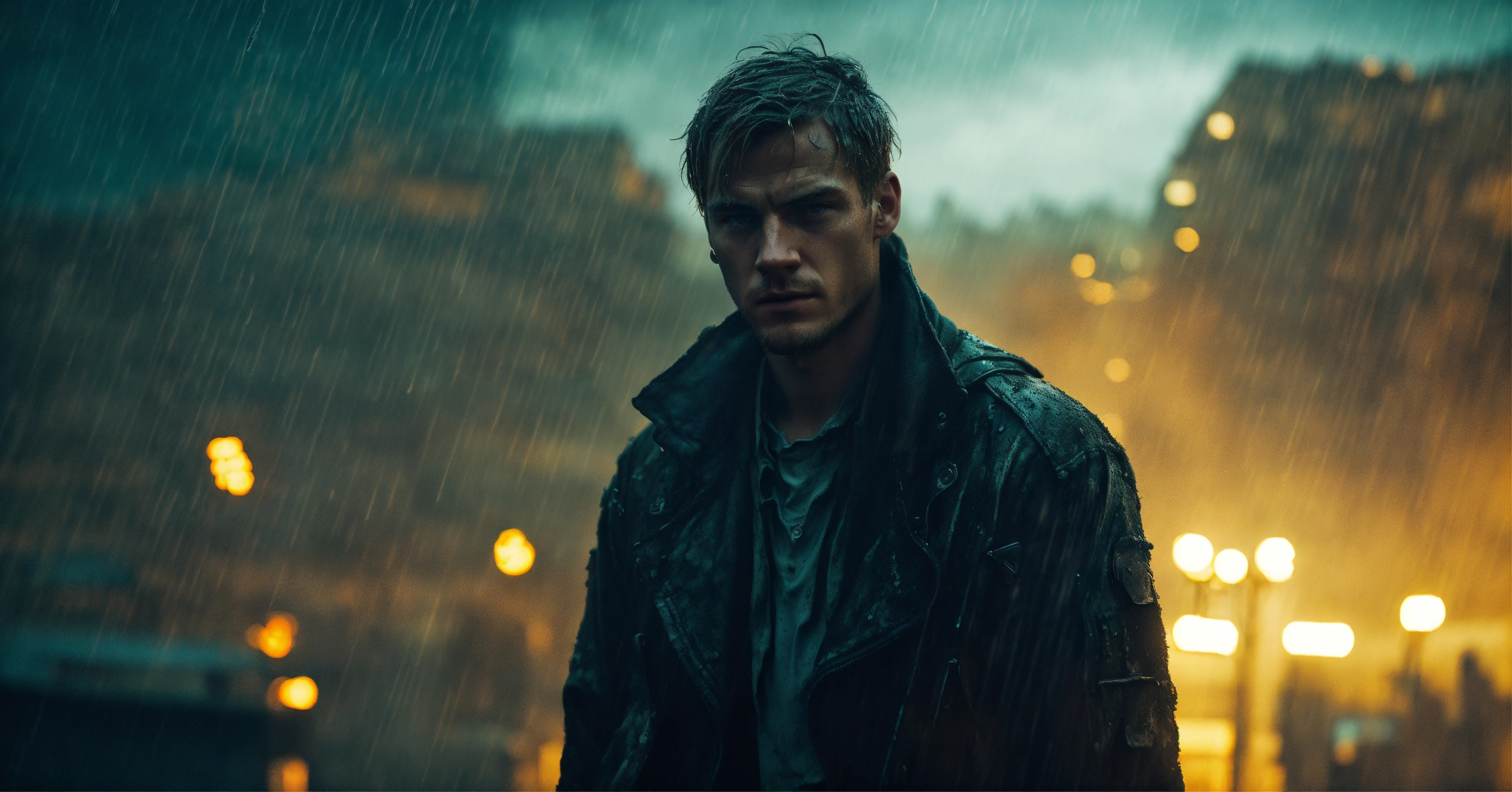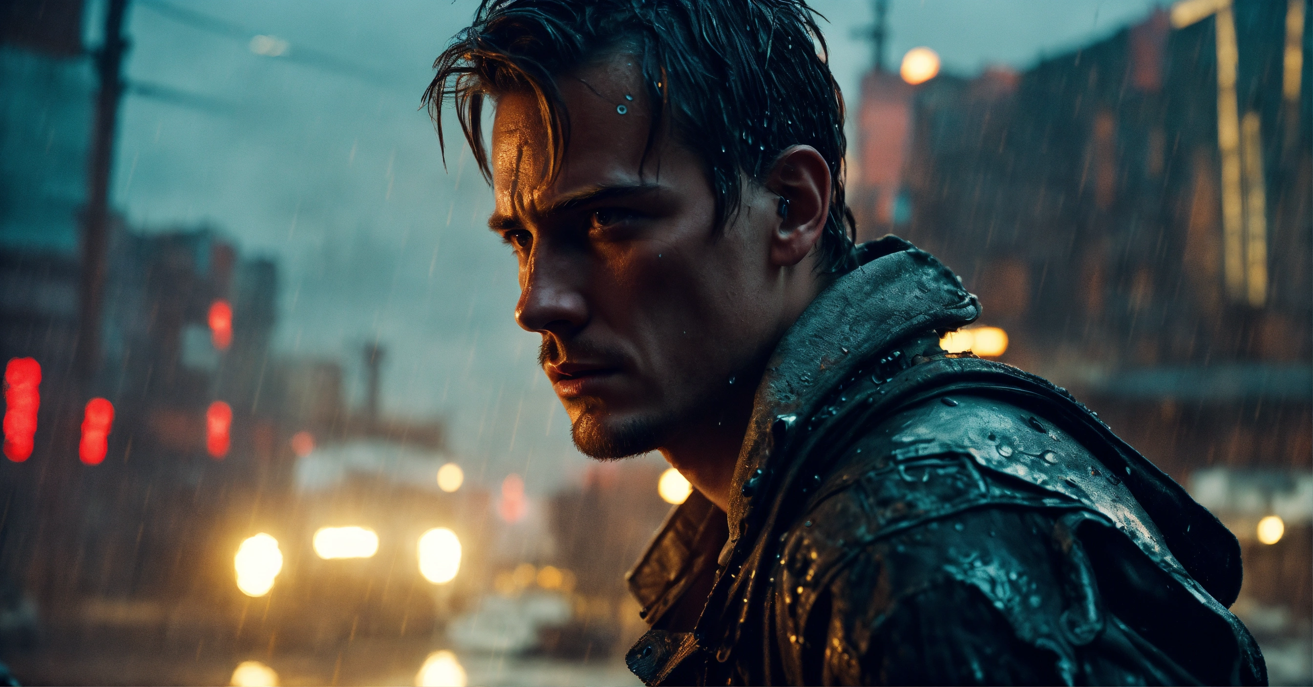 Beautiful tall man, kinnaman, post-apocalyptic wasteland, dark, city, white, light, cinematic, epic, rain, detailed, neon, realistic photo face