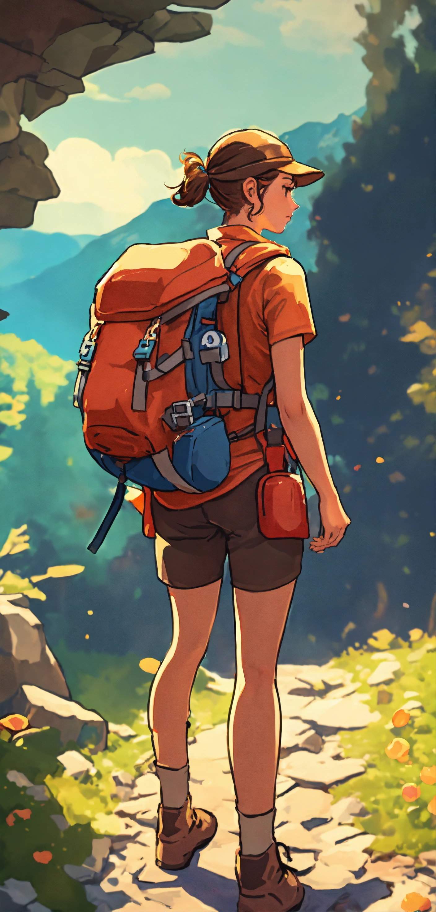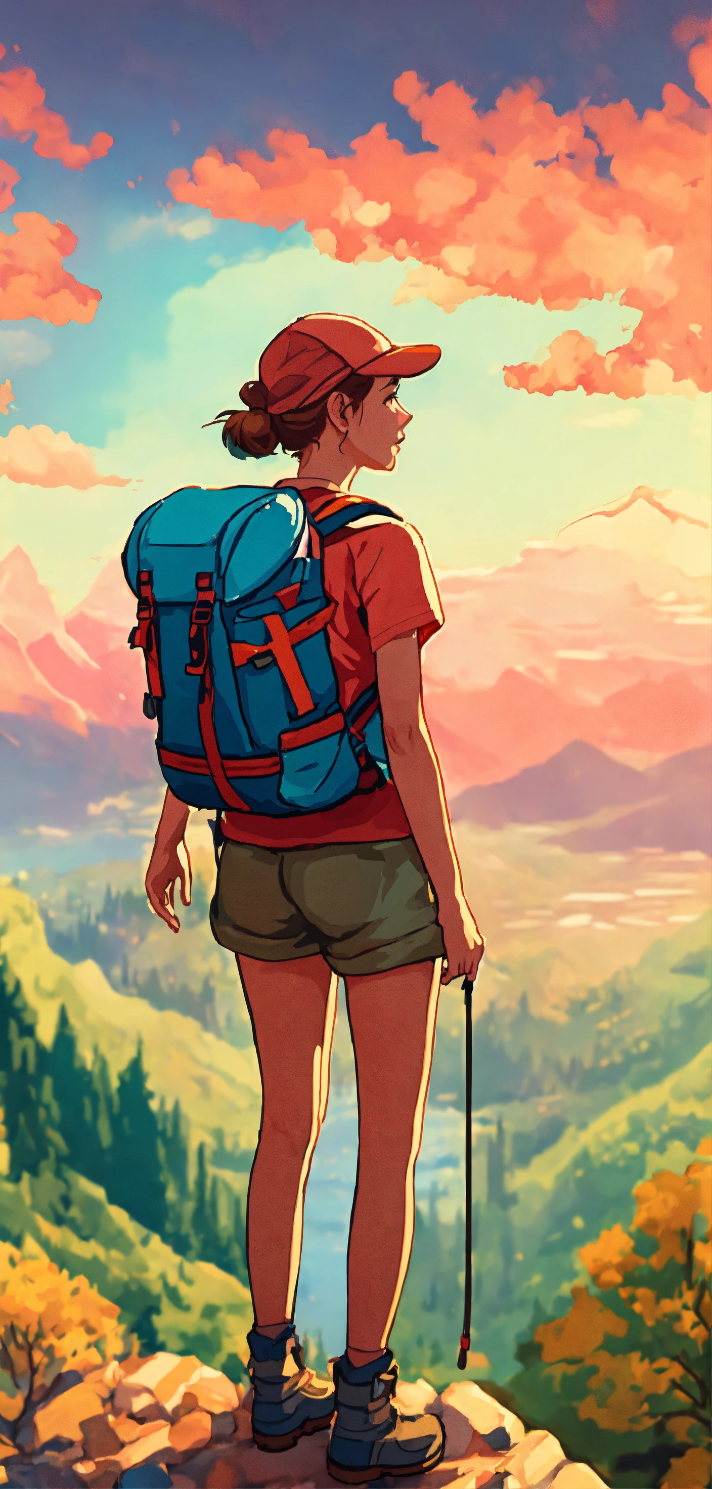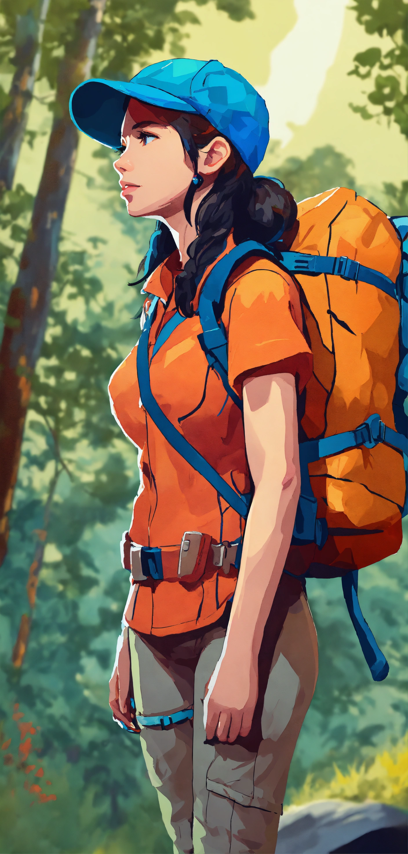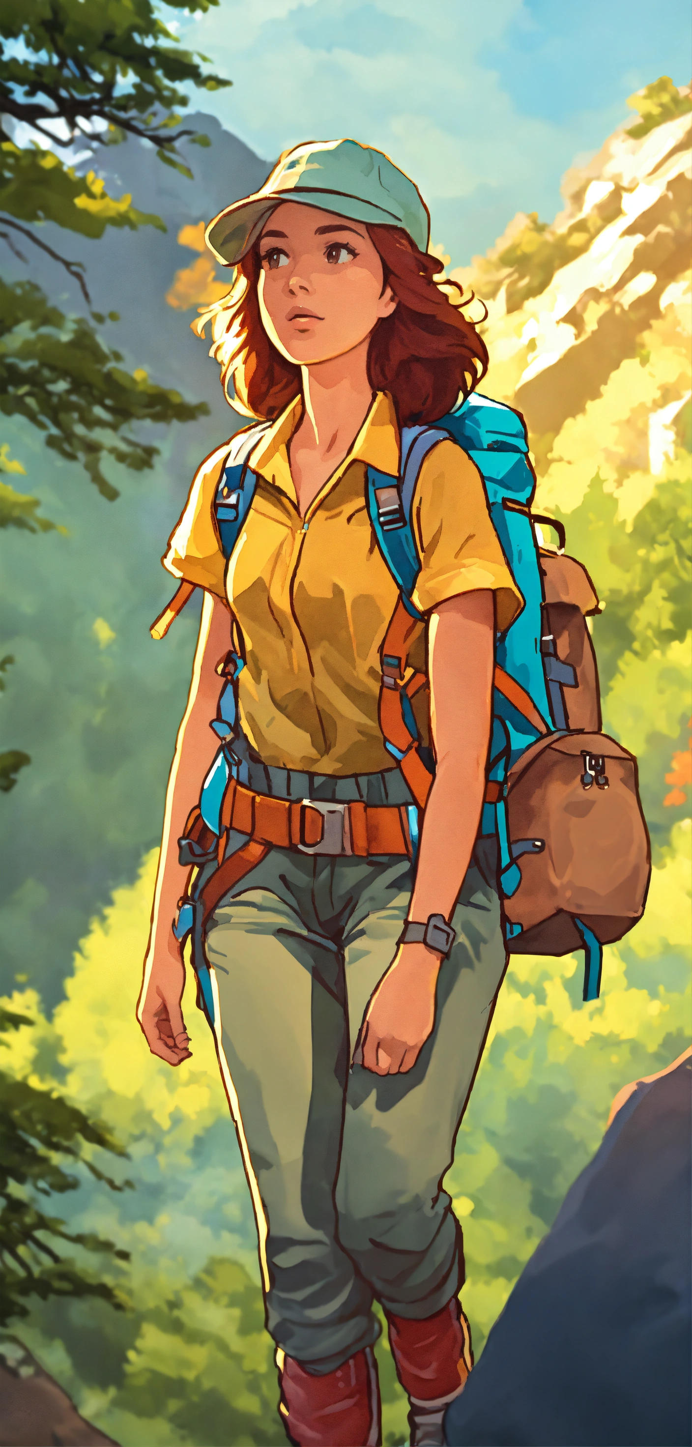A detailed illustration of a woman hiker, wearing a backpack, style cartoon, colors, two-dimensional, planar vector, character design, t-shirt design, stickers, colorful splashes, and t-shirt design, studio ghibli style, soft tetrad color, vector art, fantasy art, watercolor effect, alphonse mucha, adobe illustrator, hand-painted, digital painting, low polygon, soft lighting, aerial view, isometric style, retro aesthetics, focusing on people, 8k resolution, using cinema 4d, high quality, highres, detail enhancement