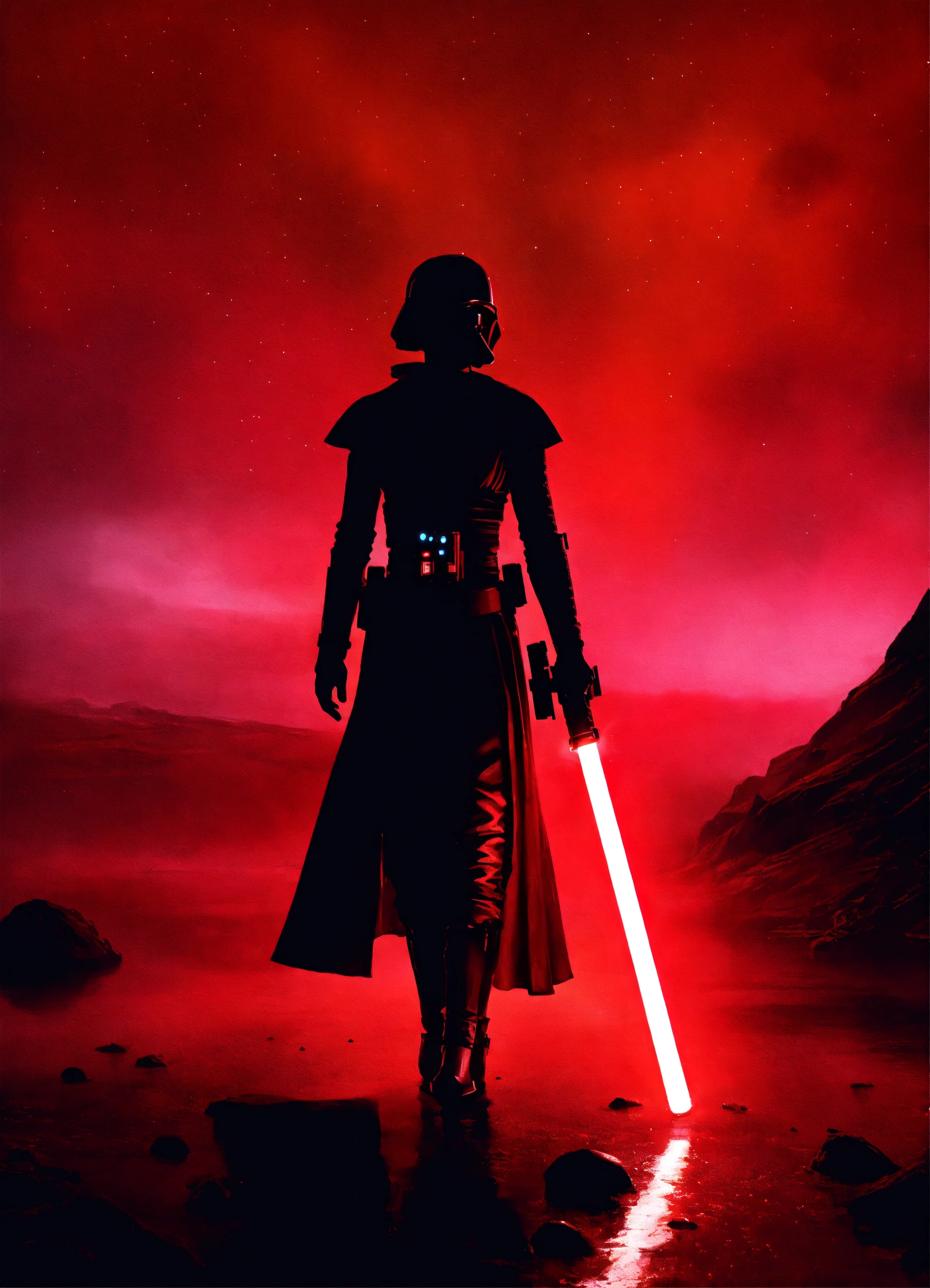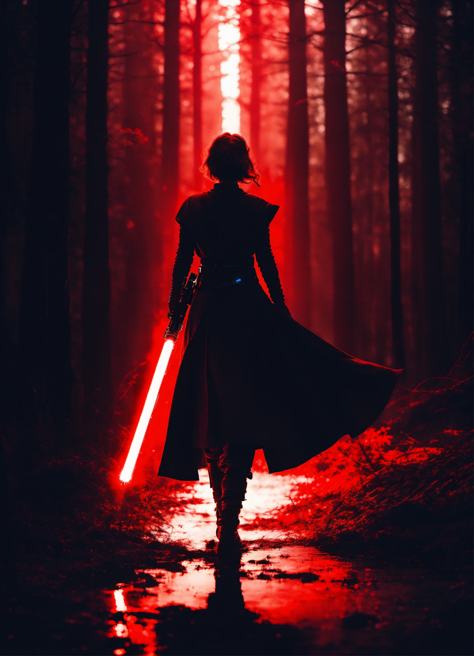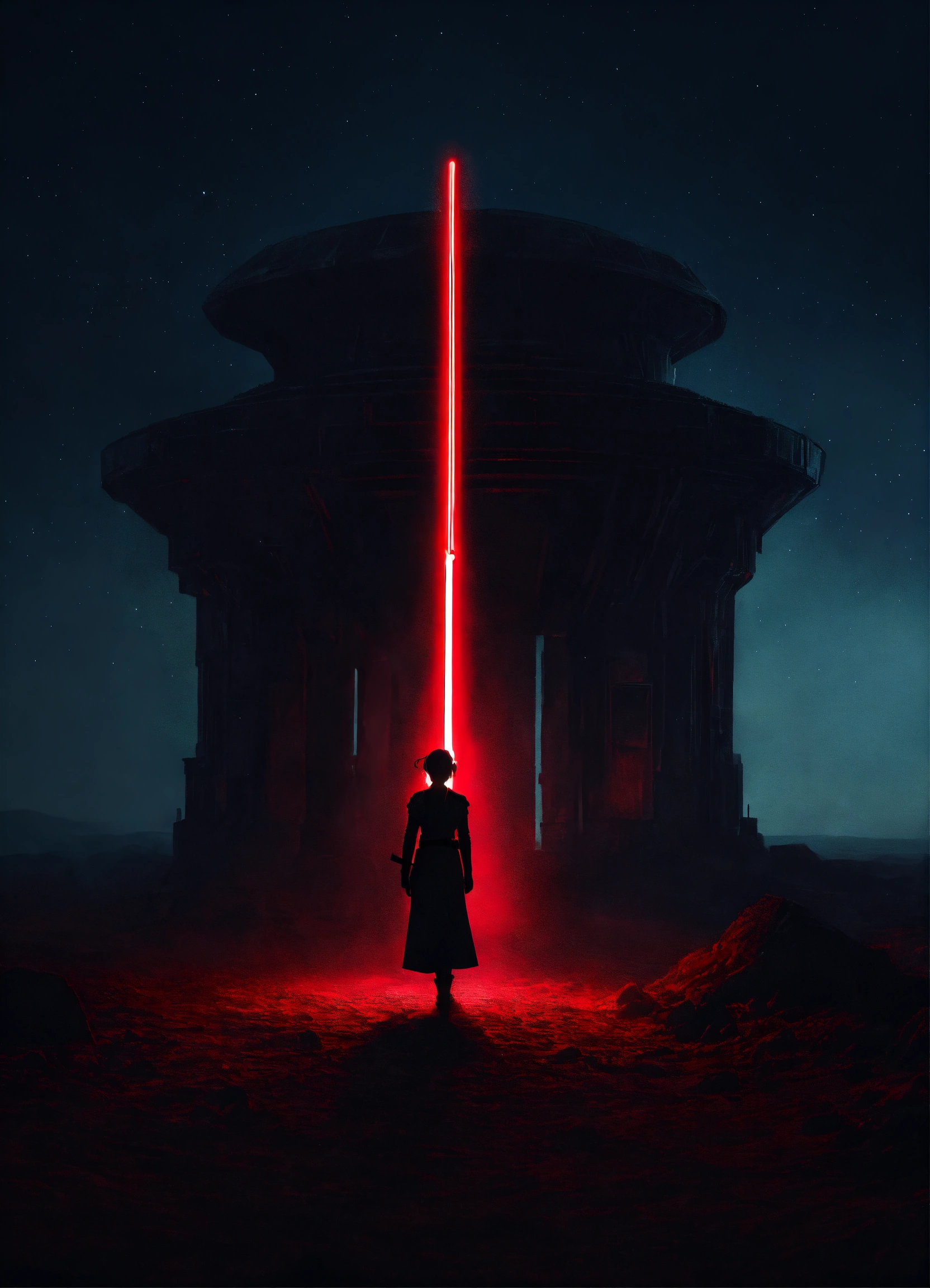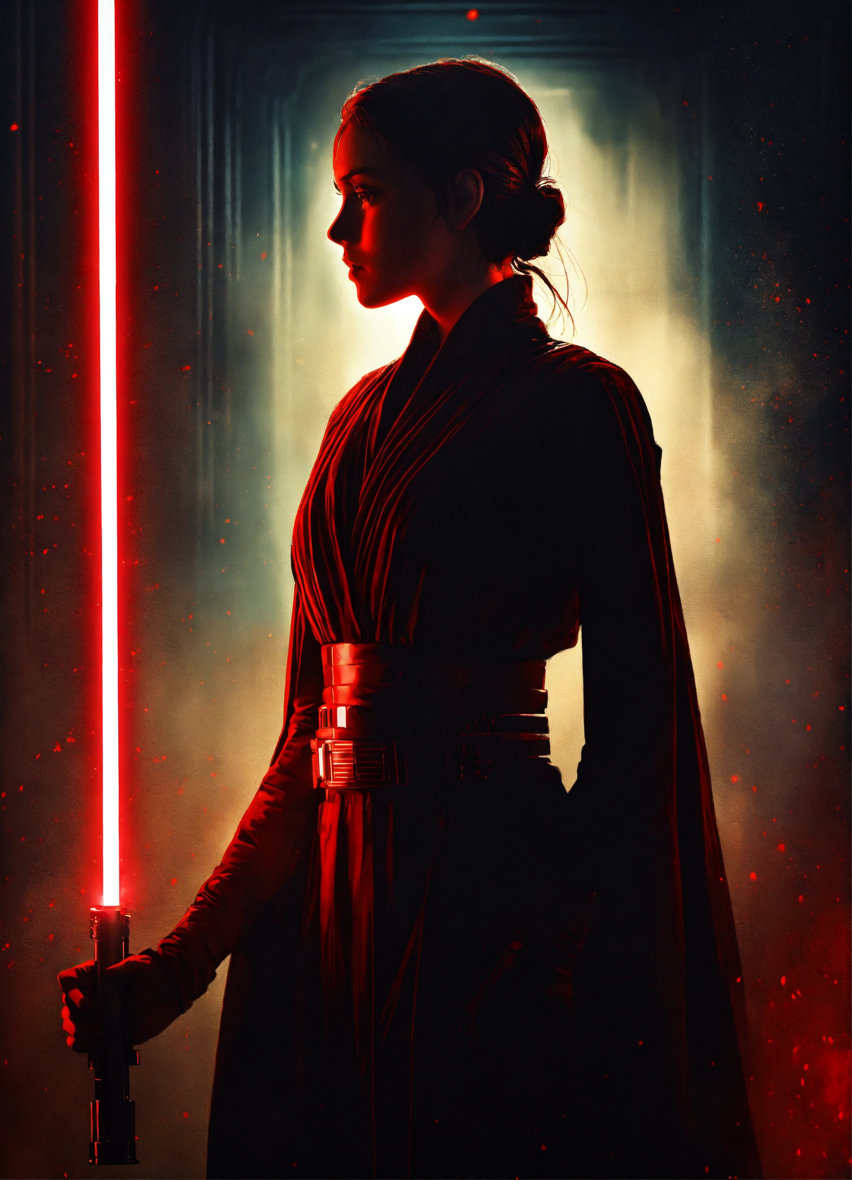 Portrait of a silhouette star wars figure in her red lightsaber, in the style of evocative environmental portraits, dark, red
