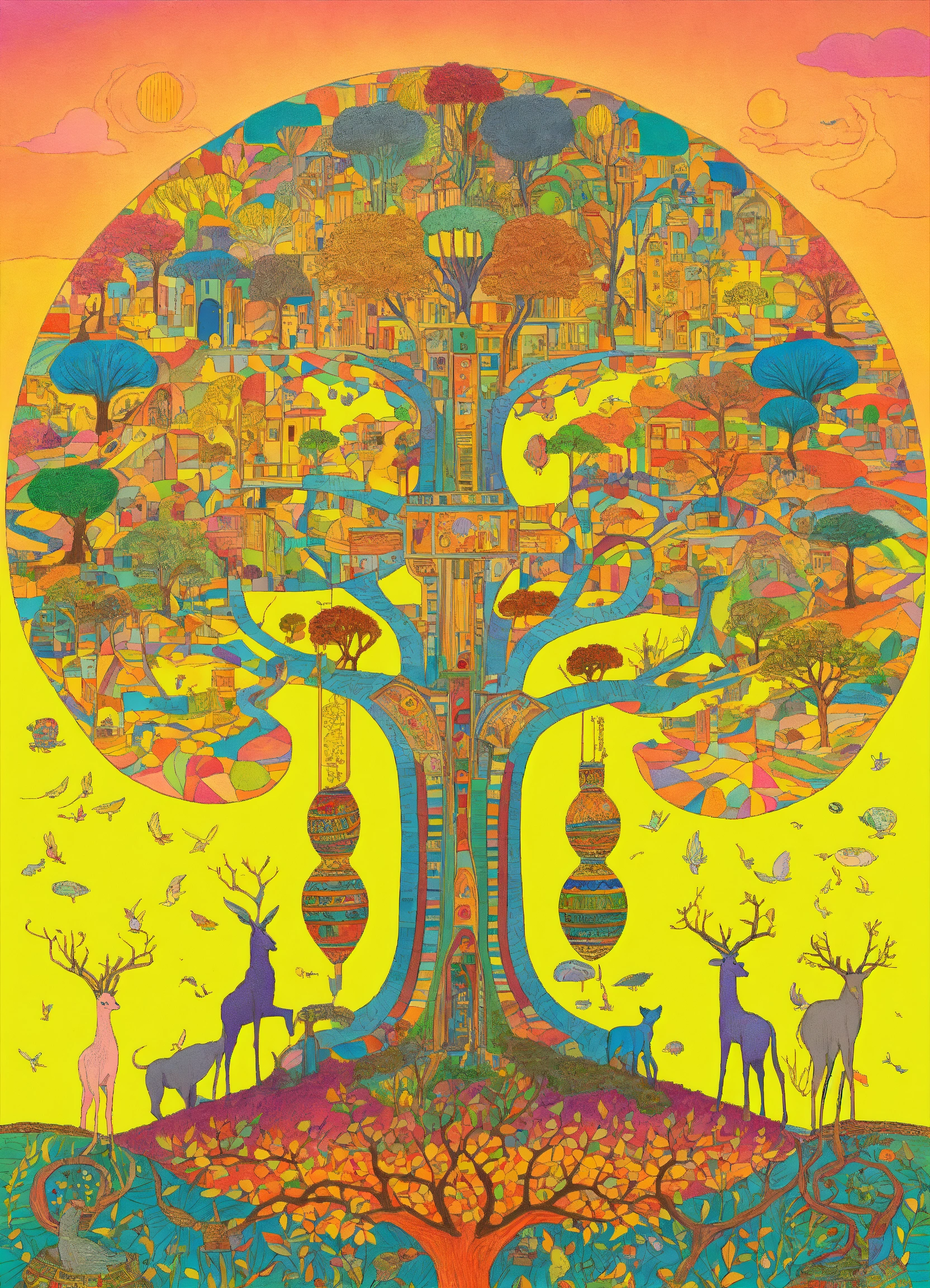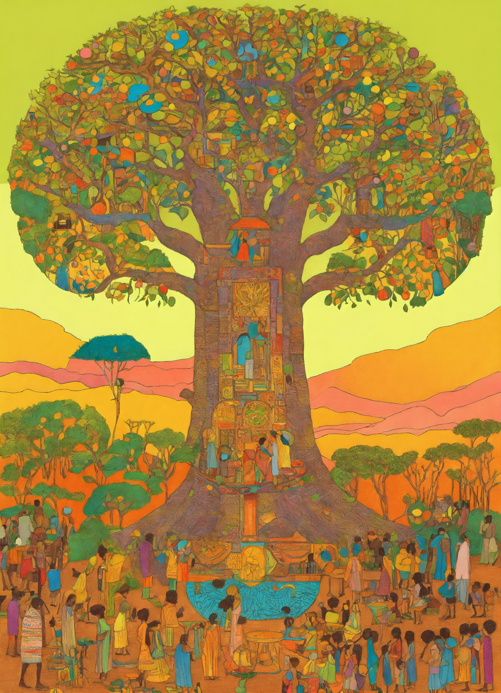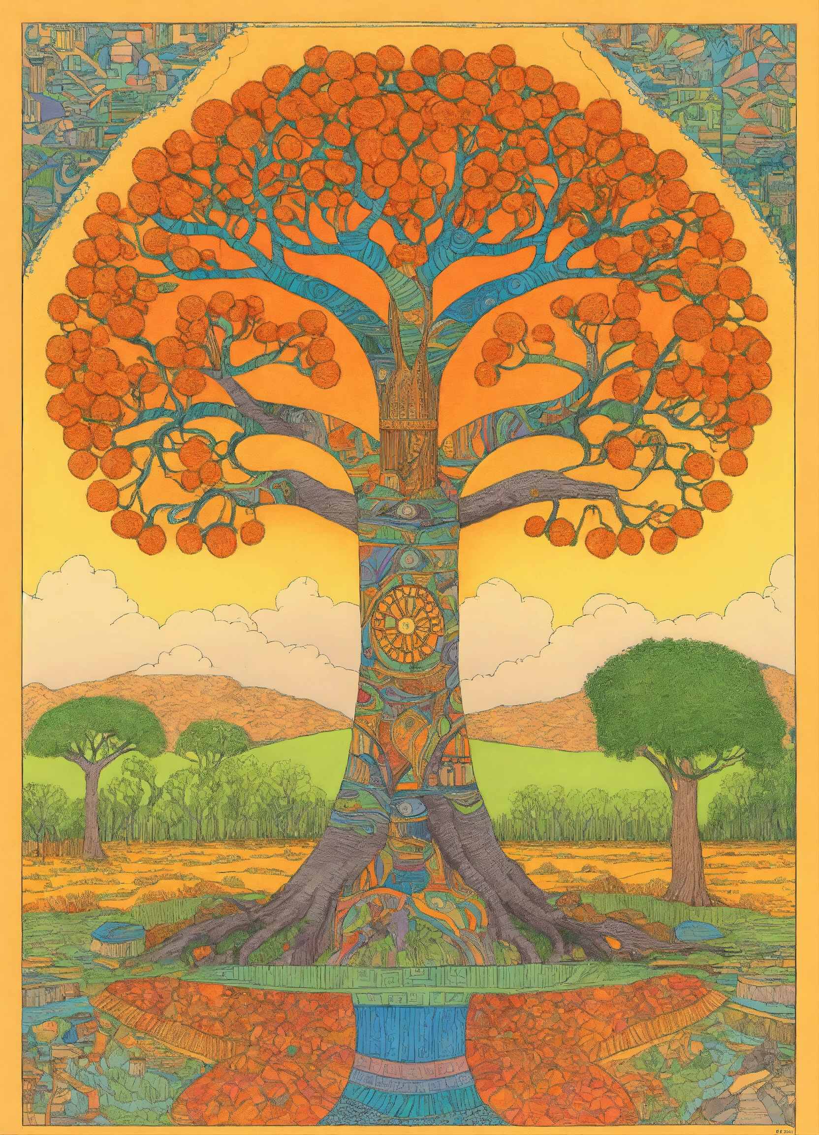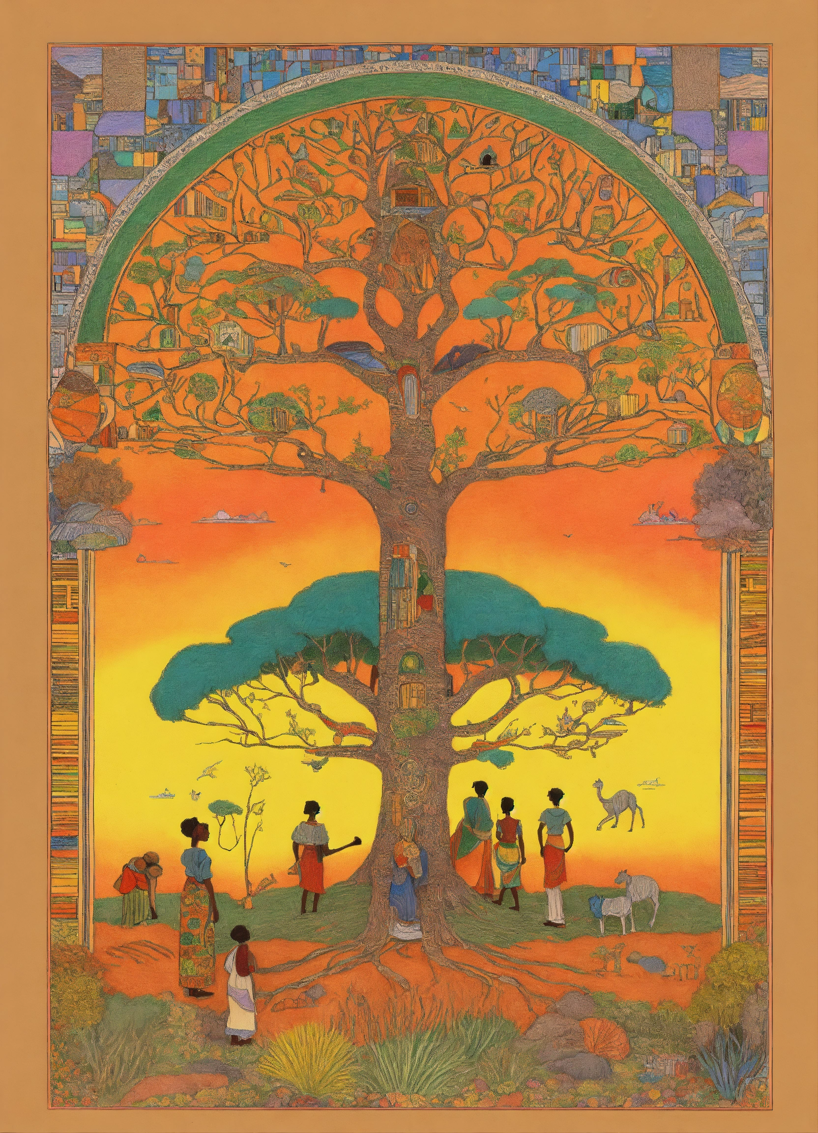 African drawing the tree of life. line drawing, clean clear lines, coloring book style, bright colors, intricate details, elegant, discreete, serene, peaceful, fine detail, pastel pencils, winsor mccay style.