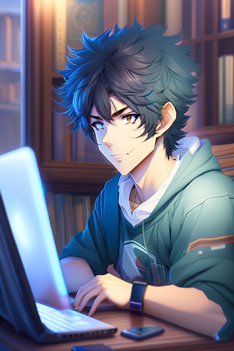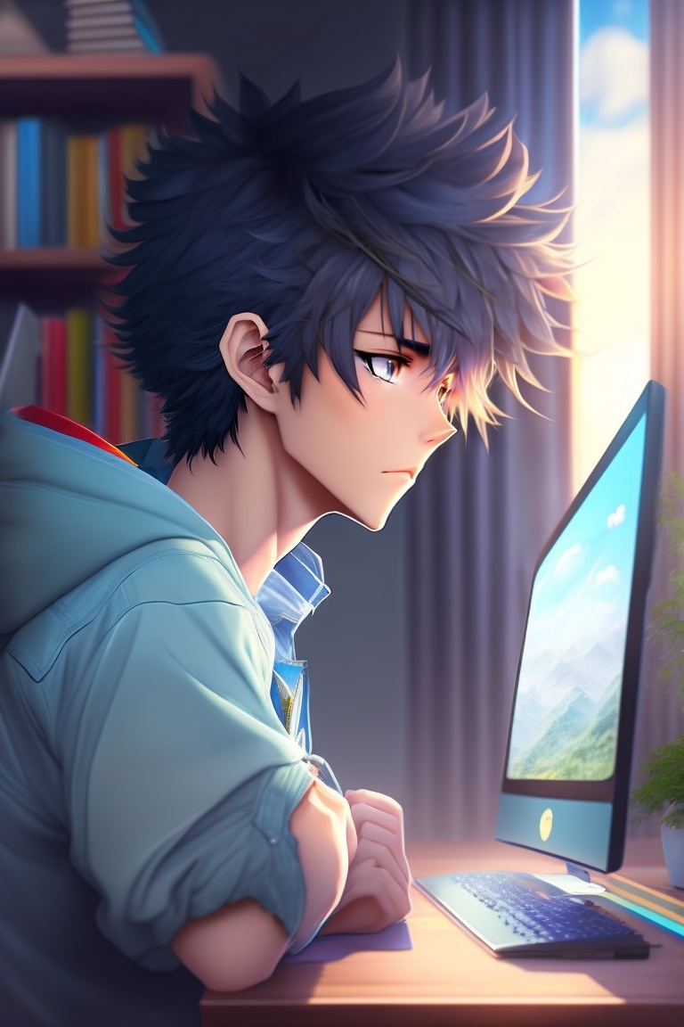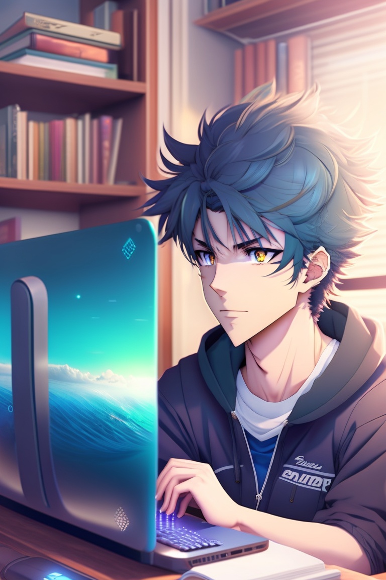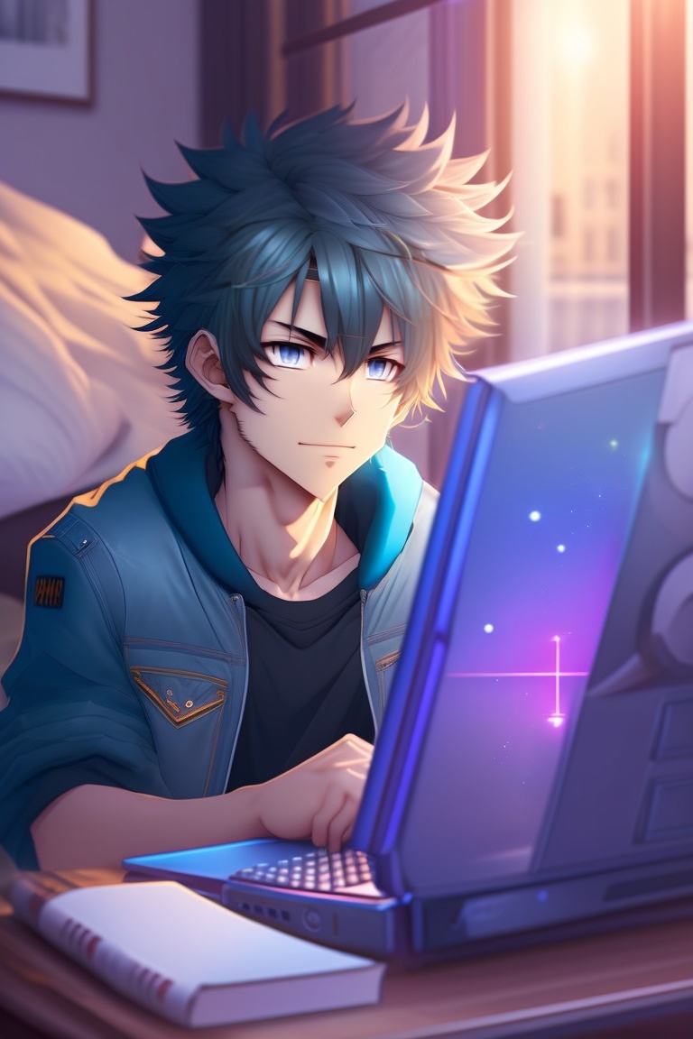 A handsome anime boy with messy hair chilling in his room and watch his computer, ultra photo realistic, detailed body