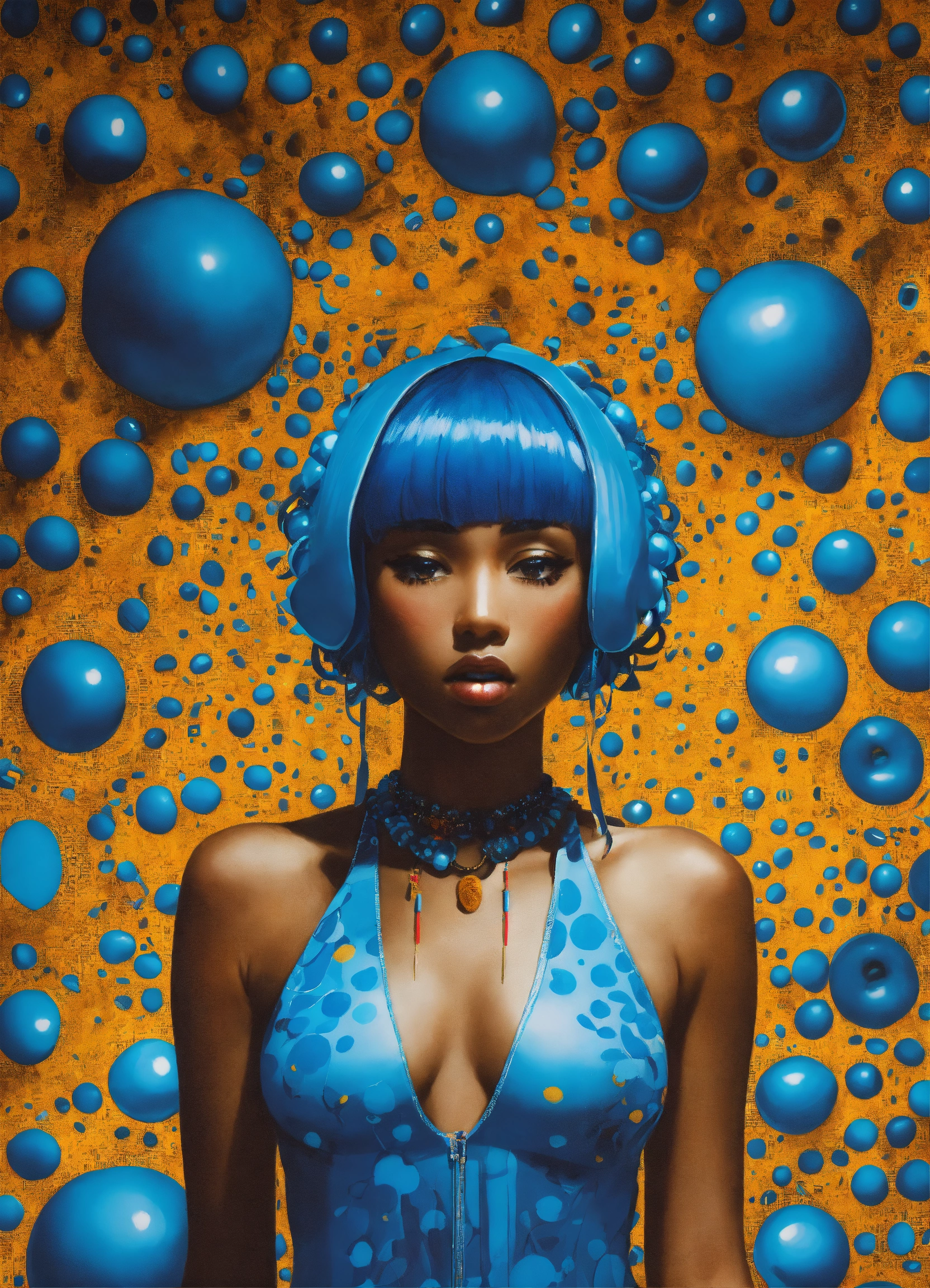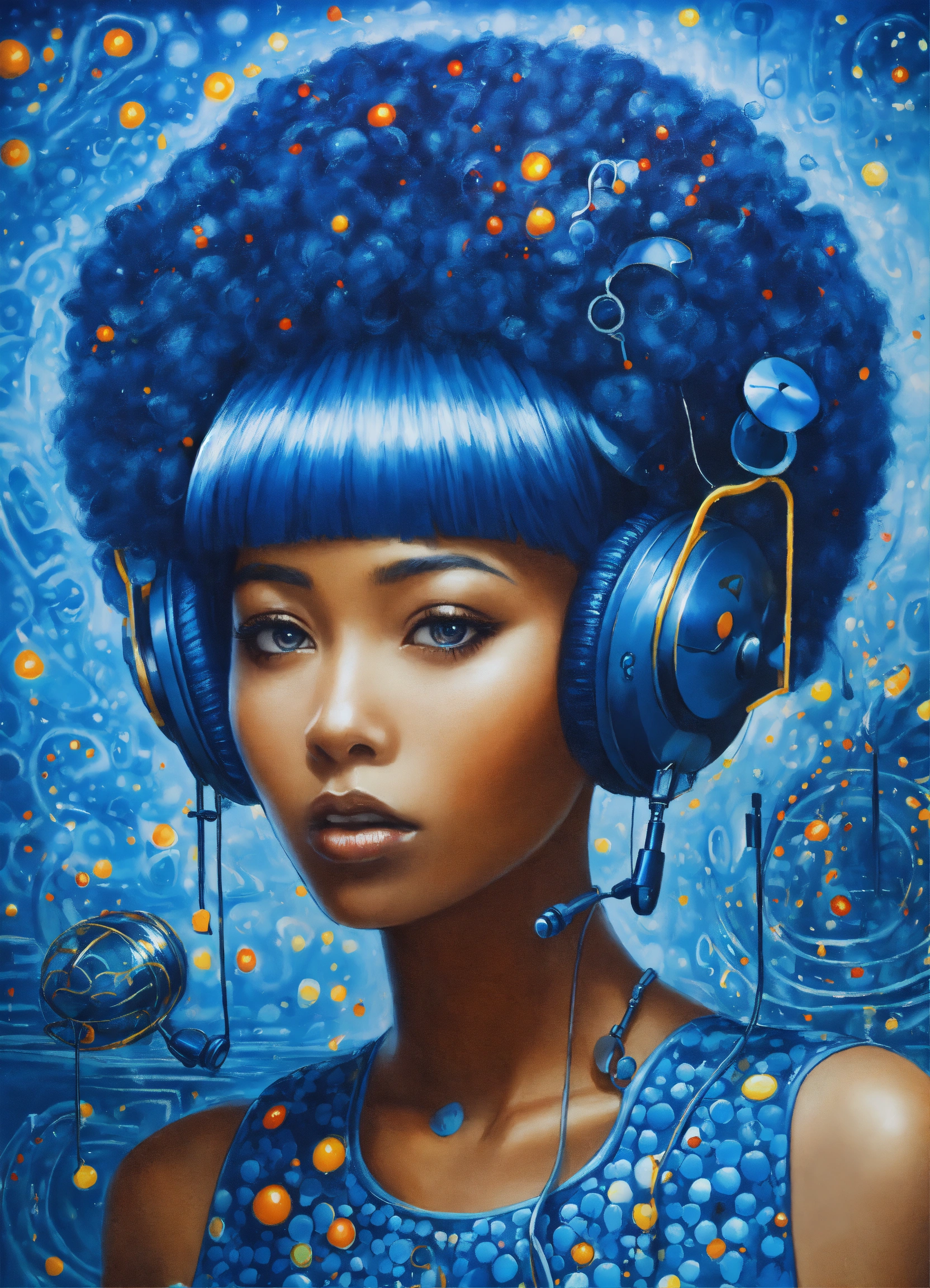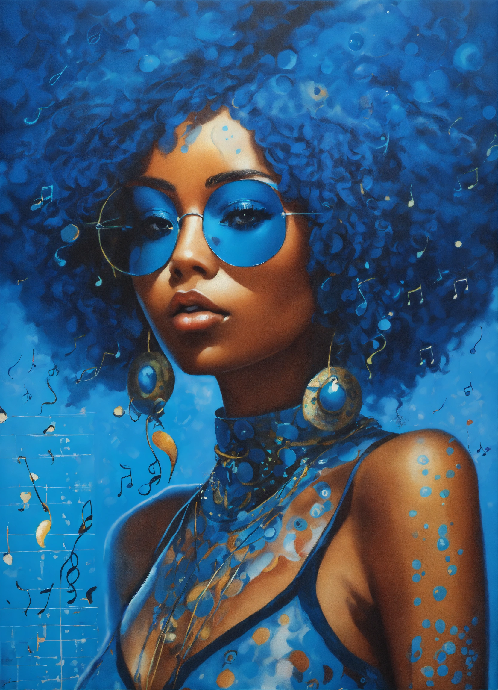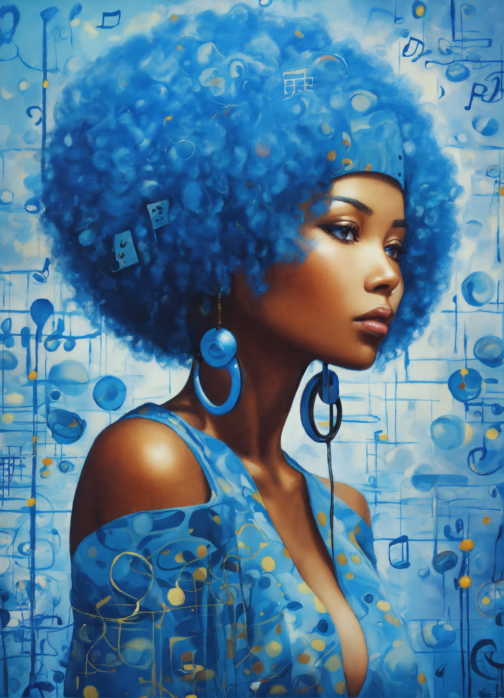 A beautiful woman with blue hair and music notes, an airbrush painting yayoi kusama, afrofuturism, afro futurism, music poster, afro futuristic