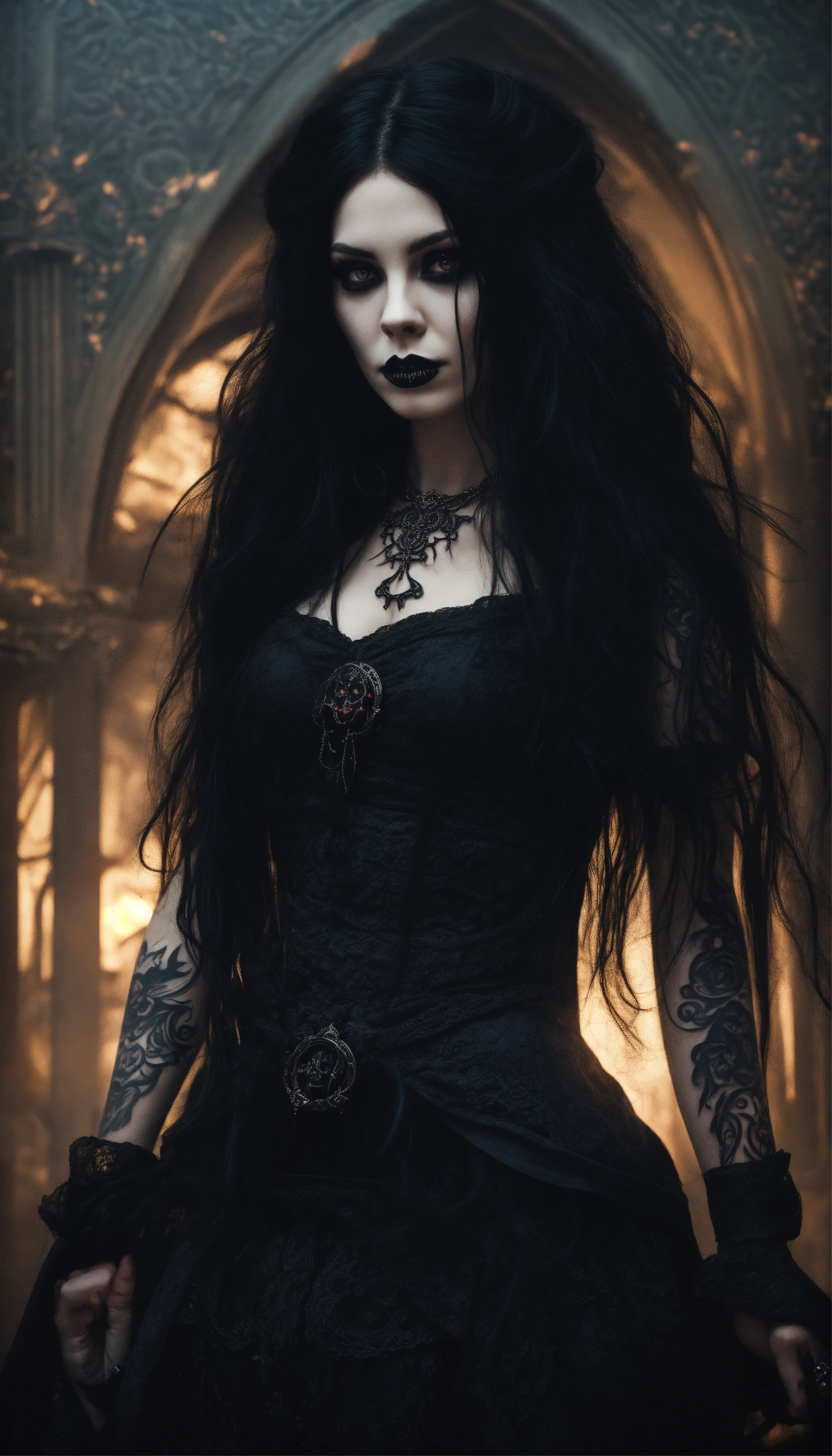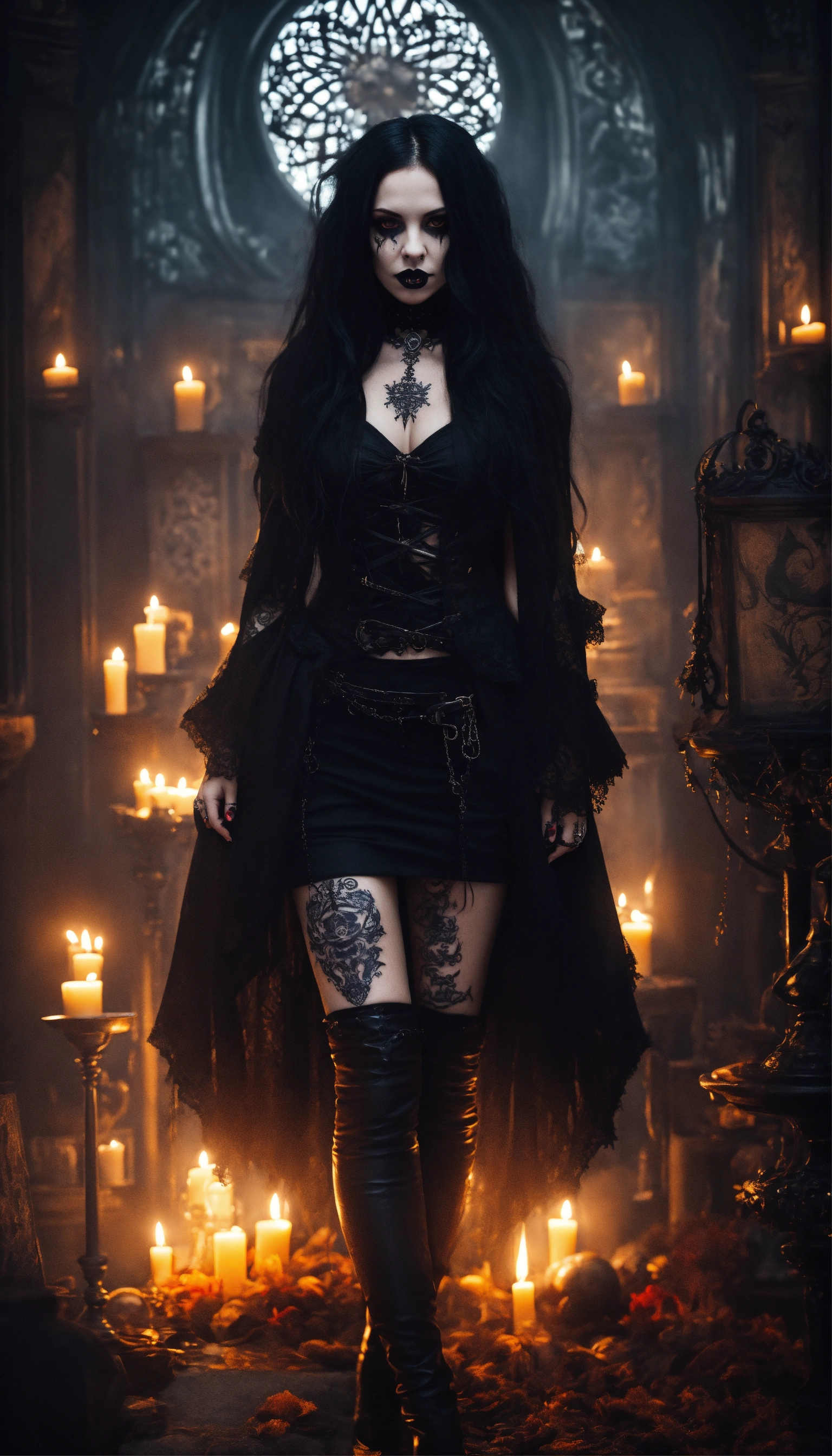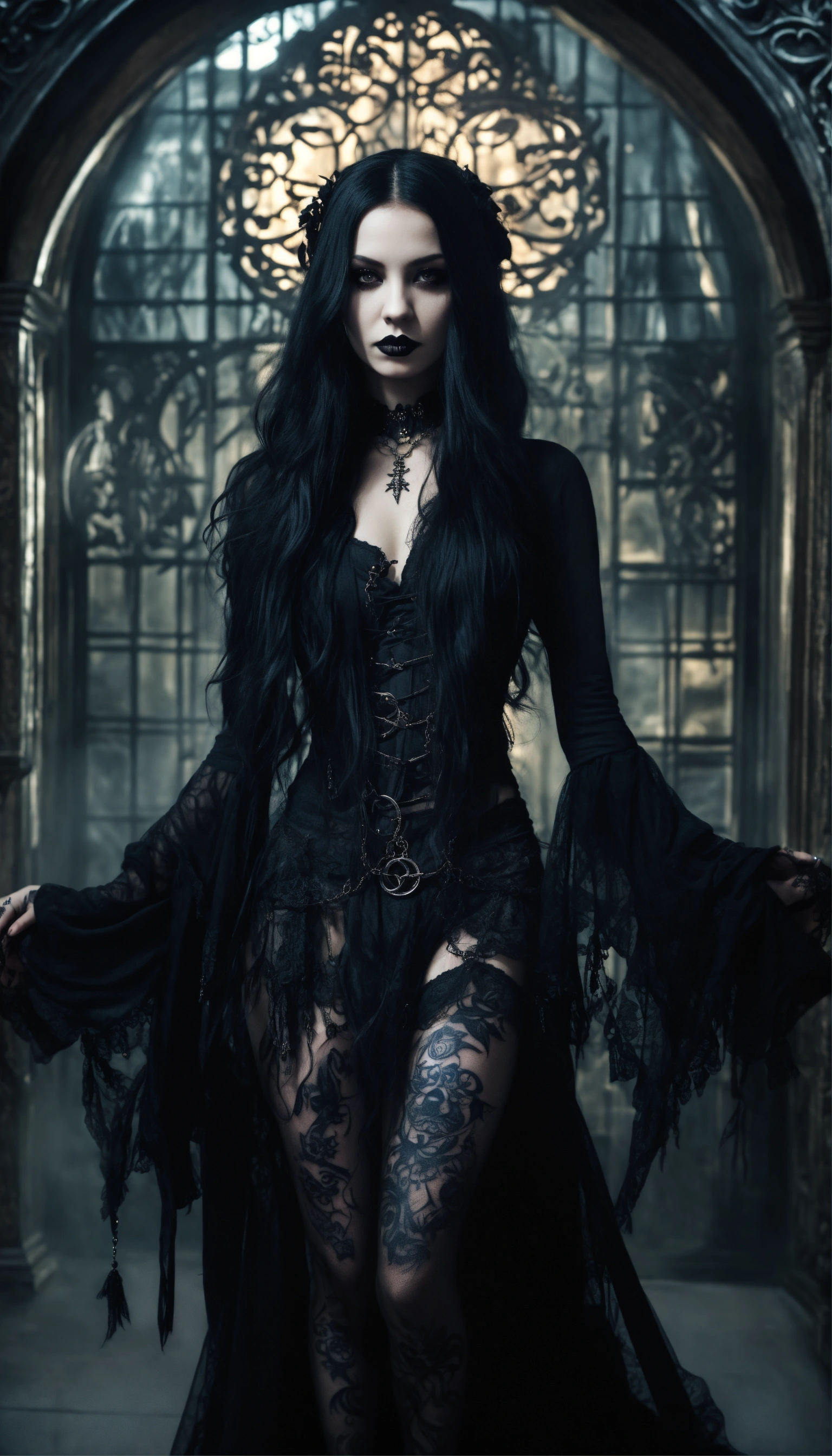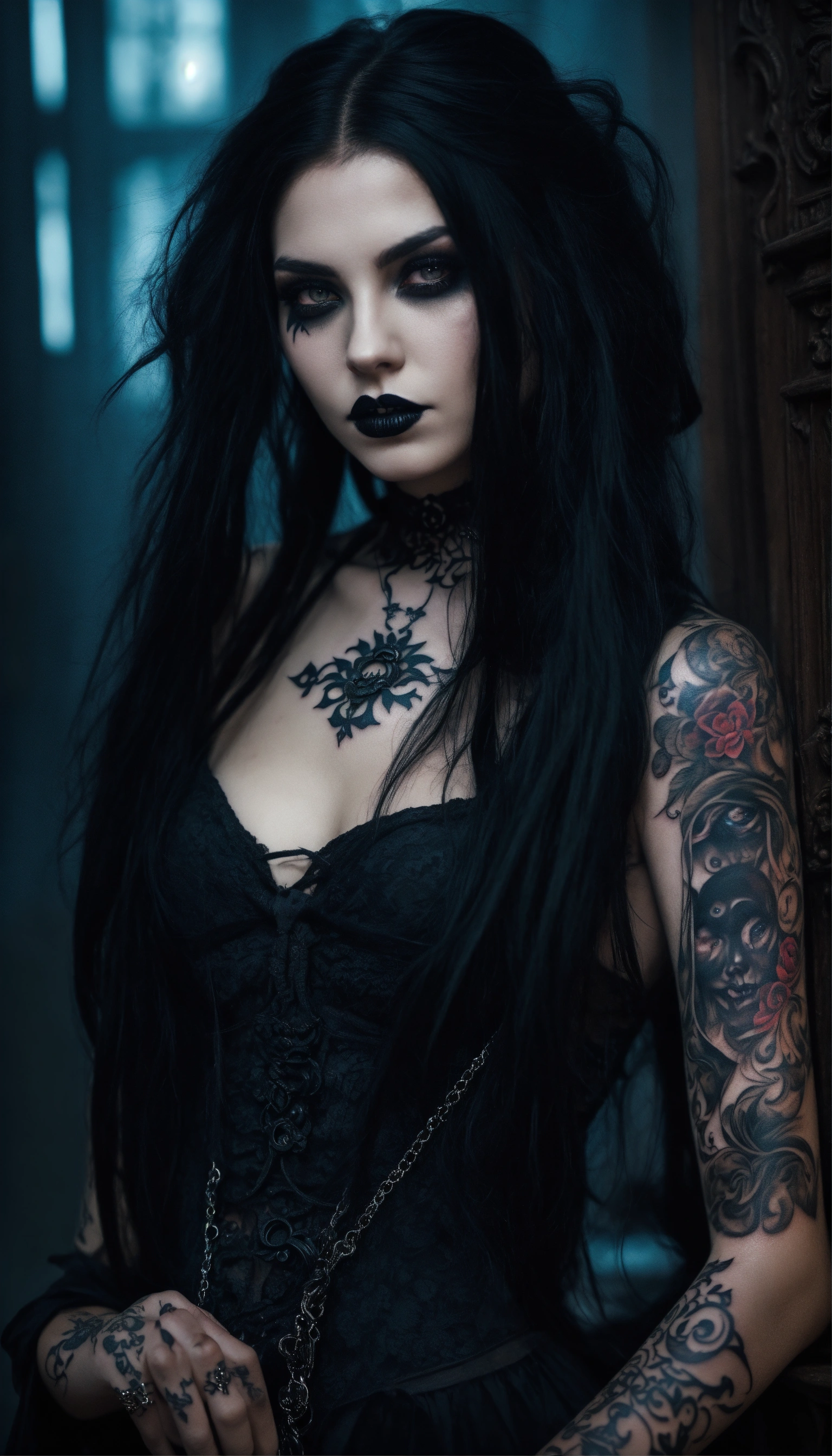 A scary girl, full body, pale skin, long crazy black hair, dark eyes, a dark and mysterious appearance, facial tattoos, gothic aura
