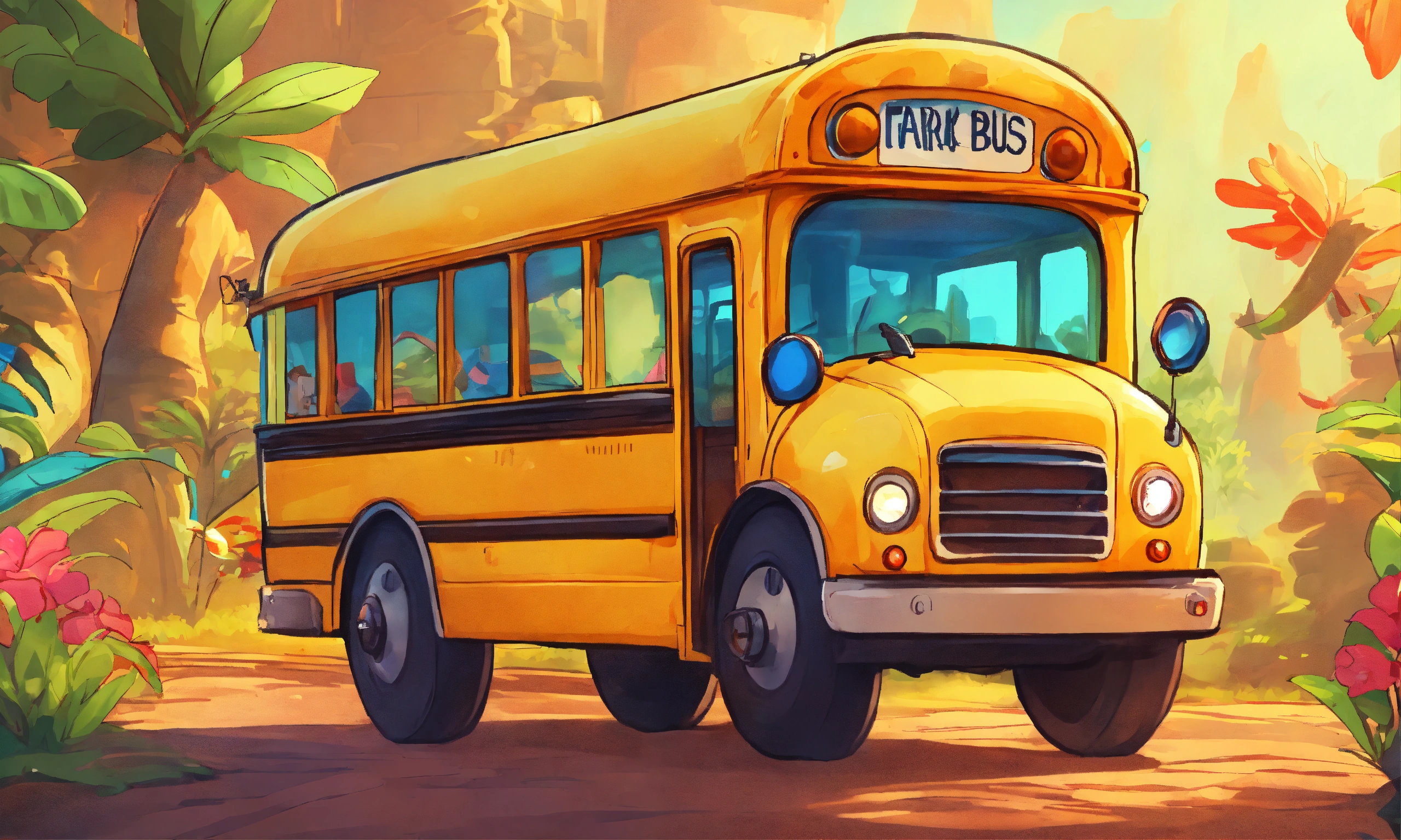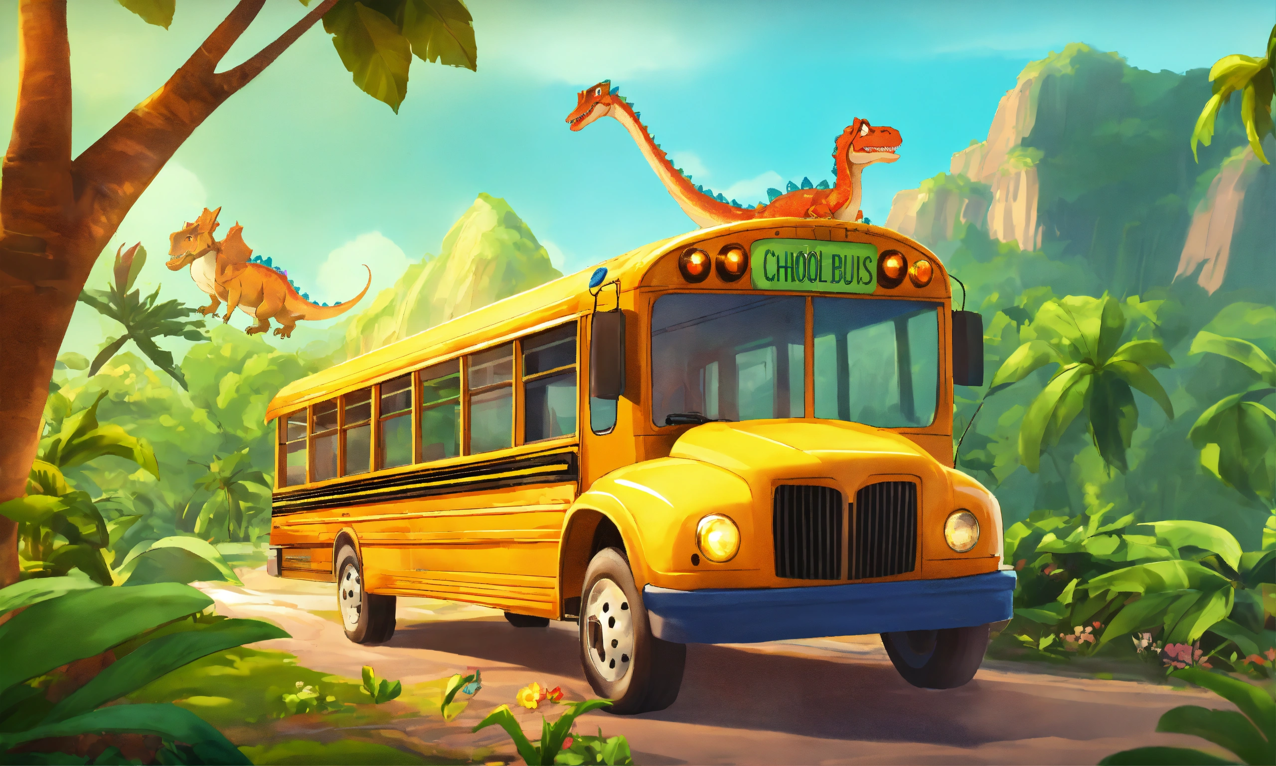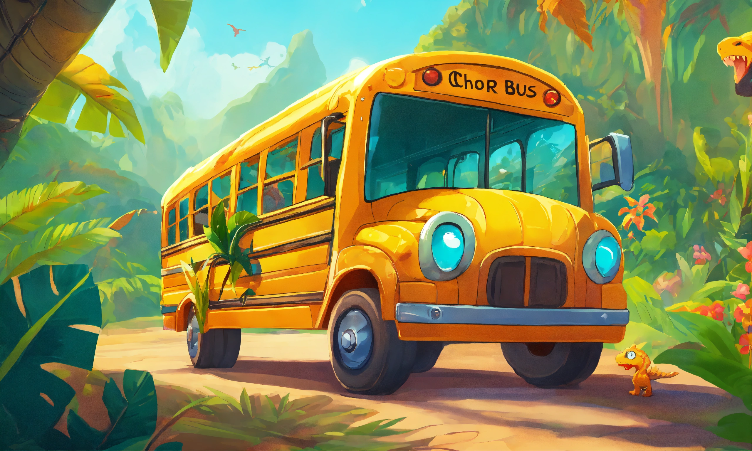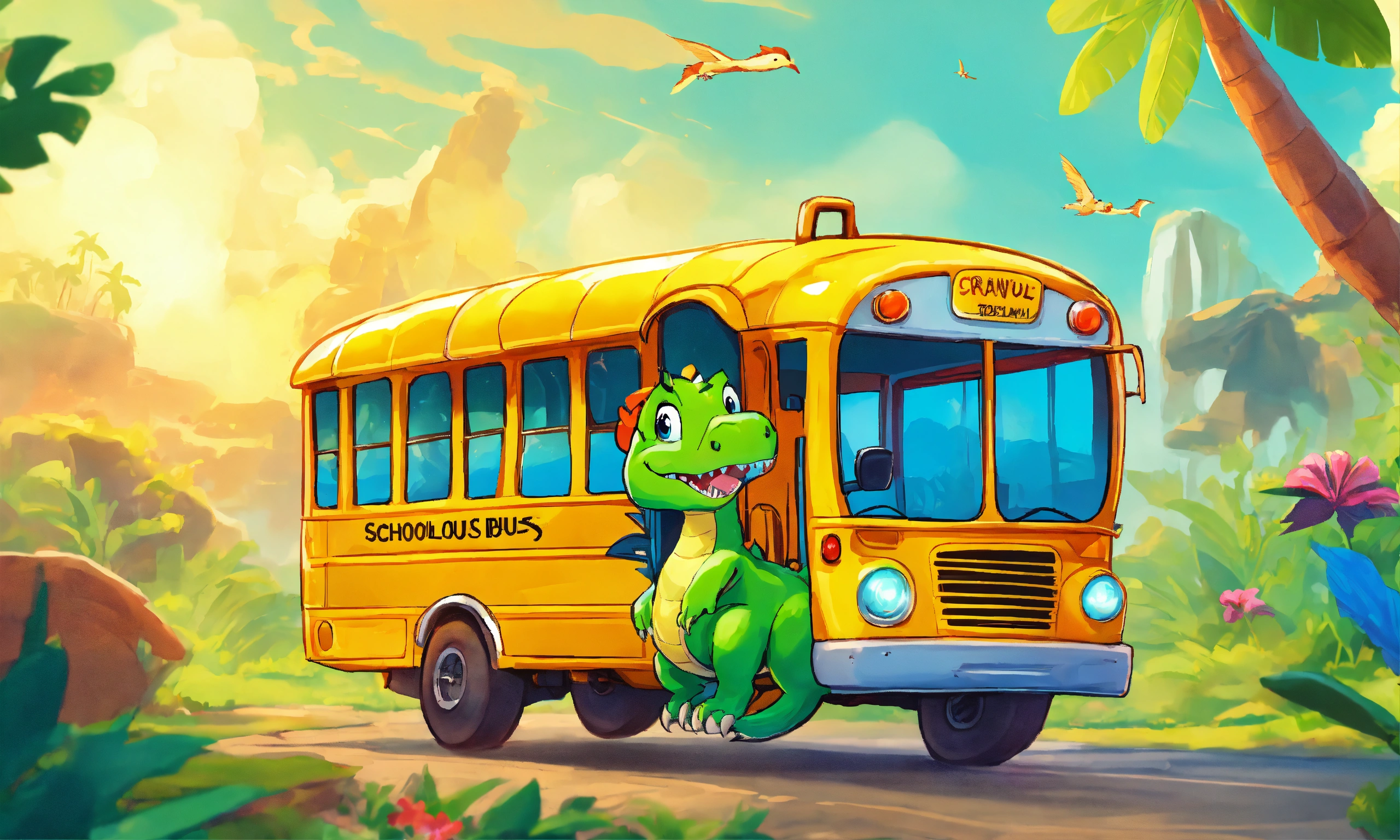 Of a school bus that resembles a dinosaur, with a cheerful and friendly smile. the bus should be depicted traveling through a fantastical and magical tropical landscape. please make the scene as vibrant and enchanting as possible, 2d cartoon style for youtube kids cartoon