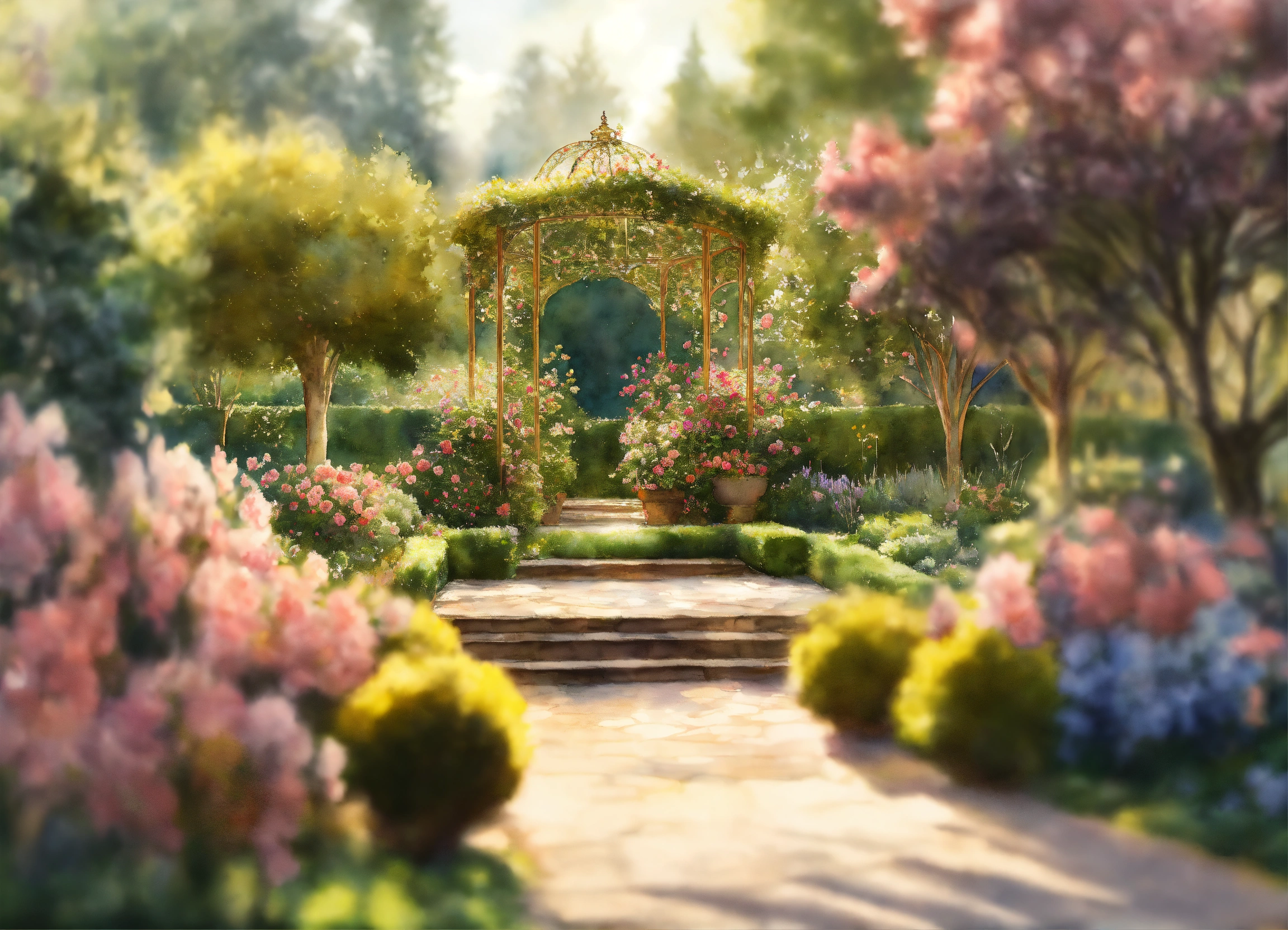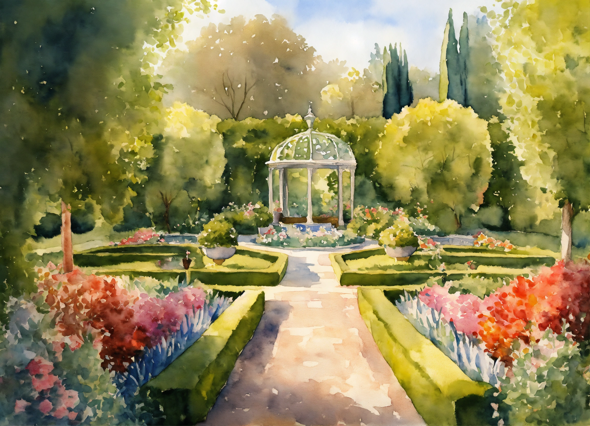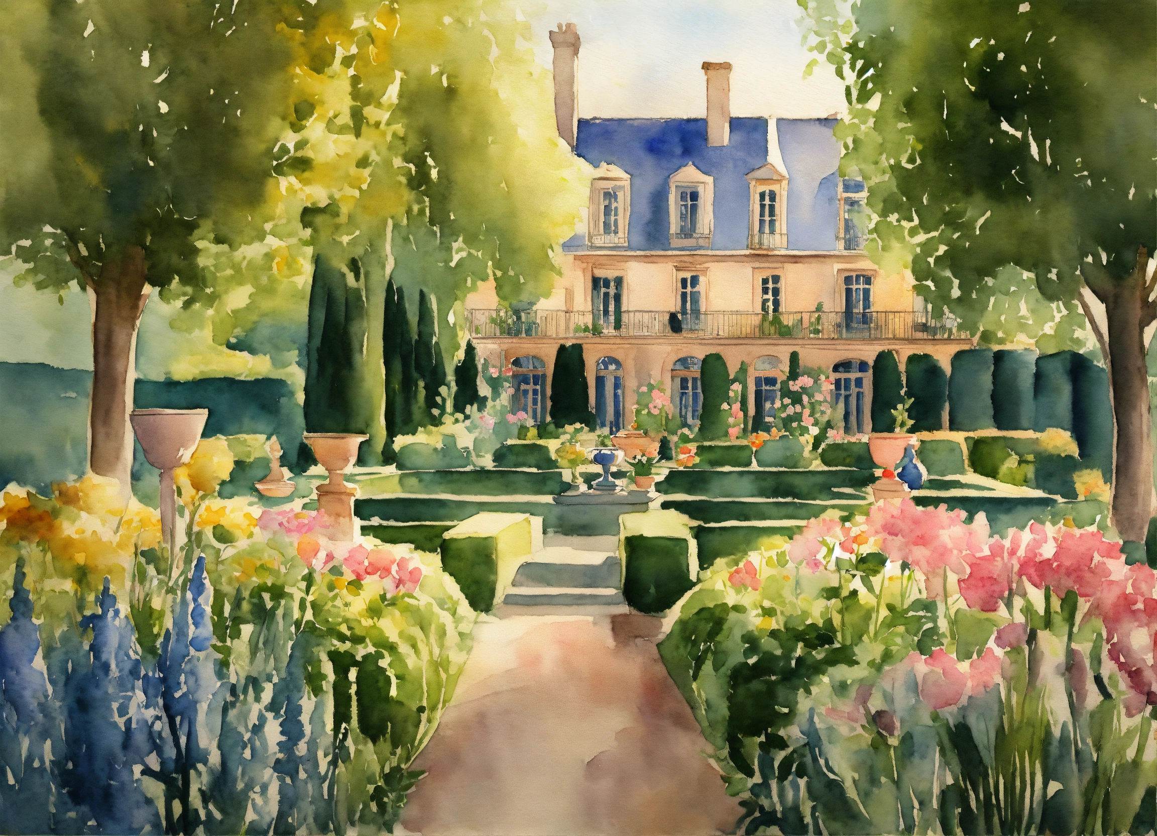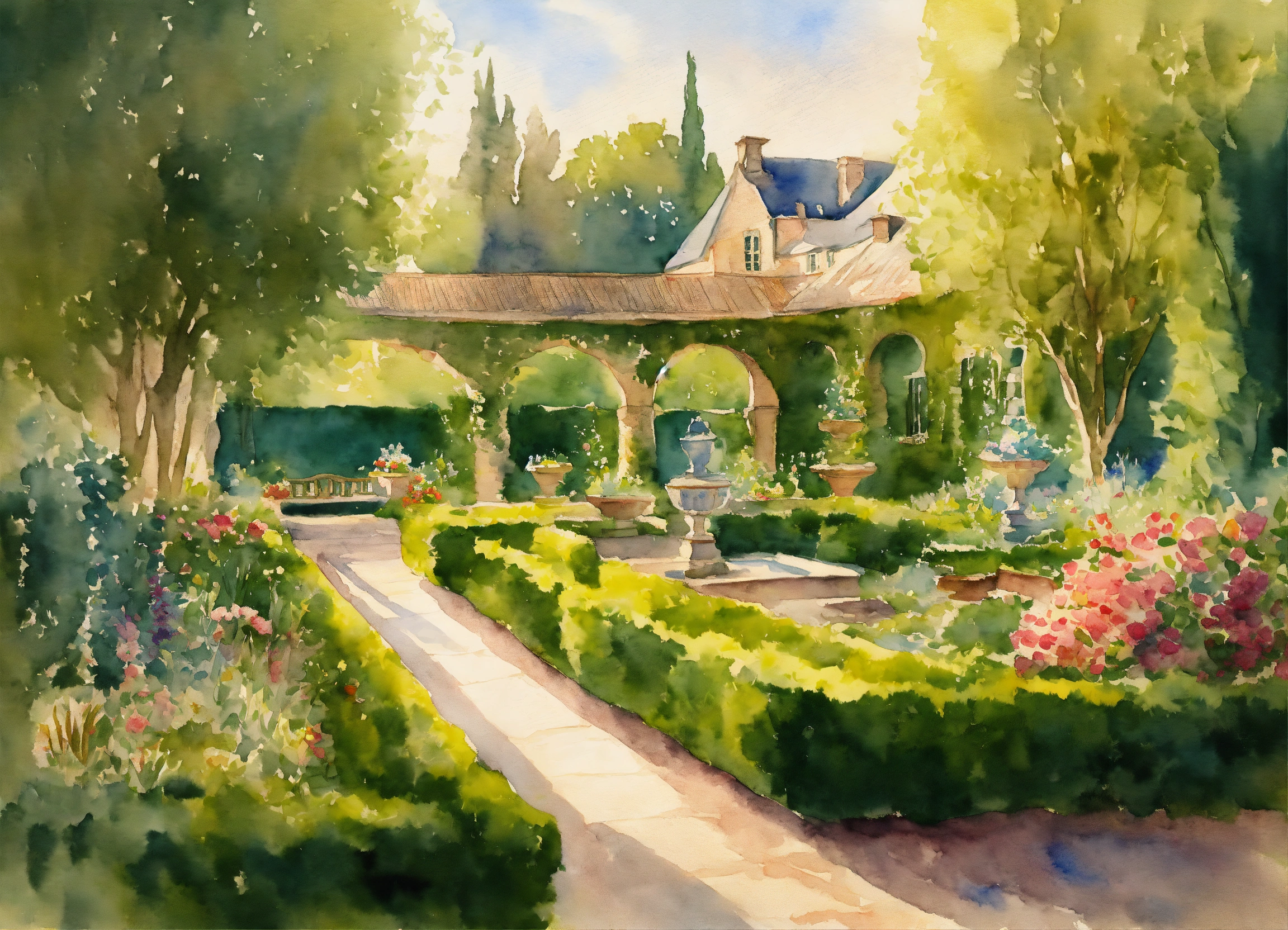 Watercolour painting, beautiful french garden, warm light, intricate and detailed, 8k, ultra-detailed, sharp focus