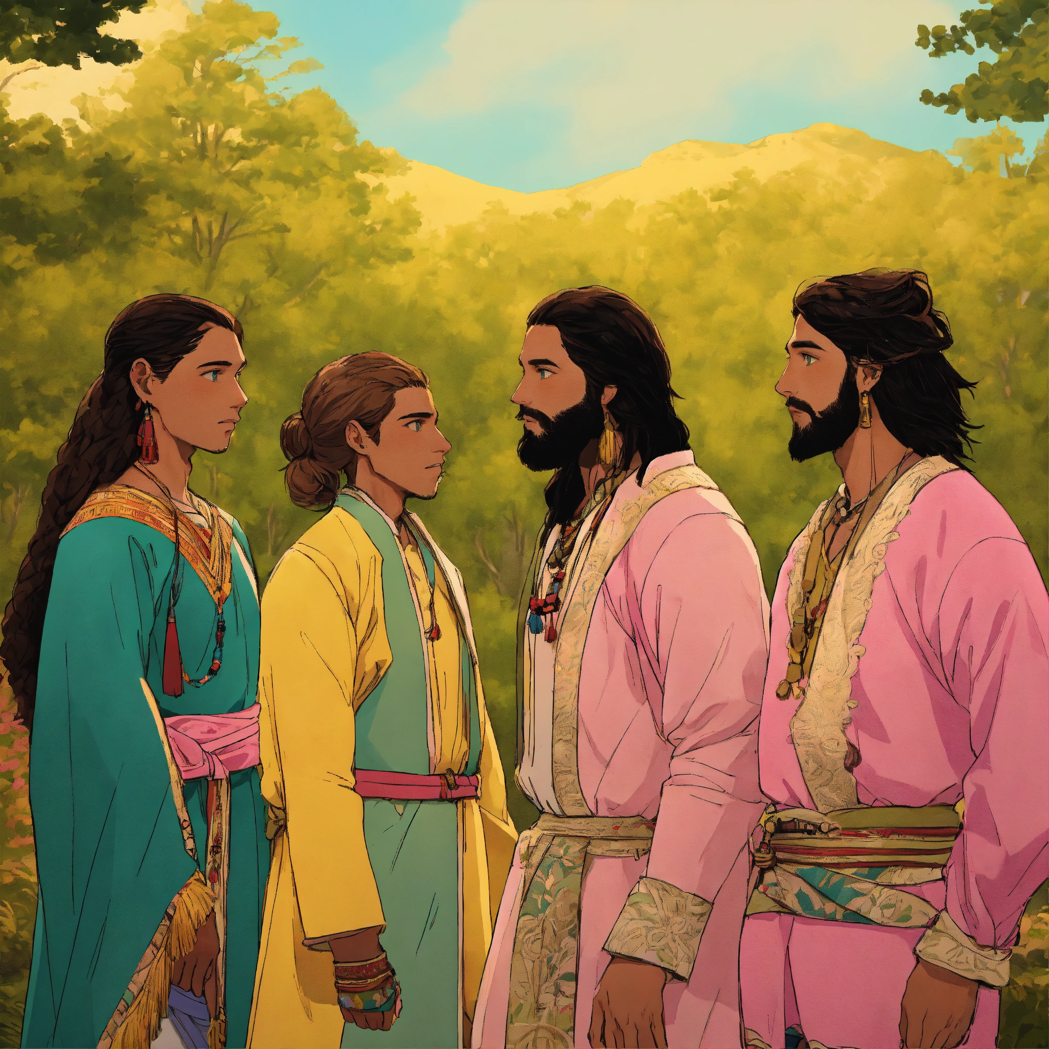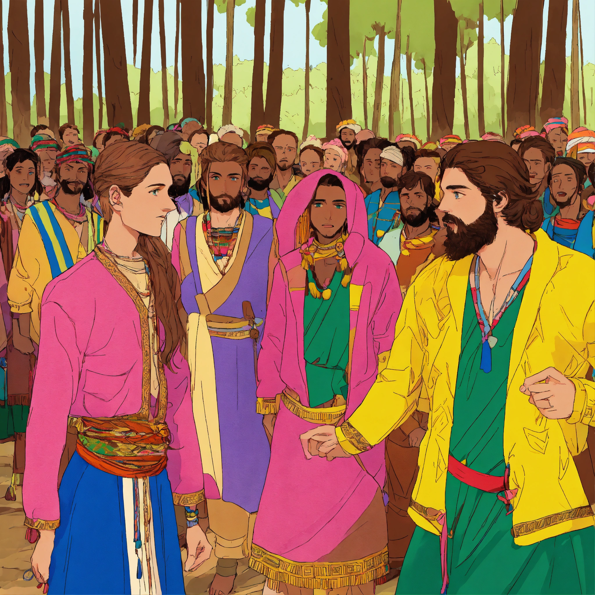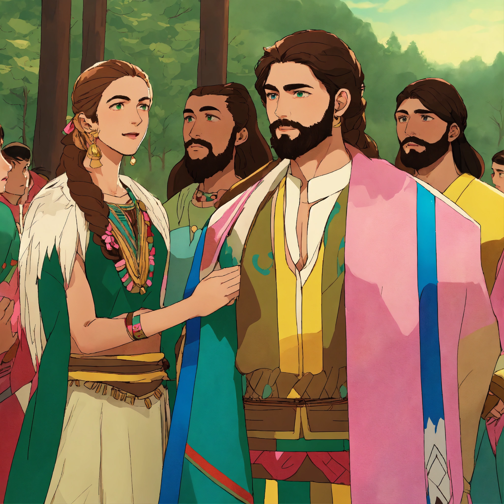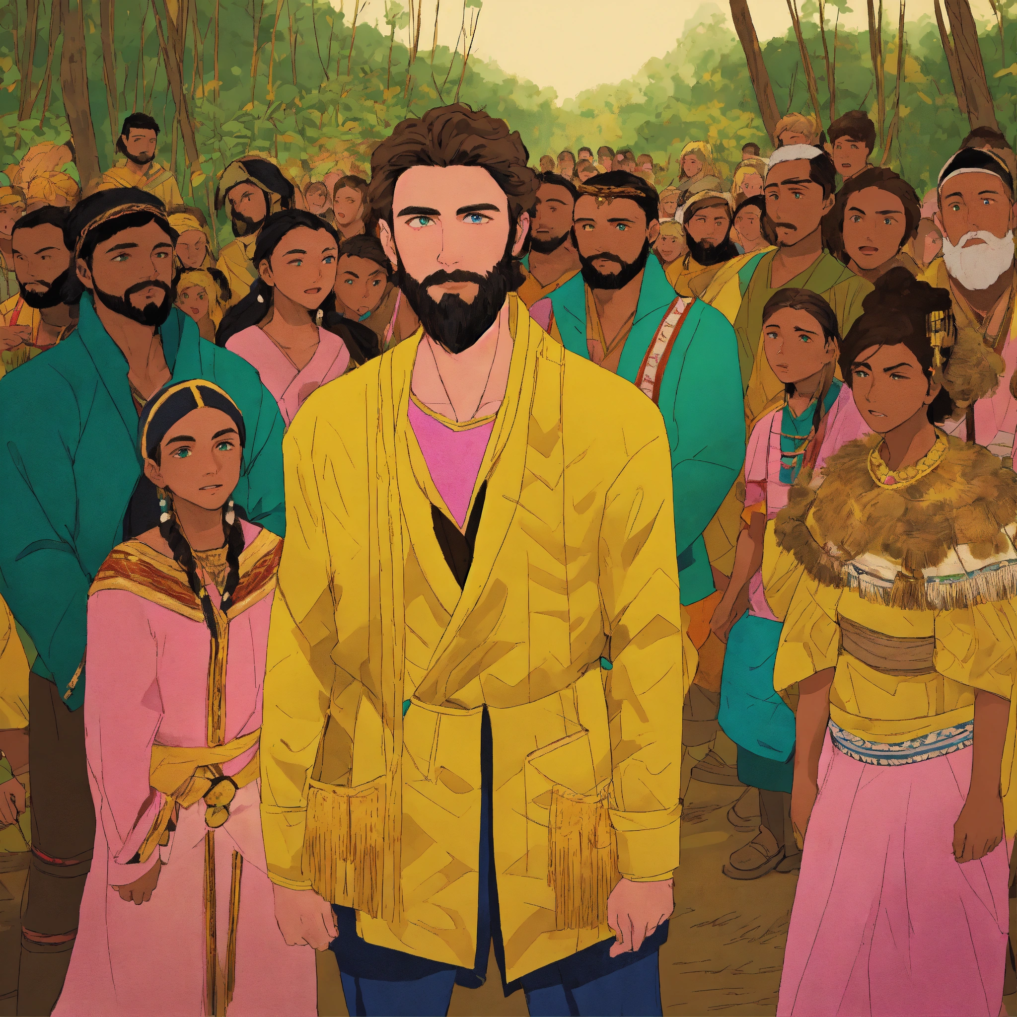 In this particular illustration style, a young man with brown hair, a light thin brown beard, and green eyes can be seen wearing a yellow jacket and a white woman with blonde hair, blue eyes, and a v-shaped face wearing pink jacket. show group of tribal people meeting young man and woman. show wide view of forest and tribal people dressed in their historic dresses