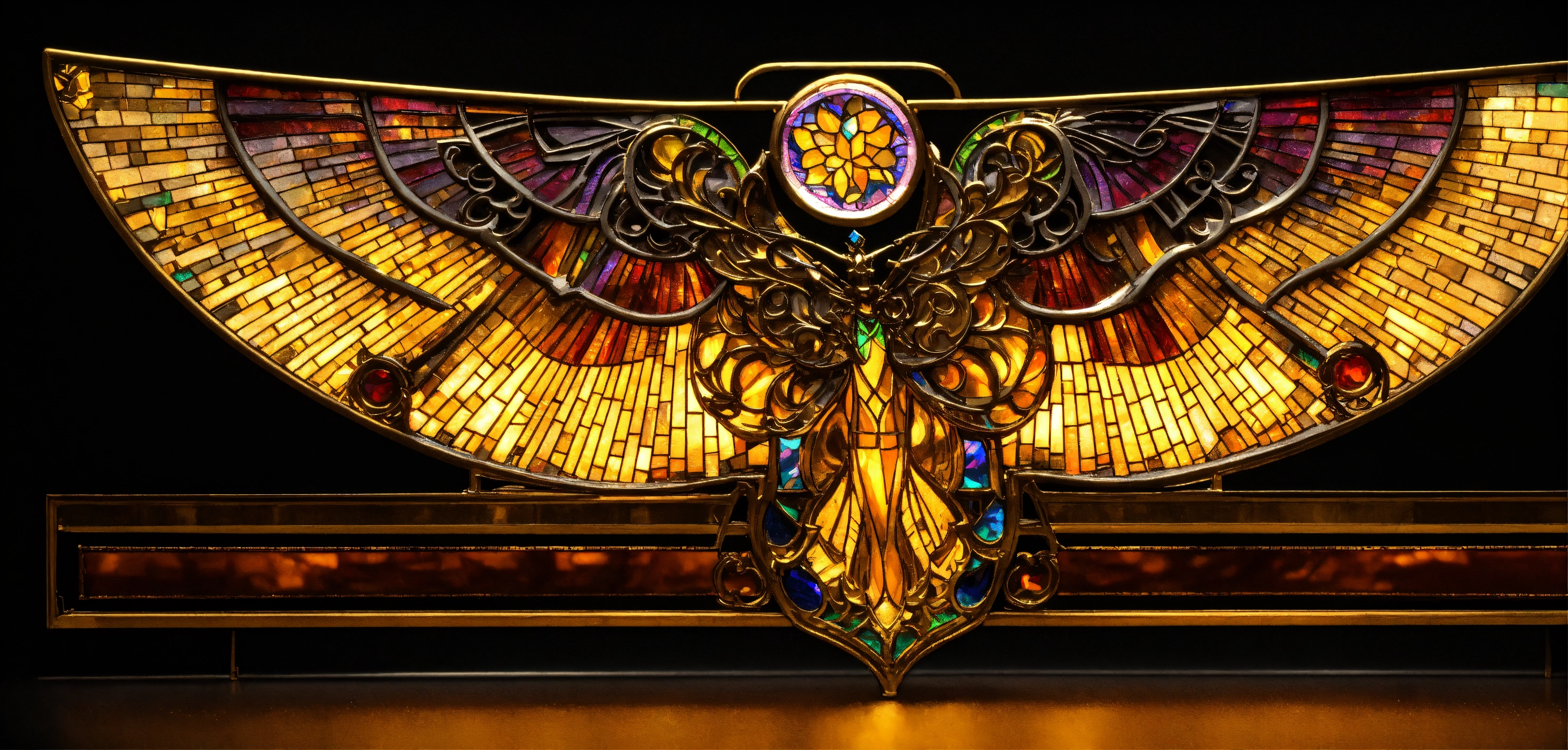 Large symmetrical logo pendant with wings of backlit, black background, glowing, fractal, stained glass and a body of intricate gold, with etching and filigree, extremely fine micro detail, masterwork, centered subject, rim light by louis comfort tiffany, fundo black, neon realist