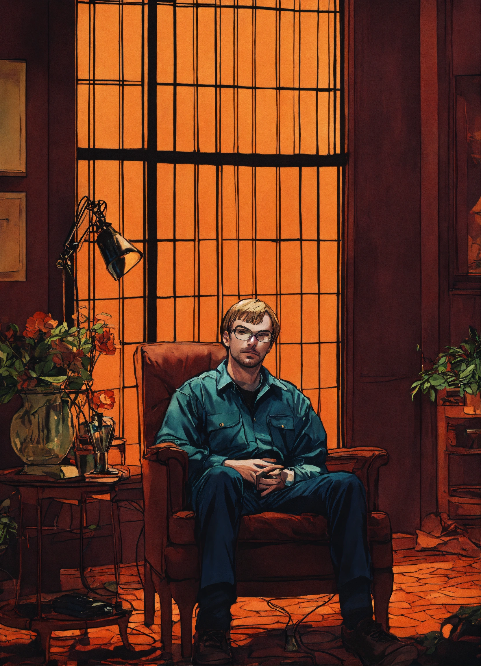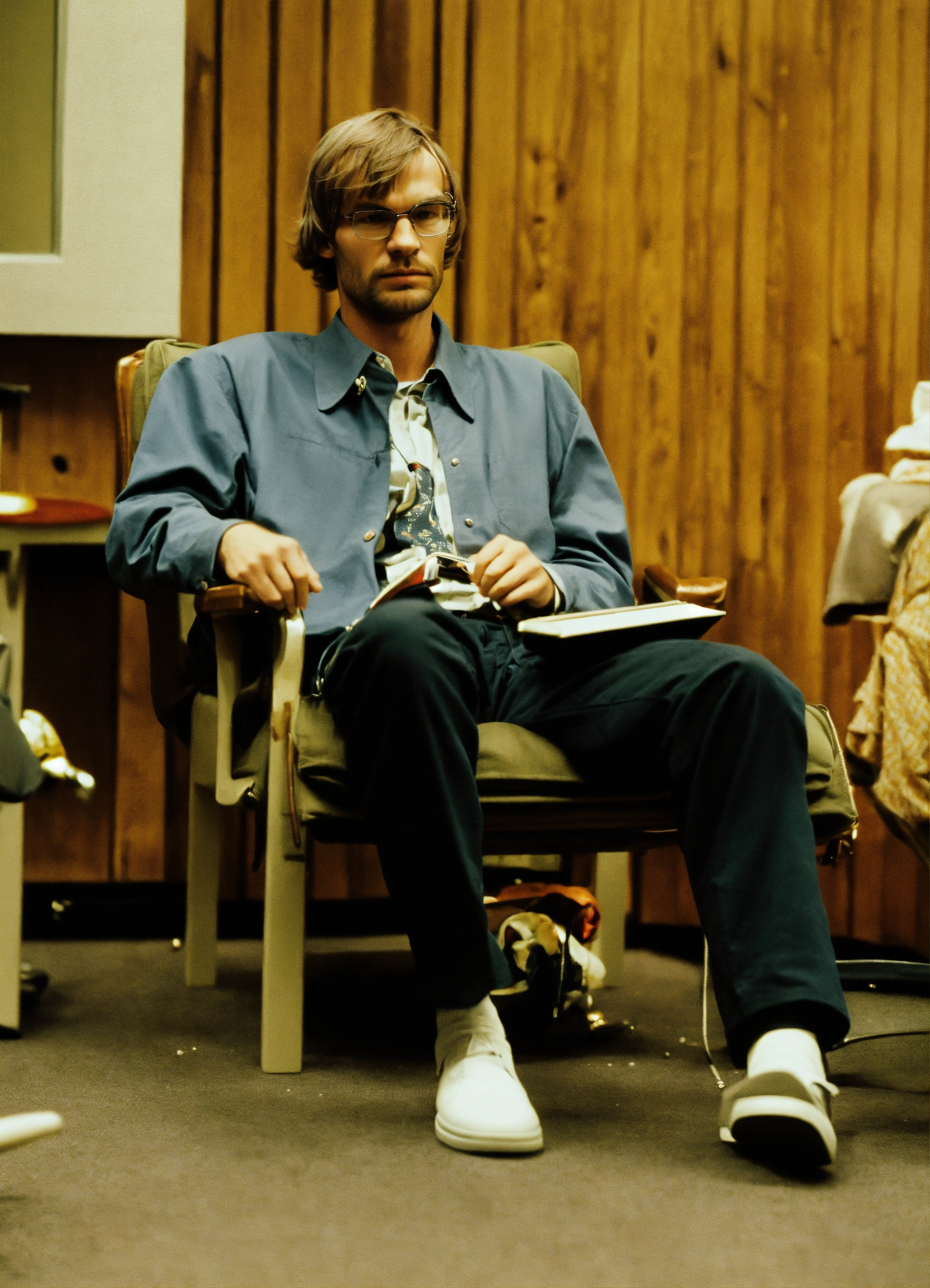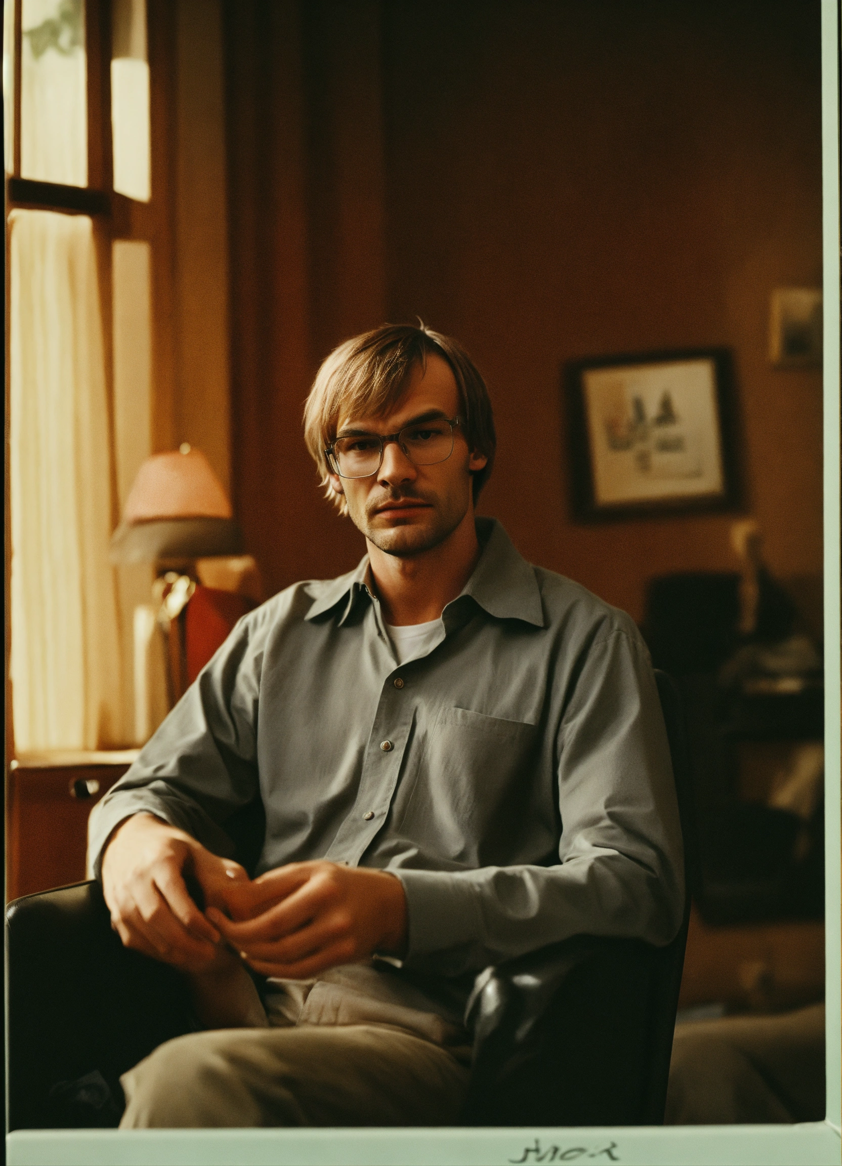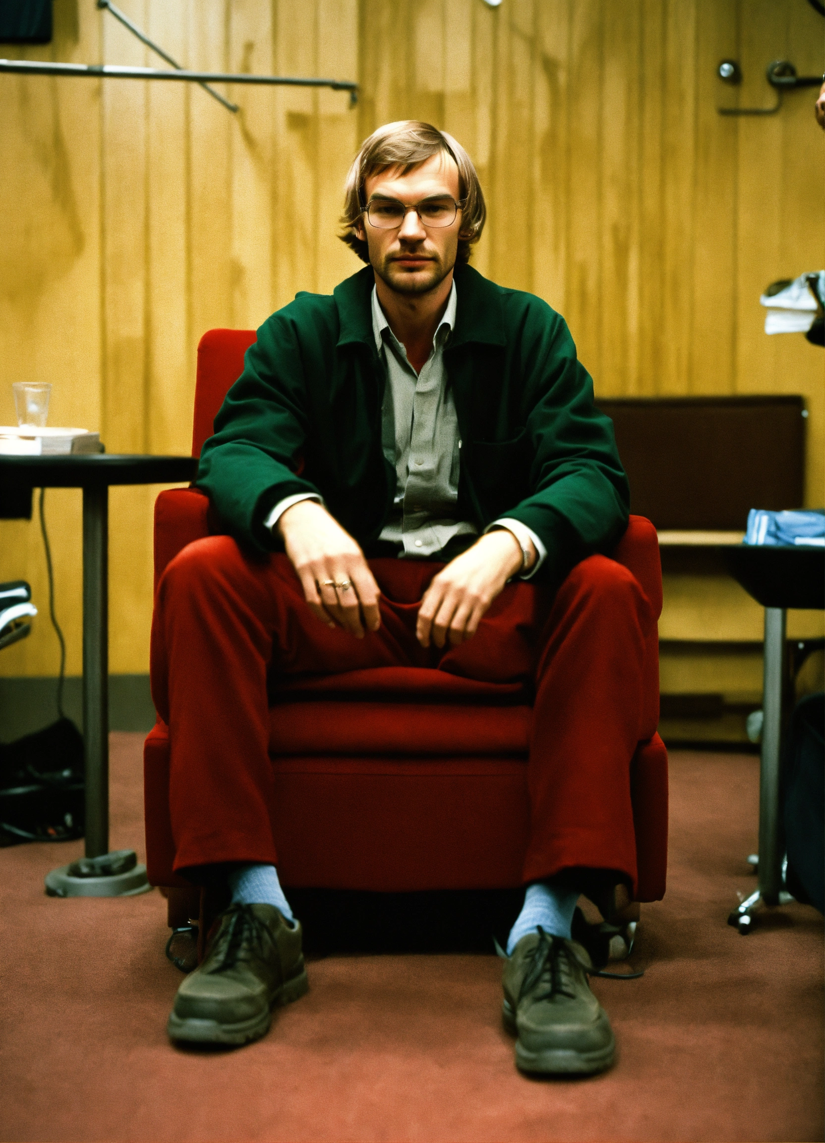 Jeffrey dahmer assit dans un fauteuil dans son salon avec un fond sombre