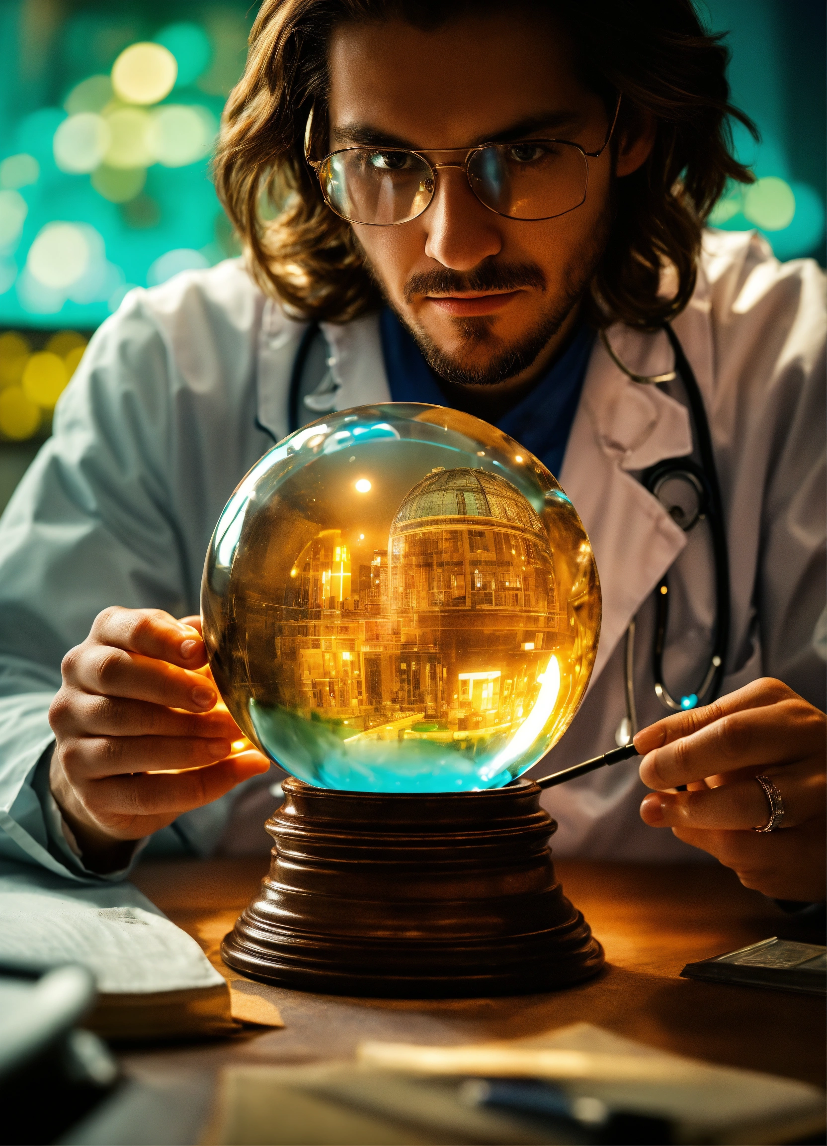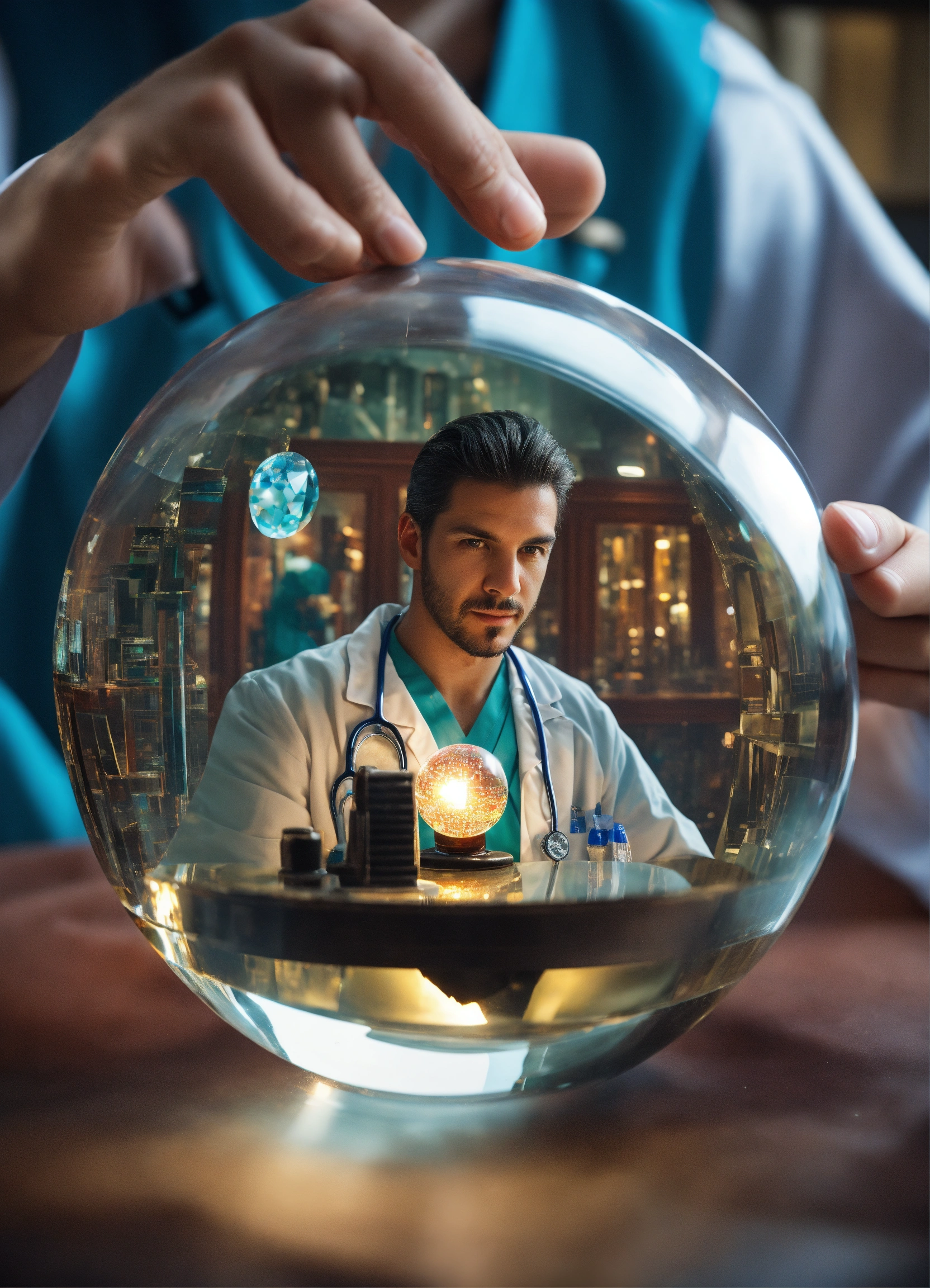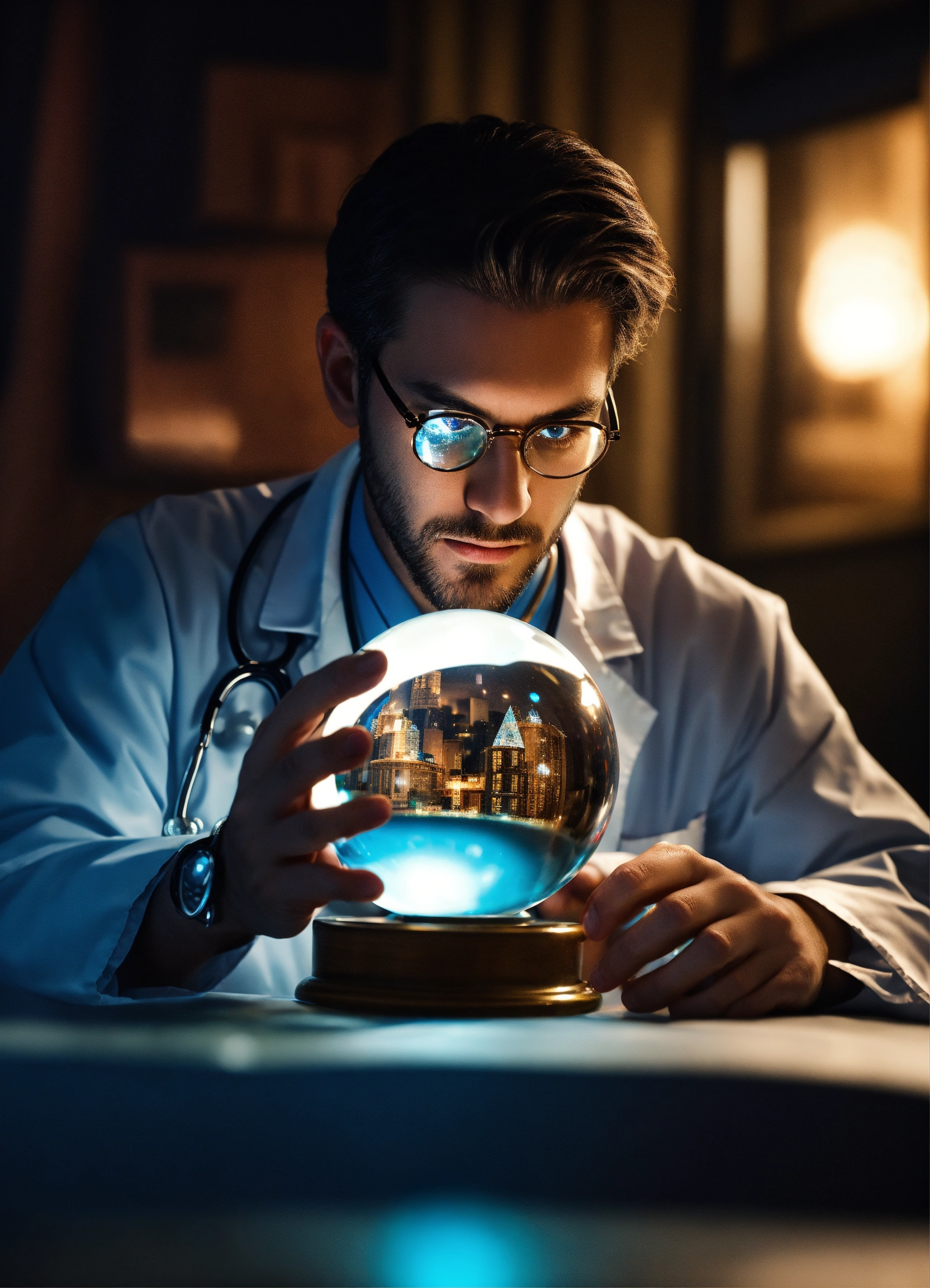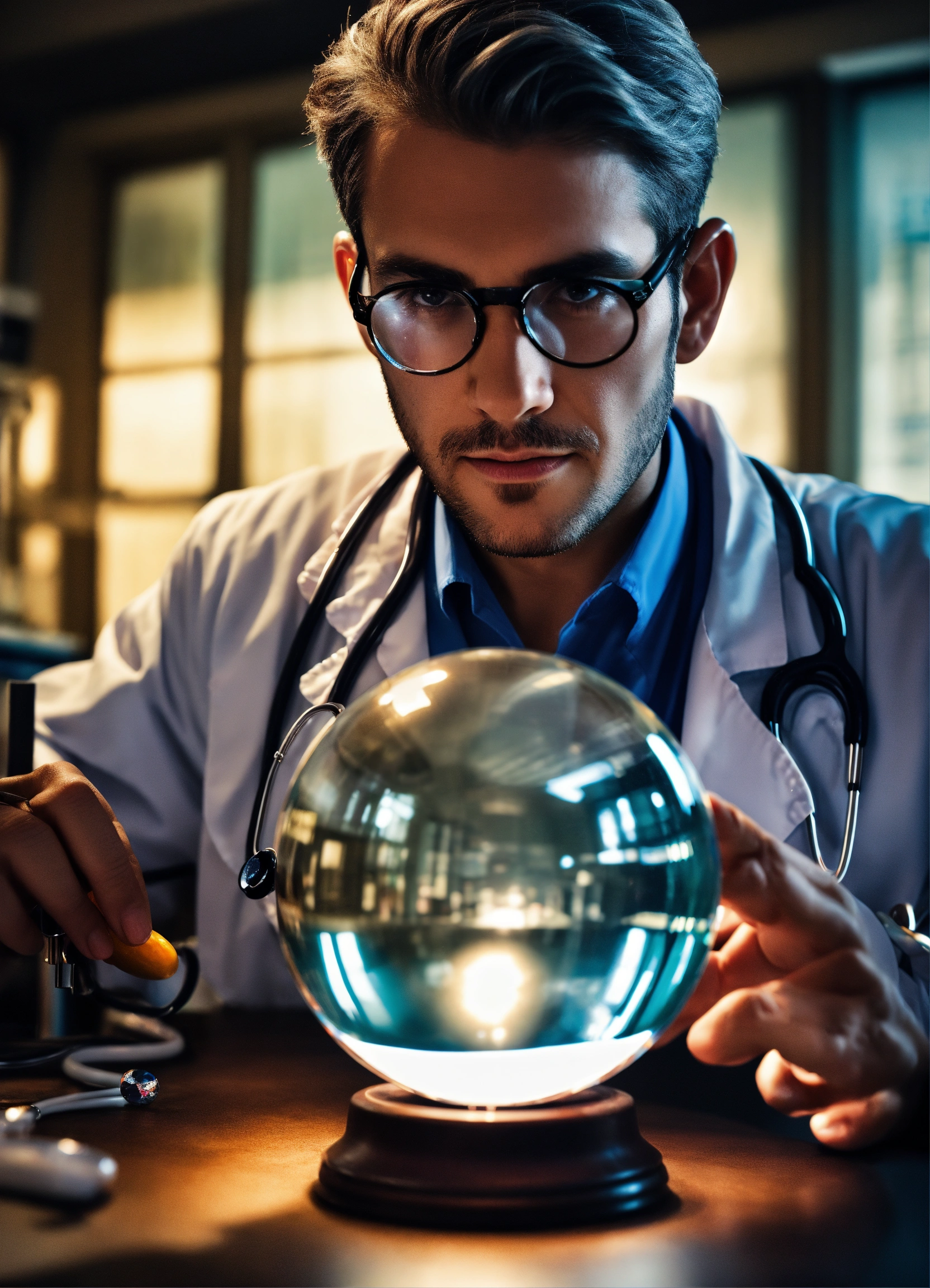 A hyper-realistic photograph of a cool doctor looking through a crystal ball., background color #ff787d
