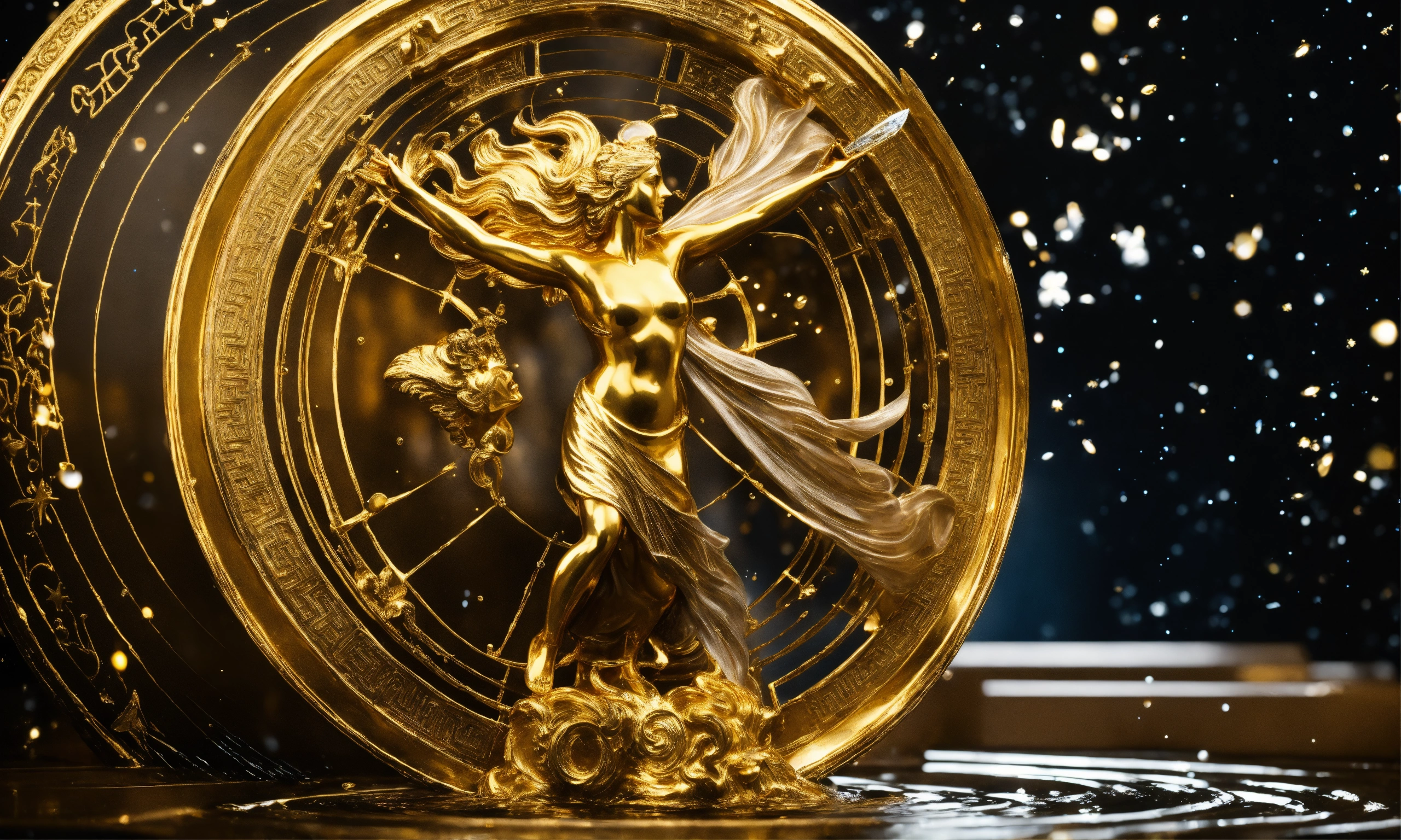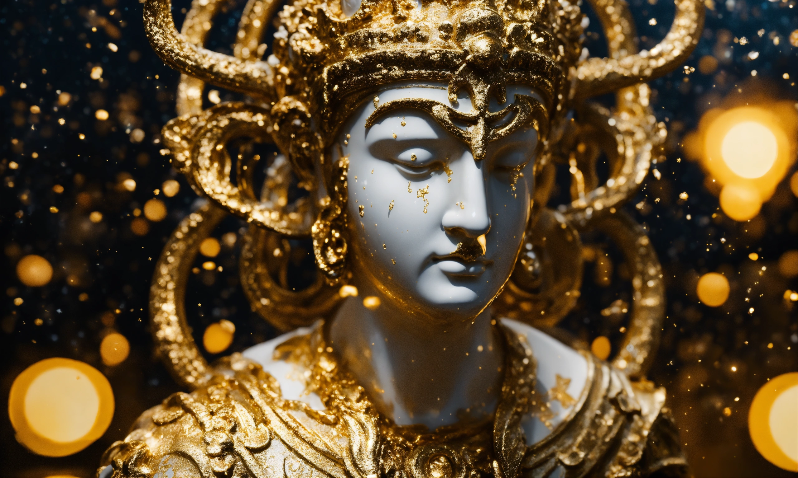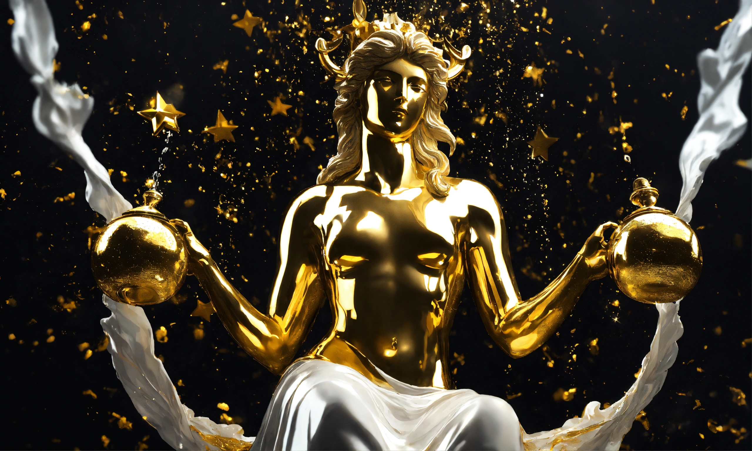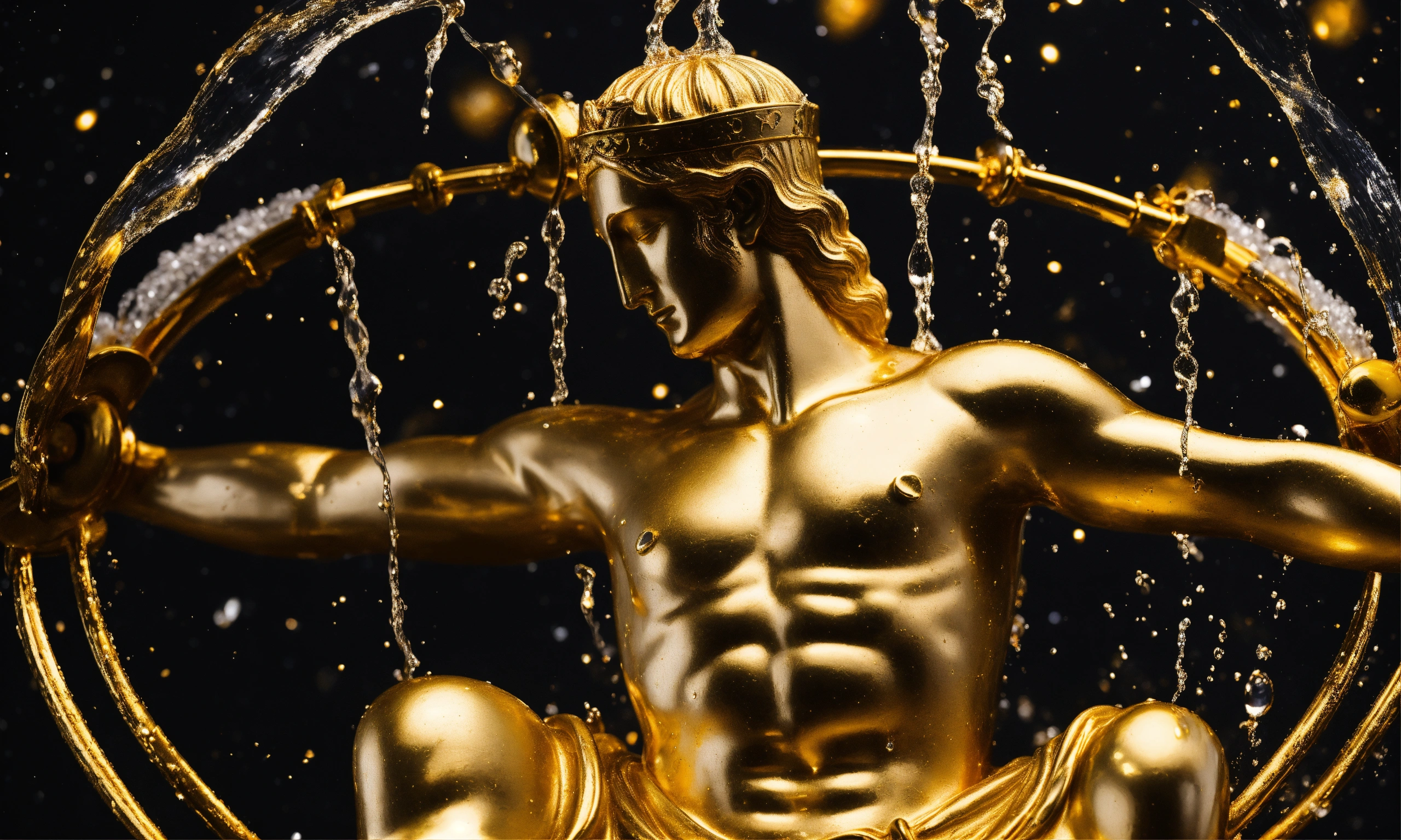 Greek white and gold statue pours water, brutal, zodiac sign, white, gold, universe black background, stars