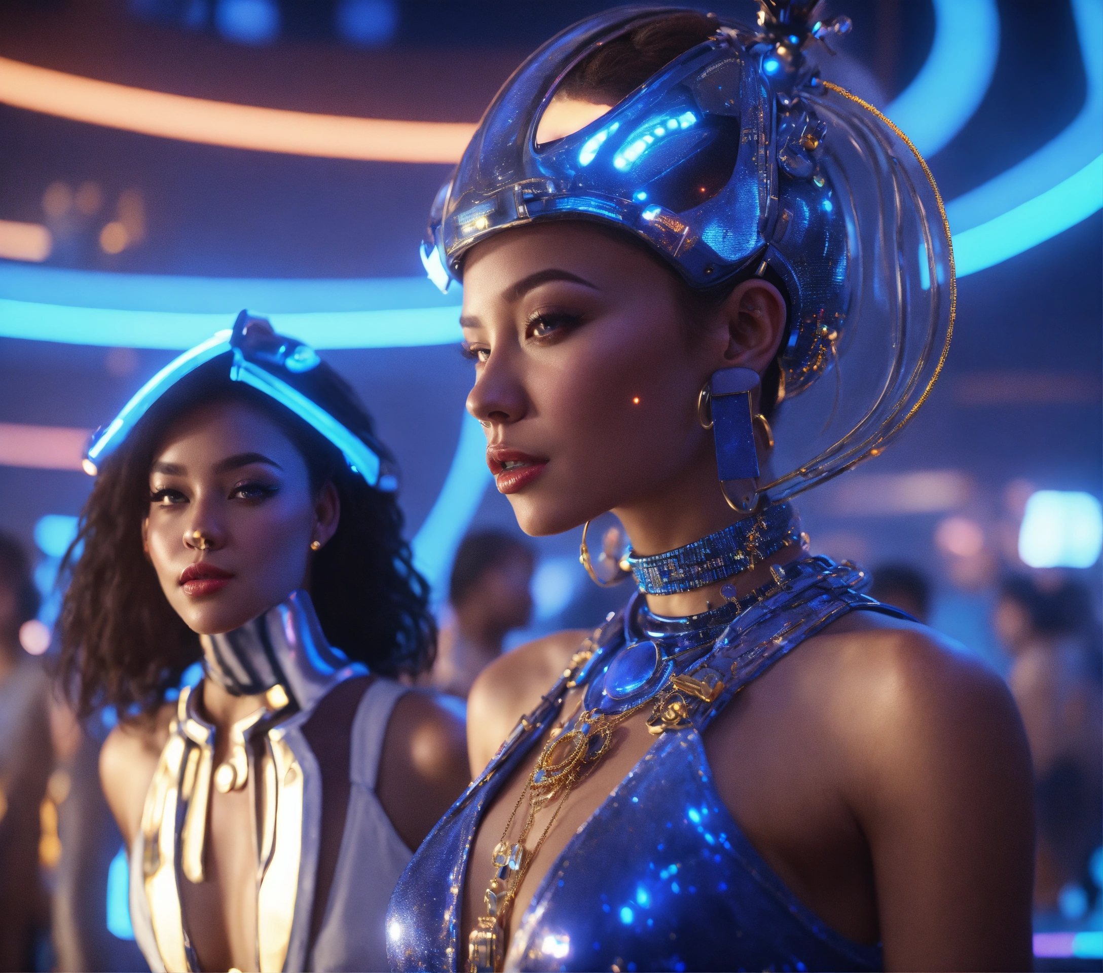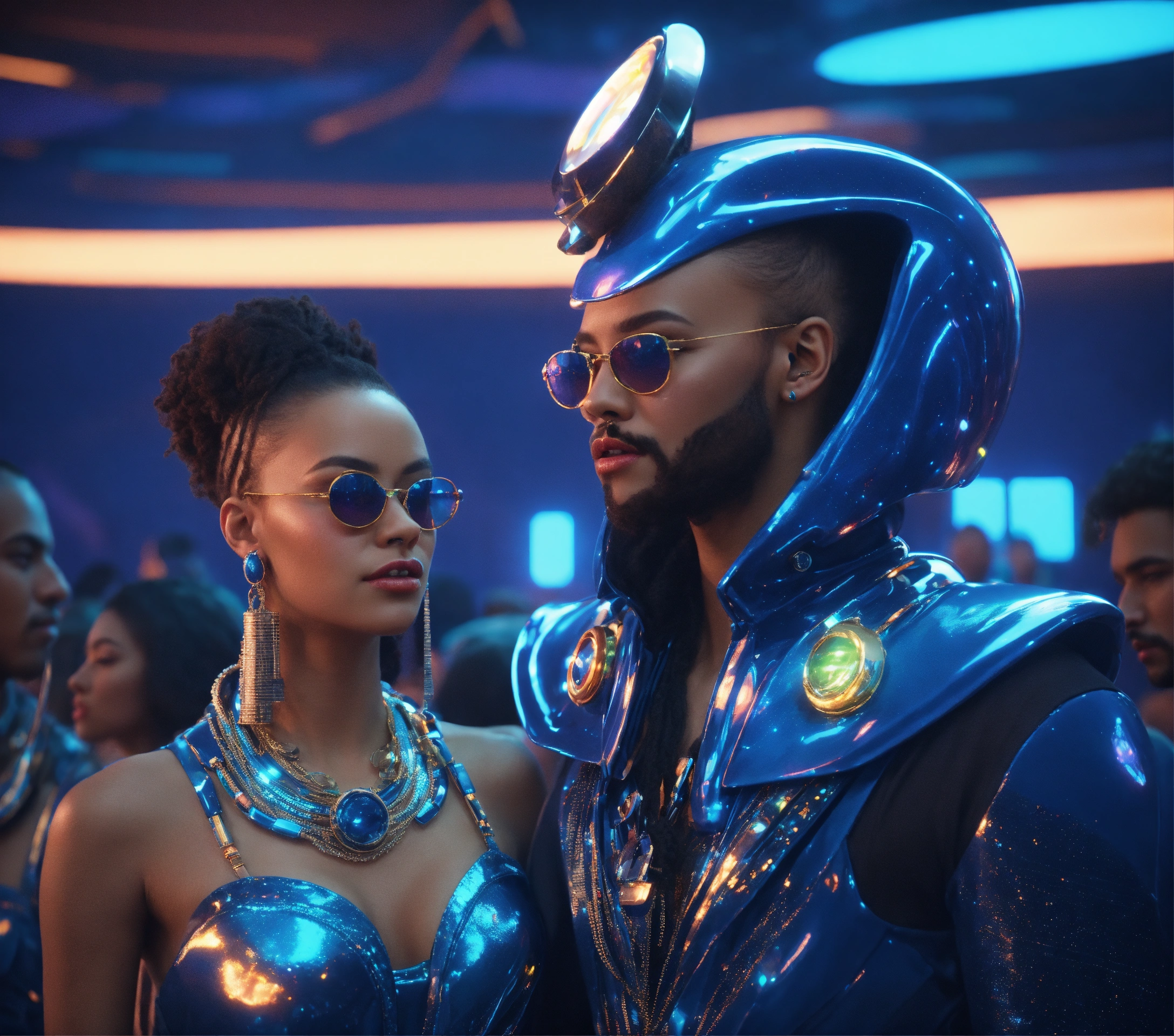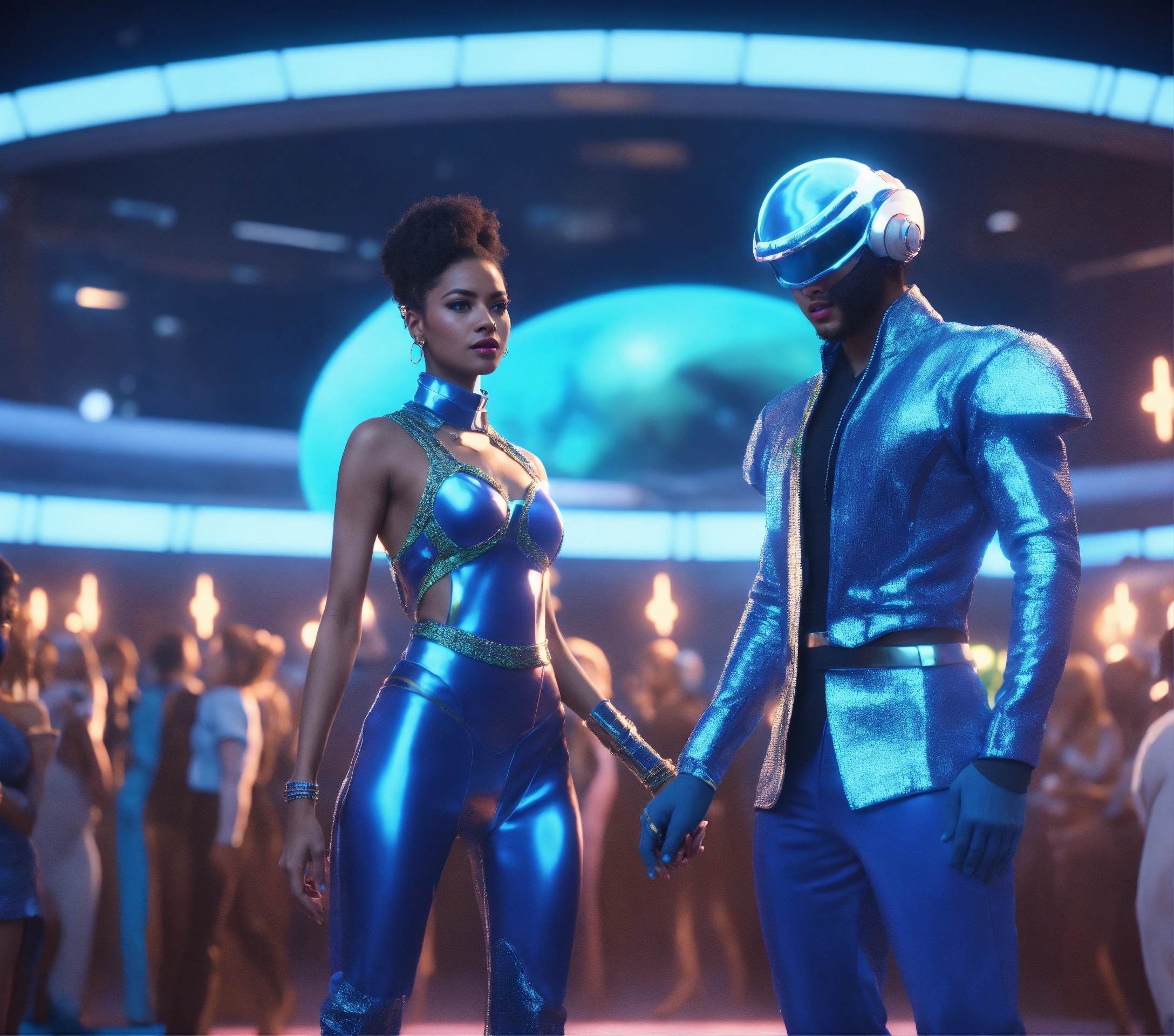 Zoom out from a beautiful blue alien girl and handsome guy wearing space fashion with alot of jewelry with beautiful women in funky futuristic royal attire dance and socialize at a packed jazz concert on a spaceport, realistic, futuristic, sci fi, 8k, unreal engine, pixar