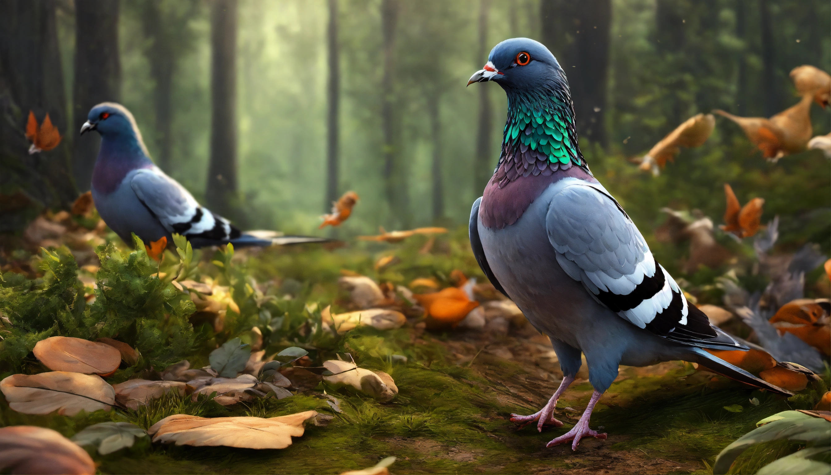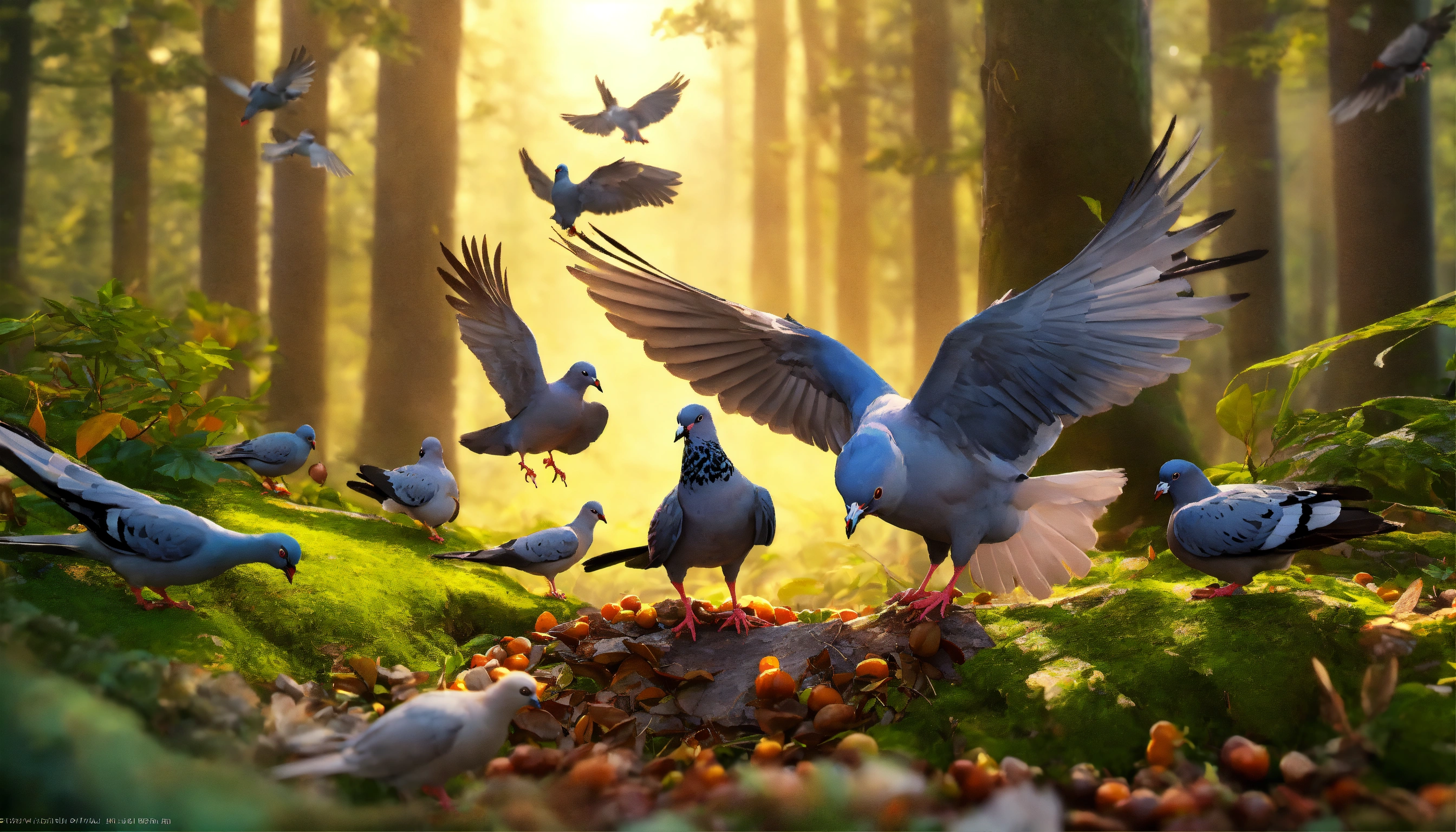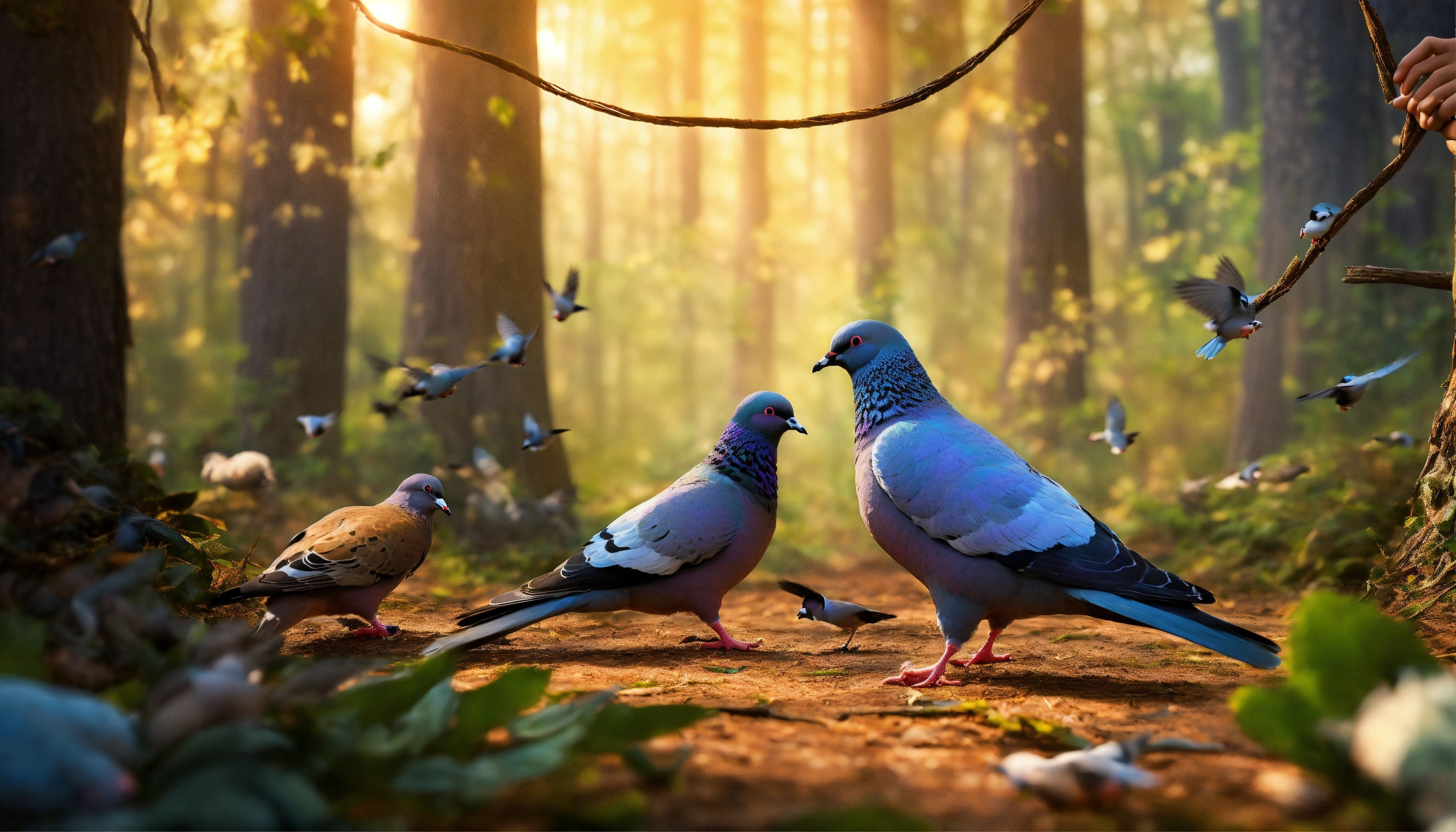 Generate an image of the story of pigeons who caught in the trap of hunter in the forest, 3d pictures, storybook illustration, digital art, professional, high quality, detailed.