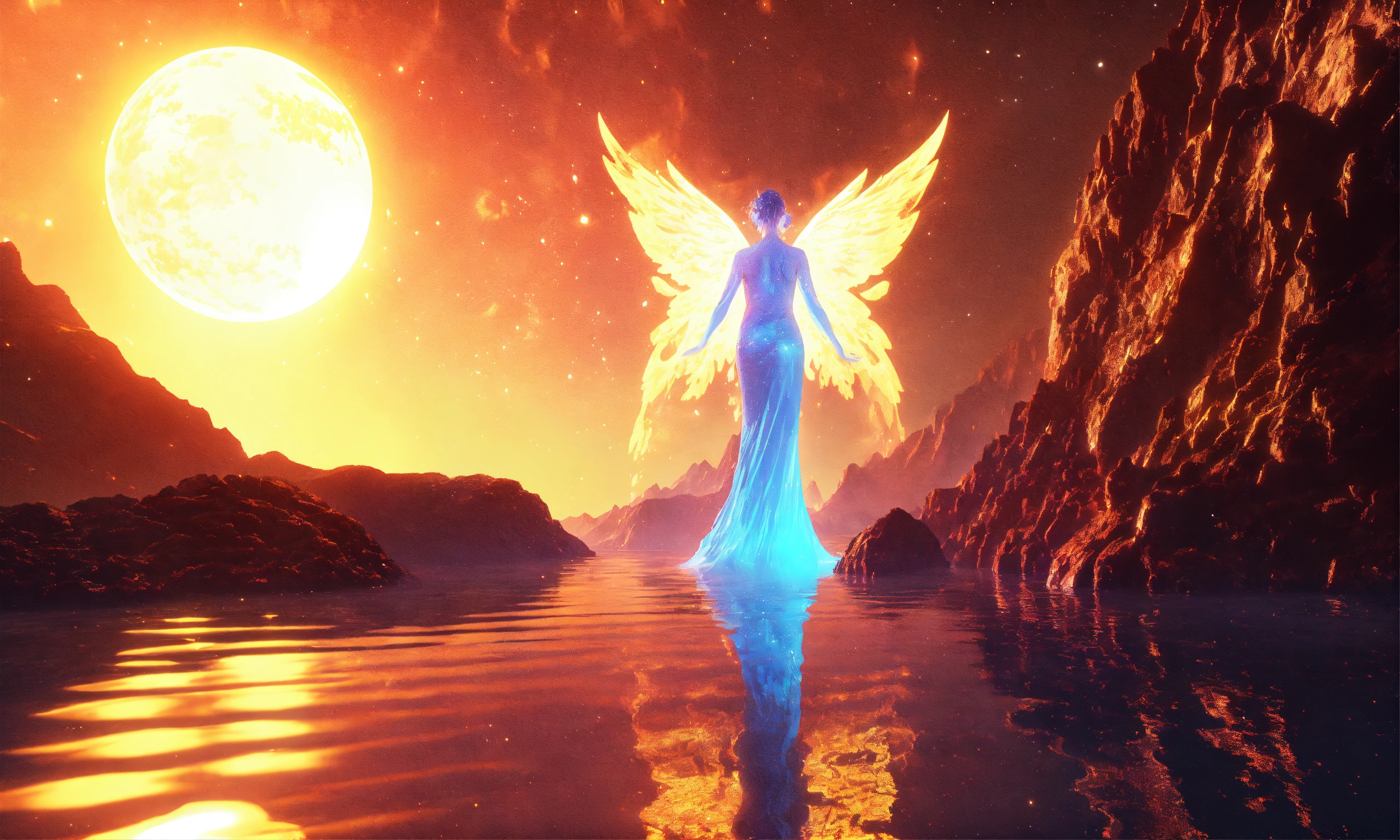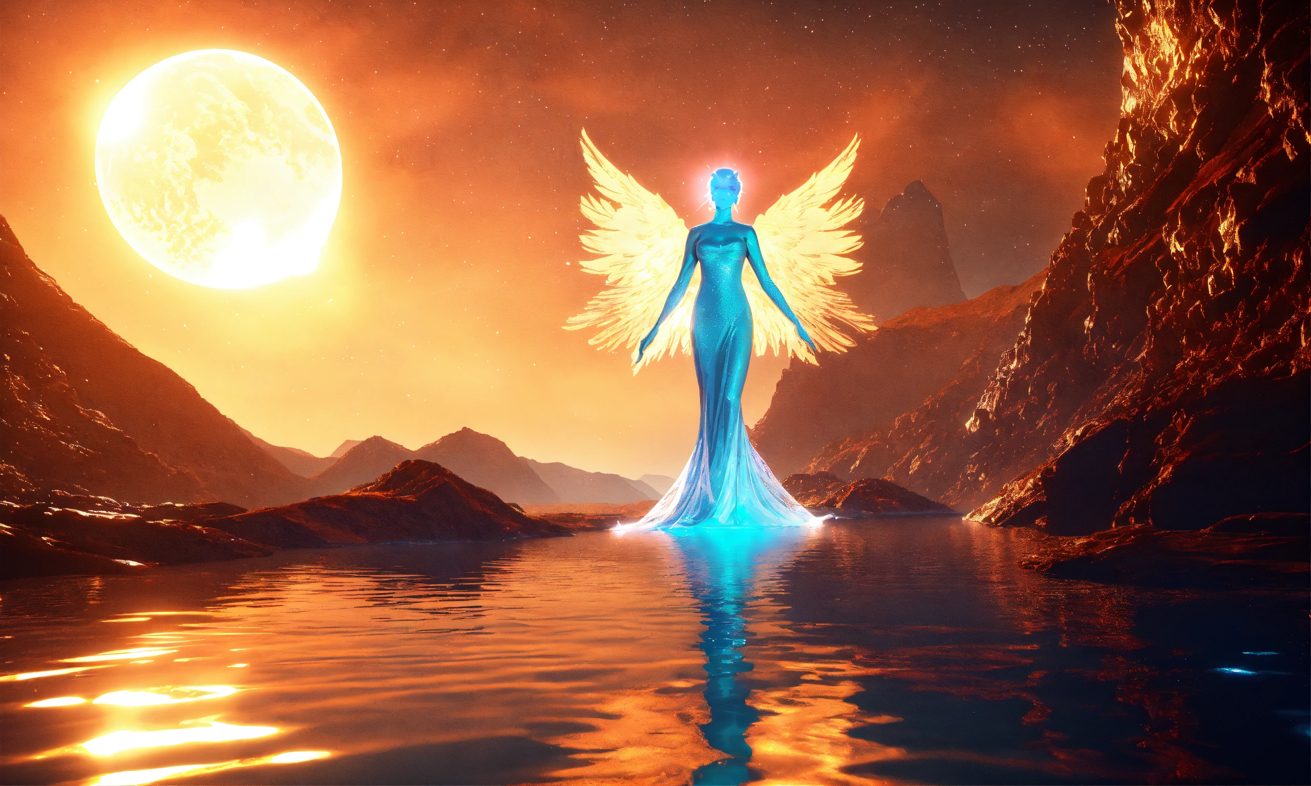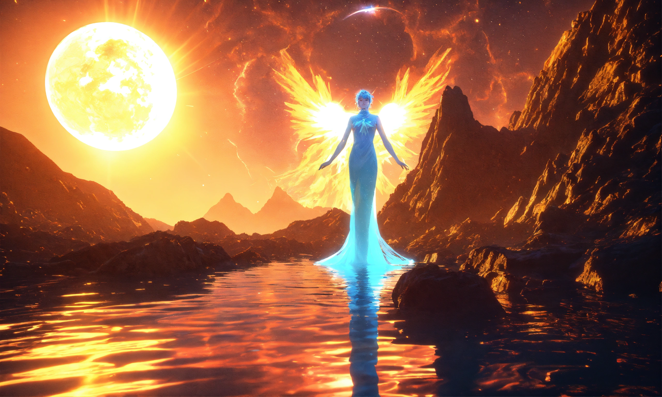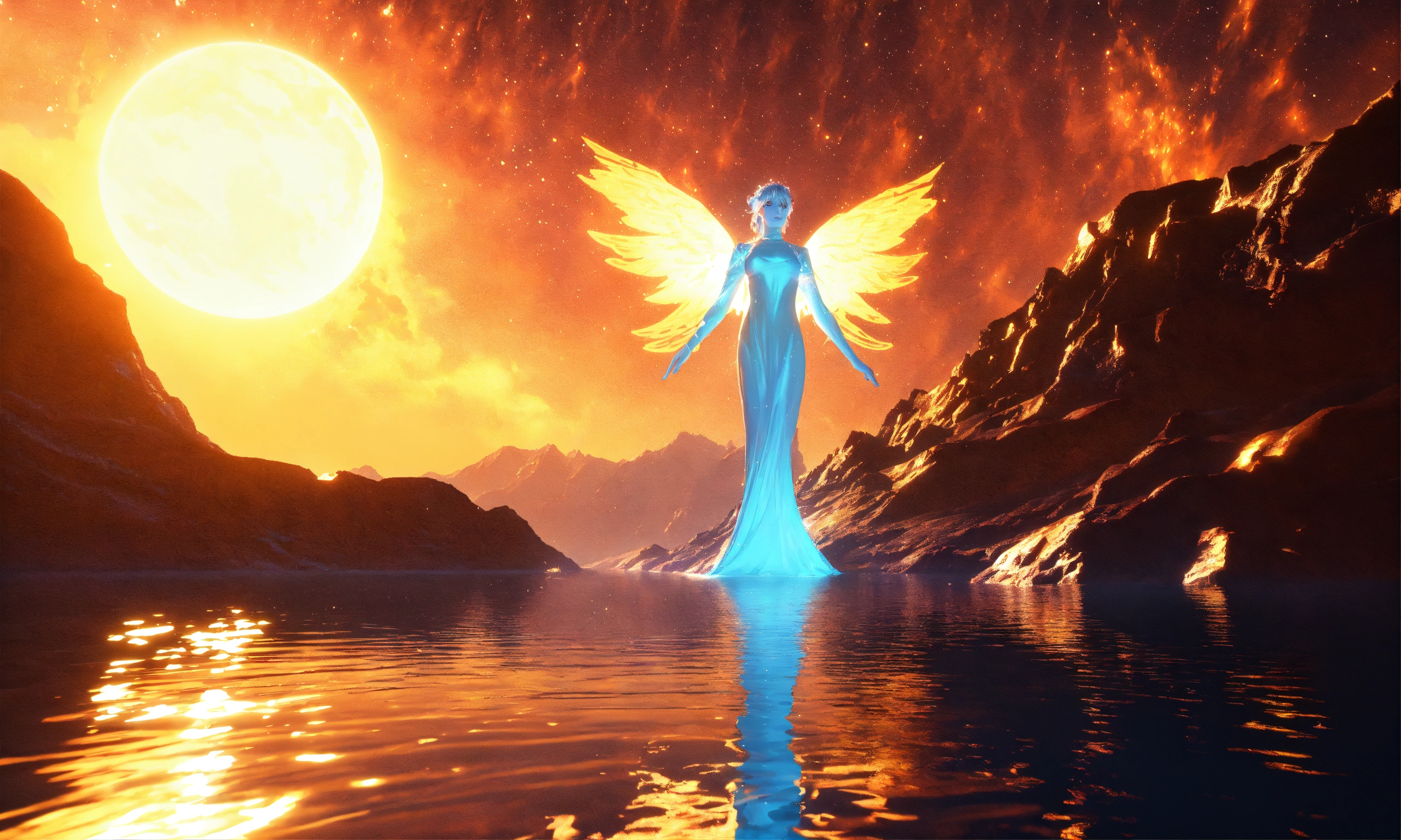 Two ethereal water angel, mountain nebula, sun backgound, cinema 4d scifi 3d scene of a showing, hyper realism, realistic shading, realistic render, detailed textures, photorealistic, wide shot, landscape