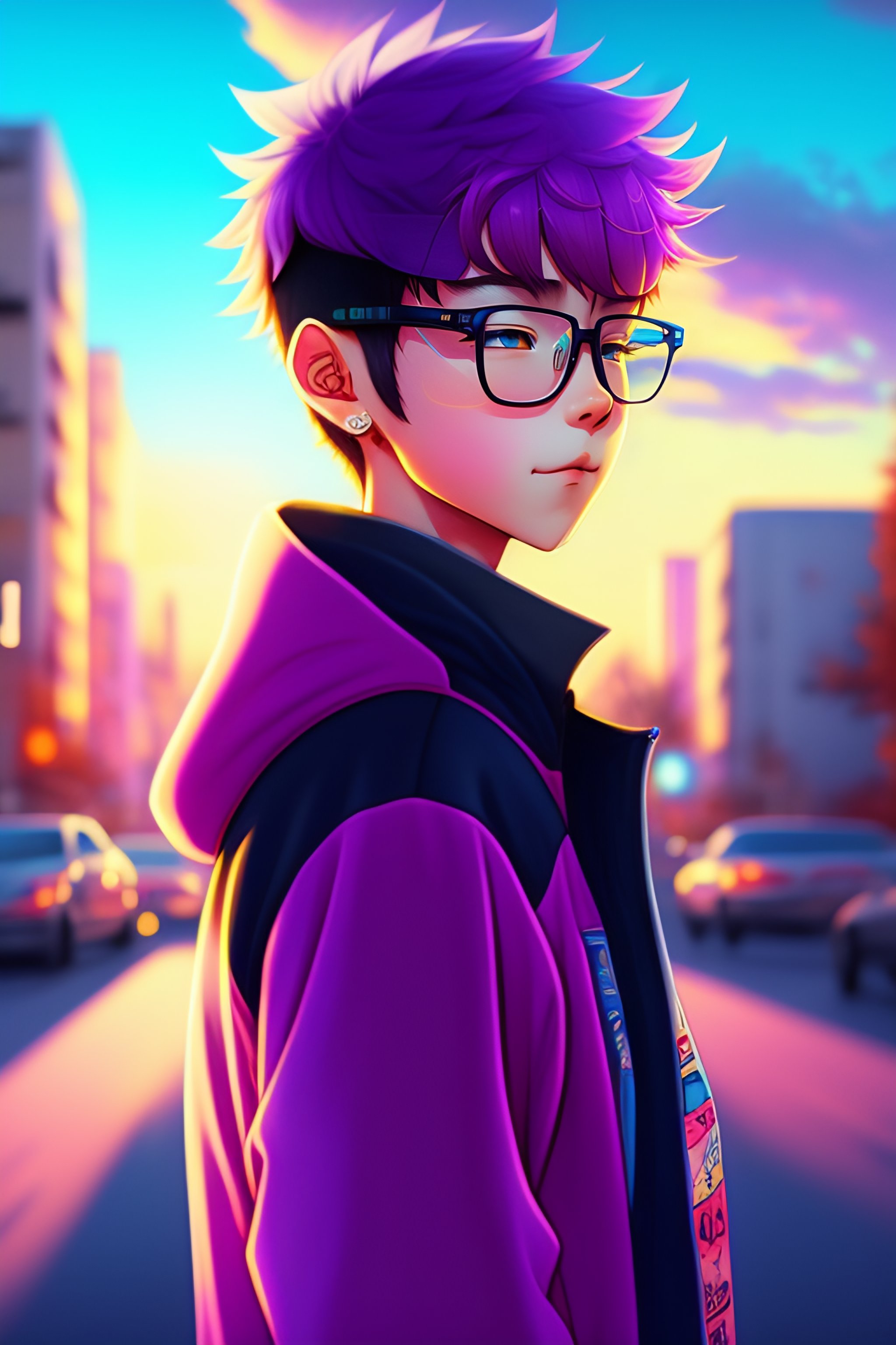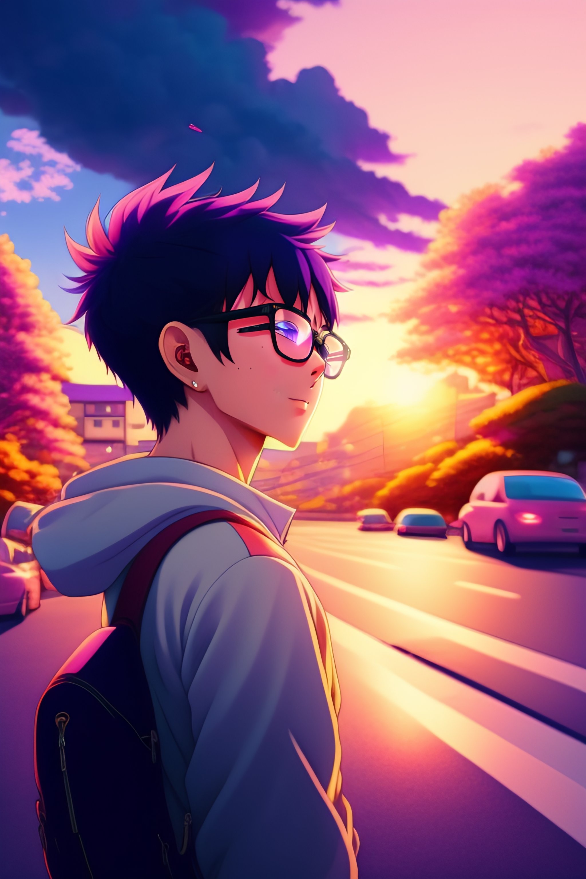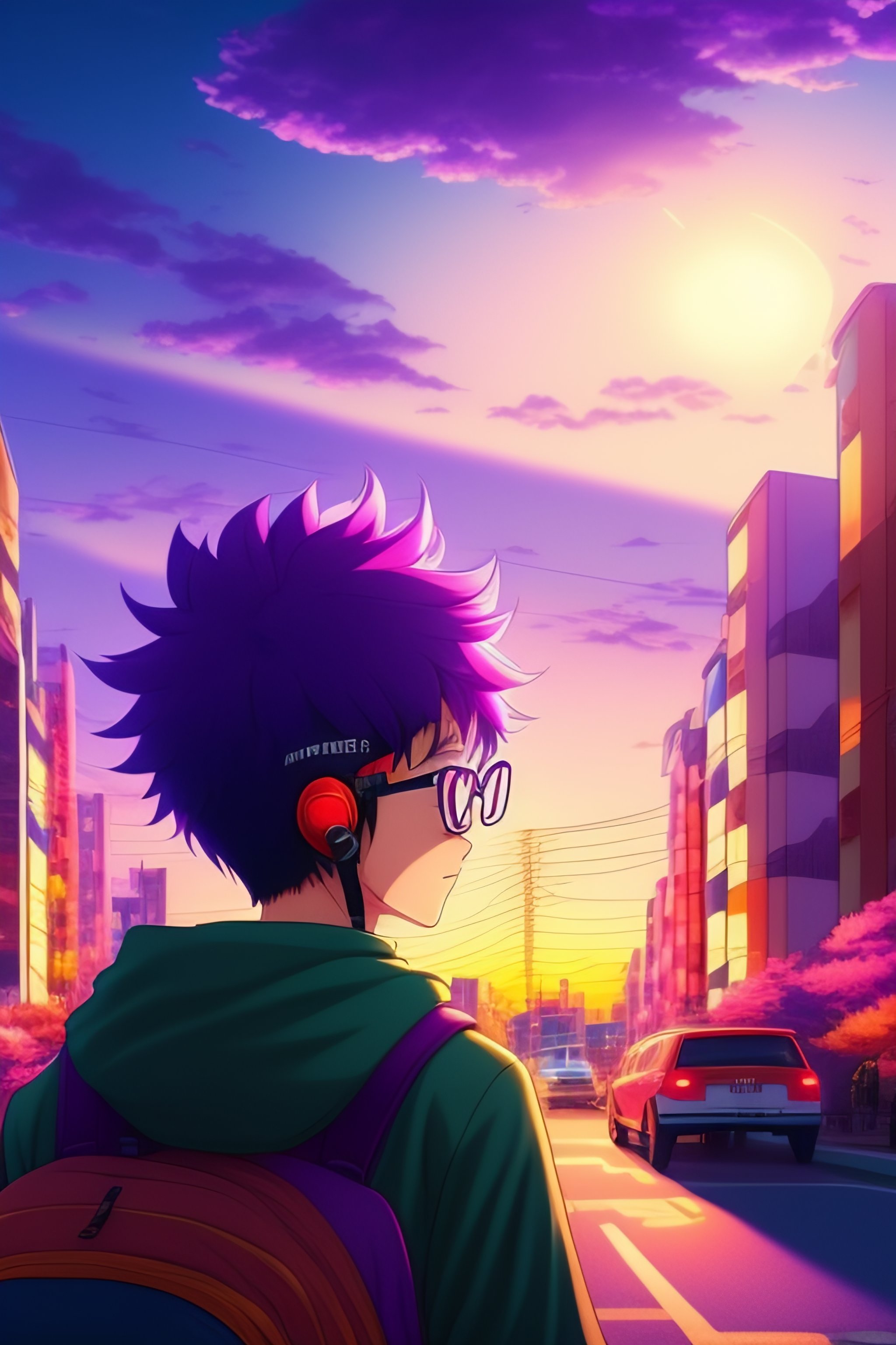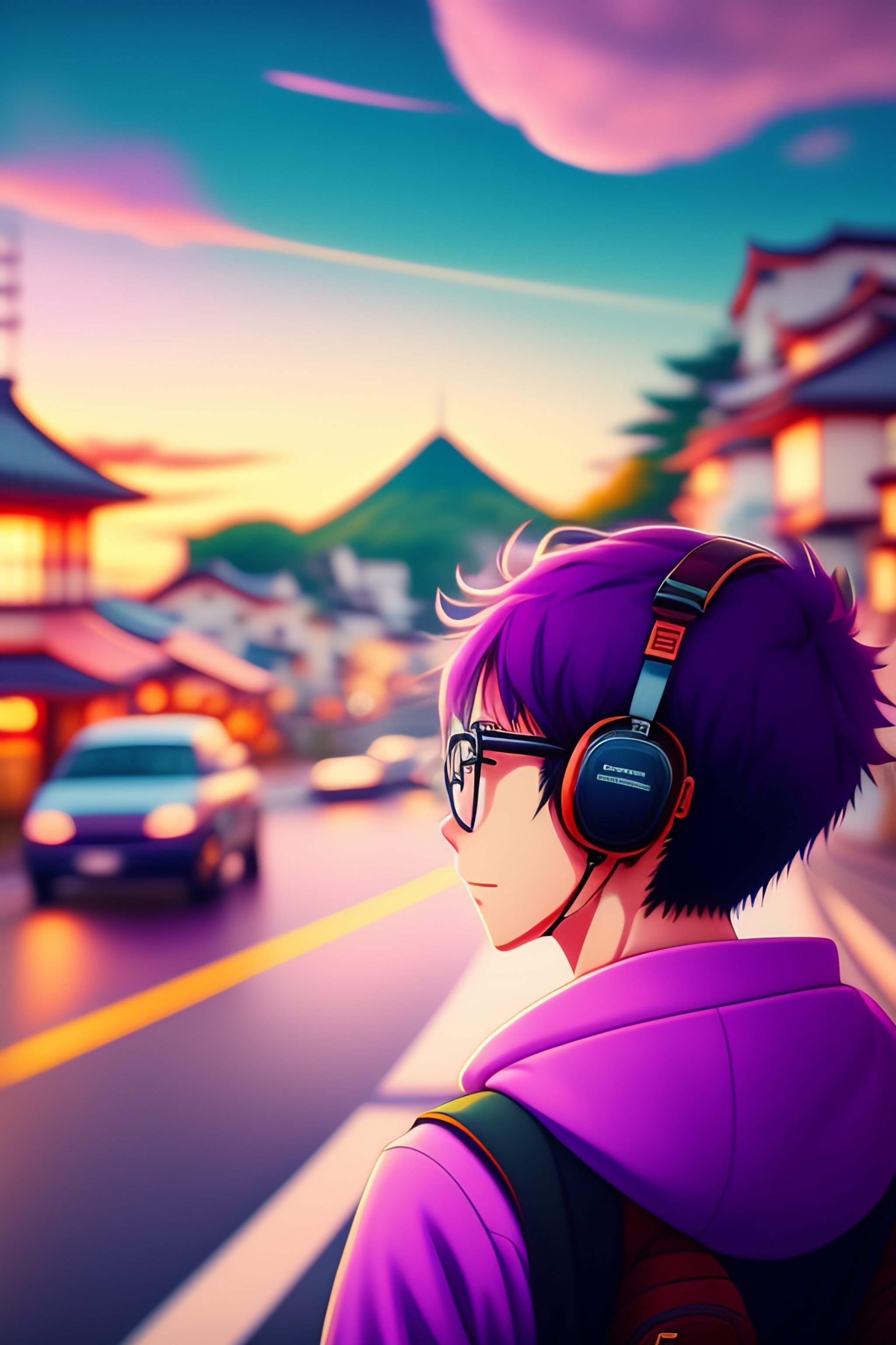Anime boy, glasses, listening to music in cycle in the street of rural japaneses city, wide angle, anime boy, sunset, relaxed, pink and purple cloud, starts, soft light