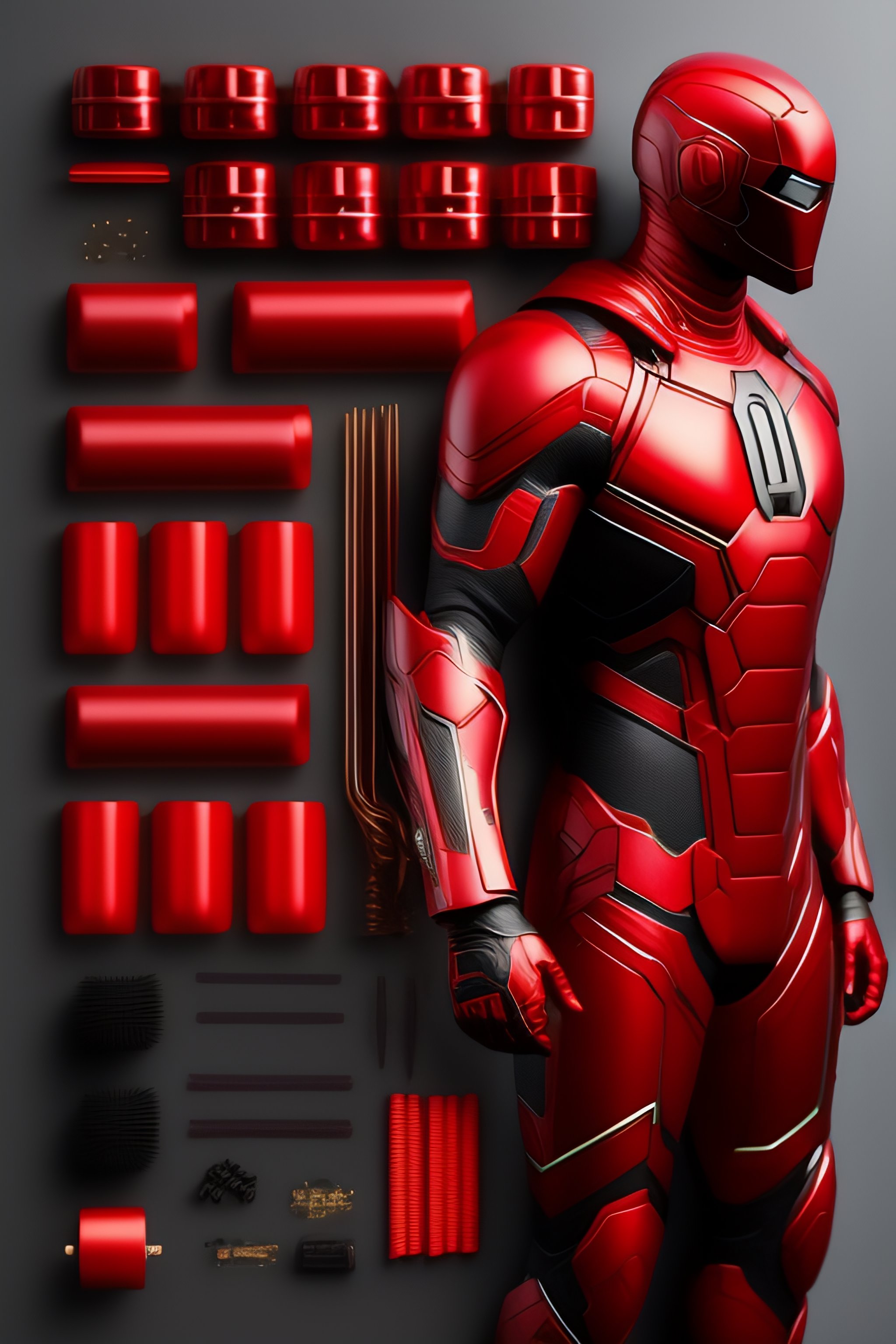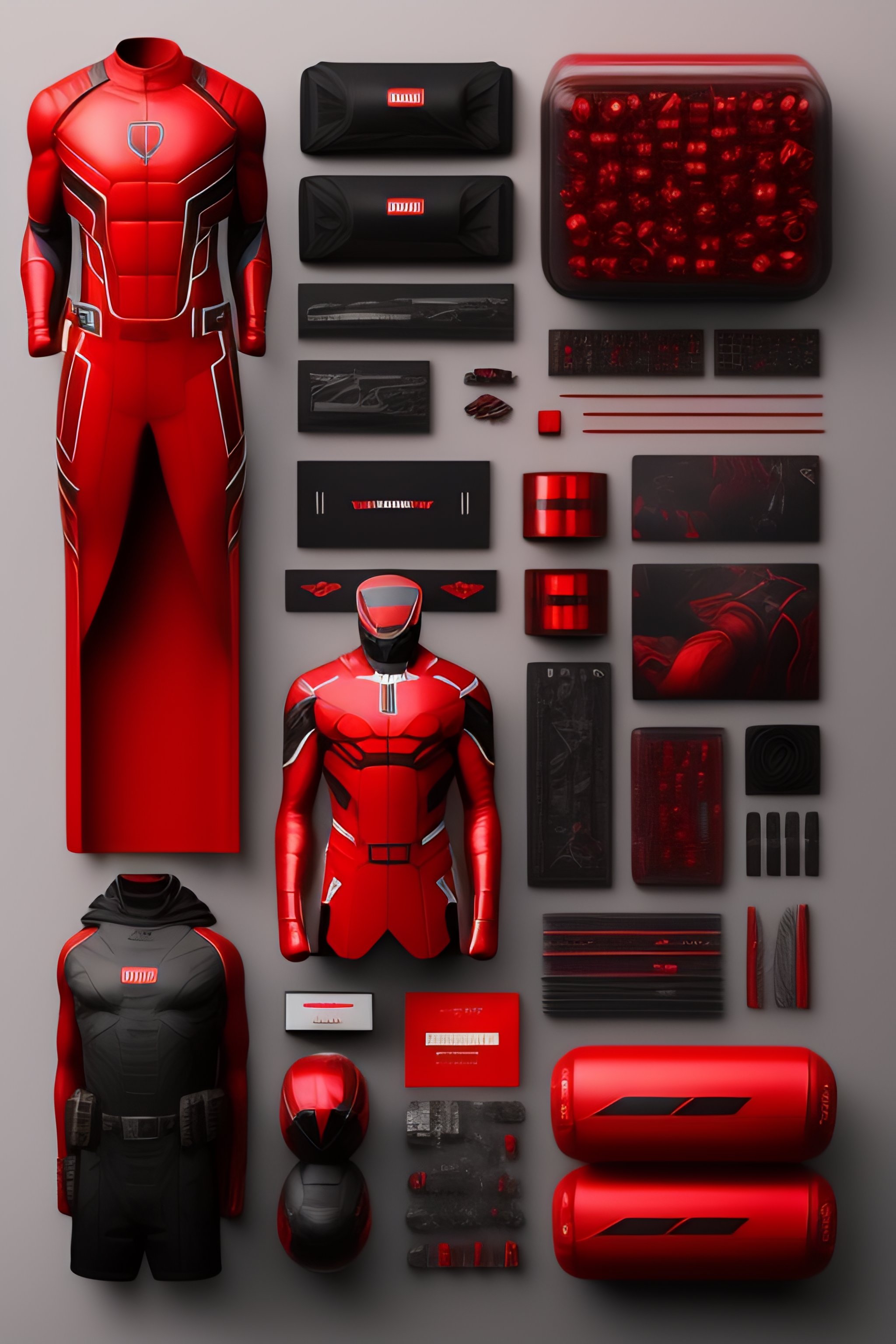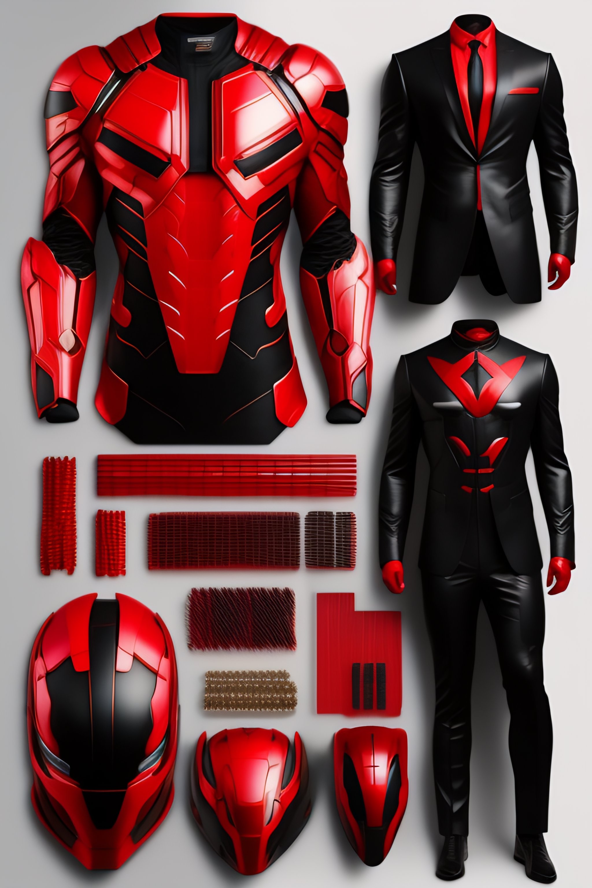 Marvel daredevil red & black suit, costumes and mechanical parts, knolling, knolling layout, deconstruction, highly detailed, depth, many parts, lumen render, 8k
