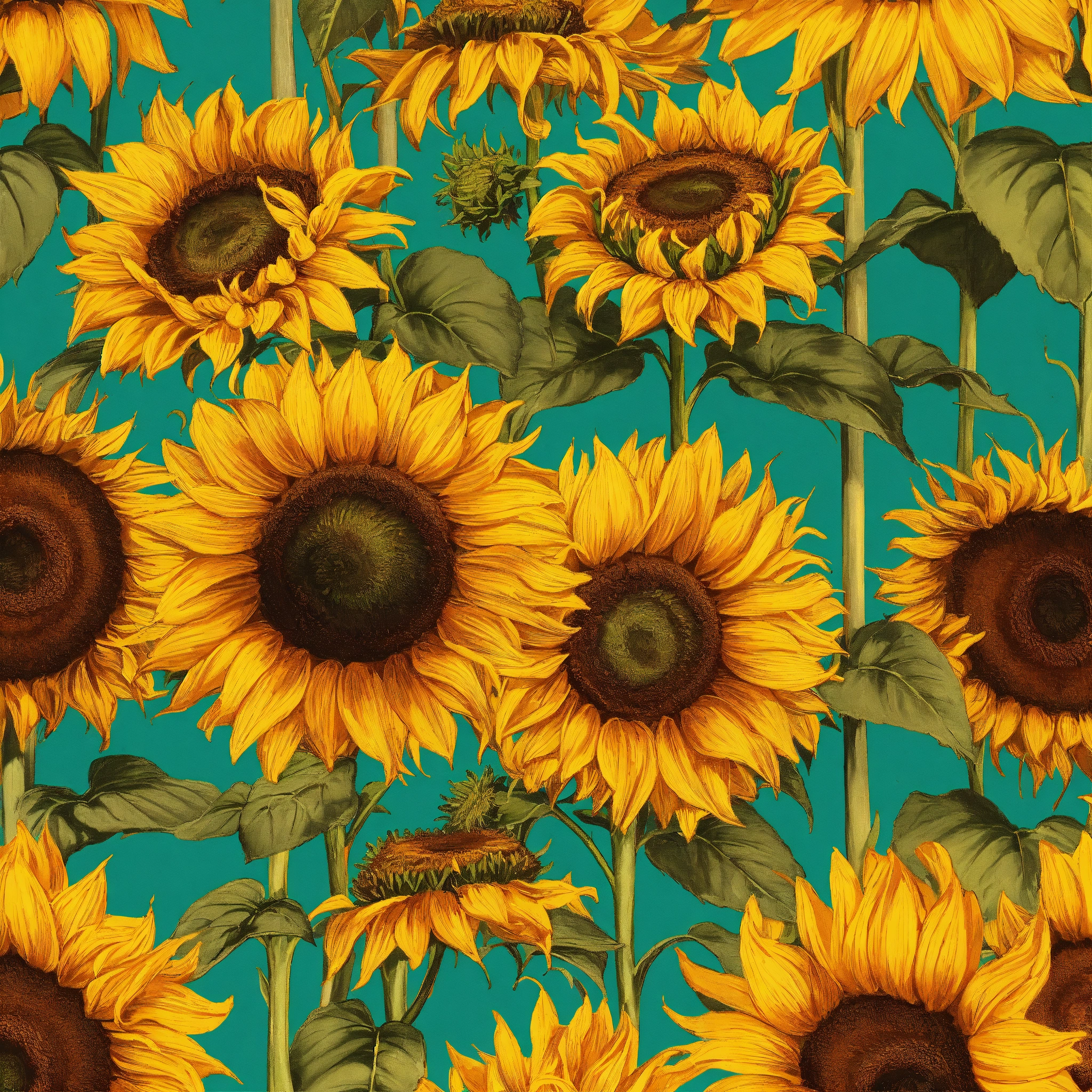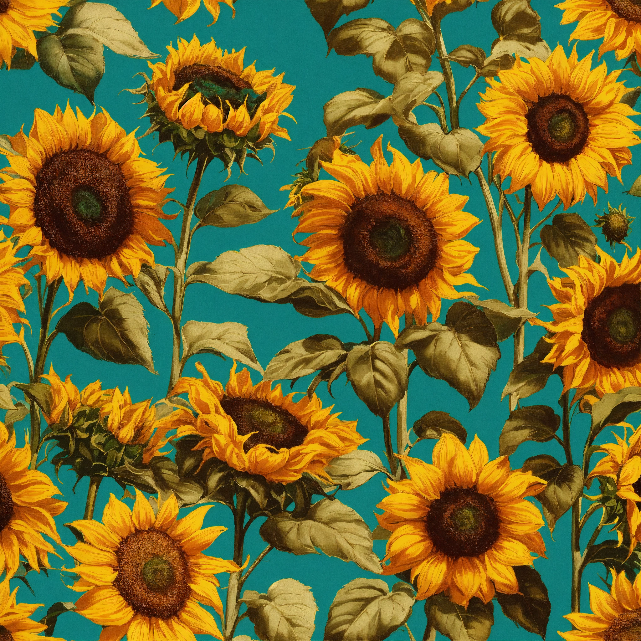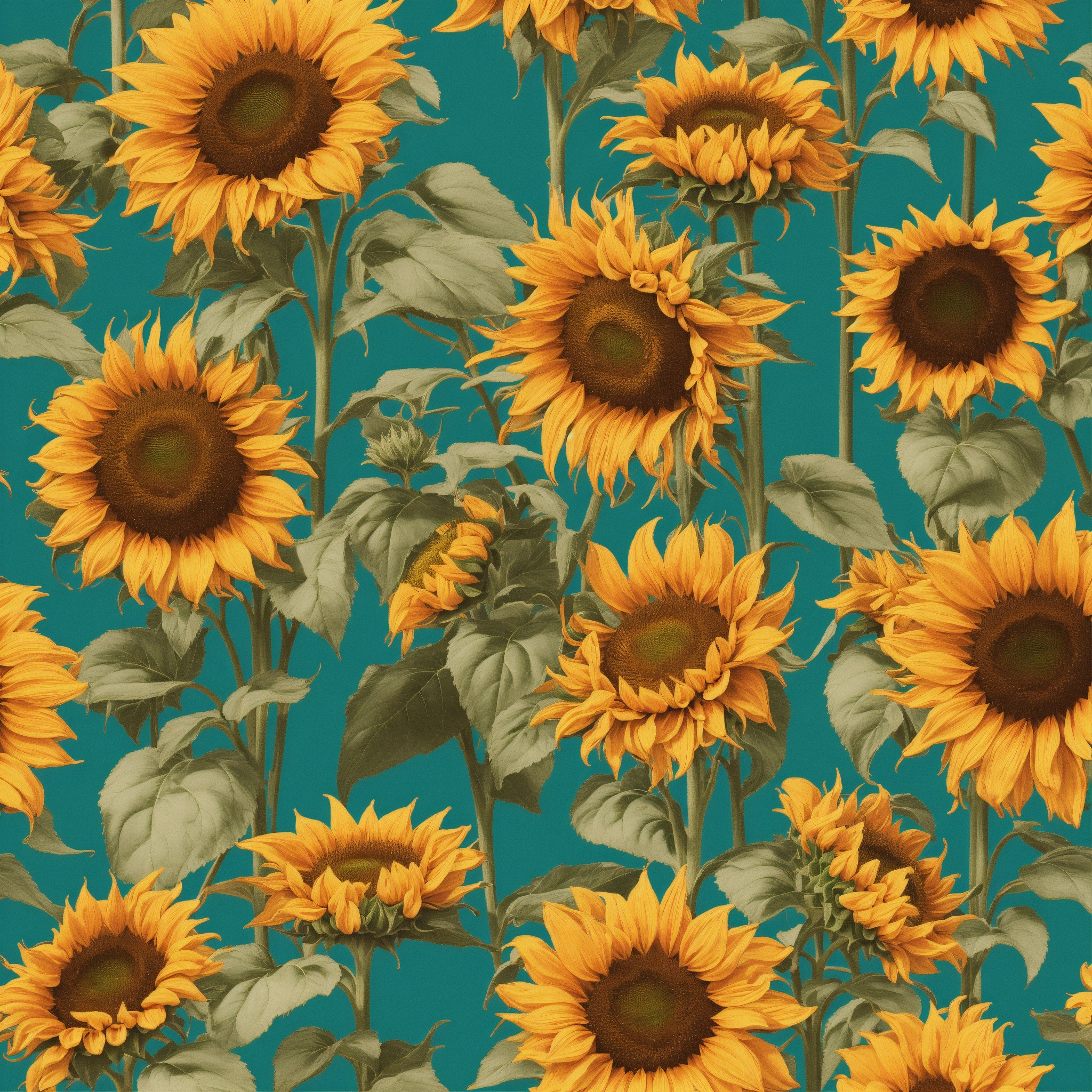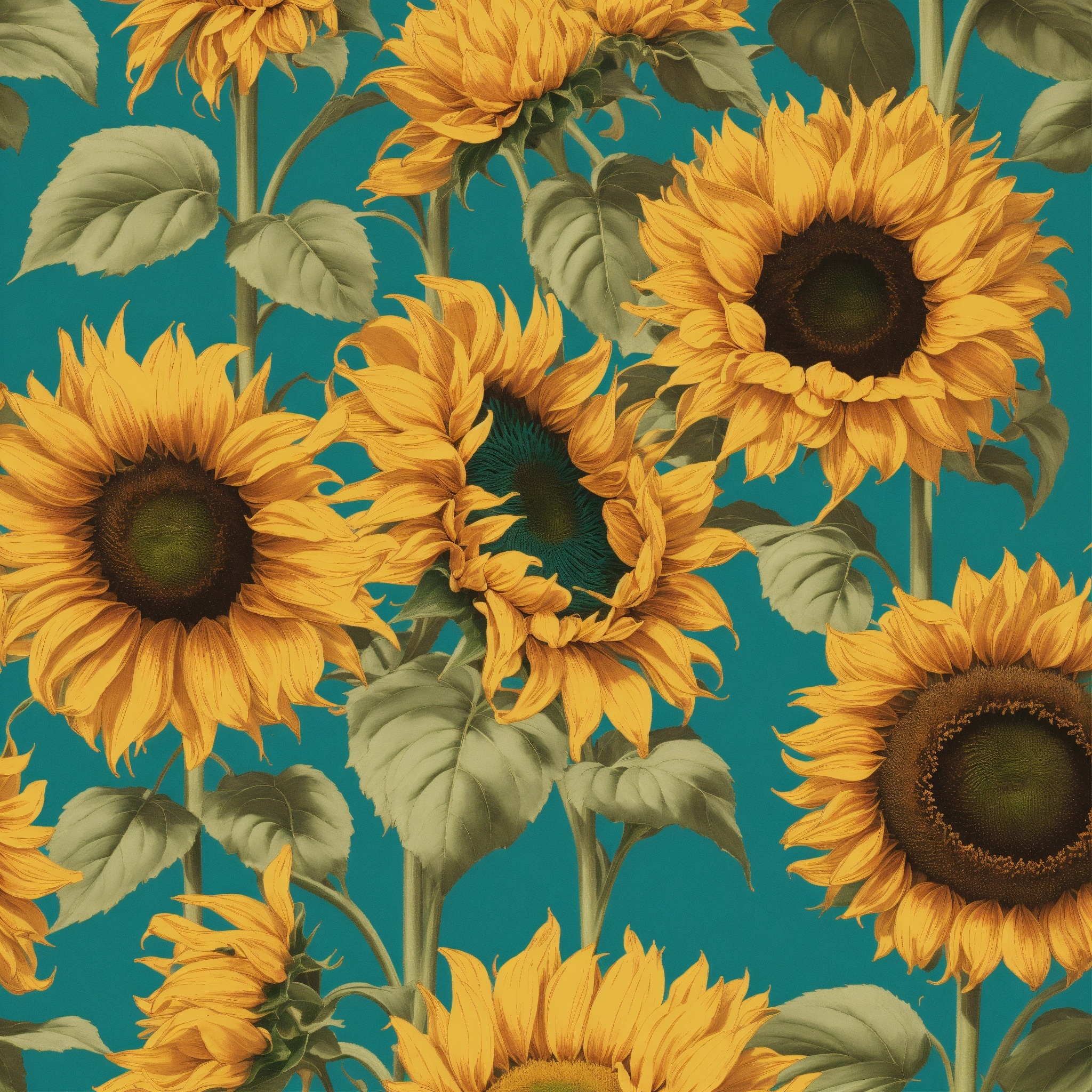 A beautifully crafted vintage repeating design featuring a collection of vibrant sunflowers gracefully depicted on a mesmerizing teal backdrop