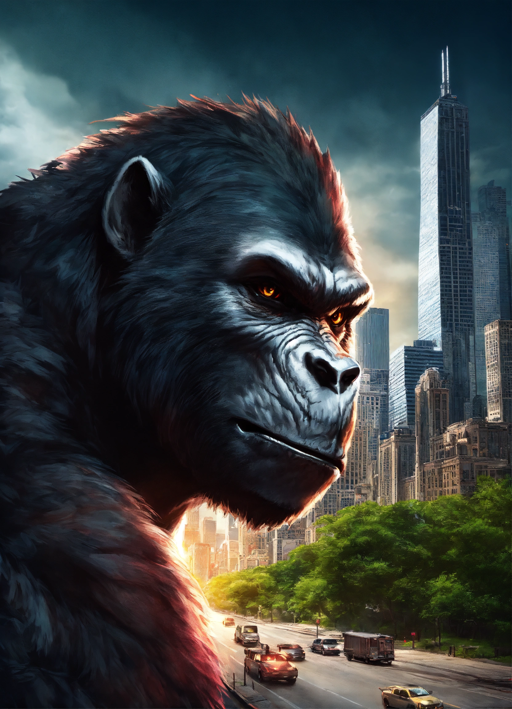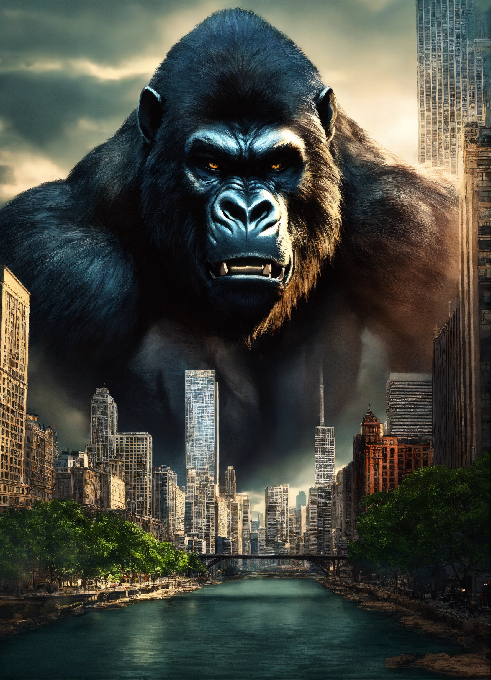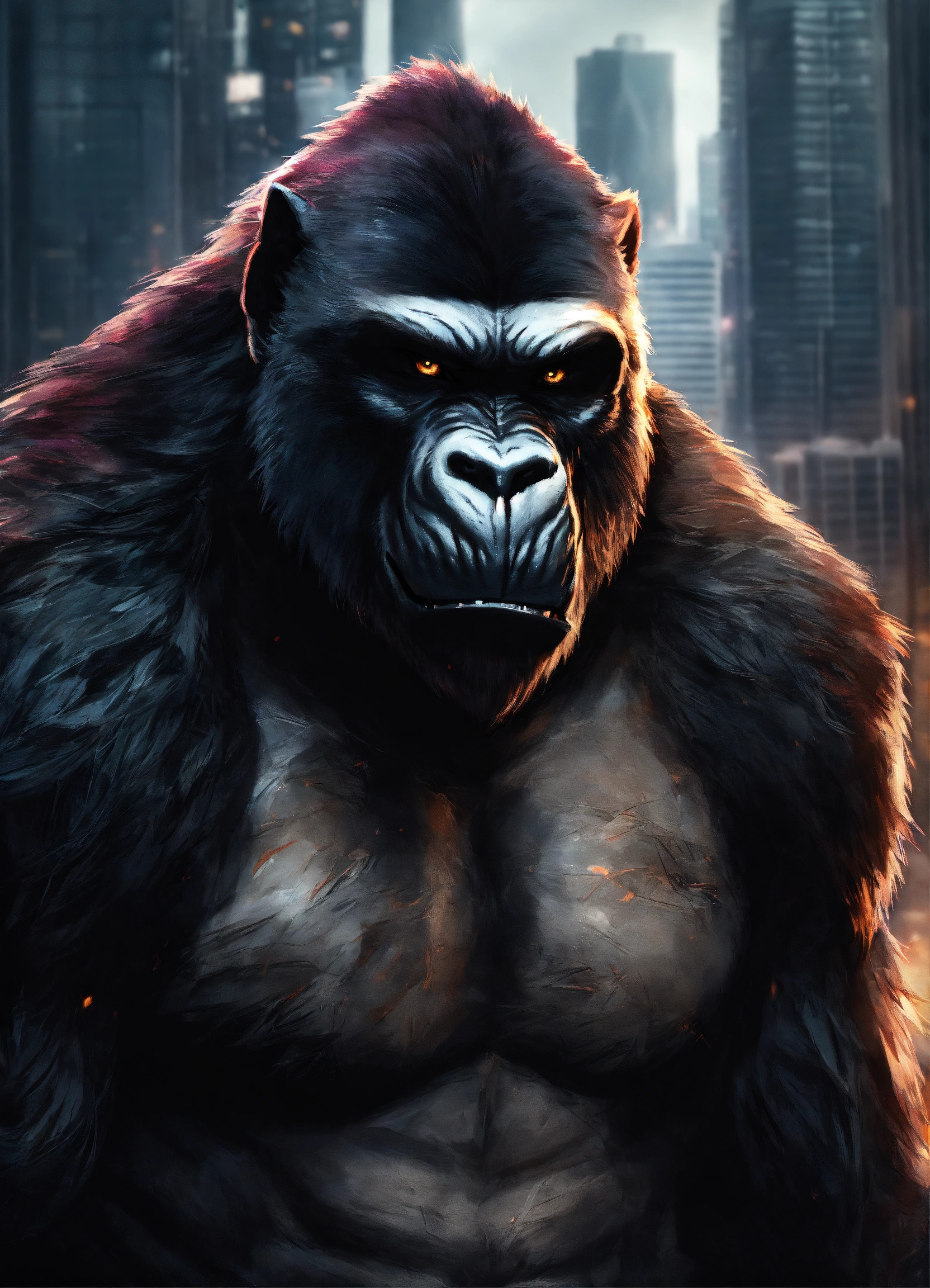 Half werewolf half gorilla hybrid face give a lot of detail in the face of the wolf, with an jungle and urban city chicago background