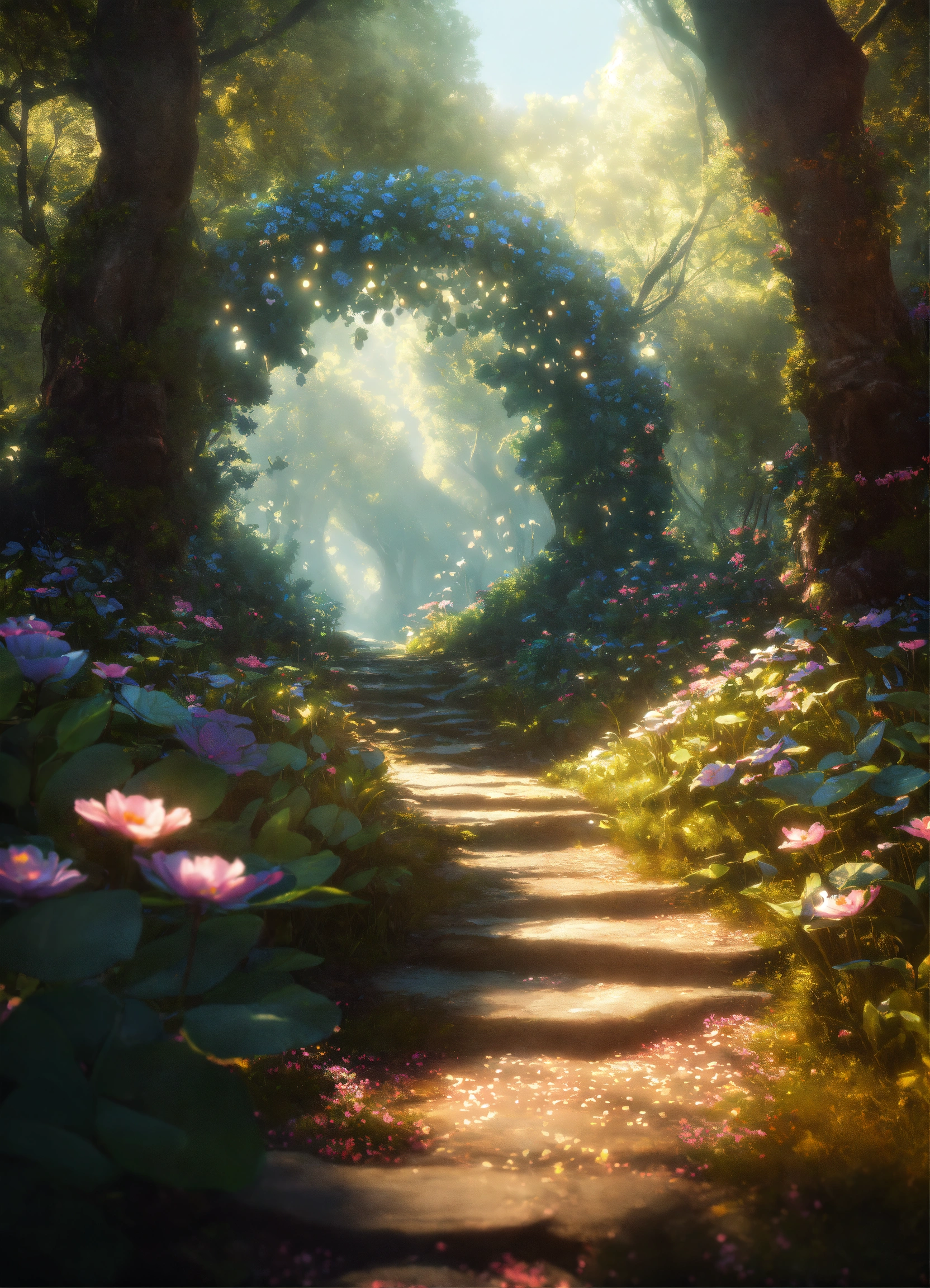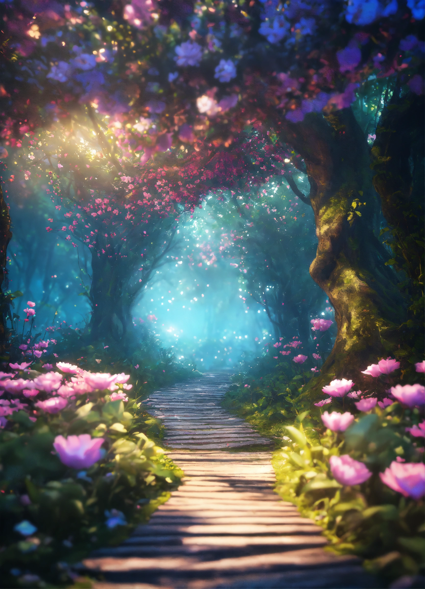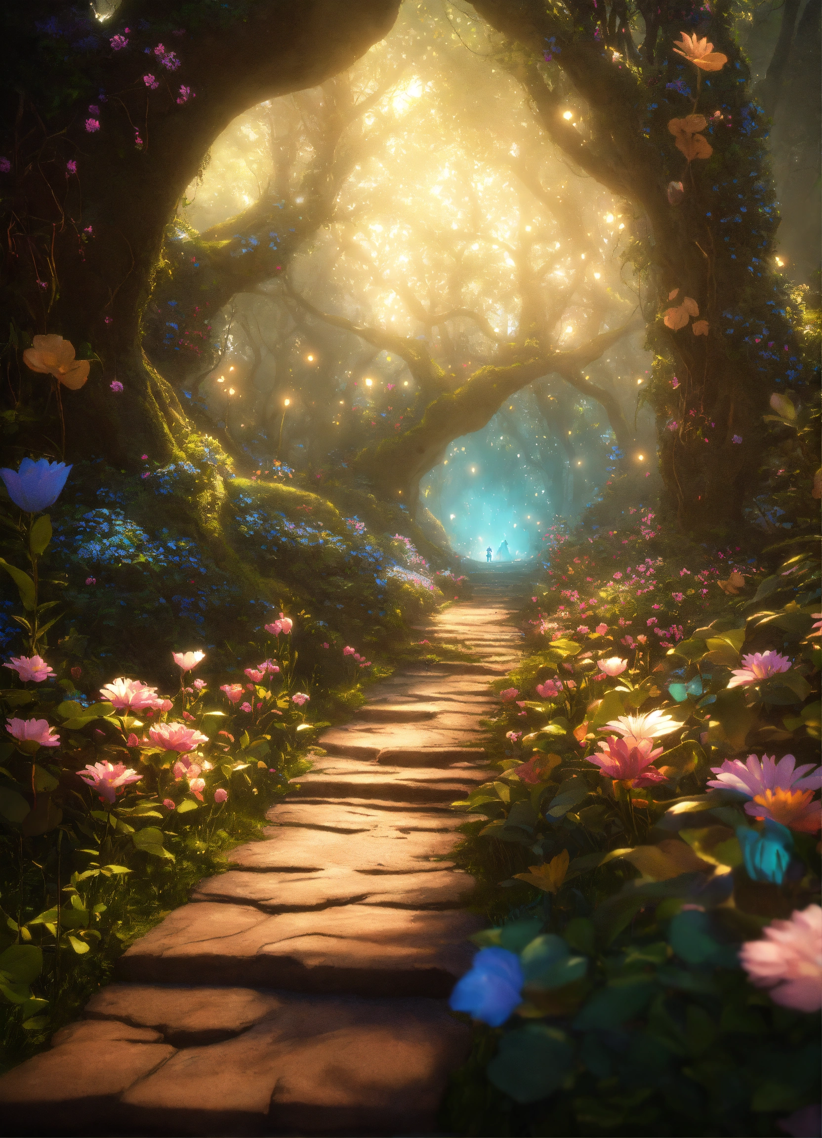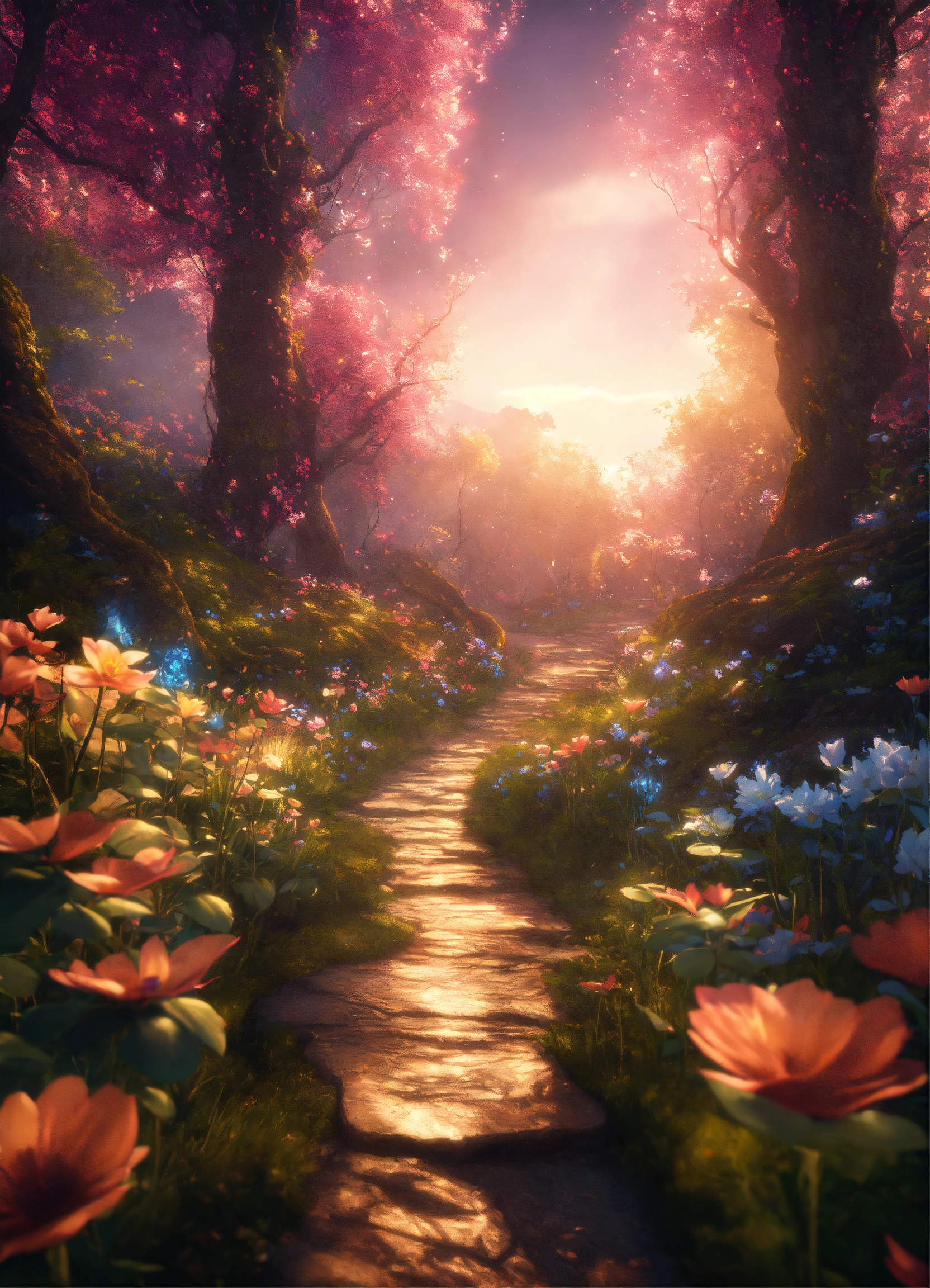 A path through enchanted woods with gigantic enchanted flowers, surreal, intricate details, epic scene, beautiful enchanted lighting, fairytale, magical, unreal engine