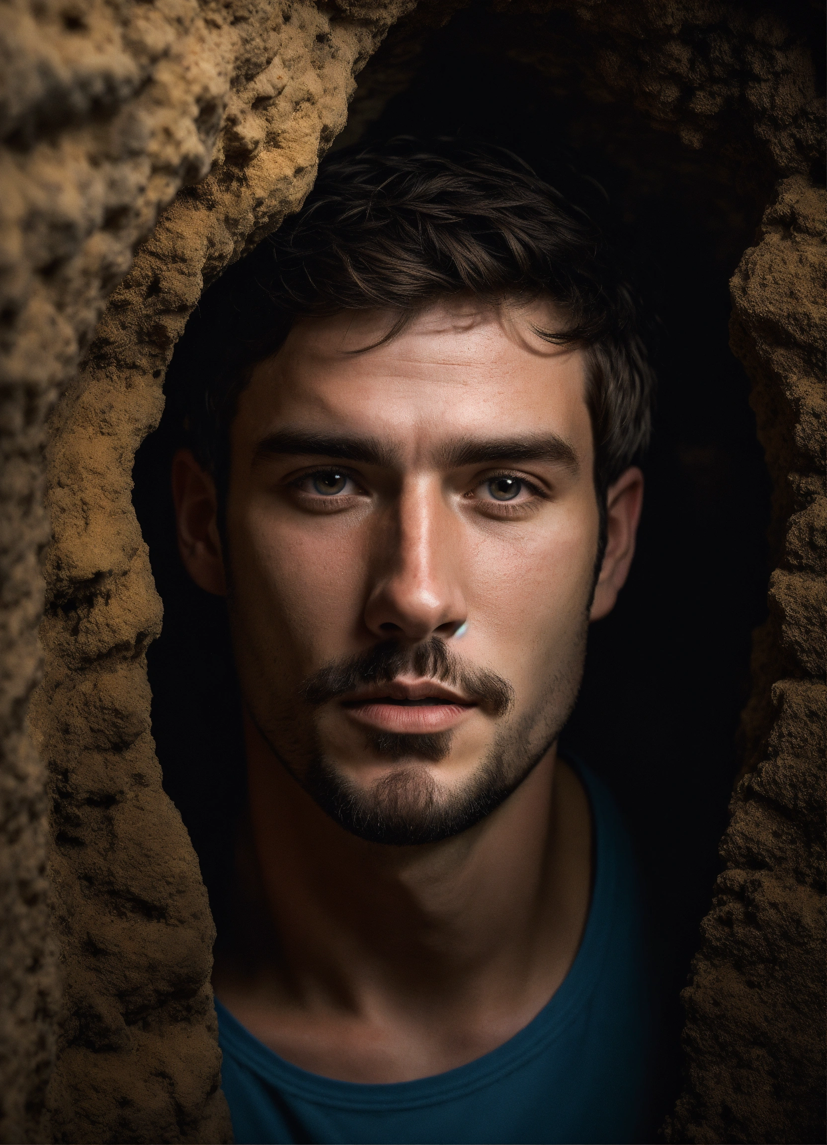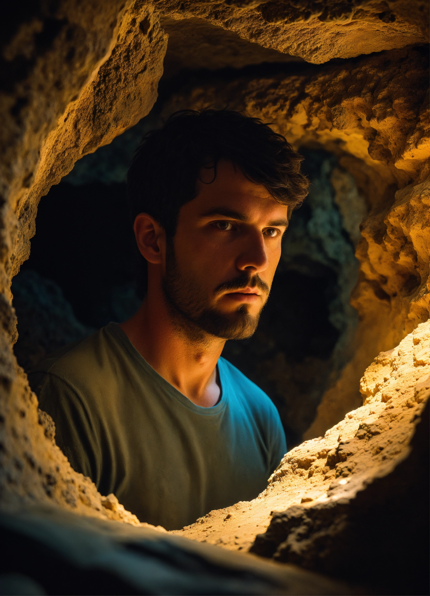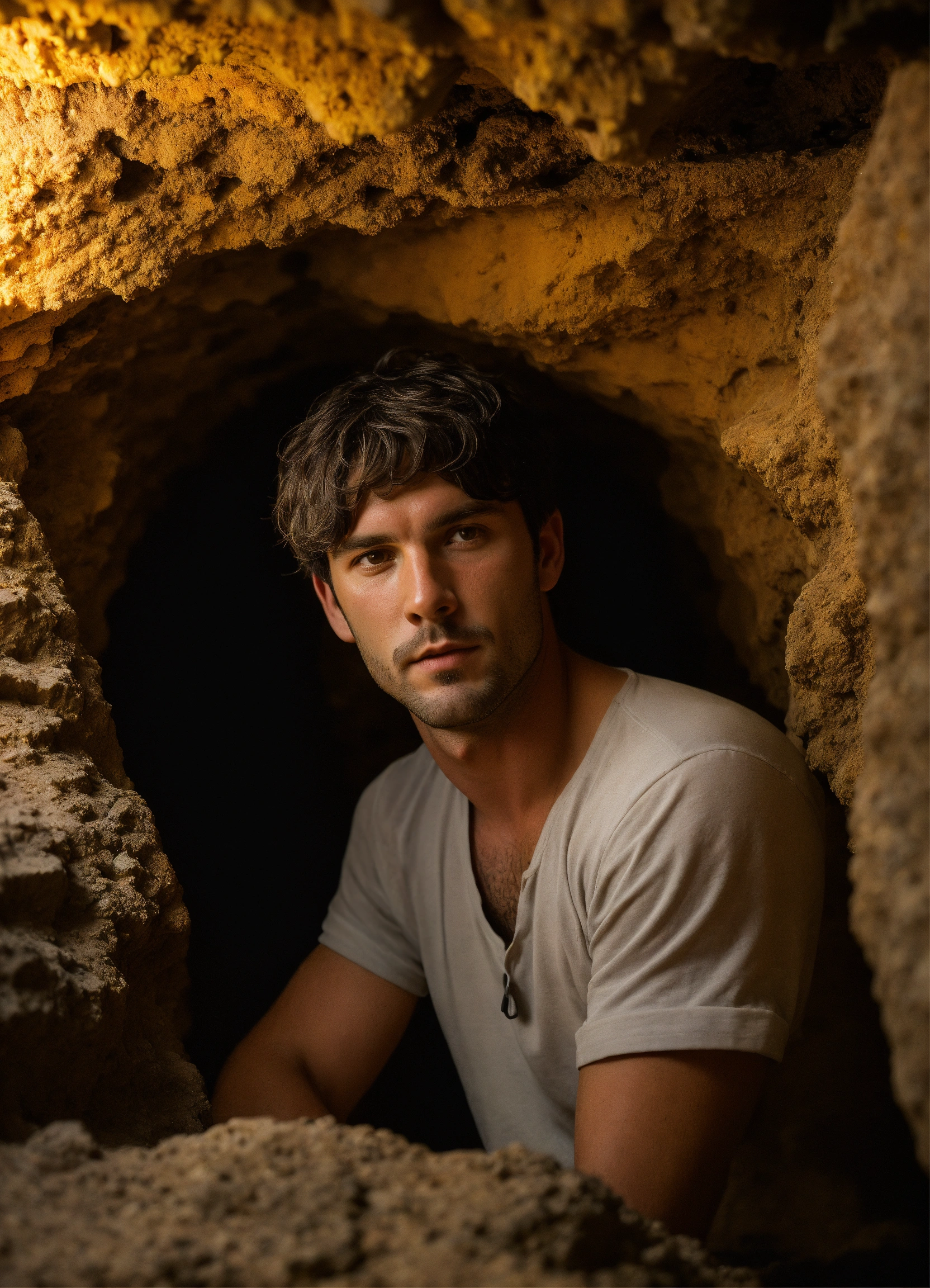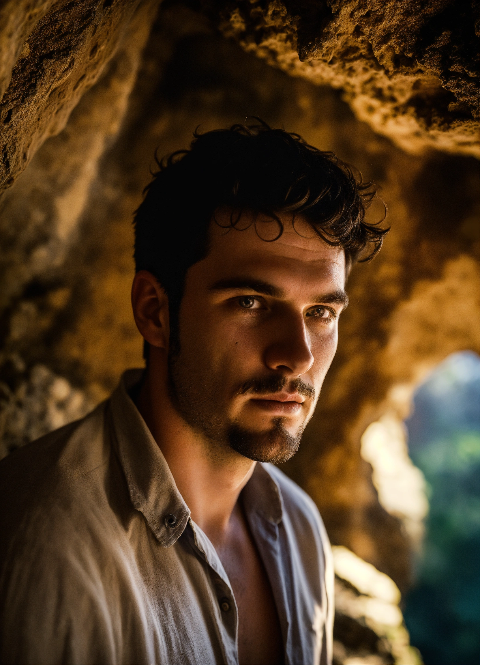 A white guy, from south spain, with dark hair and bright dark eyes, short hair, not having a face shave for 3 days, placed in a mysterious cave, illustration, sci-phi, intricate, smooth, dslr camera with 50 mm main lens and f/8 aperture., --ar 169 --v 5