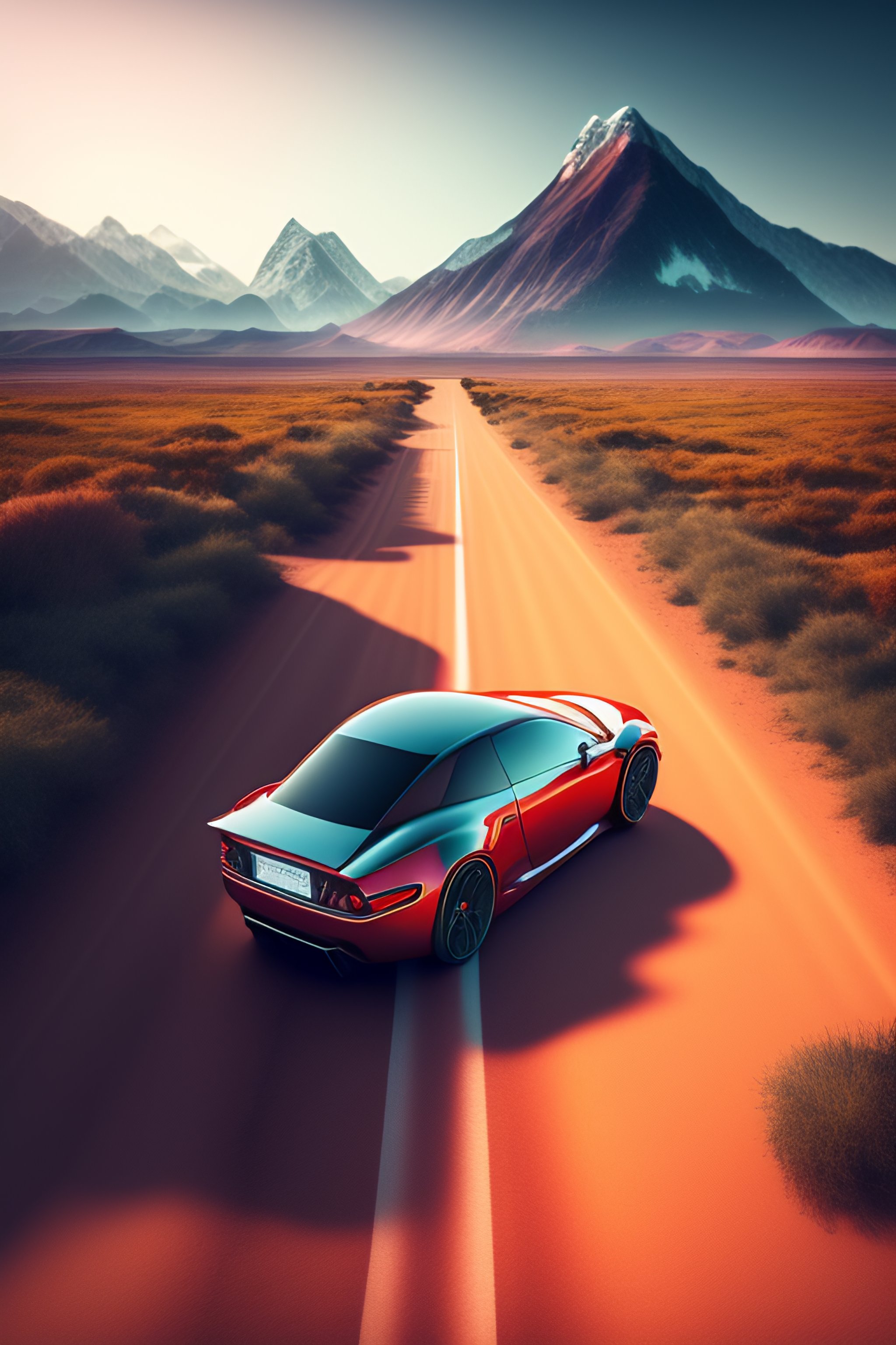 4k quality 3d render illustration of minimalistic car in the middle of the road heading to mountains