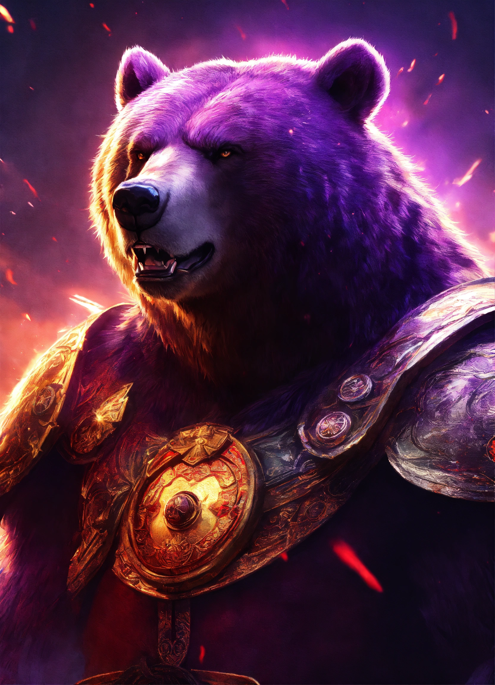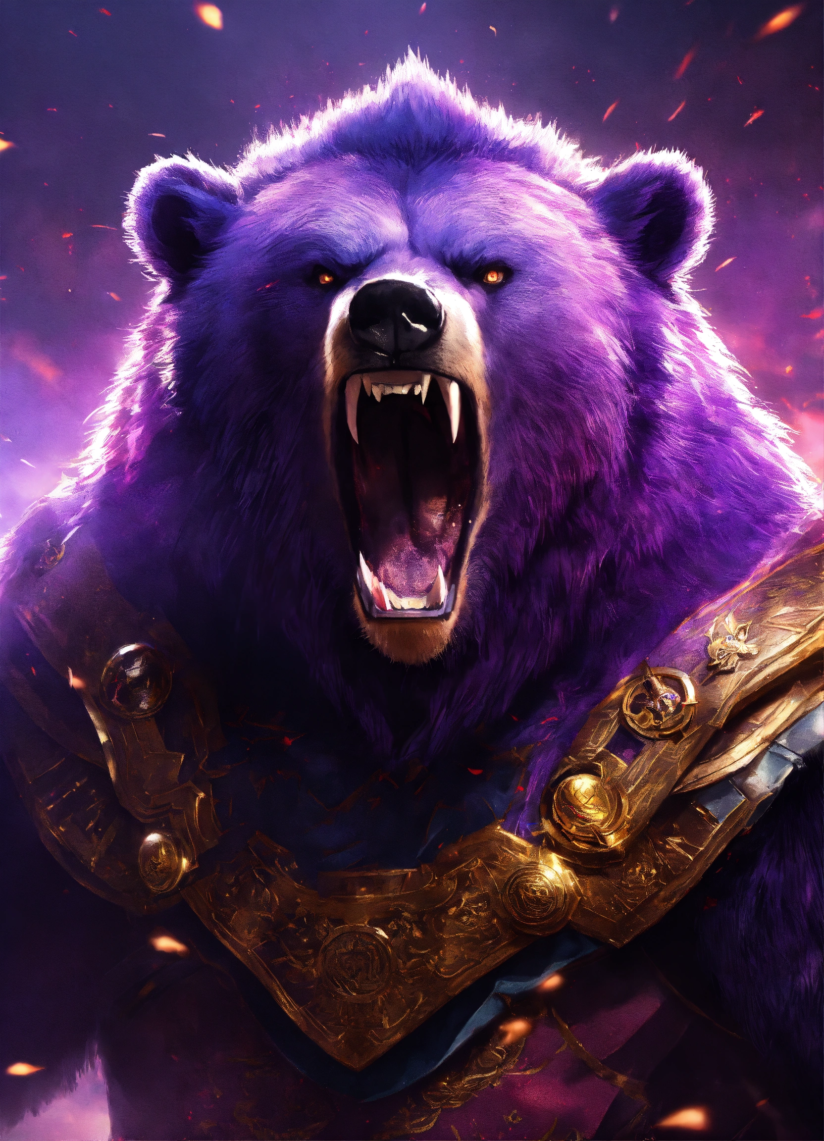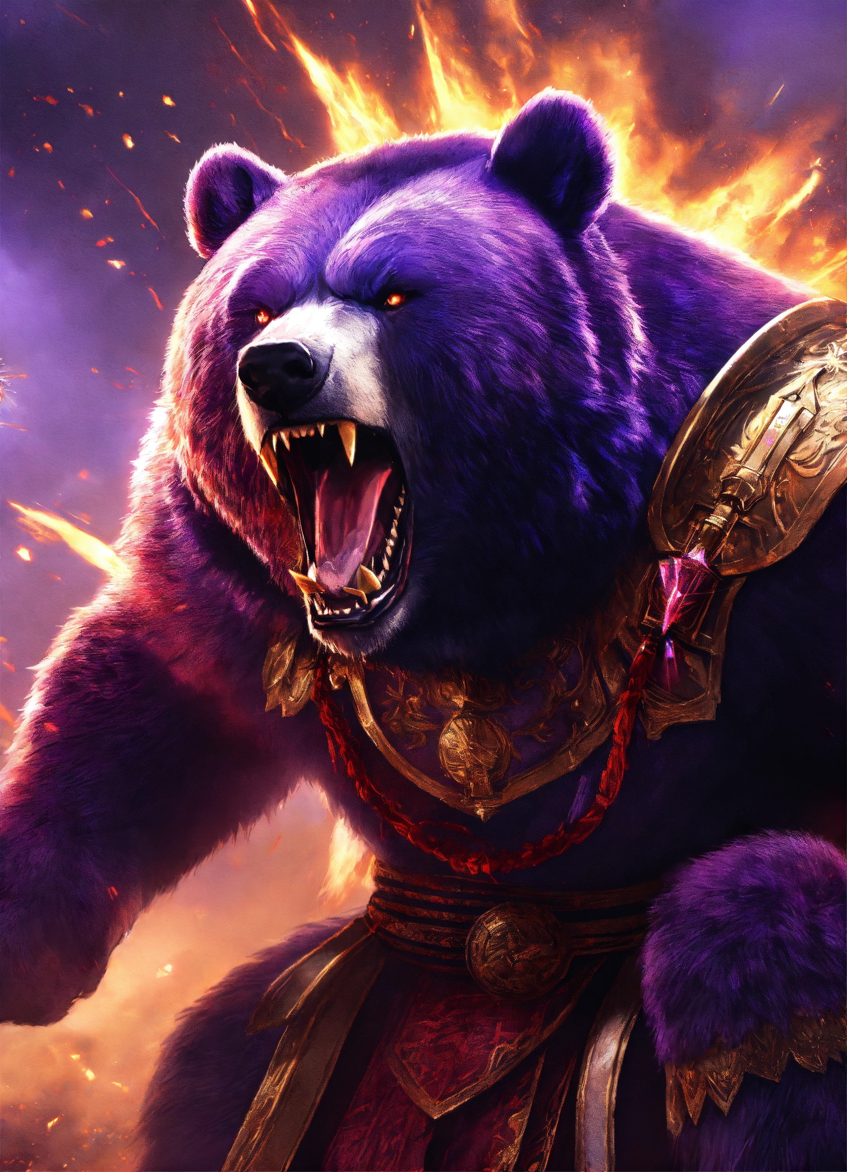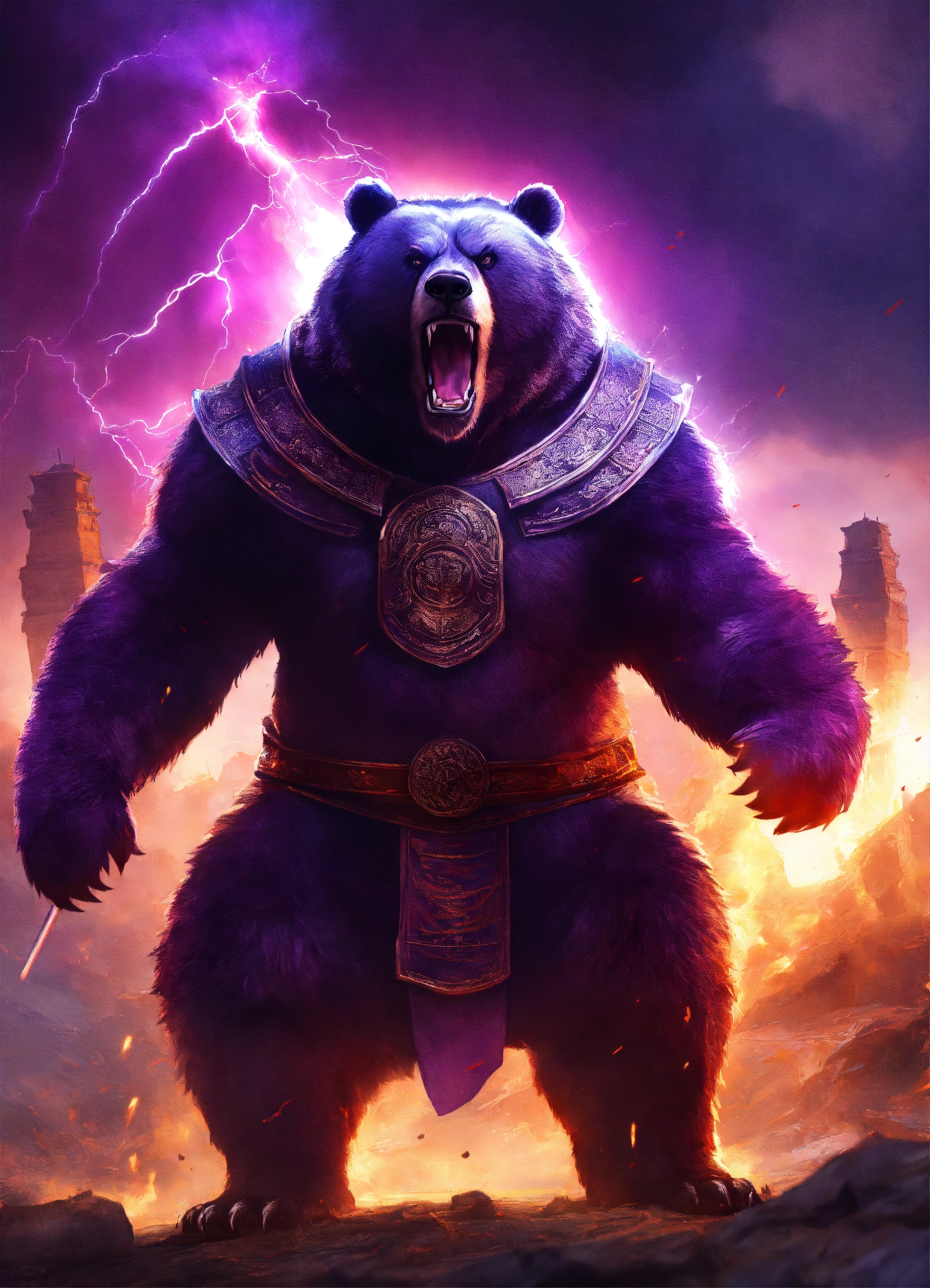 Angry ancient bear, empire, rage, roaring, purple kingdom war clothes, big bear, destroy, energy rays from his eyes, chinese, 4k realistic