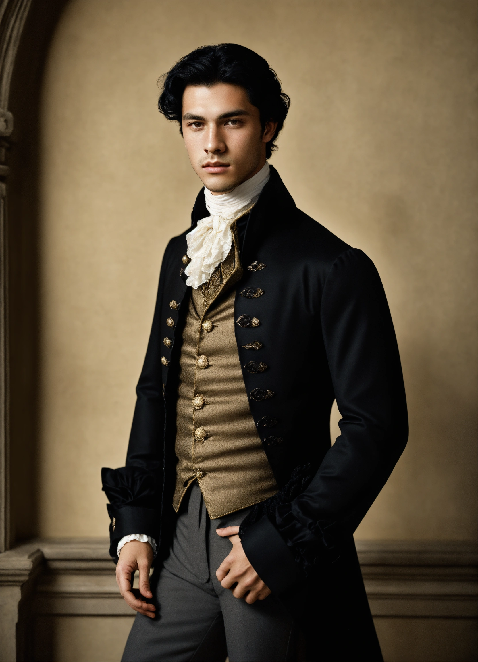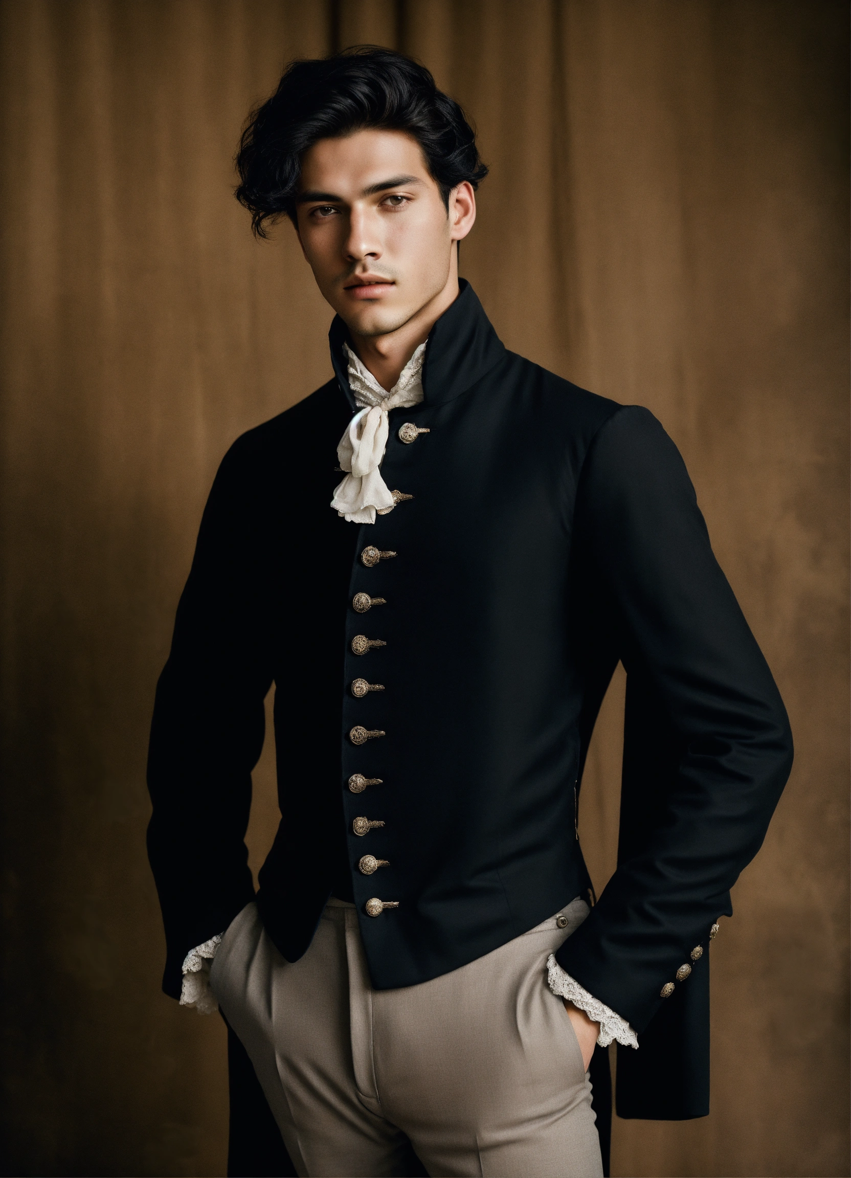 Fashion editorial, analog fashion portrait. high resolution portra 400 scanning. handsome masculine young man with black hair and gray eyes, 20 years old, in the role of the duke, dressed in a black shirt, trousers and cape from the 18th century, full length, plain background, sepia, photorealistic, daylight