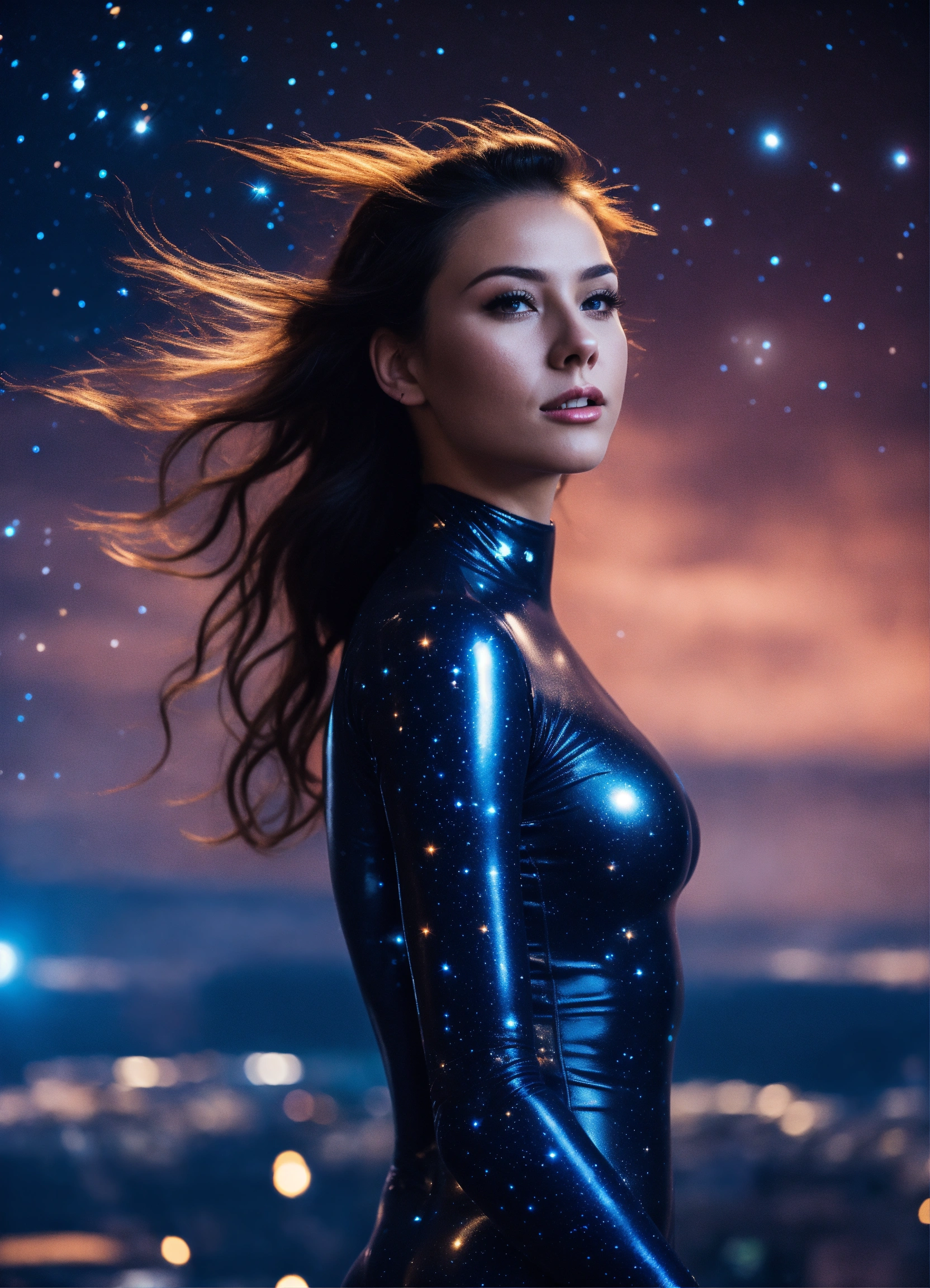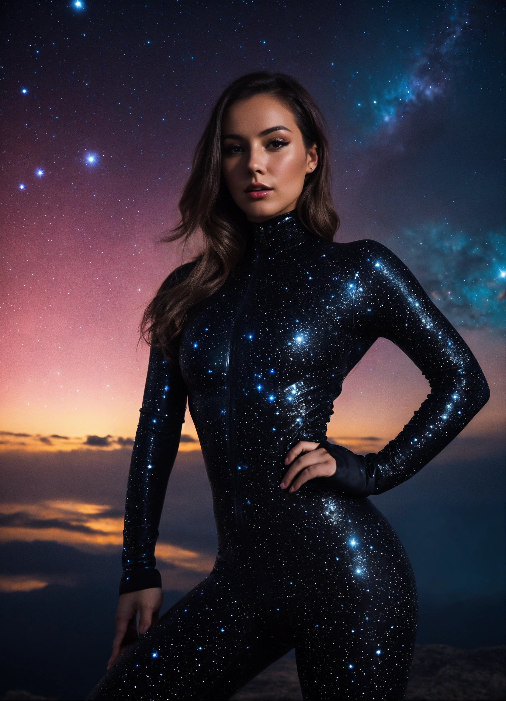 A real photo of a 27 year old girl, she is wearing a very tight catsuit, in the sky we see the galaxy