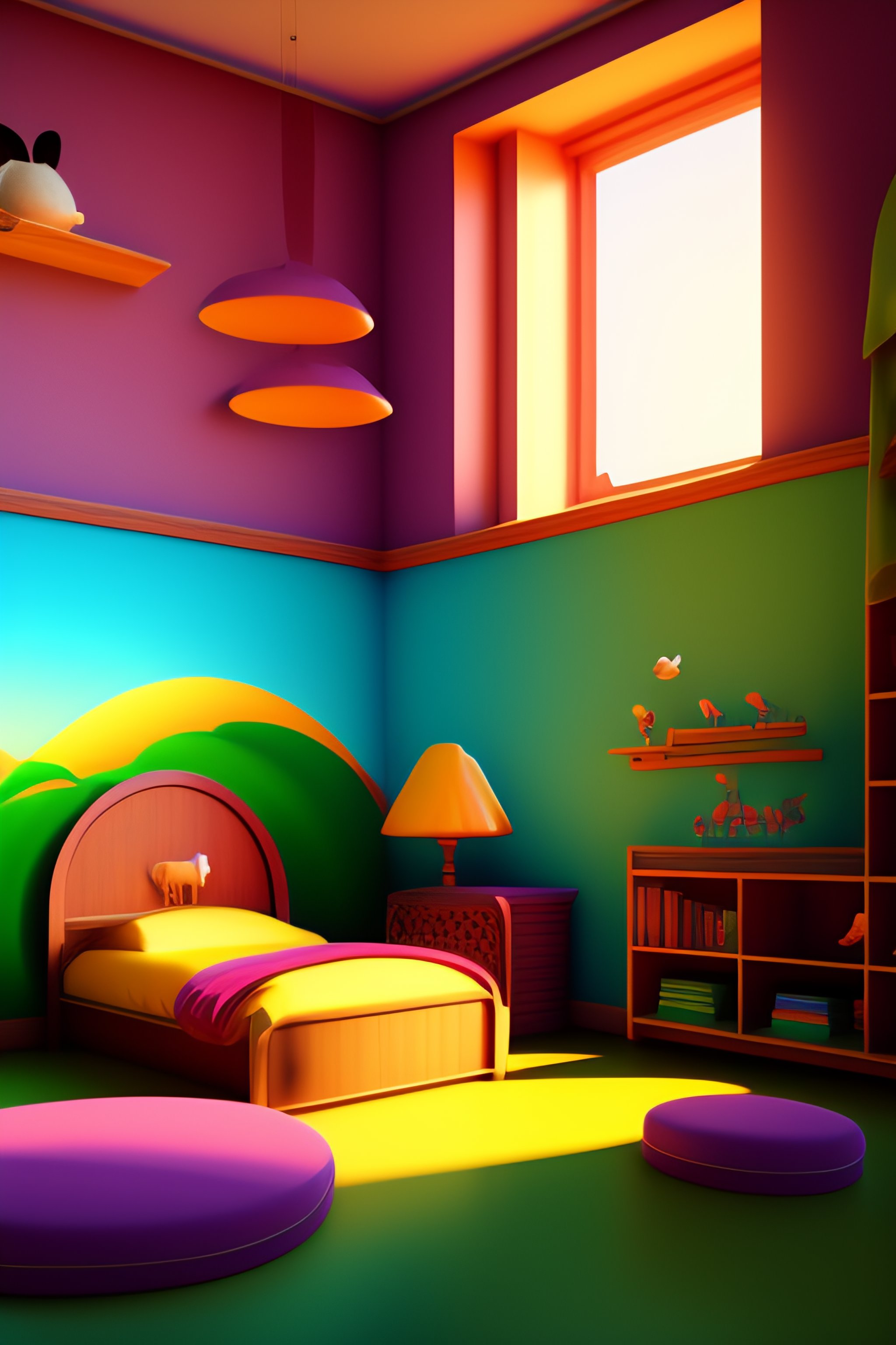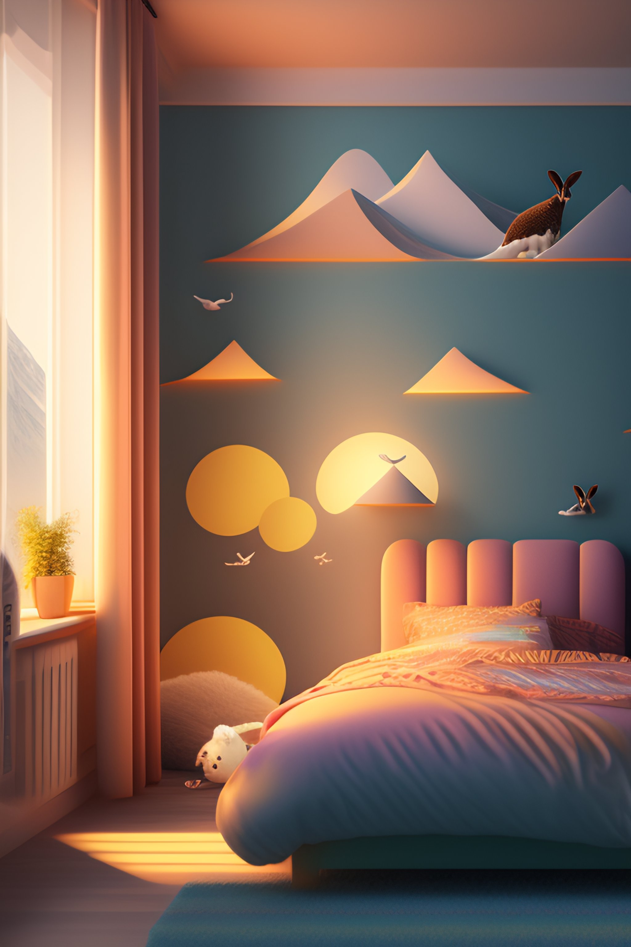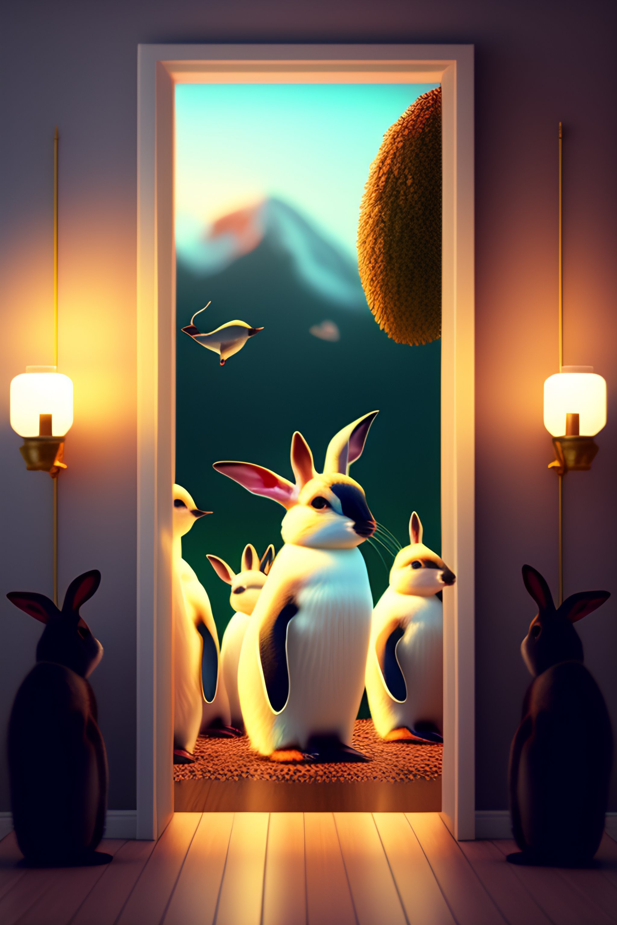 Wall art for kids bedroom, farm an8mals, rabbits, penguins:1.0, aesthetically inspired by evelyn de morgan, art by bill sienkiewicz and dr. seuss, ray tracing, volumetric lighting, octane render.